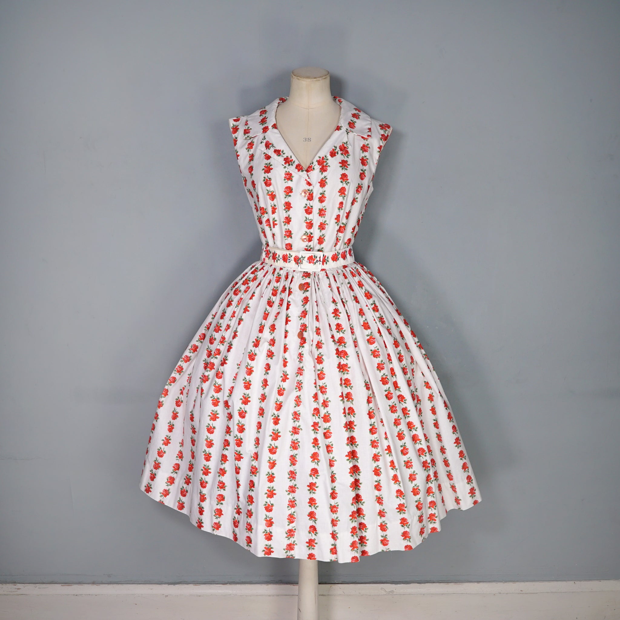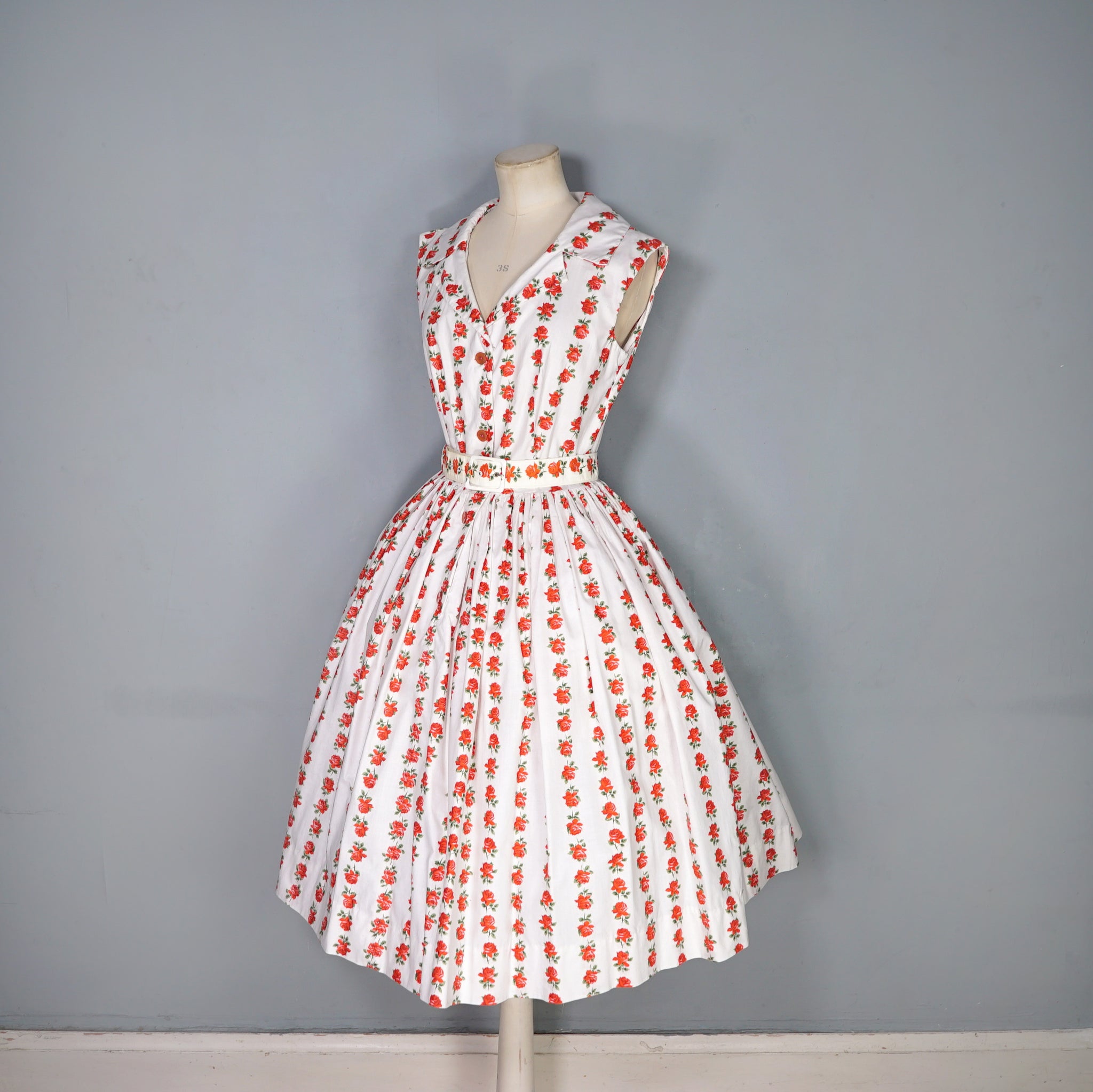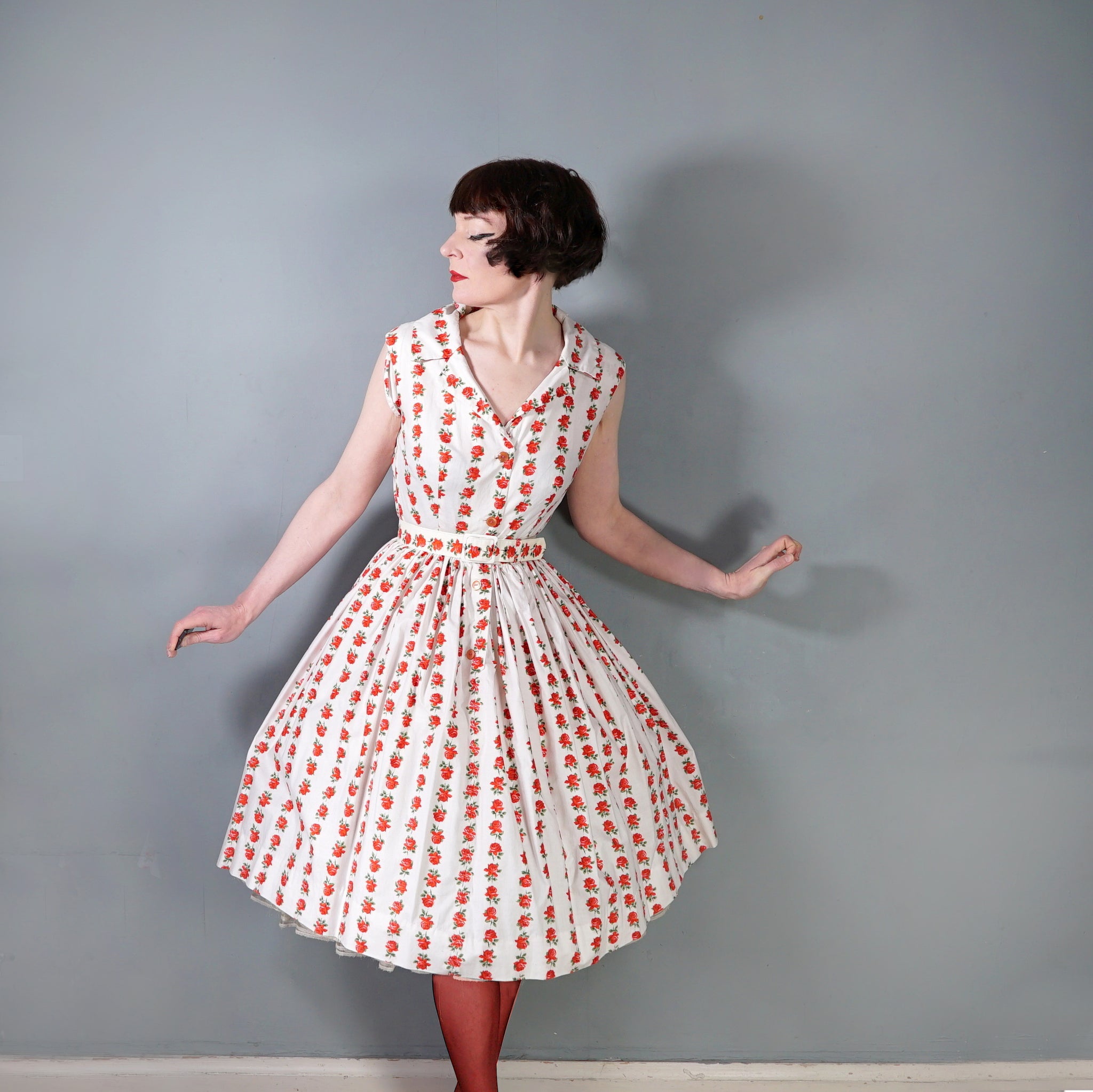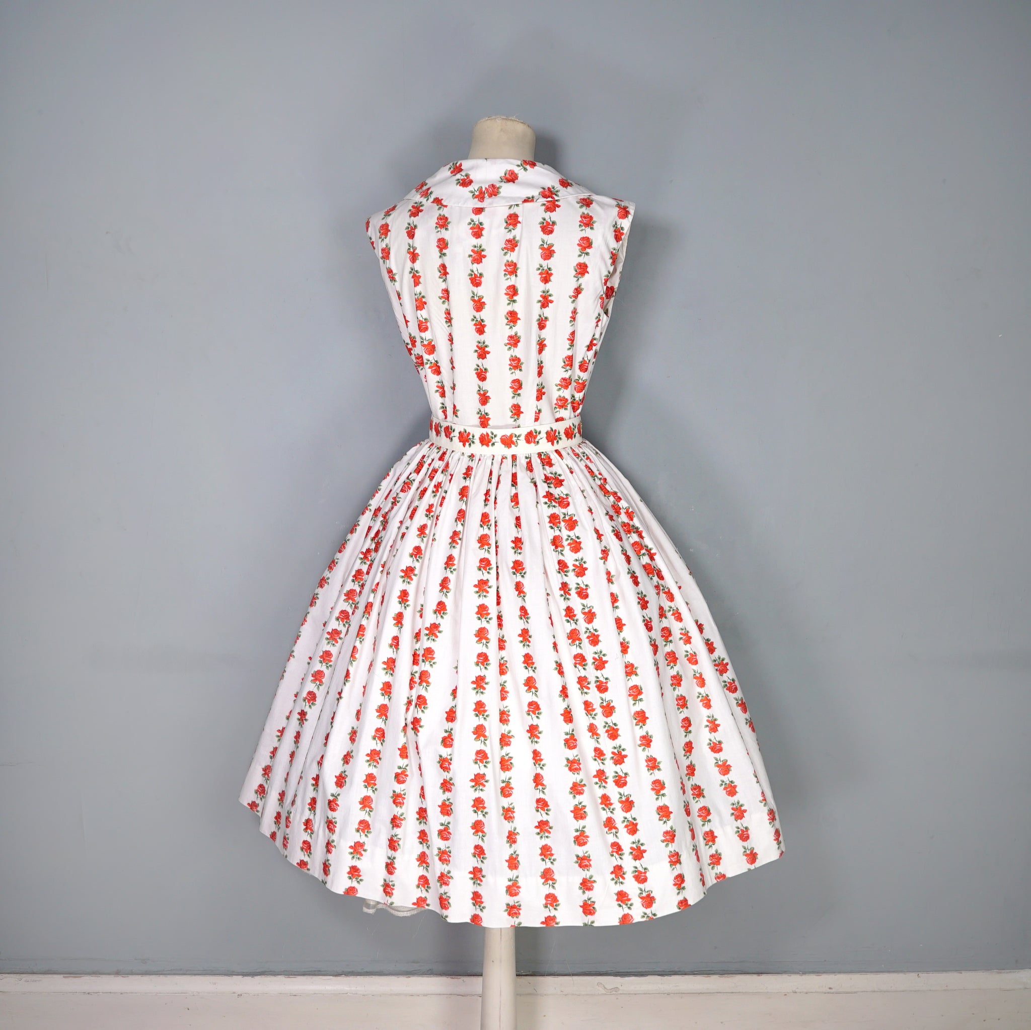 50s Sambo Fashions white cotton day dress with a small red stemmed rose print in vertical lines. Sleeveless bodice with collared v-neck and front fastened with four small red buttons. Fitted waistband with a matching cinch belt. Full skirt sewn in gathers for fullness. Midi length.