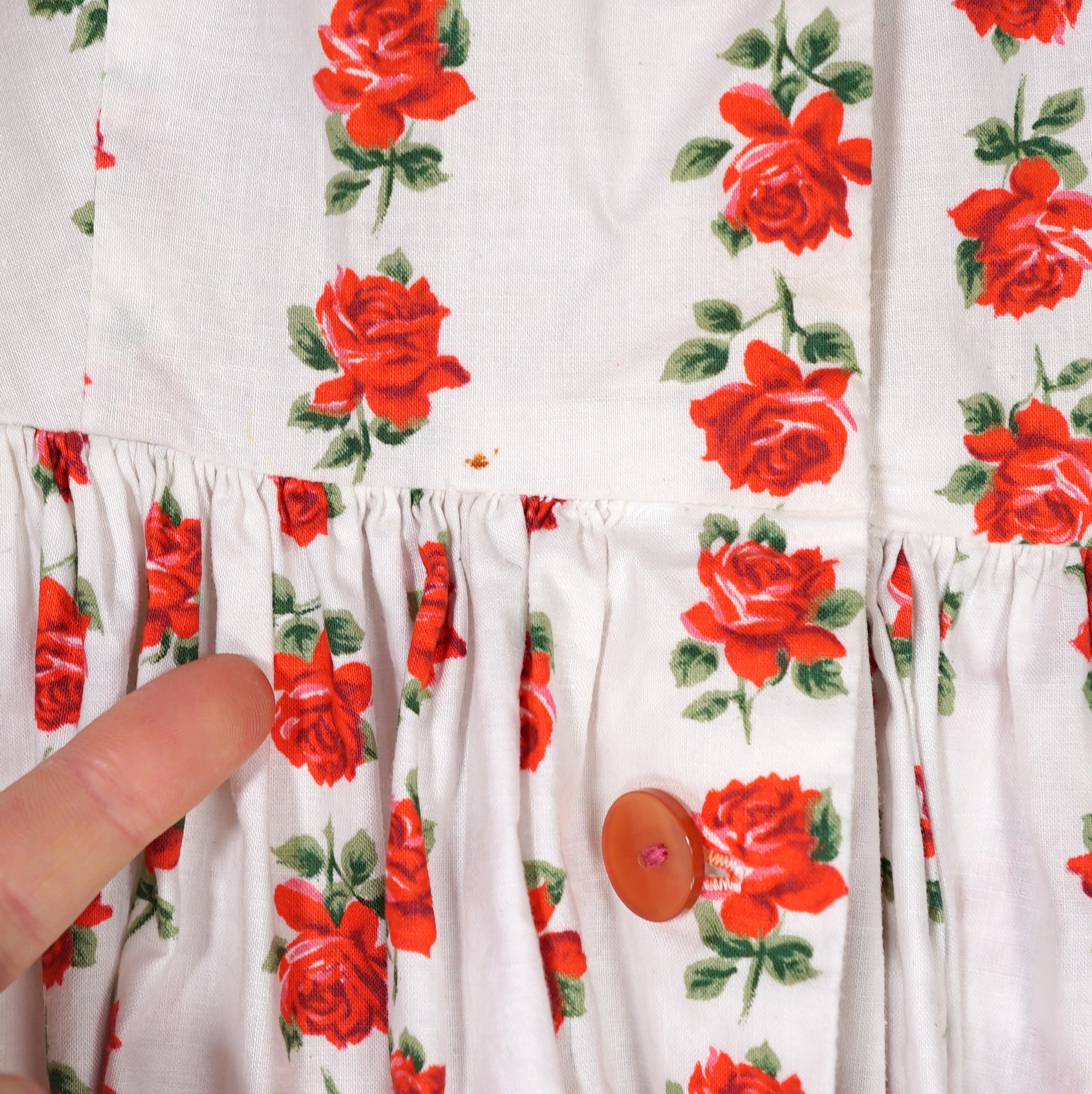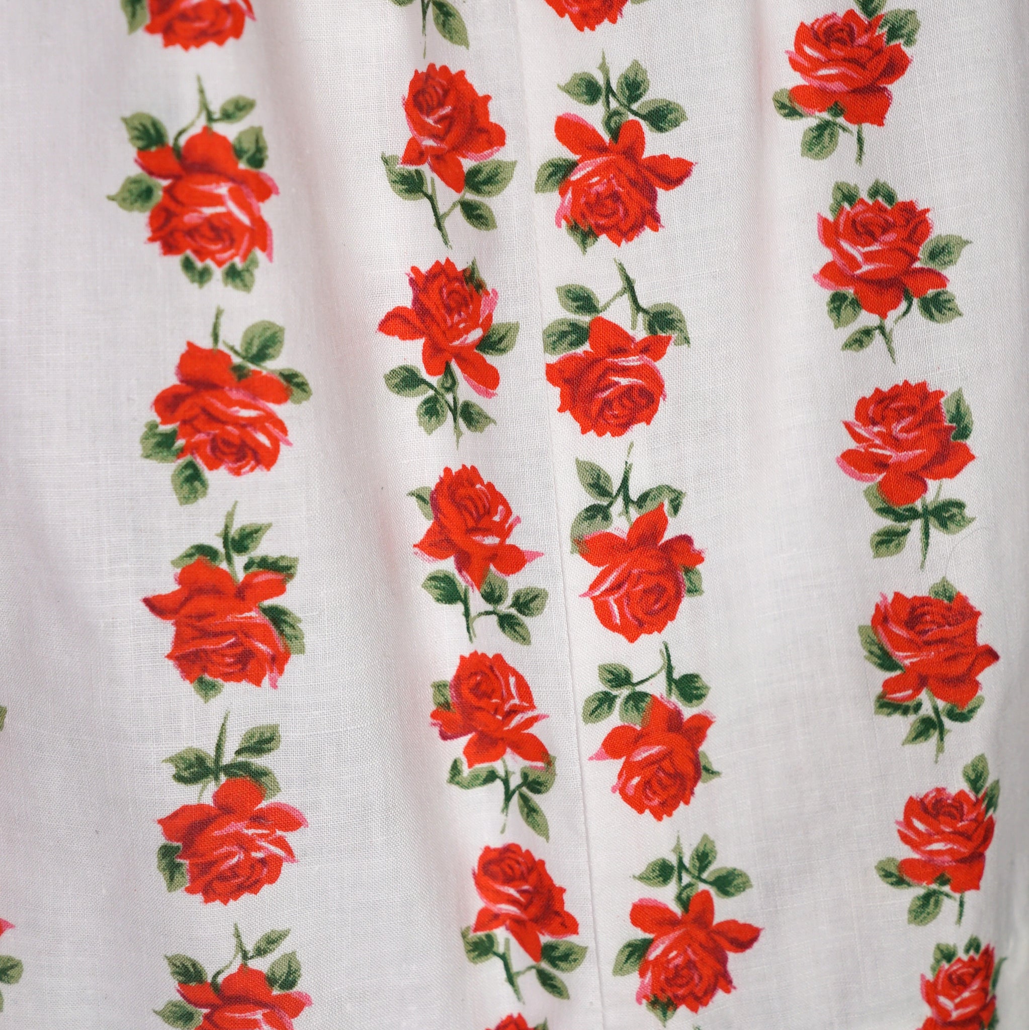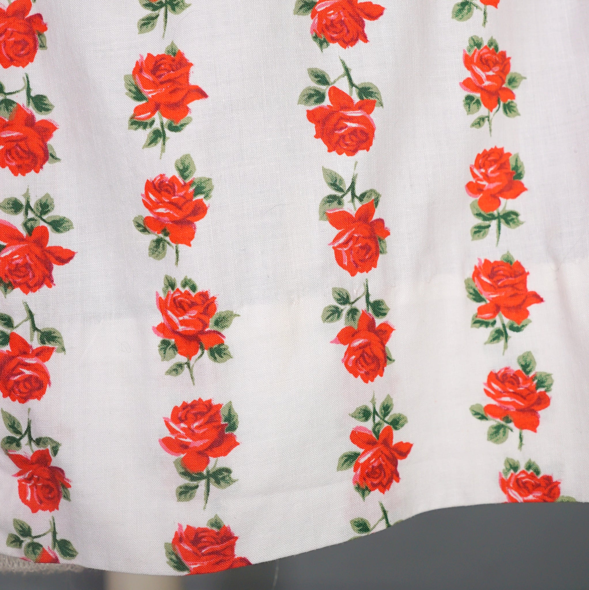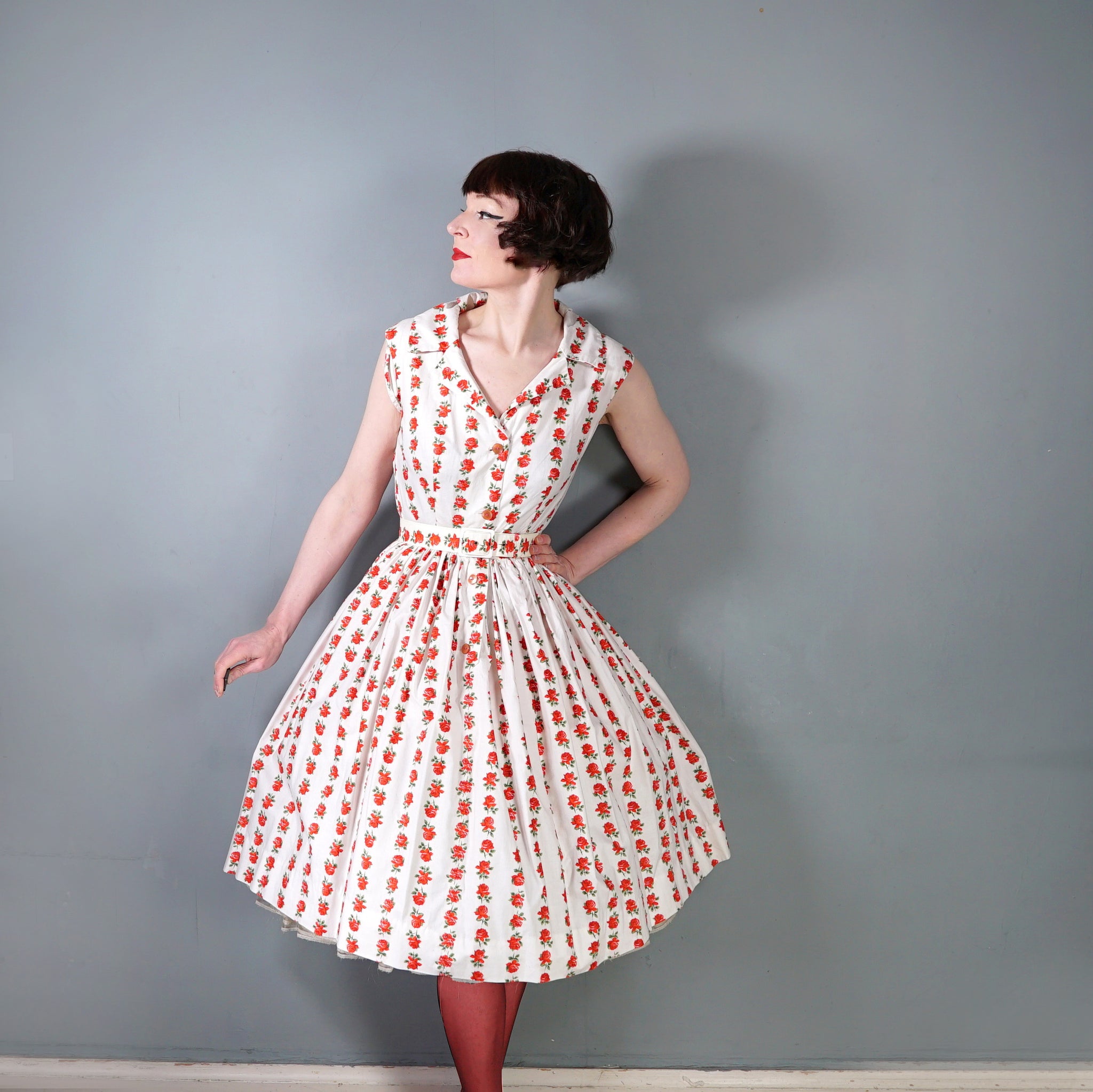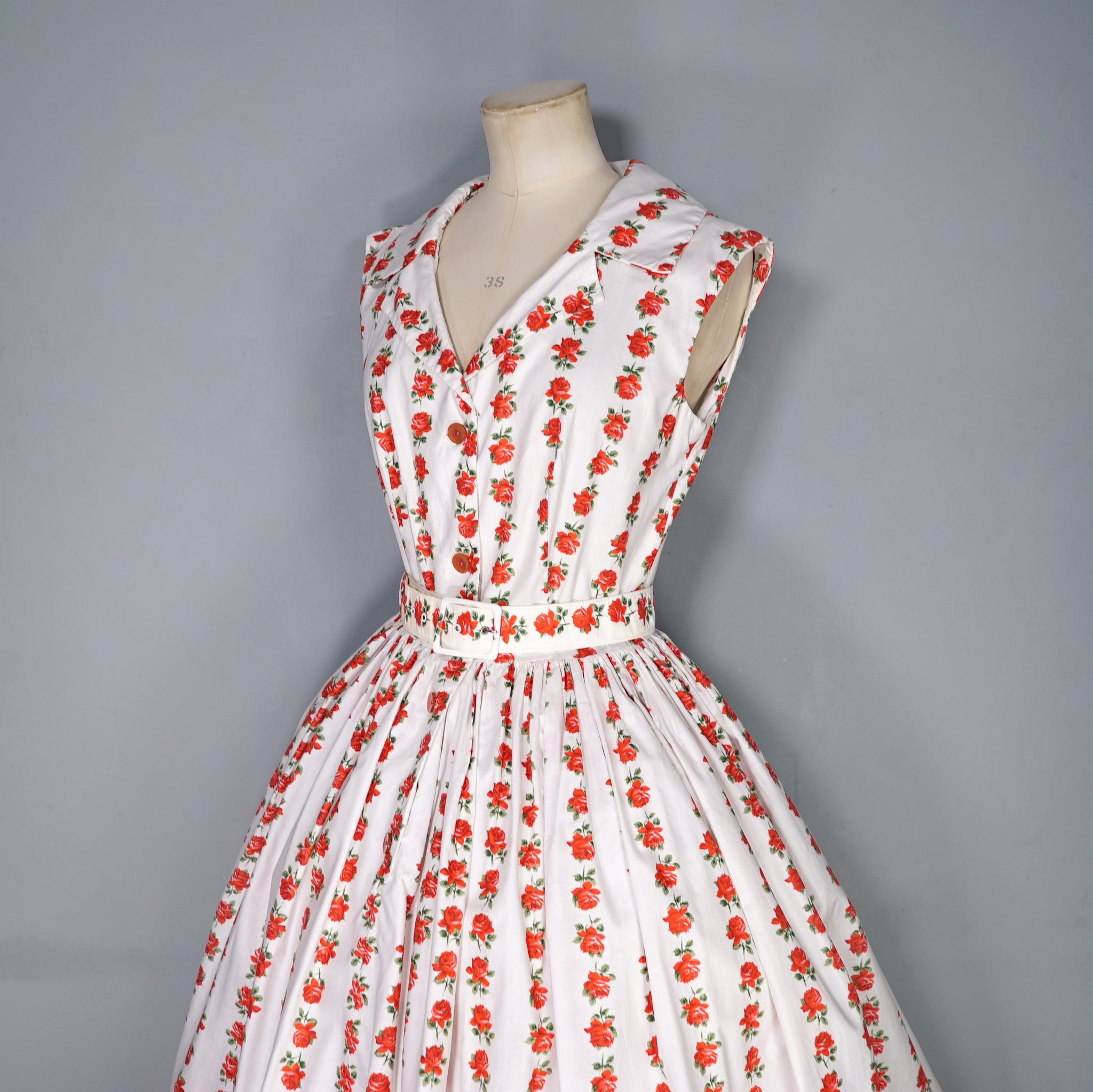 50s Sambo Fashions white cotton day dress with a small red stemmed rose print in vertical lines. Sleeveless bodice with collared v-neck and front fastened with four small red buttons. Fitted waistband with a matching cinch belt. Full skirt sewn in gathers for fullness. Midi length.