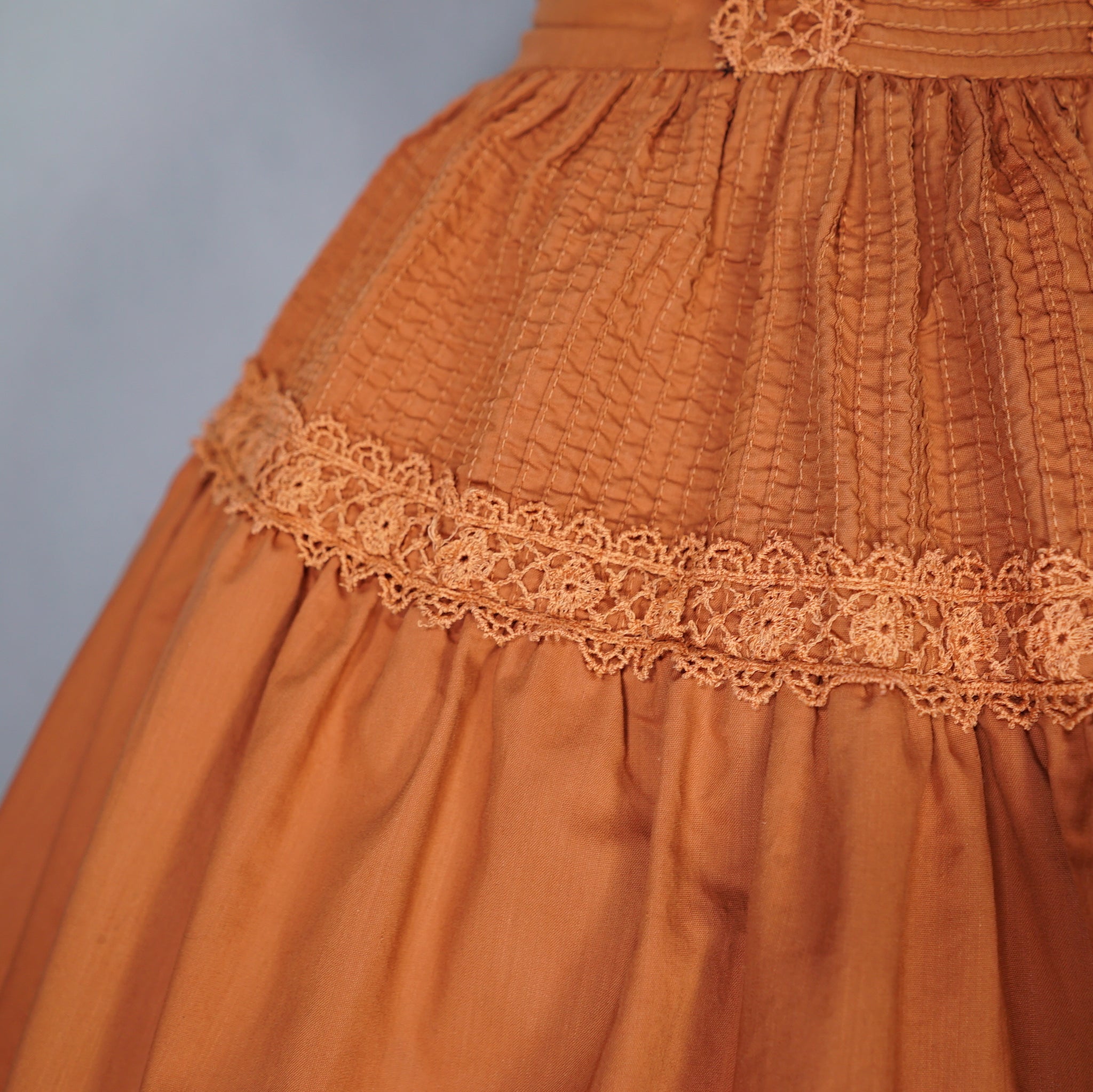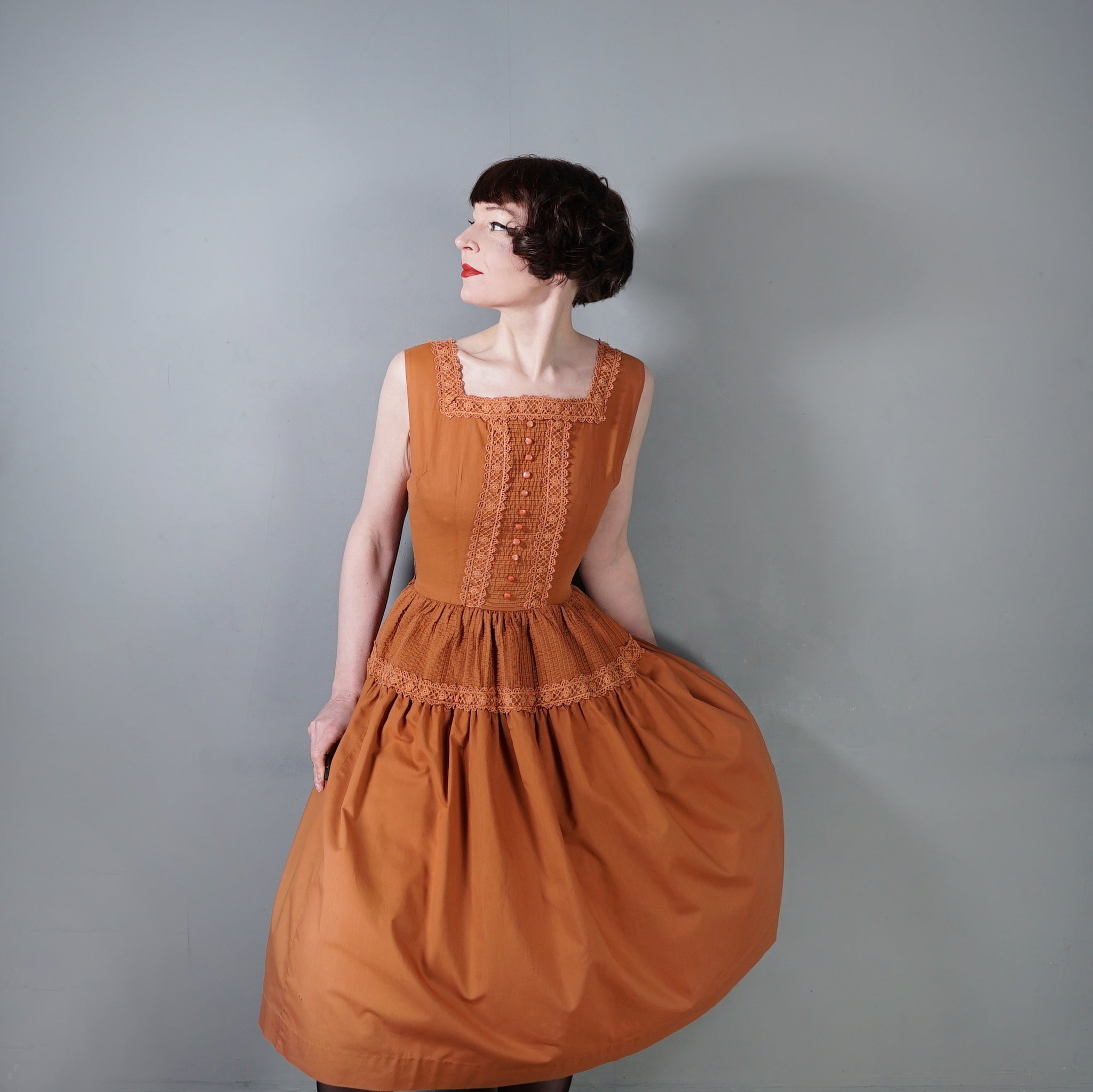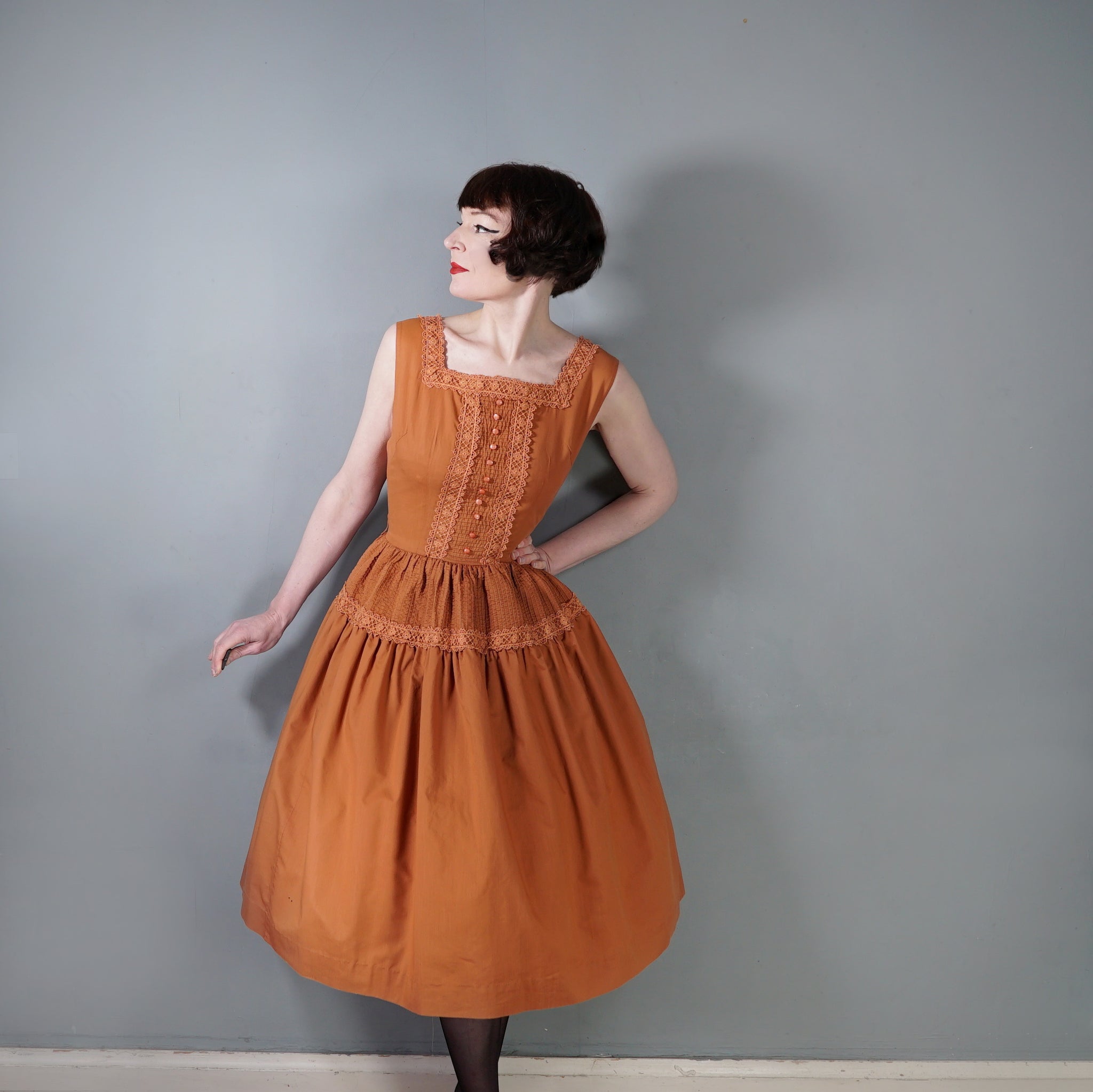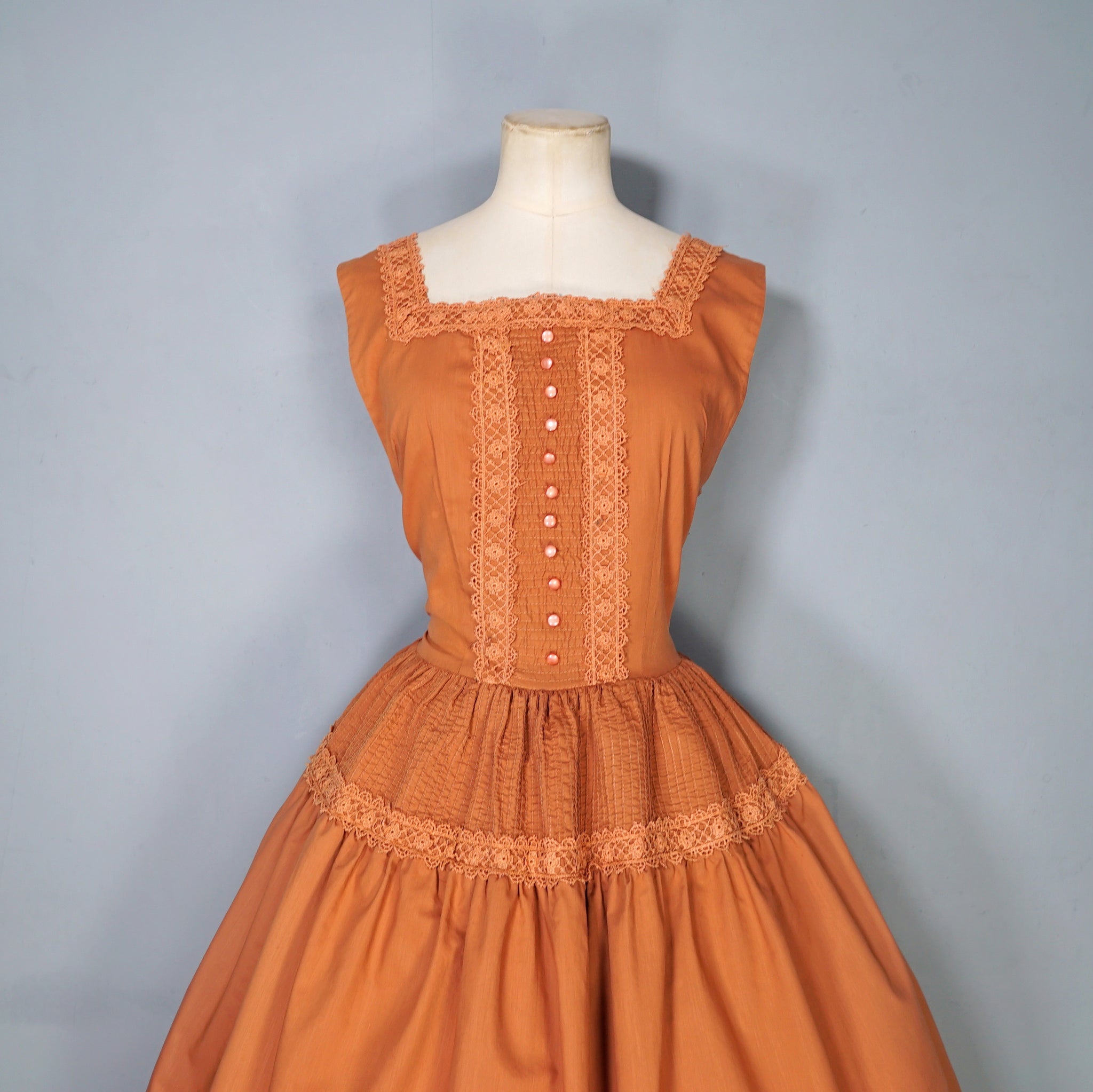50s TONI TODD RUST ORANGE DAY DRESS WITH PIN TUCKS AND LACE - S