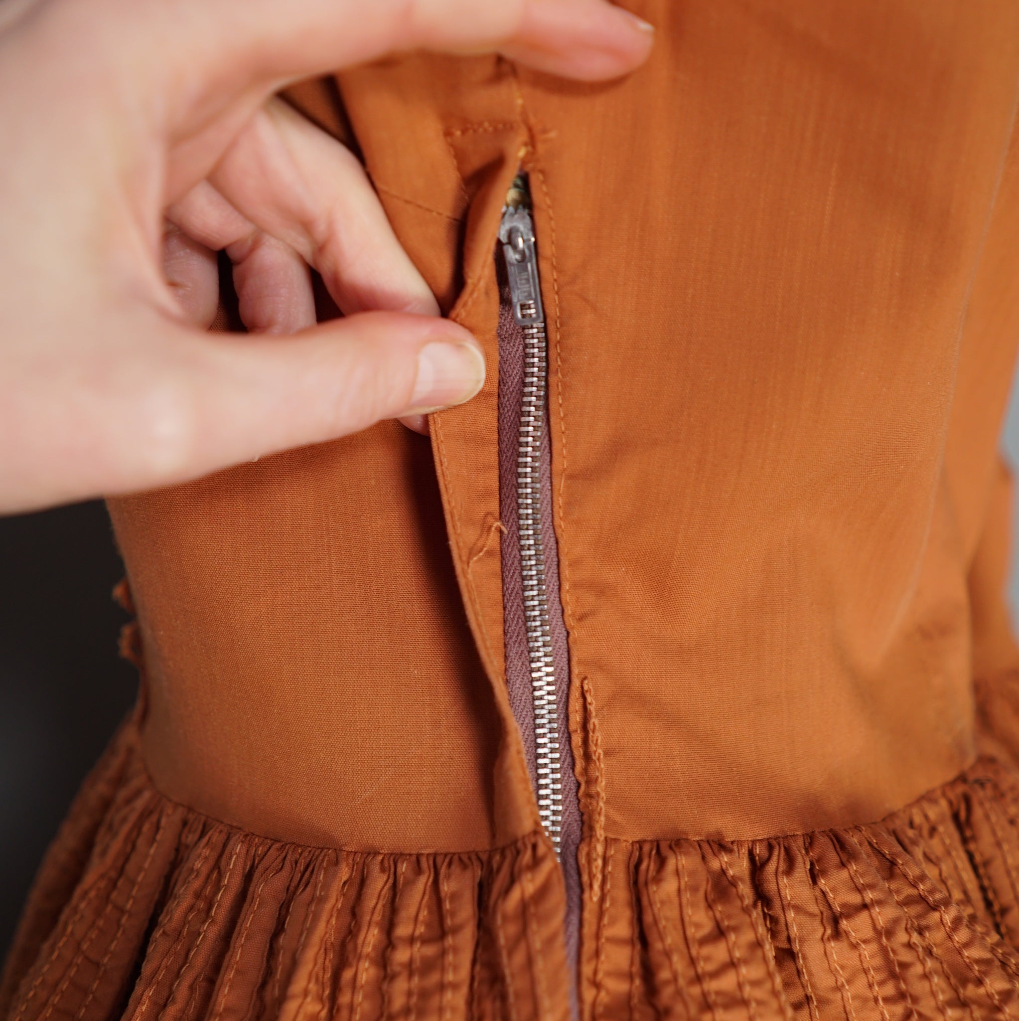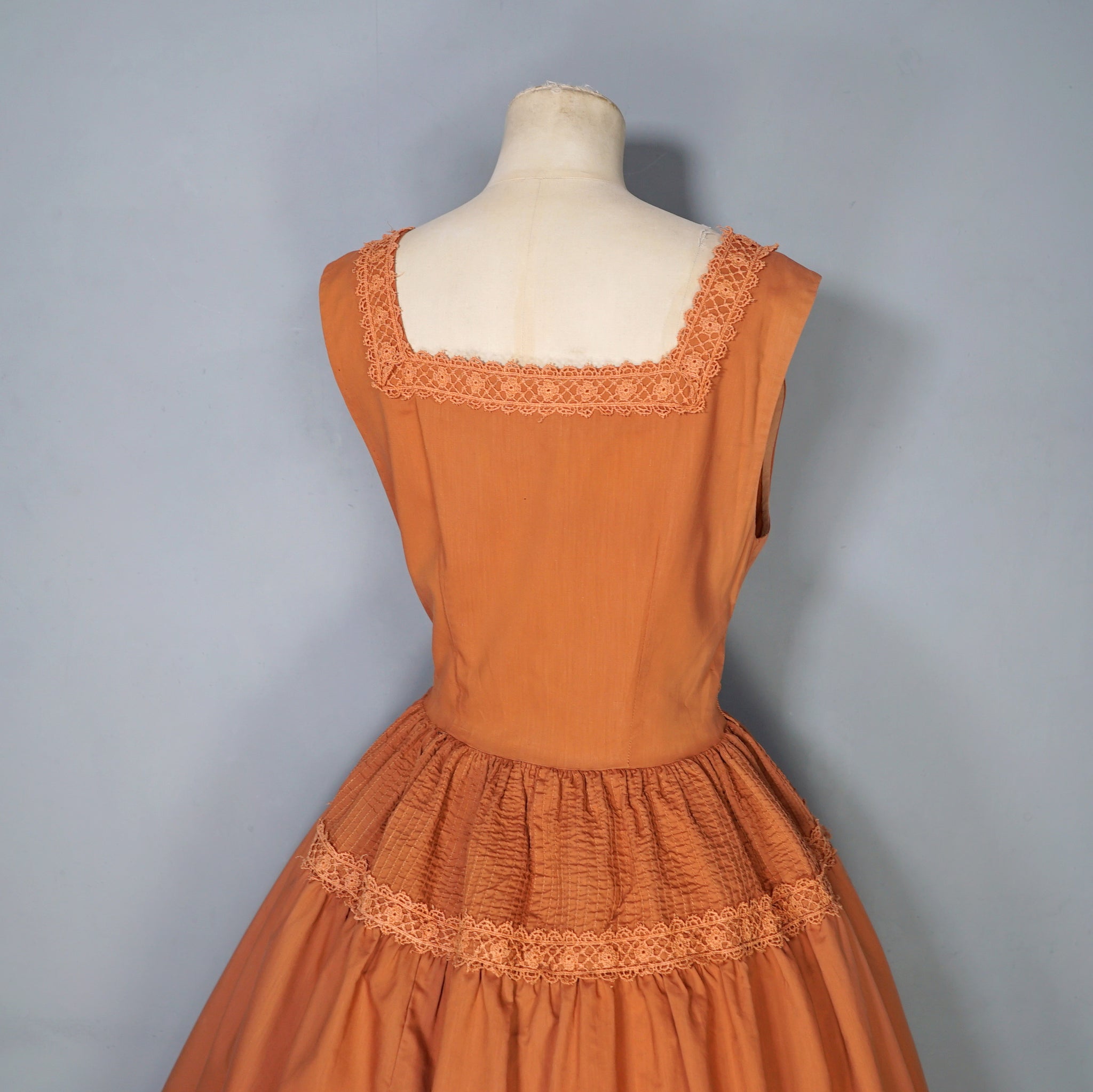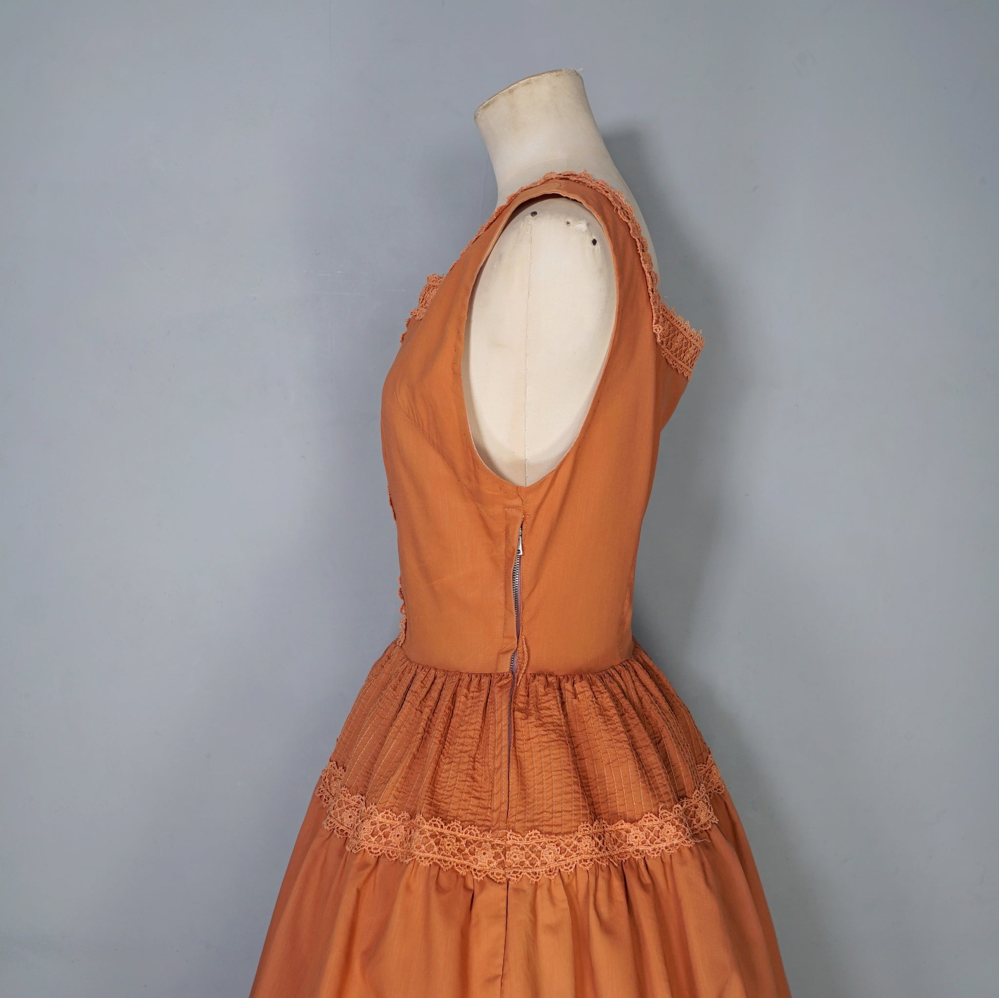 Late Toni Todd day dress in a burnt orange shade. Lovely folky design with pintucks to the bodice and hip and decorative cotton crochet lace trims. Deep square neck and sleeveless fit. Small decorative buttons to the placket. Fitted waist and full skirt with midi length. Side metal zipper to fasten.