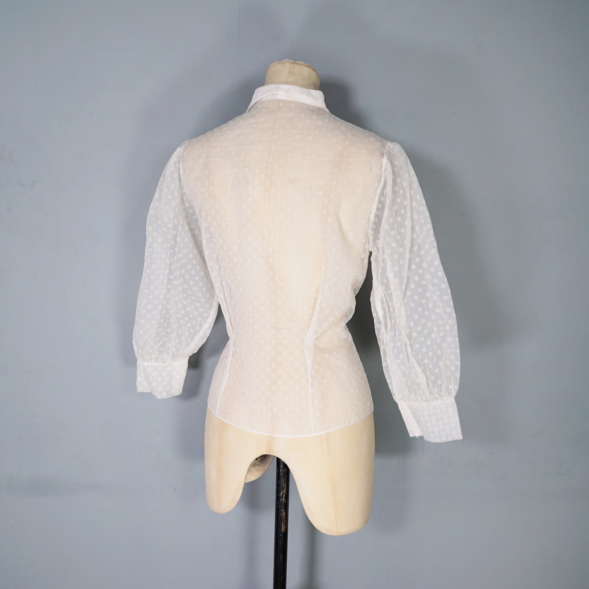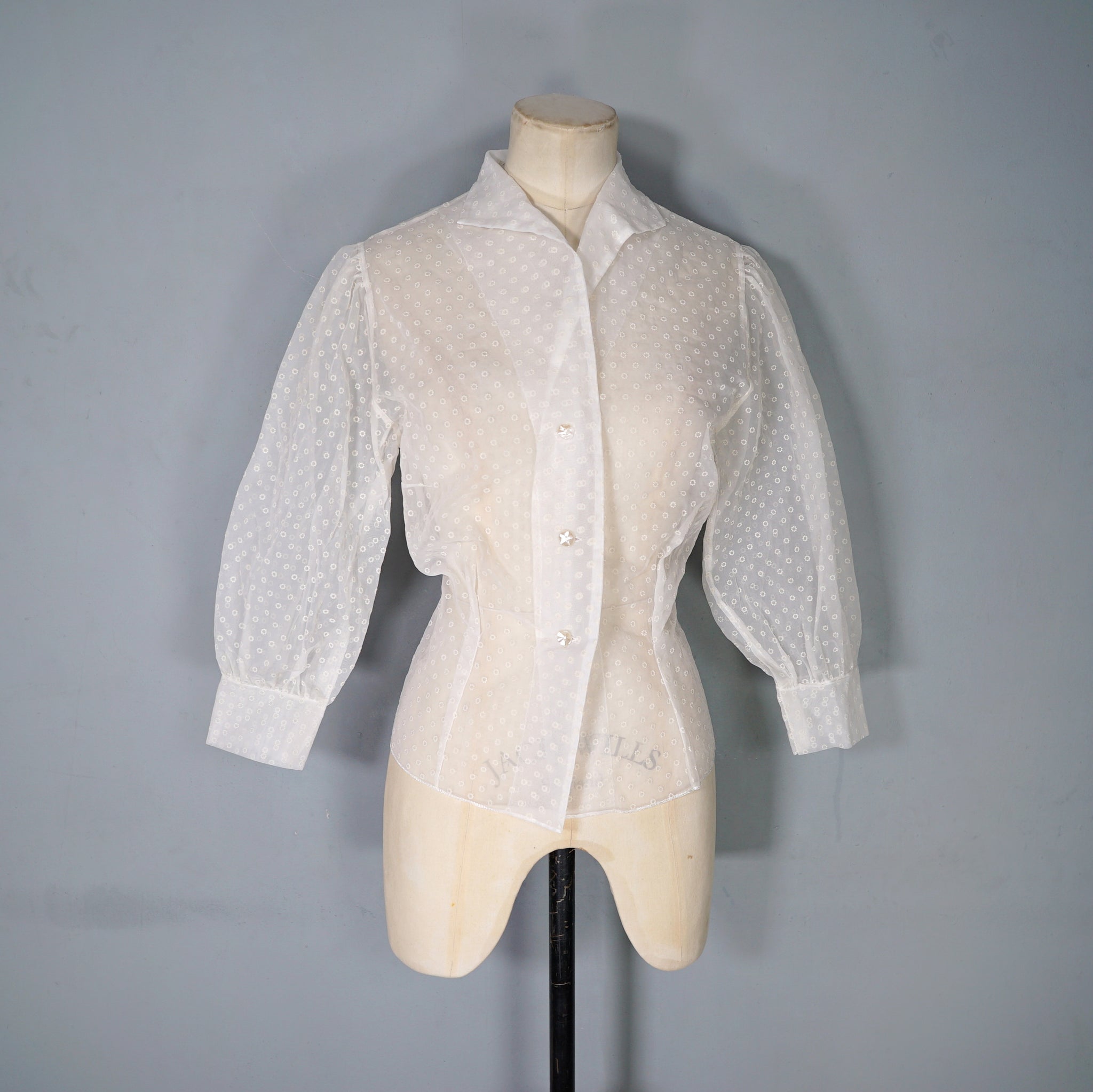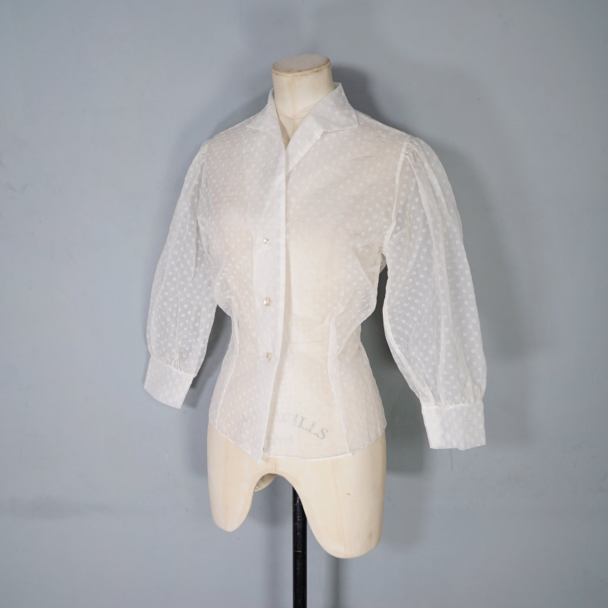 Beautiful flocked matt chiffon 50s blouse with huge puffed balloon sleeves and neat folded collar. Nicely sculpted fit with darted wait. Single breasted fit with sweet pearly flower buttons. Completely sheer. No labels. Very new look!