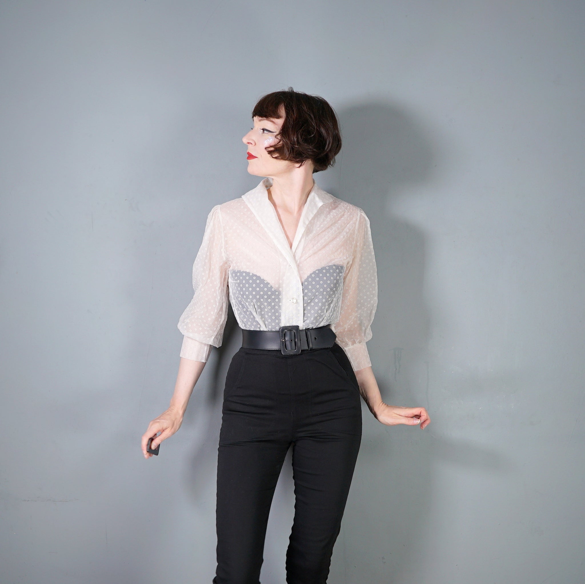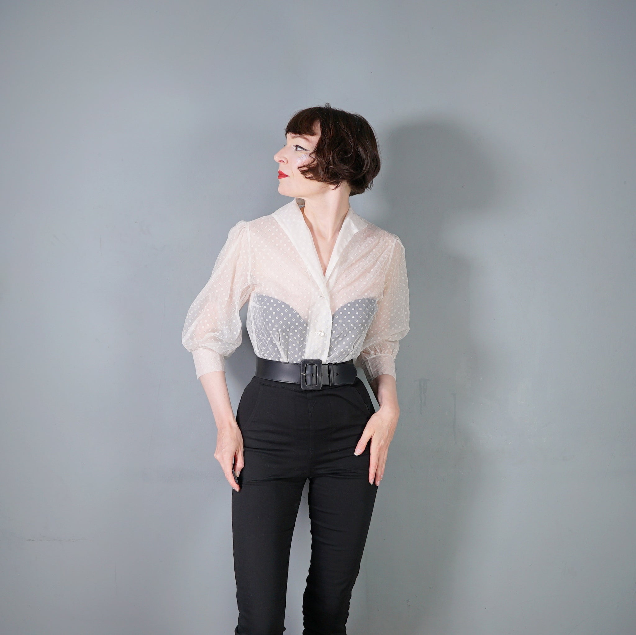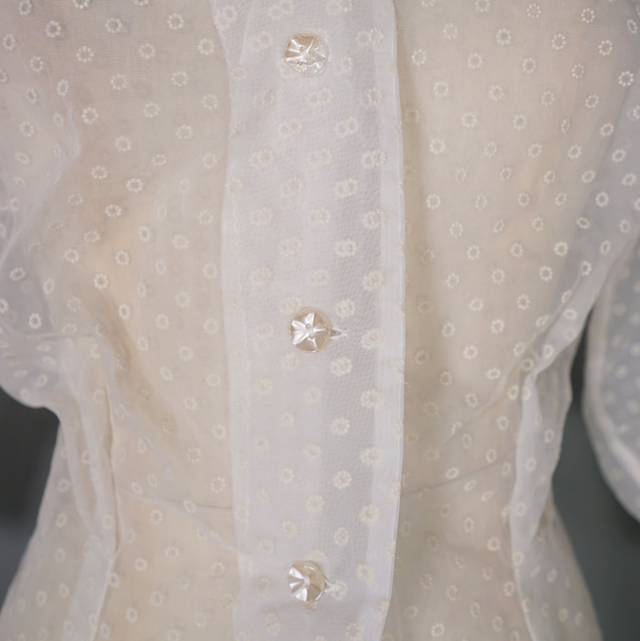 Beautiful flocked matt chiffon 50s blouse with huge puffed balloon sleeves and neat folded collar. Nicely sculpted fit with darted wait. Single breasted fit with sweet pearly flower buttons. Completely sheer. No labels. Very new look!