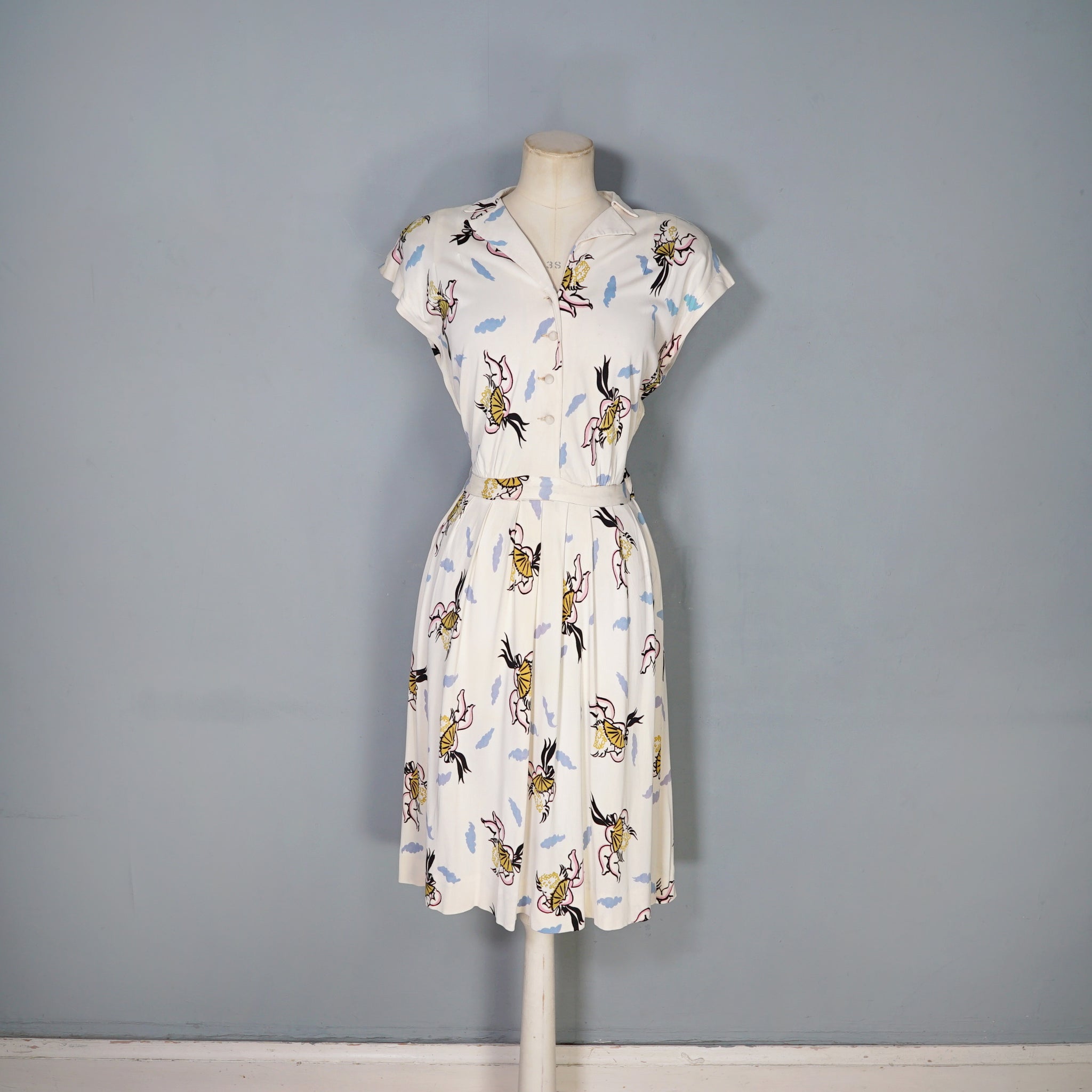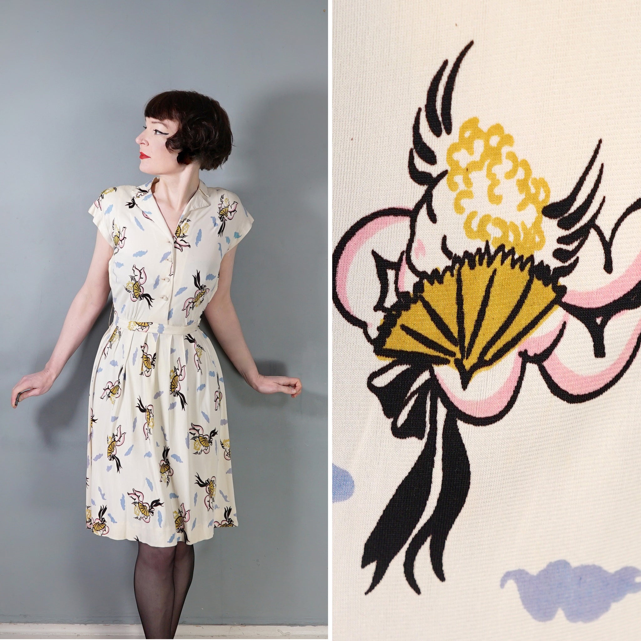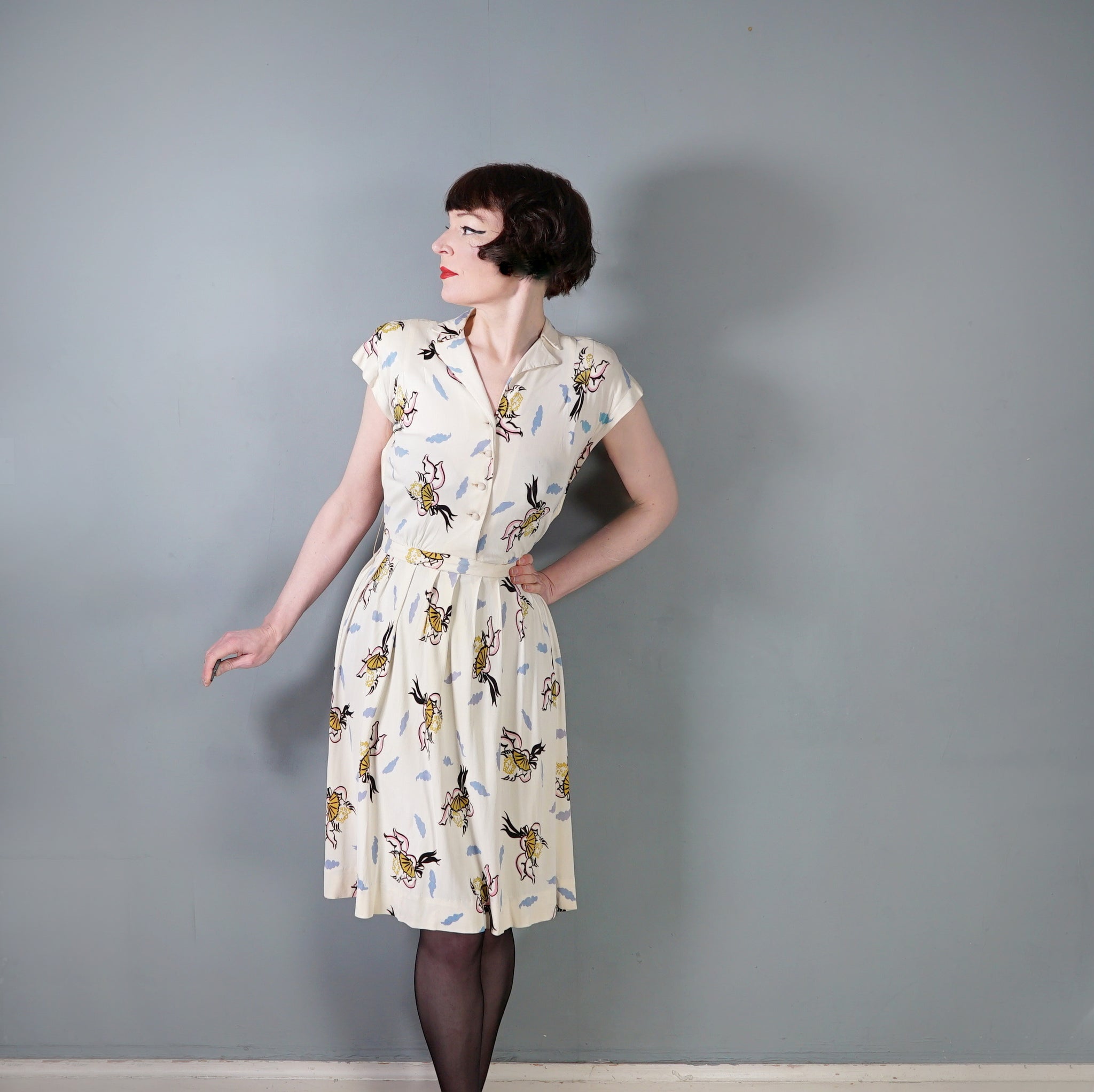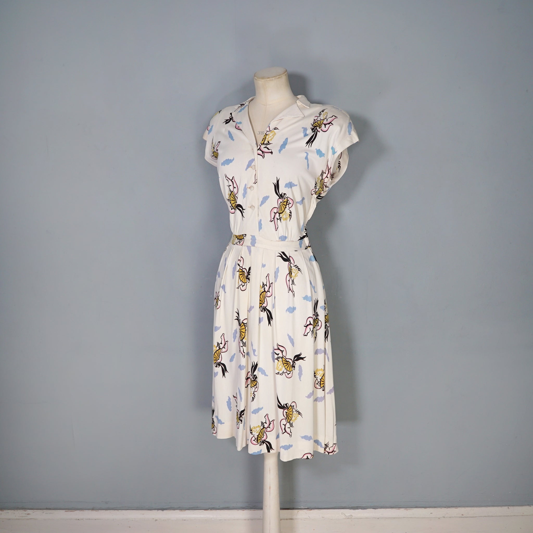Fun and very unusual pritn 40s dress in a soft cream rayon jersey with a pretty amazing print of little cherubs/cupids with big black fans and bushy little blue clouds. Shirt style bodice with cap sleeve and padded shoulder. V-neck with slim collar. Four small covered buttons to fasten the chest. Top sewn waistband with small gathers at the sides to give a bit of fullness and blousey-ness to the bodice. Skirt is straight cut with some wide pleats for a soft fullness. Side seam fastens with a metal zip. No label.