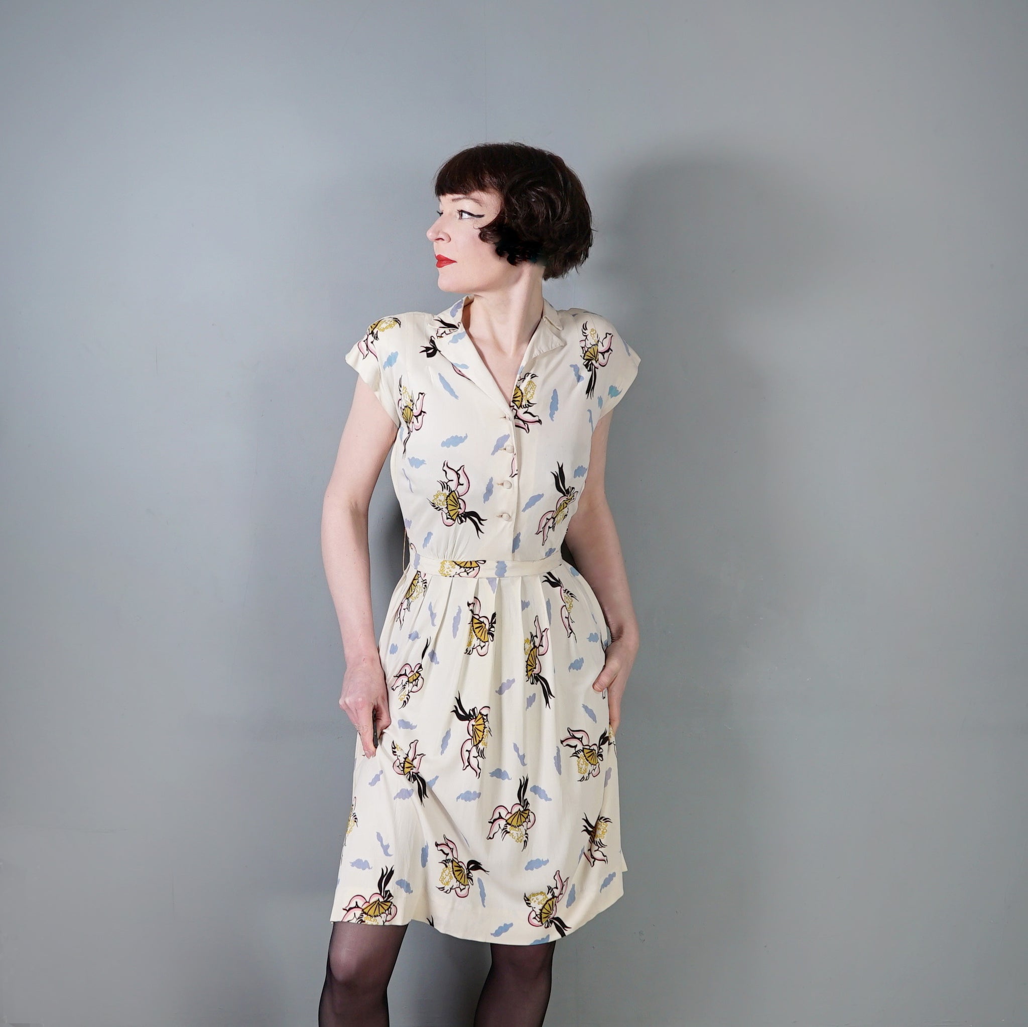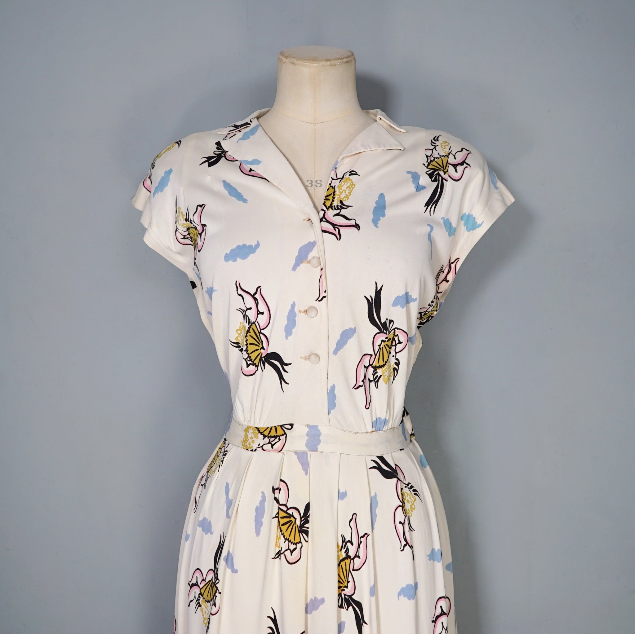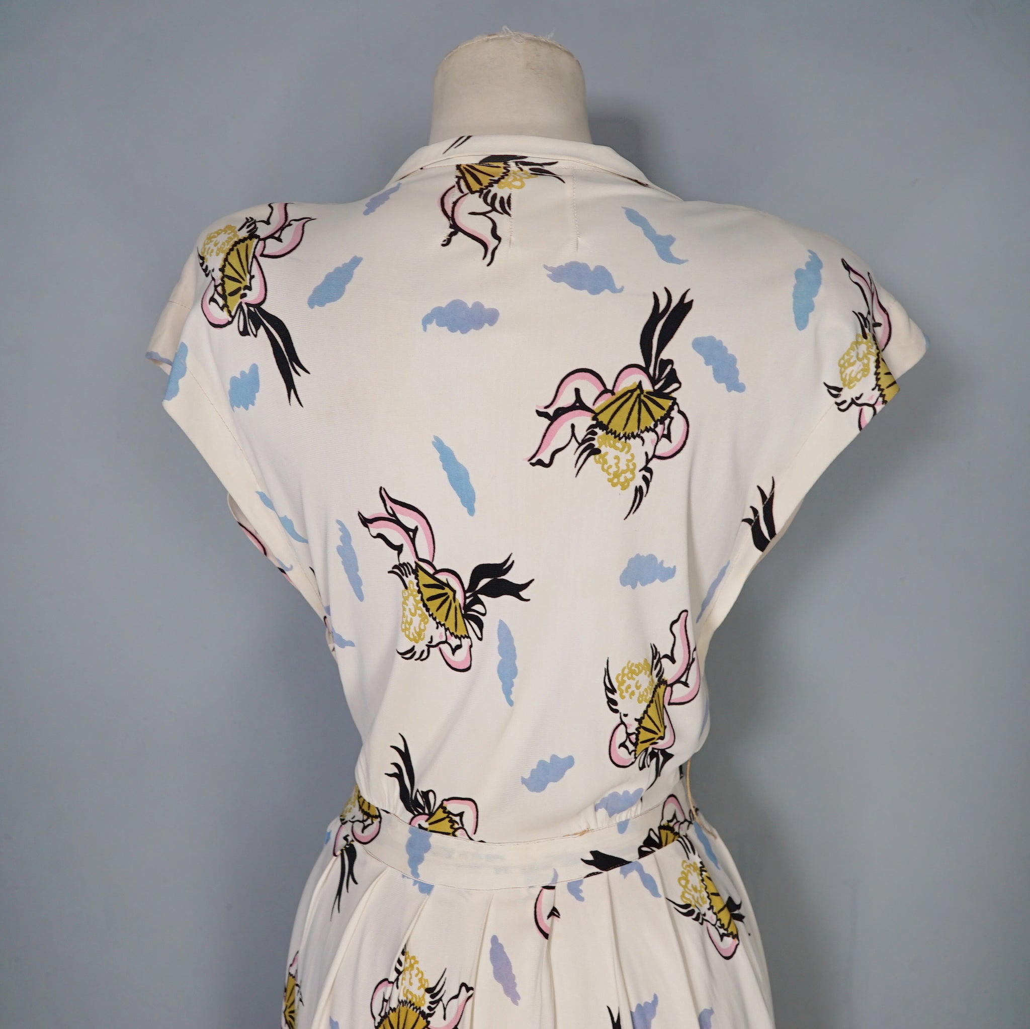 Fun and very unusual pritn 40s dress in a soft cream rayon jersey with a pretty amazing print of little cherubs/cupids with big black fans and bushy little blue clouds. Shirt style bodice with cap sleeve and padded shoulder. V-neck with slim collar. Four small covered buttons to fasten the chest. Top sewn waistband with small gathers at the sides to give a bit of fullness and blousey-ness to the bodice. Skirt is straight cut with some wide pleats for a soft fullness. Side seam fastens with a metal zip. No label.