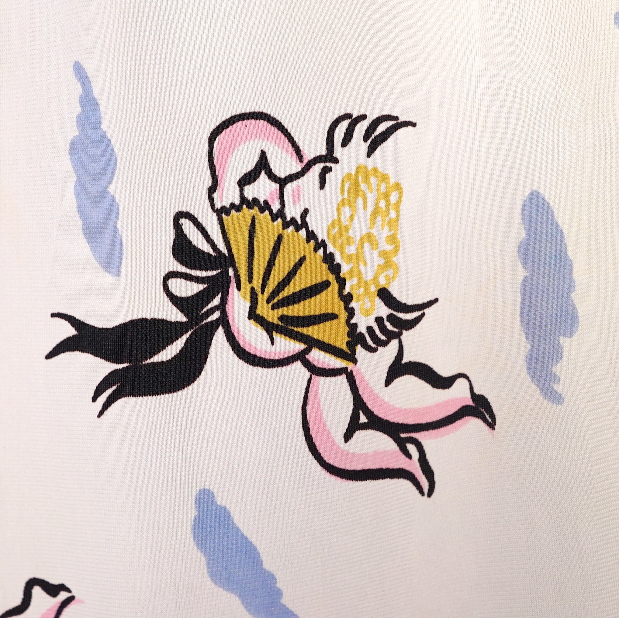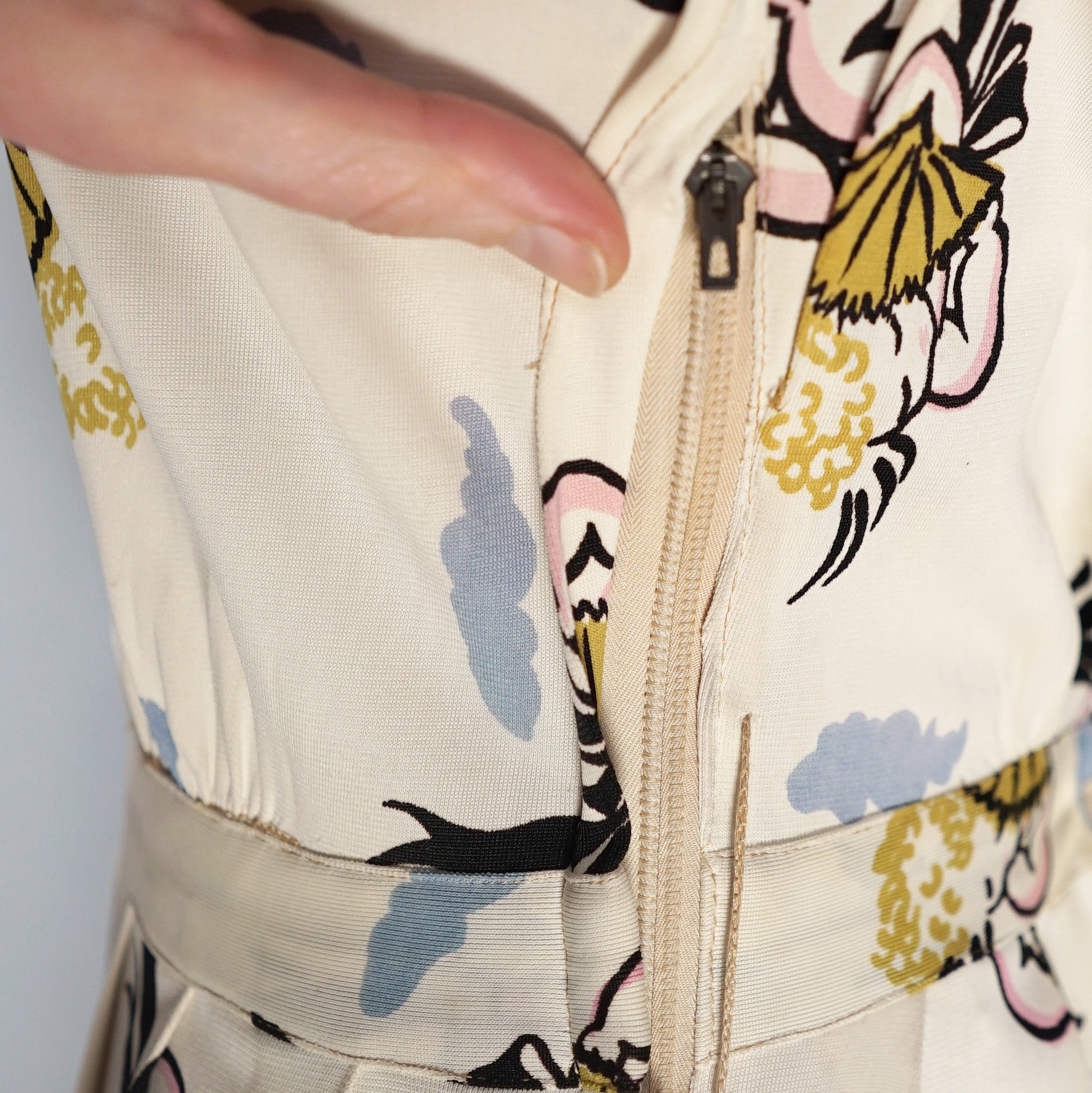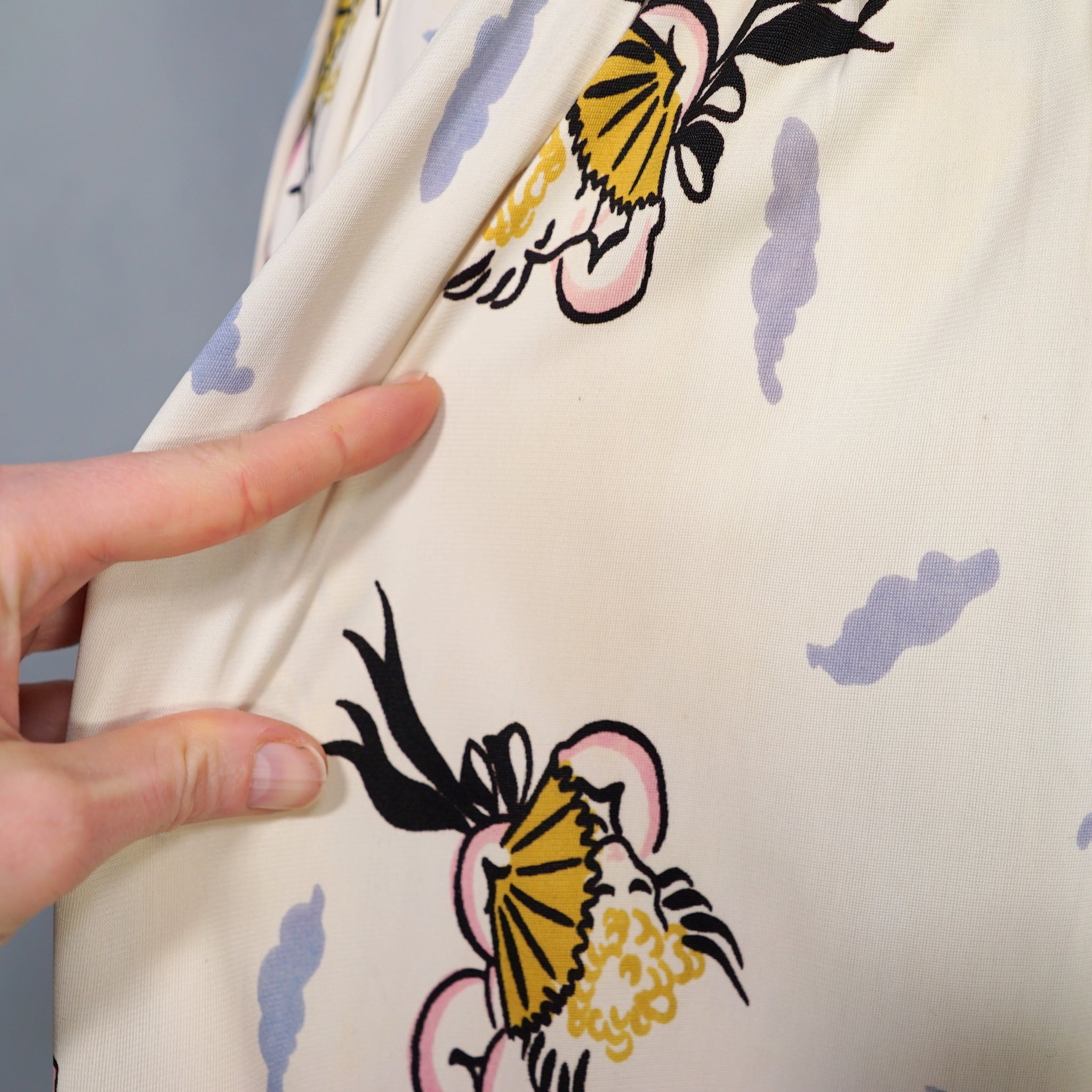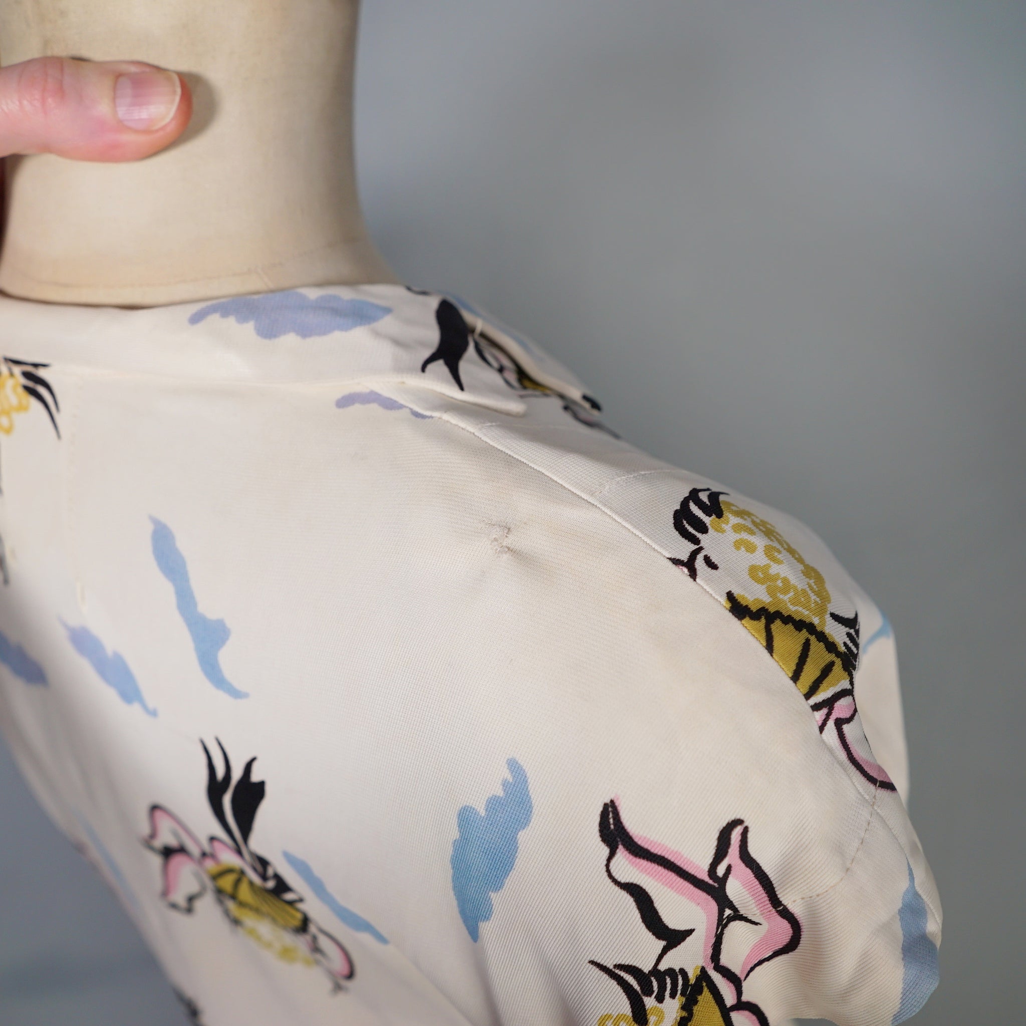 Fun and very unusual pritn 40s dress in a soft cream rayon jersey with a pretty amazing print of little cherubs/cupids with big black fans and bushy little blue clouds. Shirt style bodice with cap sleeve and padded shoulder. V-neck with slim collar. Four small covered buttons to fasten the chest. Top sewn waistband with small gathers at the sides to give a bit of fullness and blousey-ness to the bodice. Skirt is straight cut with some wide pleats for a soft fullness. Side seam fastens with a metal zip. No label.