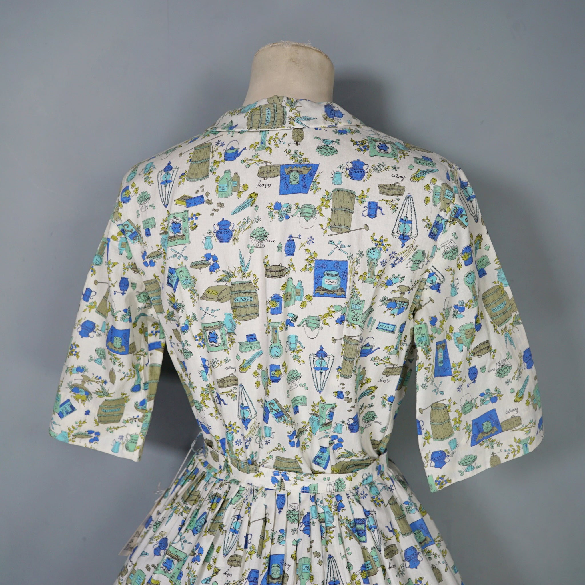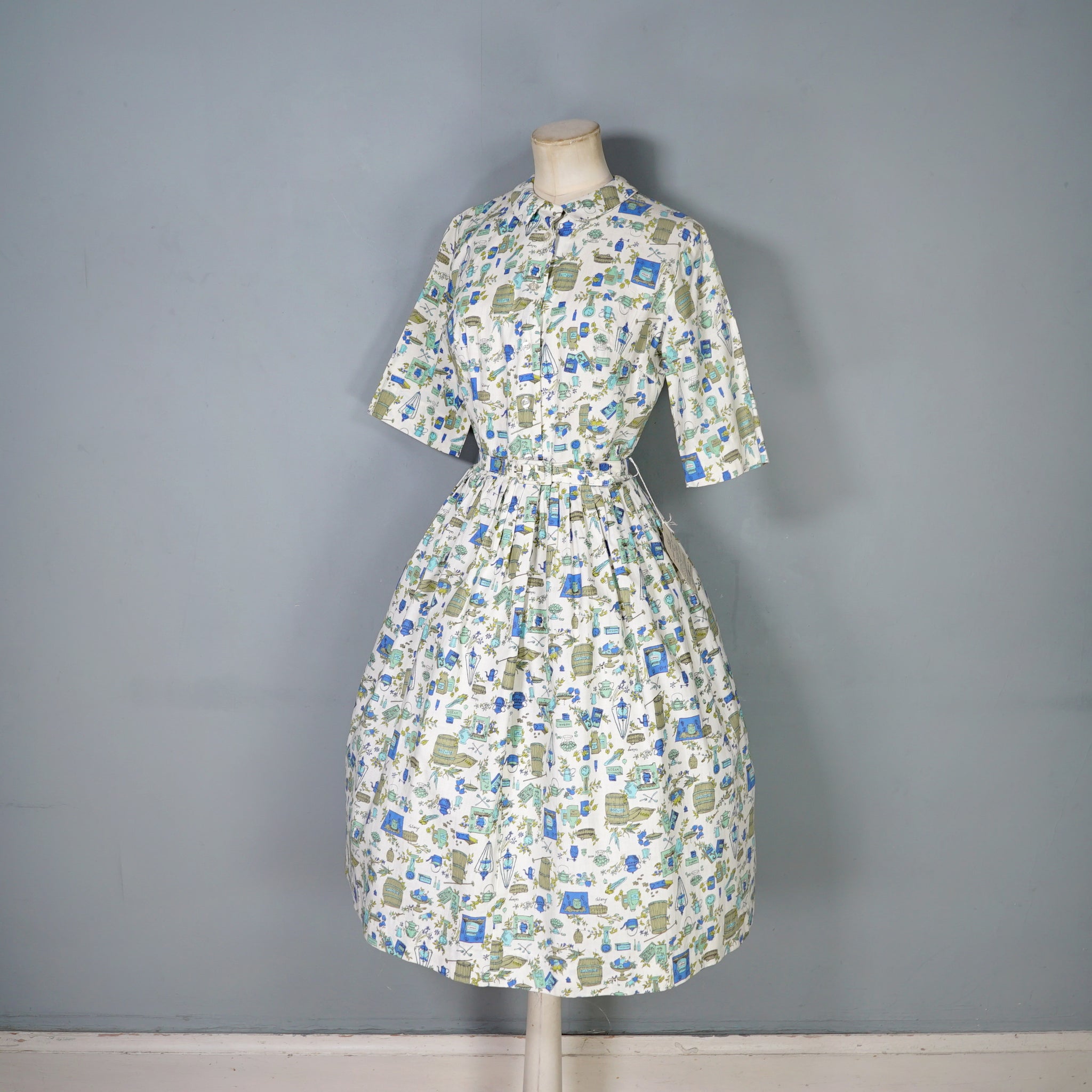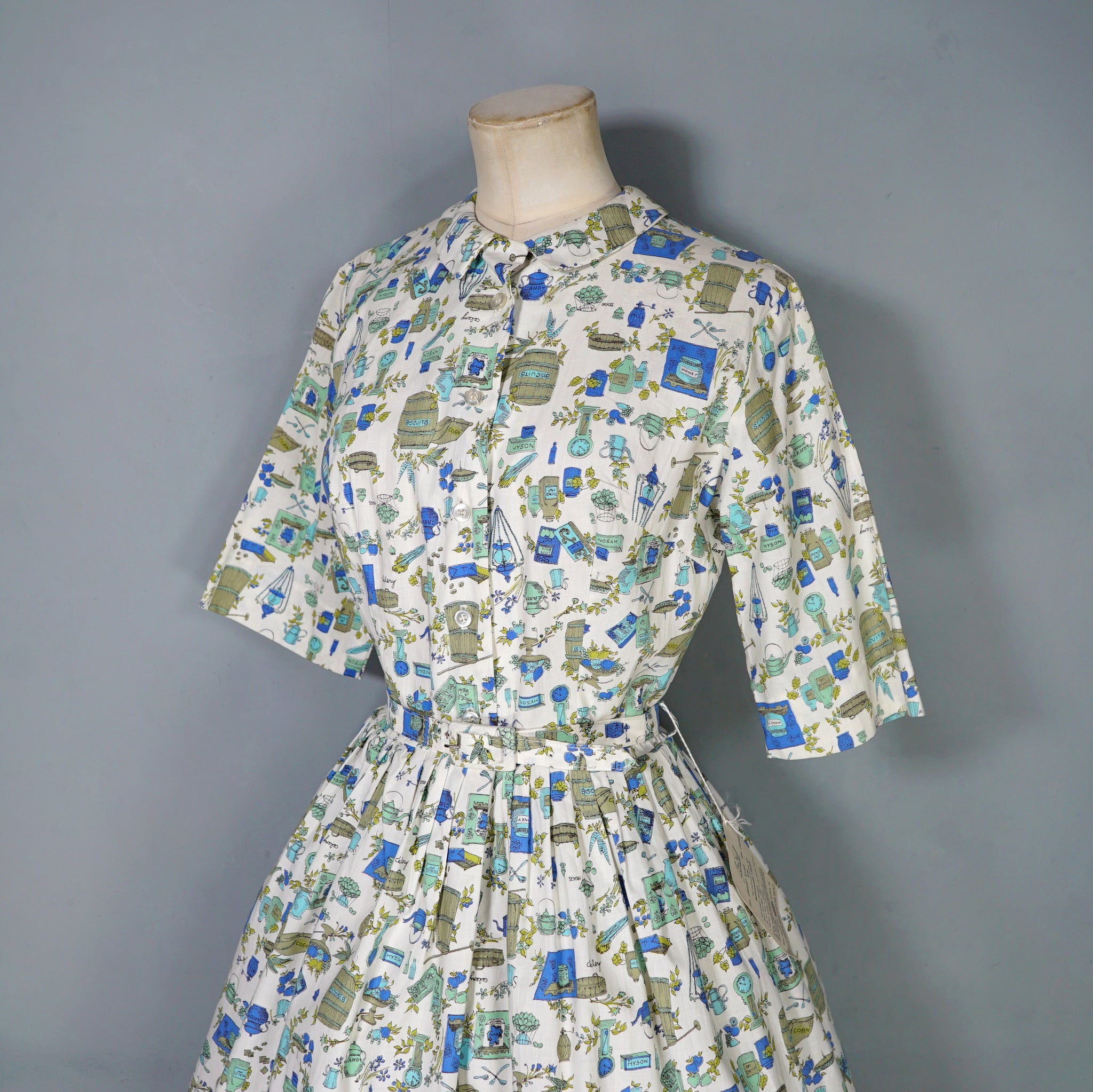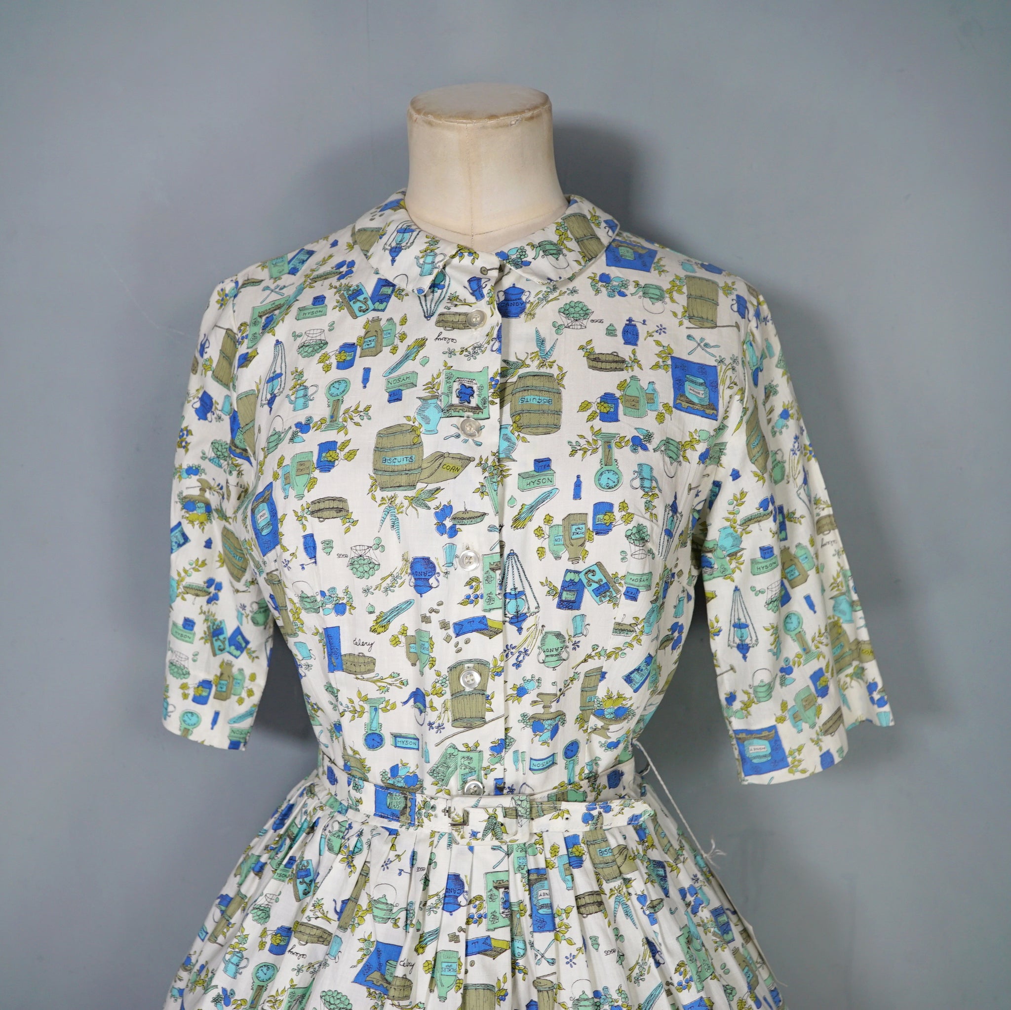 Fun little shirtwaister dress by "Shirtwaist Classic" in a soft rayon cotton blend in cream colour with the cutest whimisical print of what can best be described as the contents of a kitchen larder - tea pots, bisquit tins, fruit bowls, cooking books, scales, celeri, bags of corns and various utensils and condiments. Soft blue, green and olive colours. Bodice is buttoned to the front and has a high neck with collar and a half sleeve. Fitted waist with matching belt. Full midi skirt sewn in neat narrow pleats to waistband. Such a sweetheart of a dress.