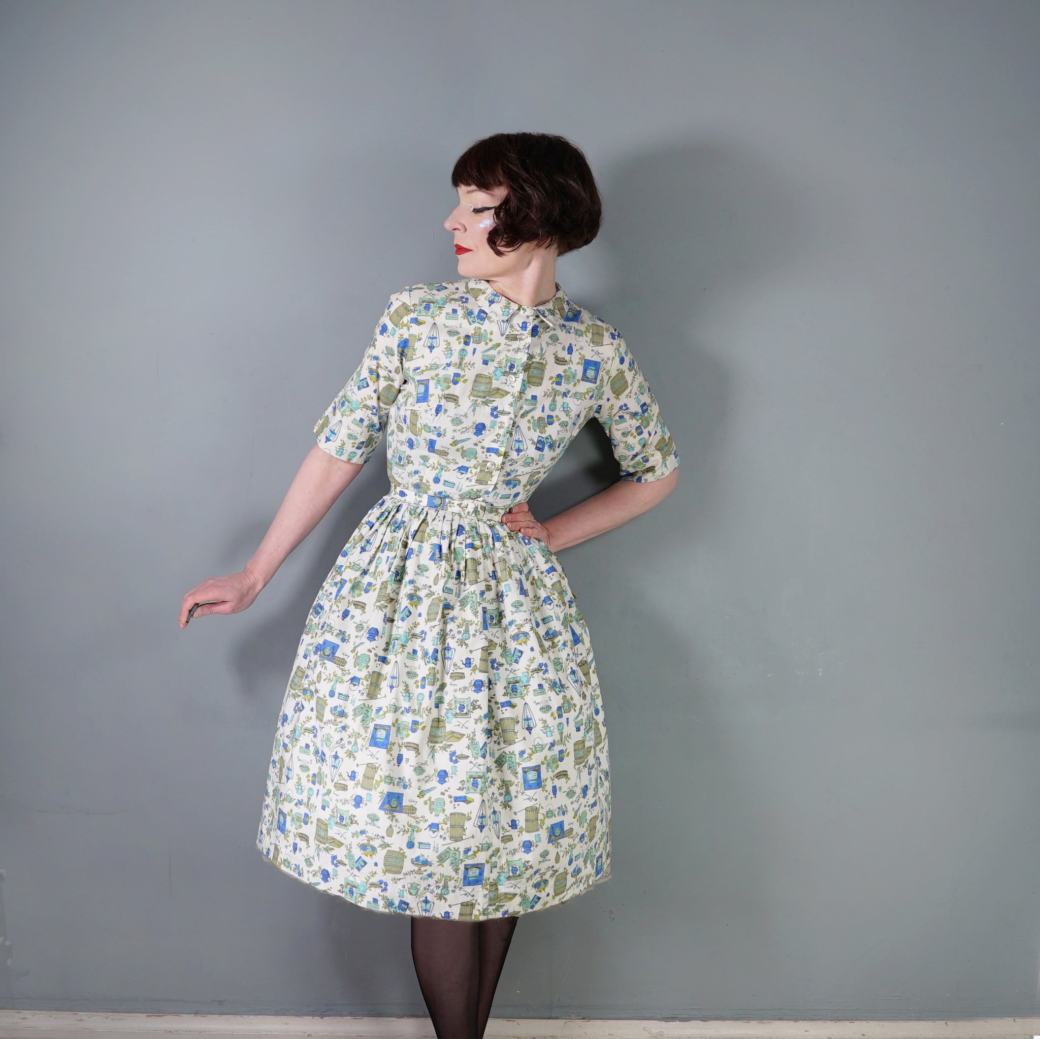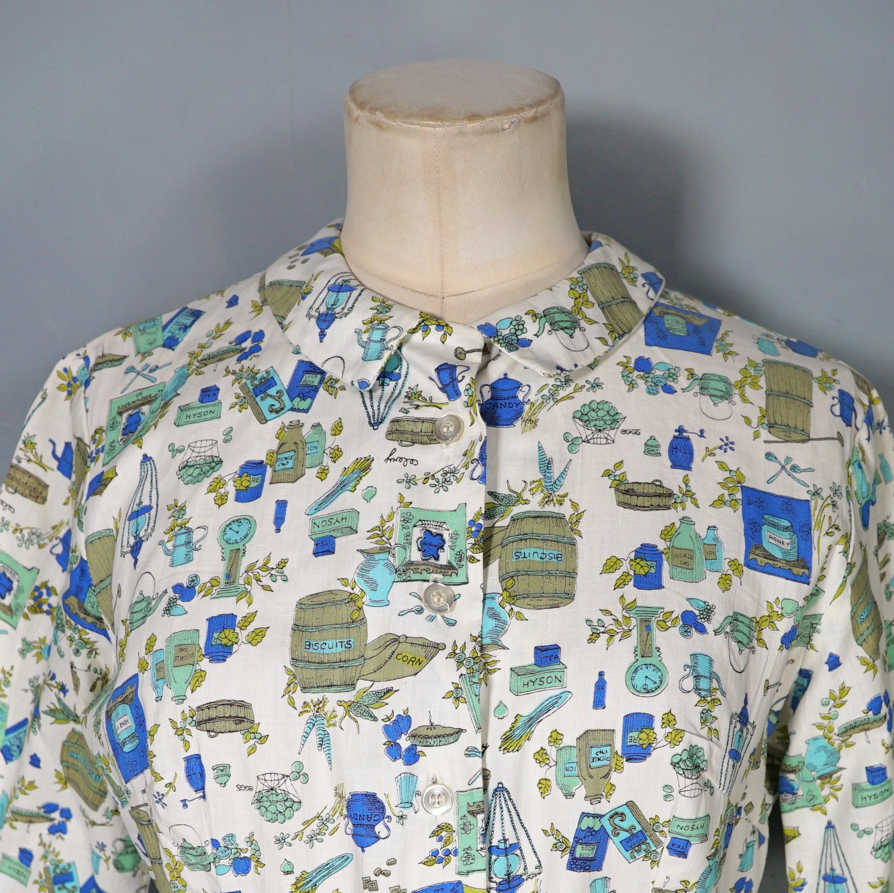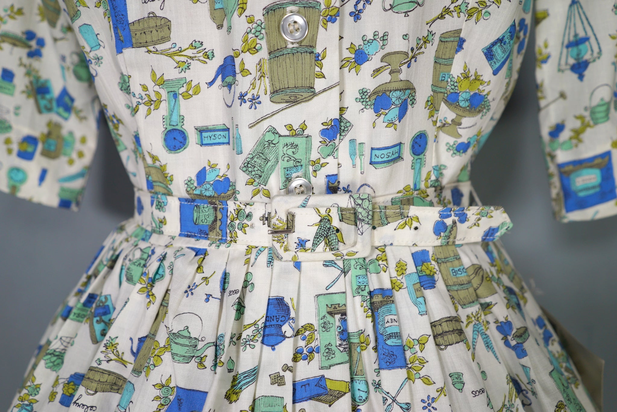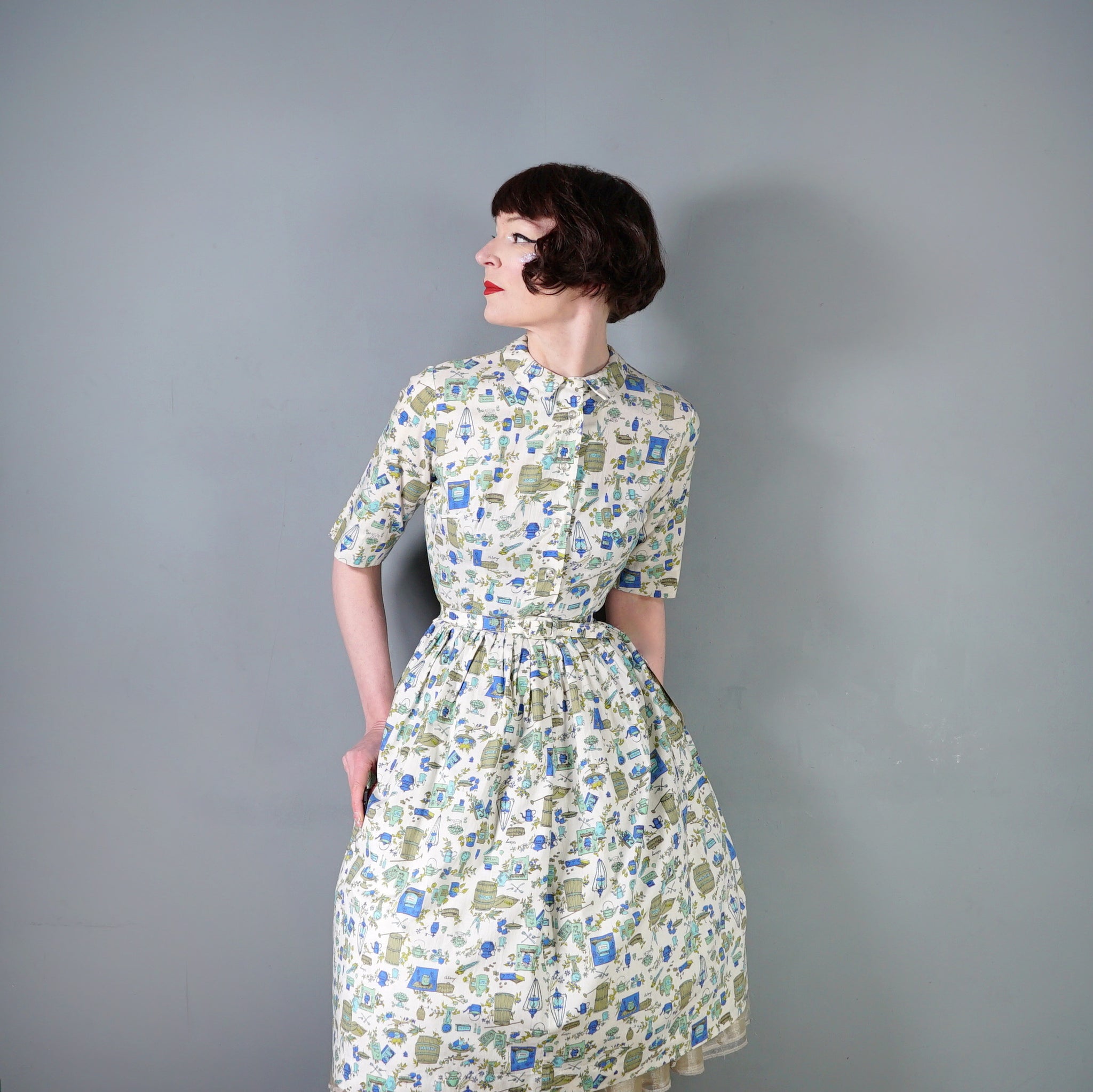 Fun little shirtwaister dress by "Shirtwaist Classic" in a soft rayon cotton blend in cream colour with the cutest whimisical print of what can best be described as the contents of a kitchen larder - tea pots, bisquit tins, fruit bowls, cooking books, scales, celeri, bags of corns and various utensils and condiments. Soft blue, green and olive colours. Bodice is buttoned to the front and has a high neck with collar and a half sleeve. Fitted waist with matching belt. Full midi skirt sewn in neat narrow pleats to waistband. Such a sweetheart of a dress.