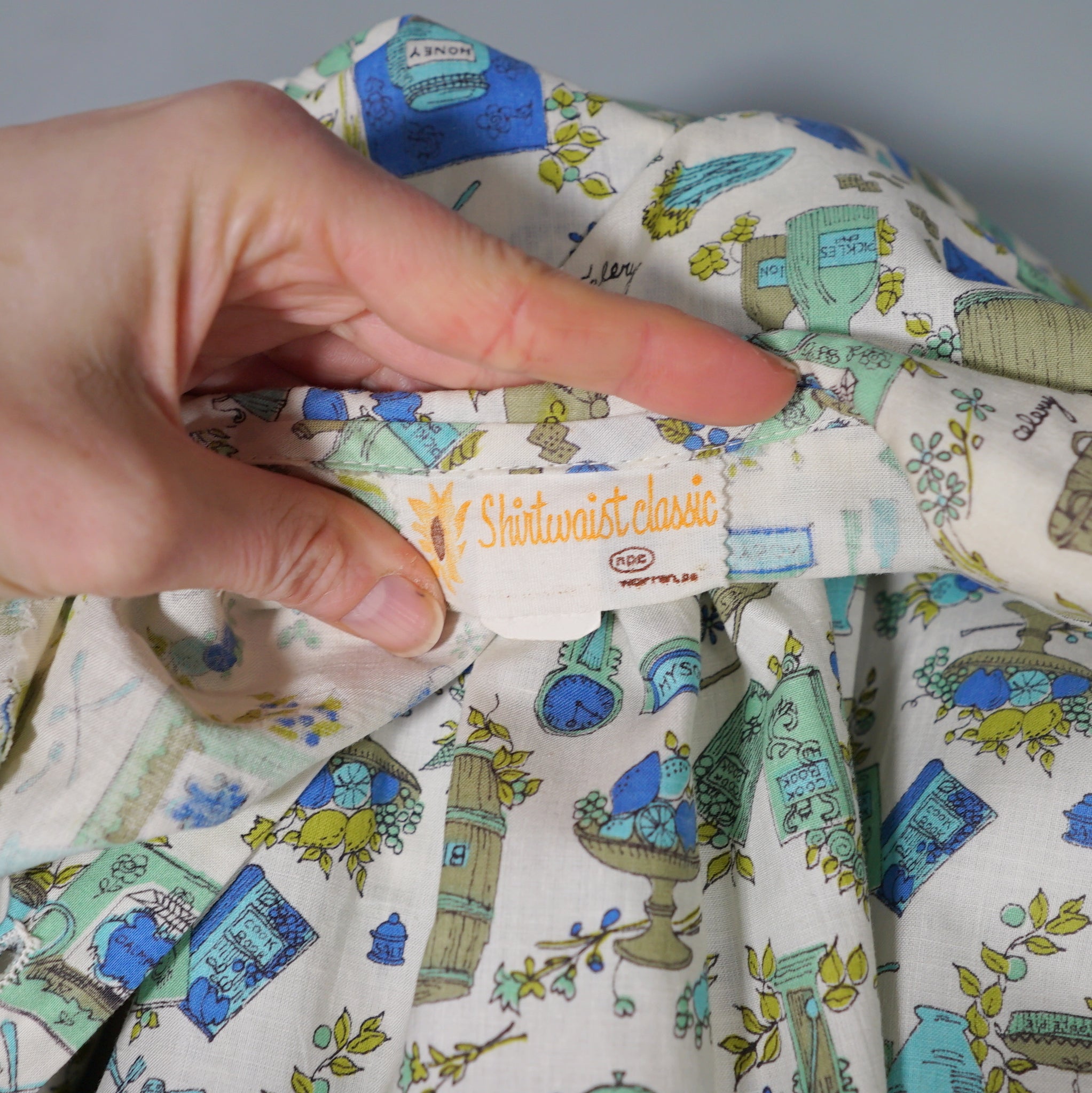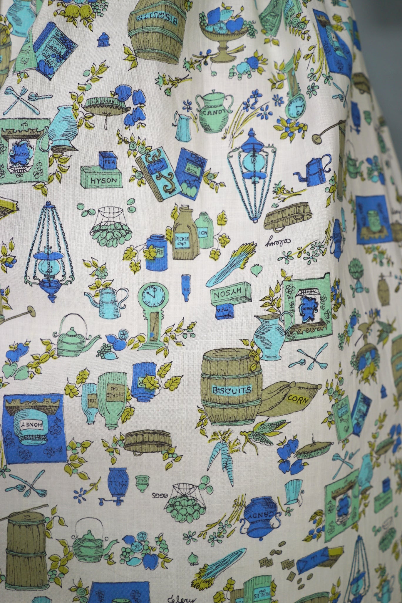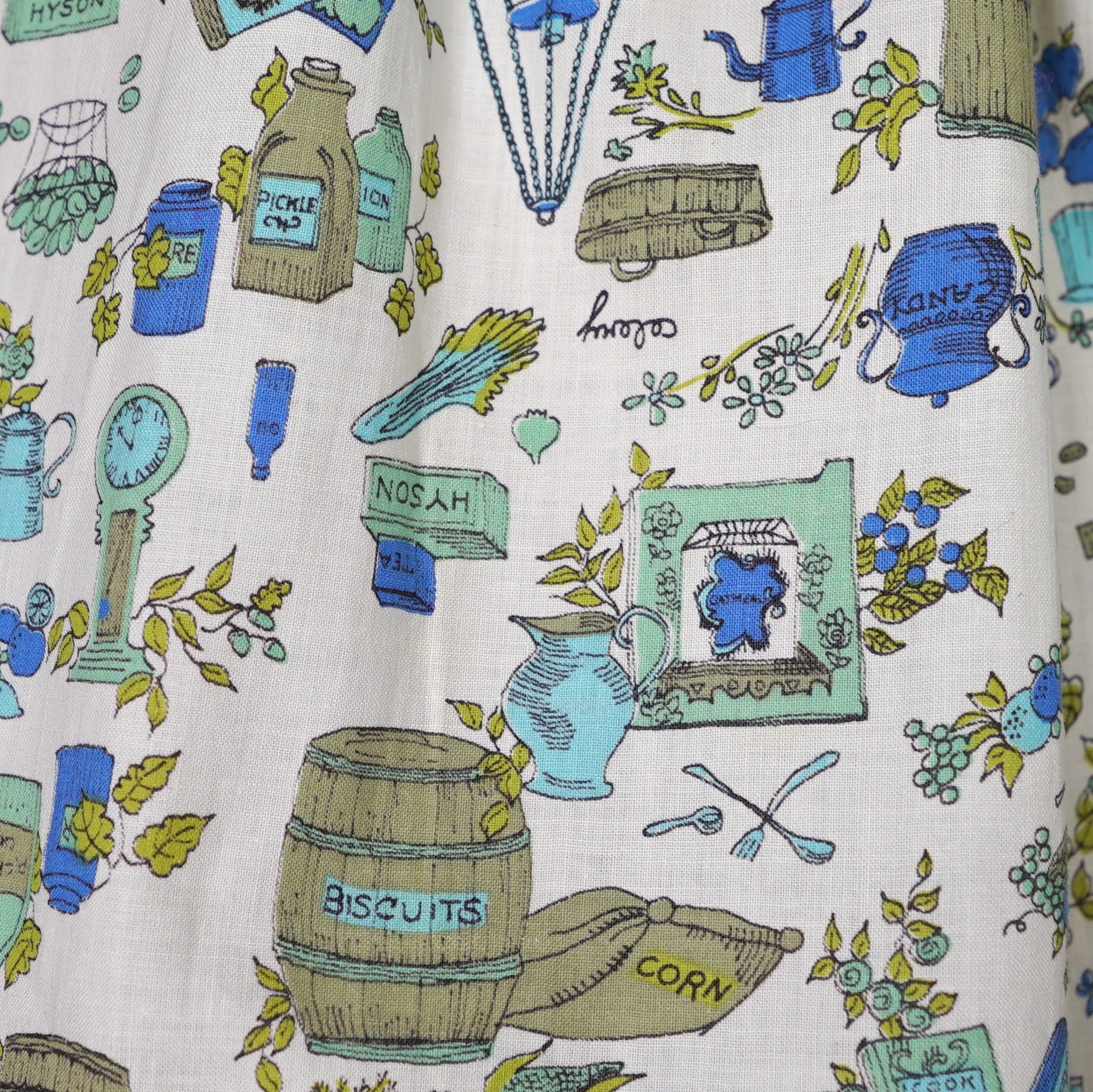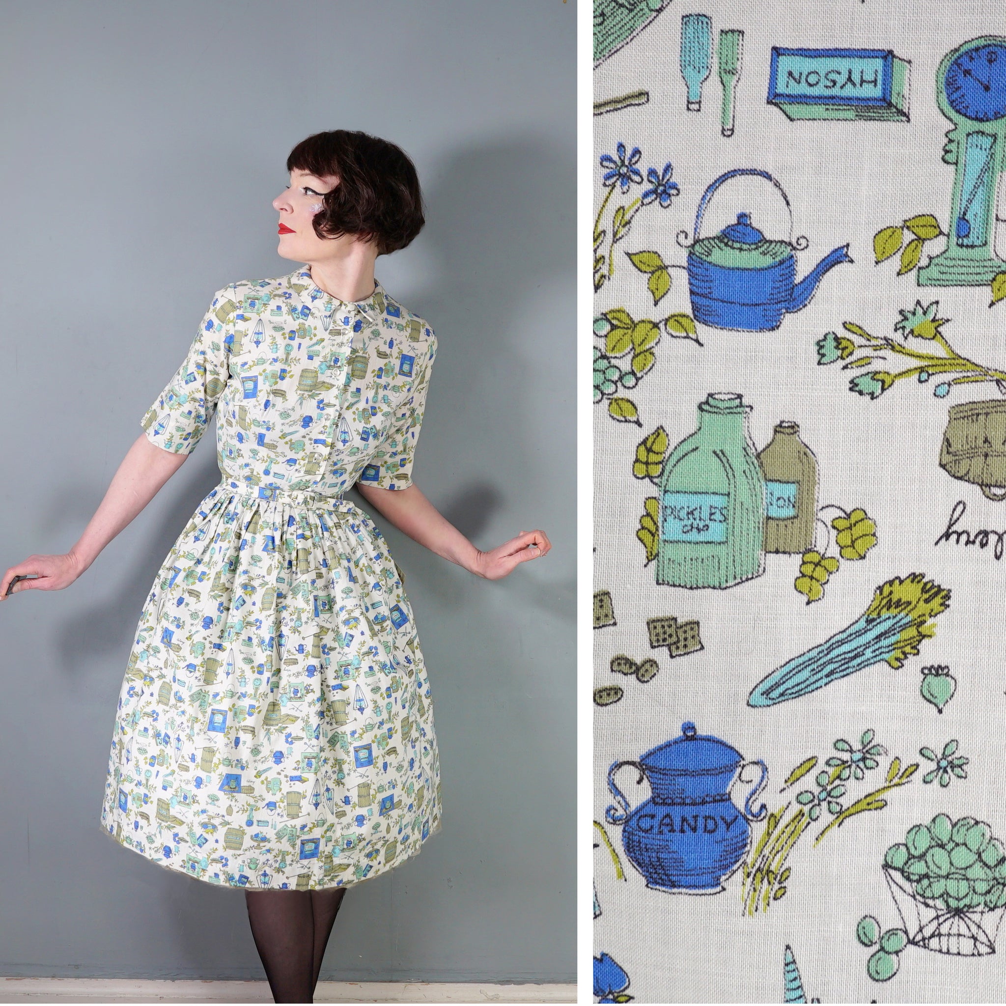 Fun little shirtwaister dress by "Shirtwaist Classic" in a soft rayon cotton blend in cream colour with the cutest whimisical print of what can best be described as the contents of a kitchen larder - tea pots, bisquit tins, fruit bowls, cooking books, scales, celeri, bags of corns and various utensils and condiments. Soft blue, green and olive colours. Bodice is buttoned to the front and has a high neck with collar and a half sleeve. Fitted waist with matching belt. Full midi skirt sewn in neat narrow pleats to waistband. Such a sweetheart of a dress.