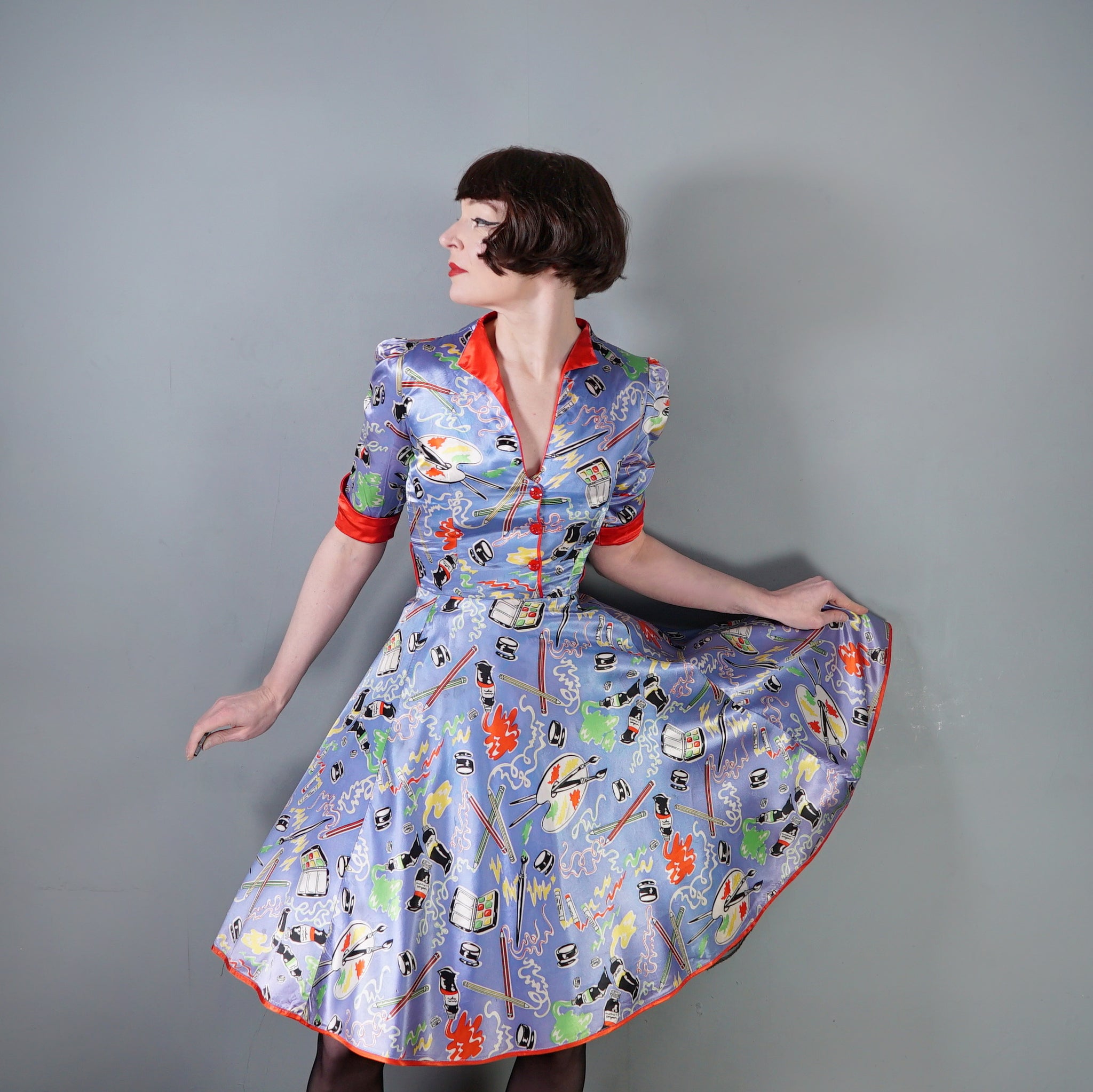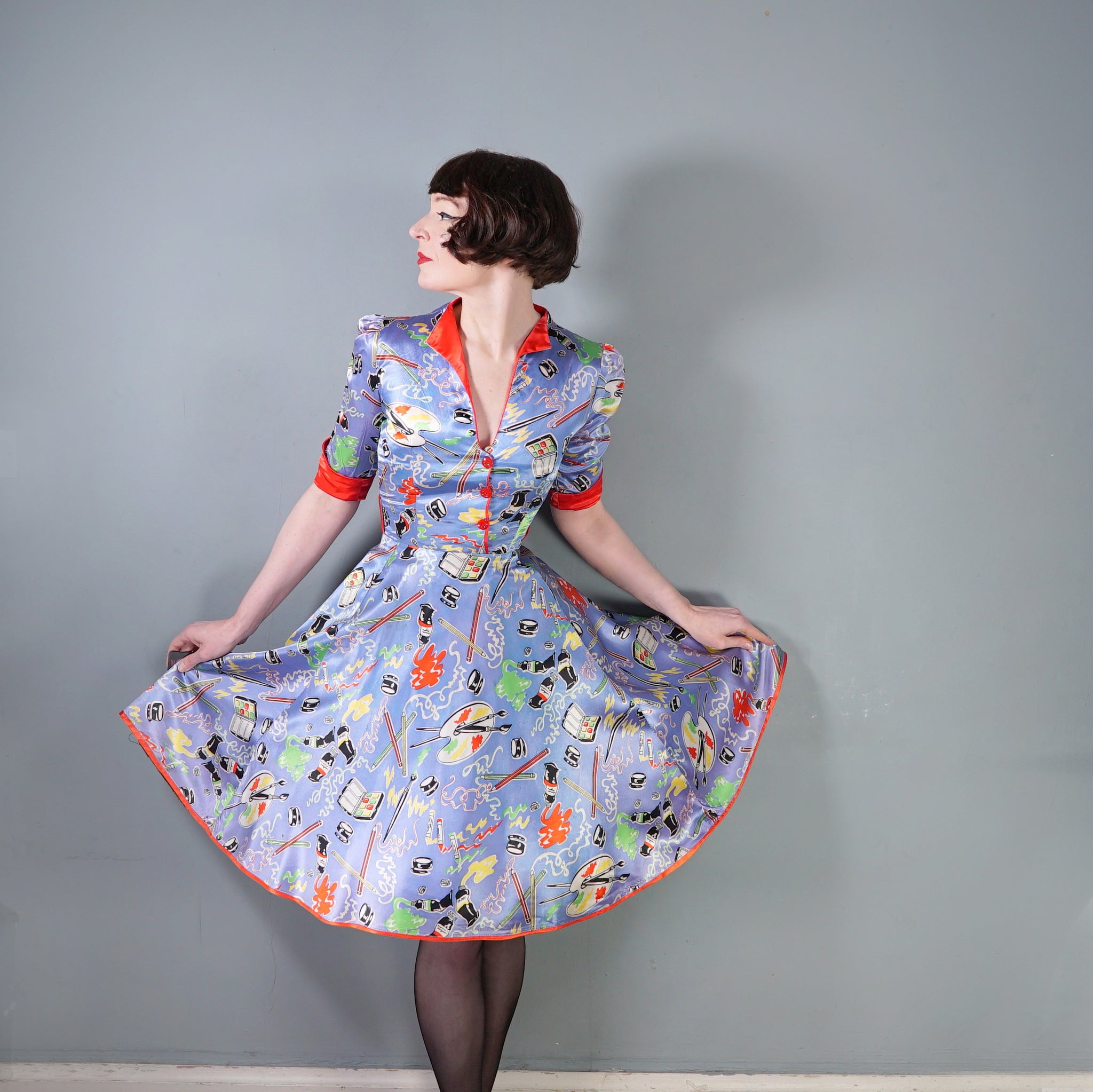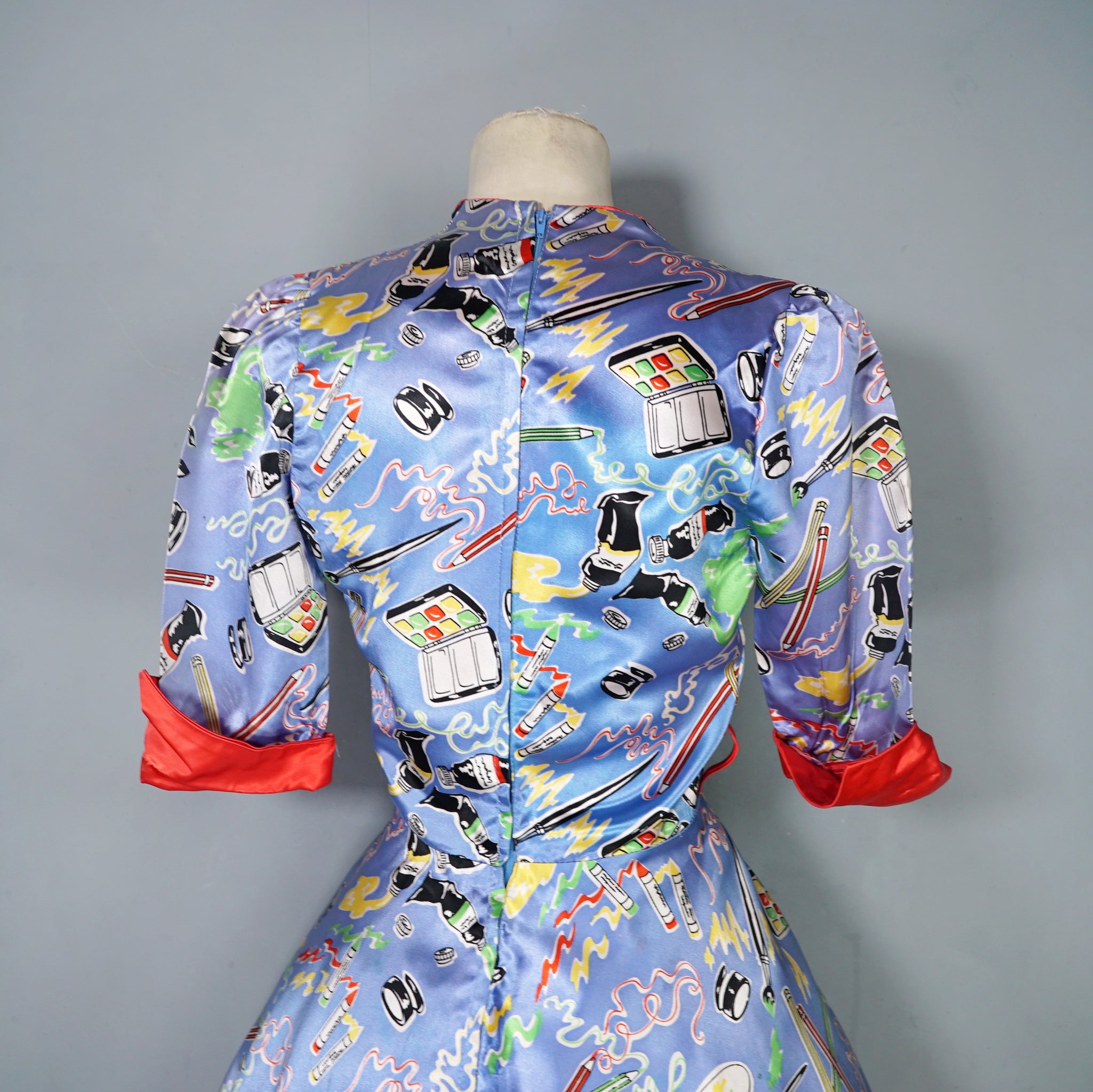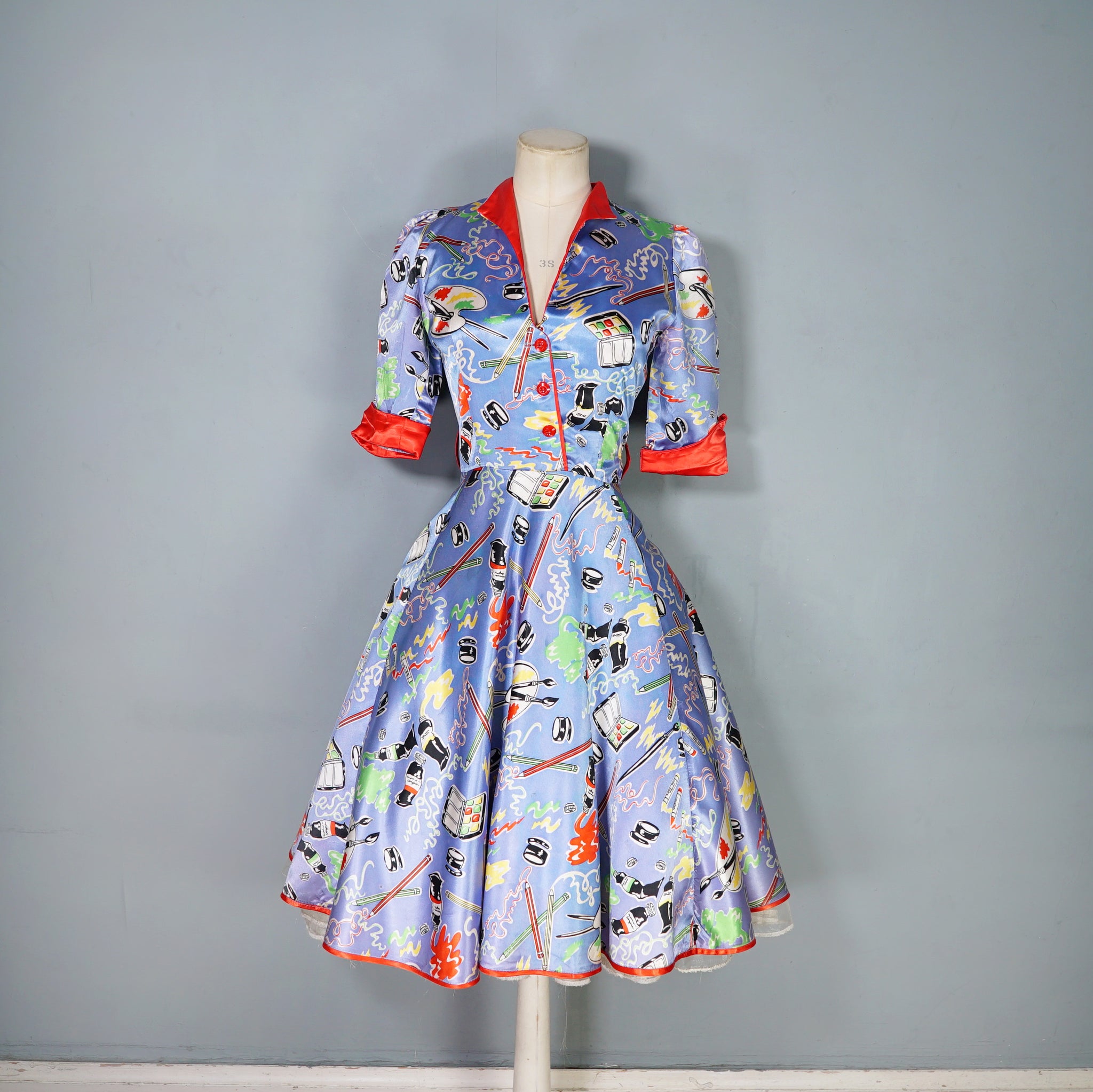 Very rare "Miss Mouse" iconic 70s novelty dress in a 50s diner style with the most amazing painter's print of paint tubes, pencils and palettes. Soft light blue shade with colourful pritn and bright red trims to the neck and turn up cuffs. Bodice is fitted and has a v-neck and three small slightly slanted buttons to fasten the front. Fitted waistband with belt loops but no belt. Full flippy skirt with red trimmed hem, not quite full circle, but close. Back metal zip to fasten. Fabric is a synthetic satin, crisp and glossy.