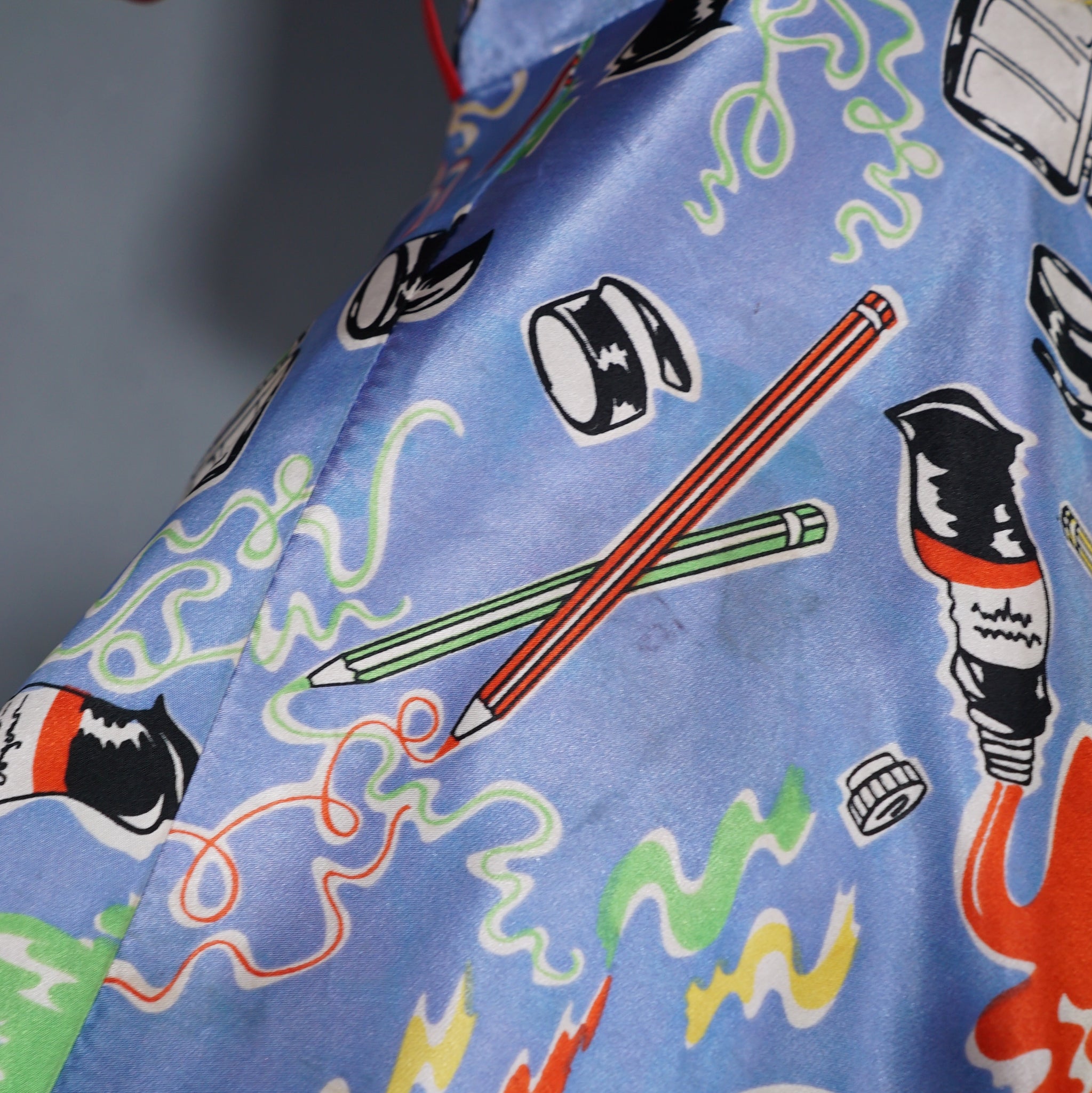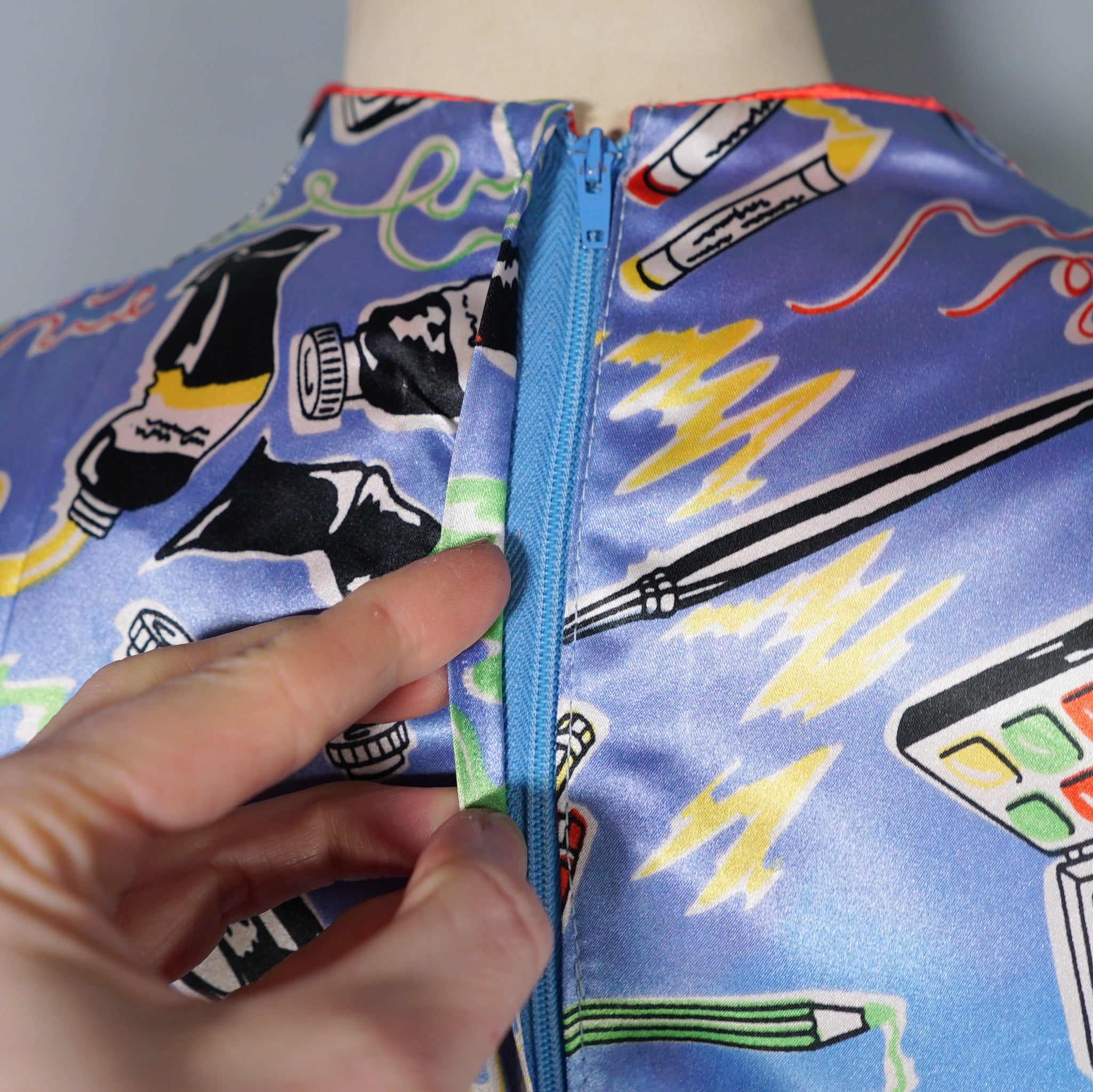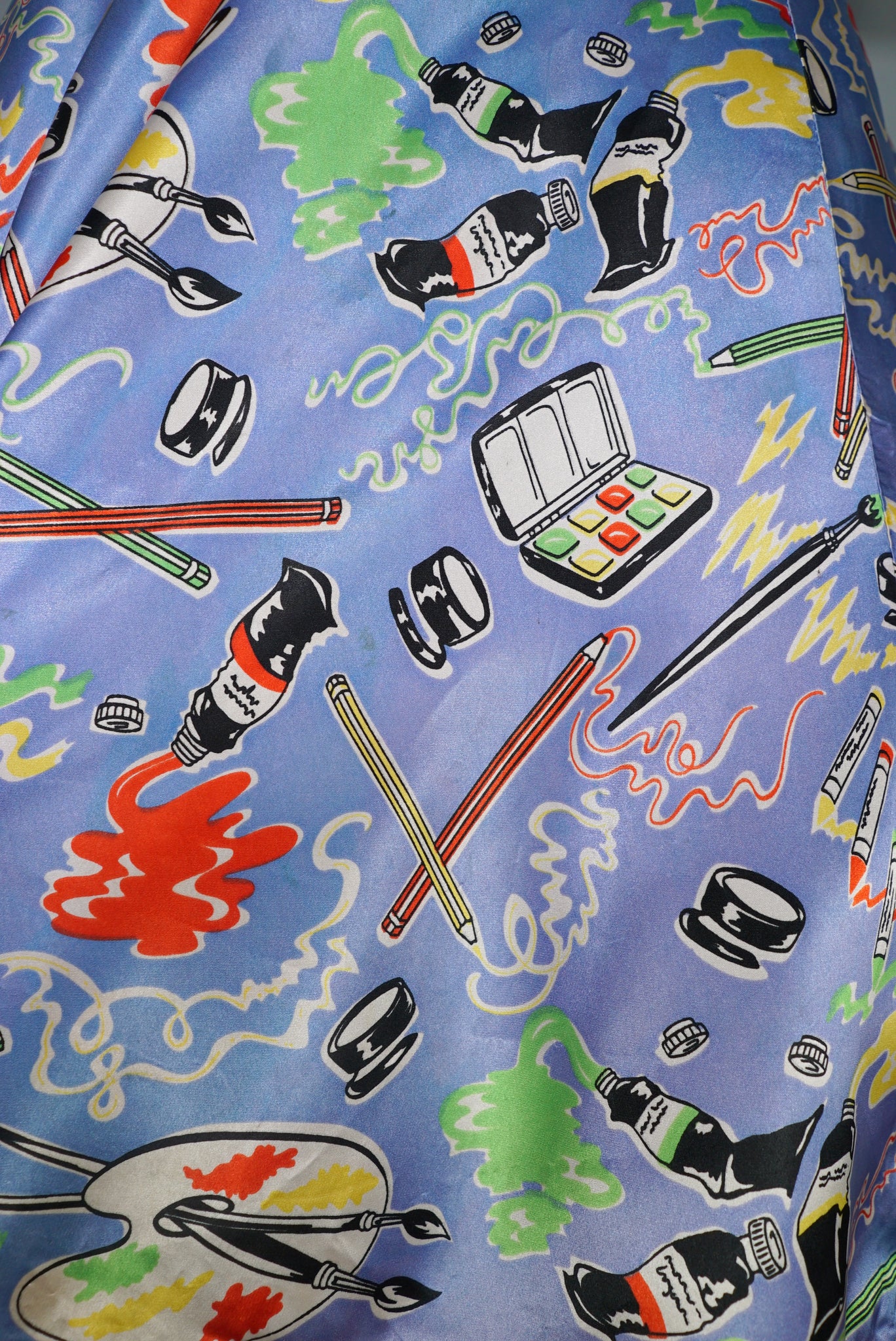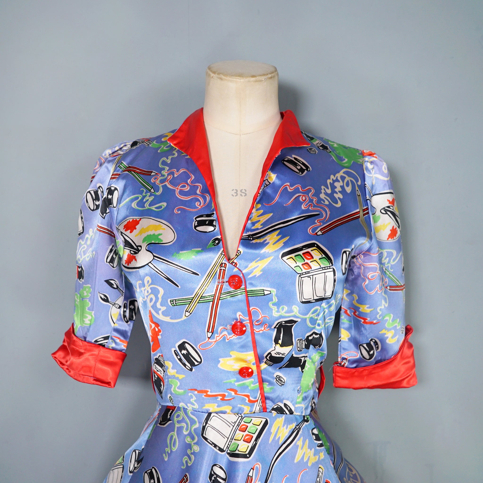 Very rare "Miss Mouse" iconic 70s novelty dress in a 50s diner style with the most amazing painter's print of paint tubes, pencils and palettes. Soft light blue shade with colourful pritn and bright red trims to the neck and turn up cuffs. Bodice is fitted and has a v-neck and three small slightly slanted buttons to fasten the front. Fitted waistband with belt loops but no belt. Full flippy skirt with red trimmed hem, not quite full circle, but close. Back metal zip to fasten. Fabric is a synthetic satin, crisp and glossy.