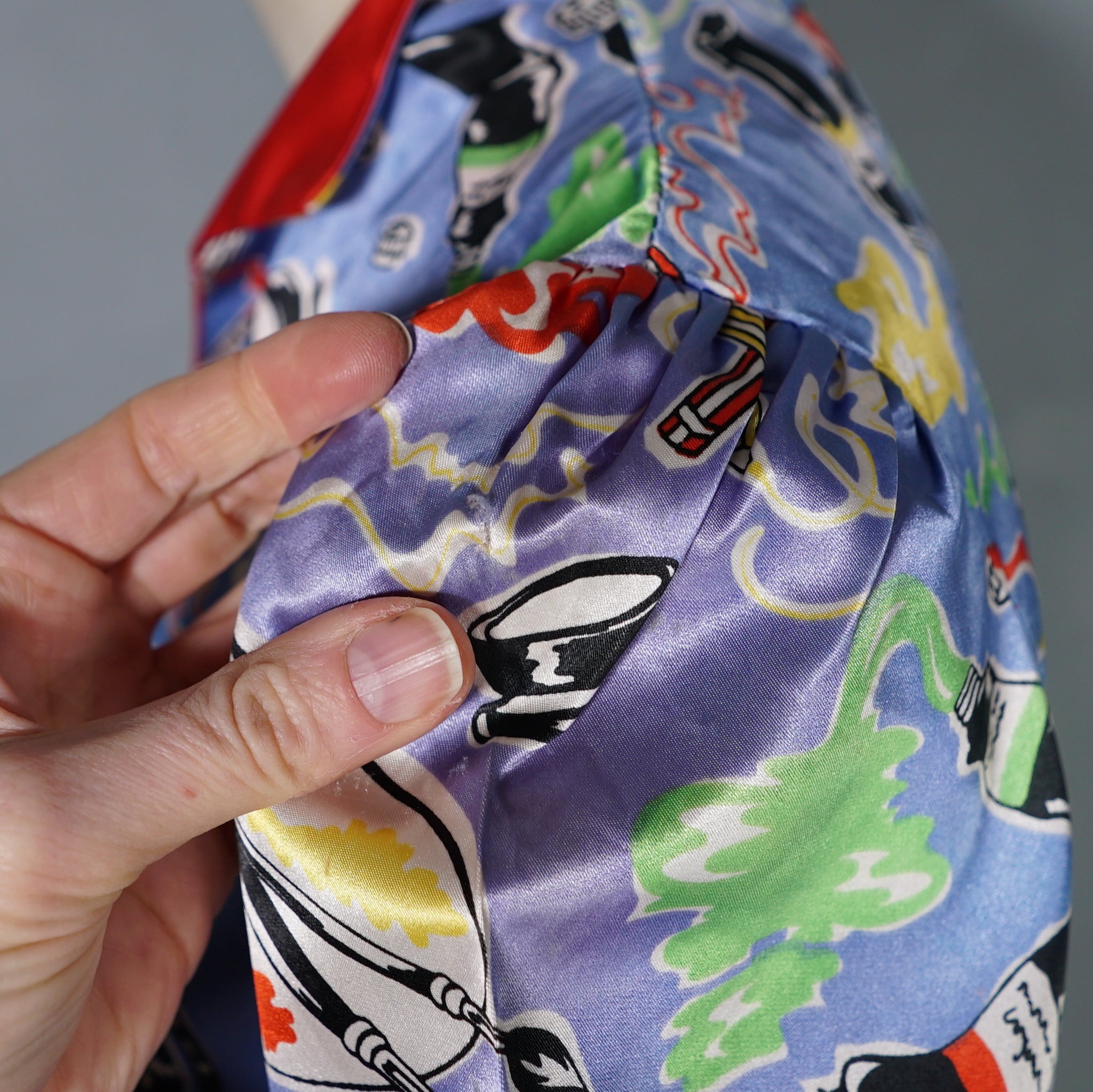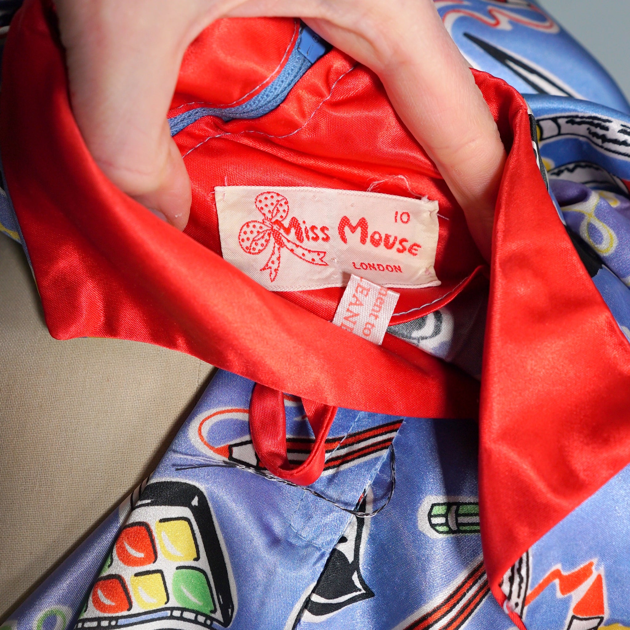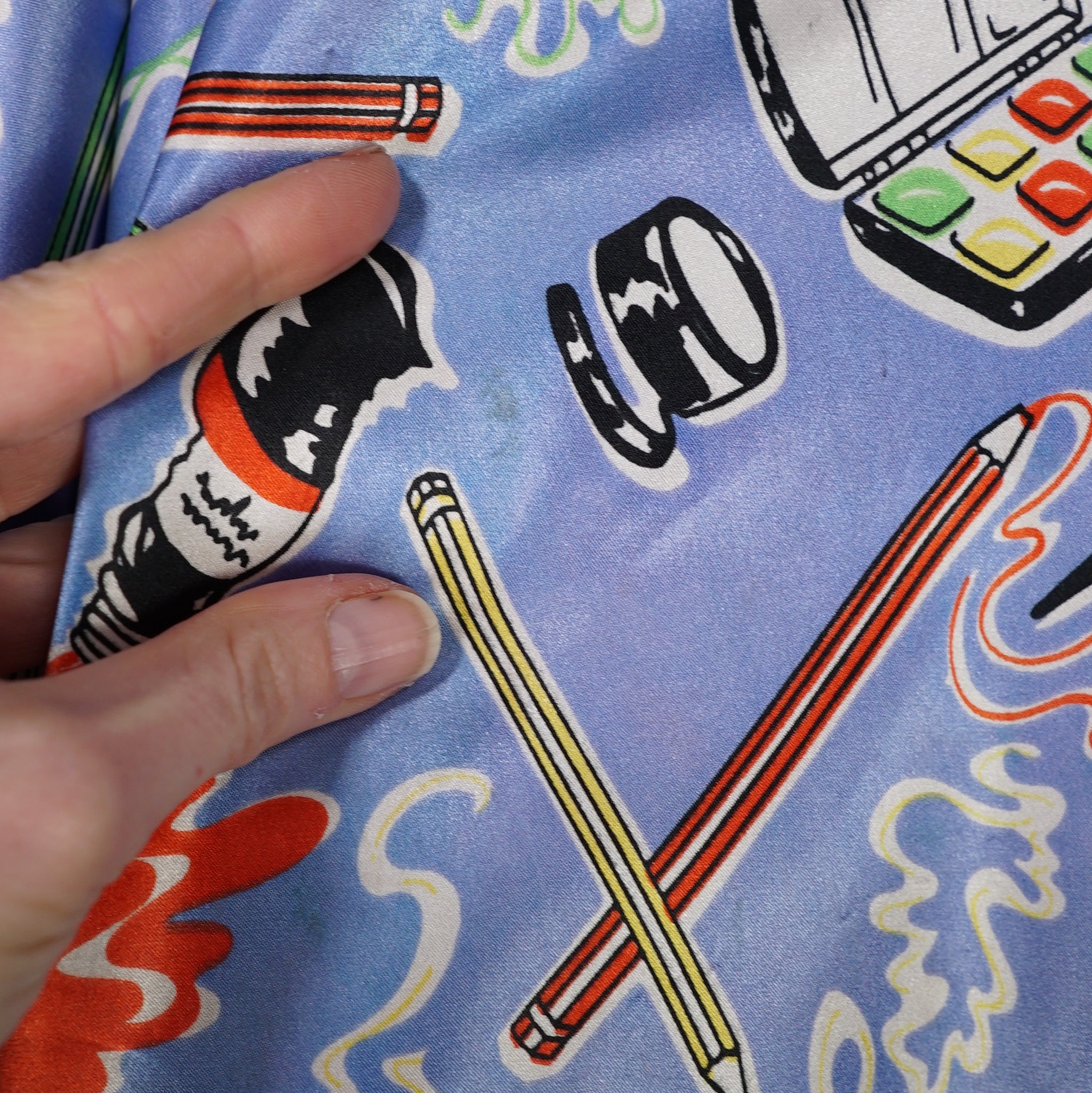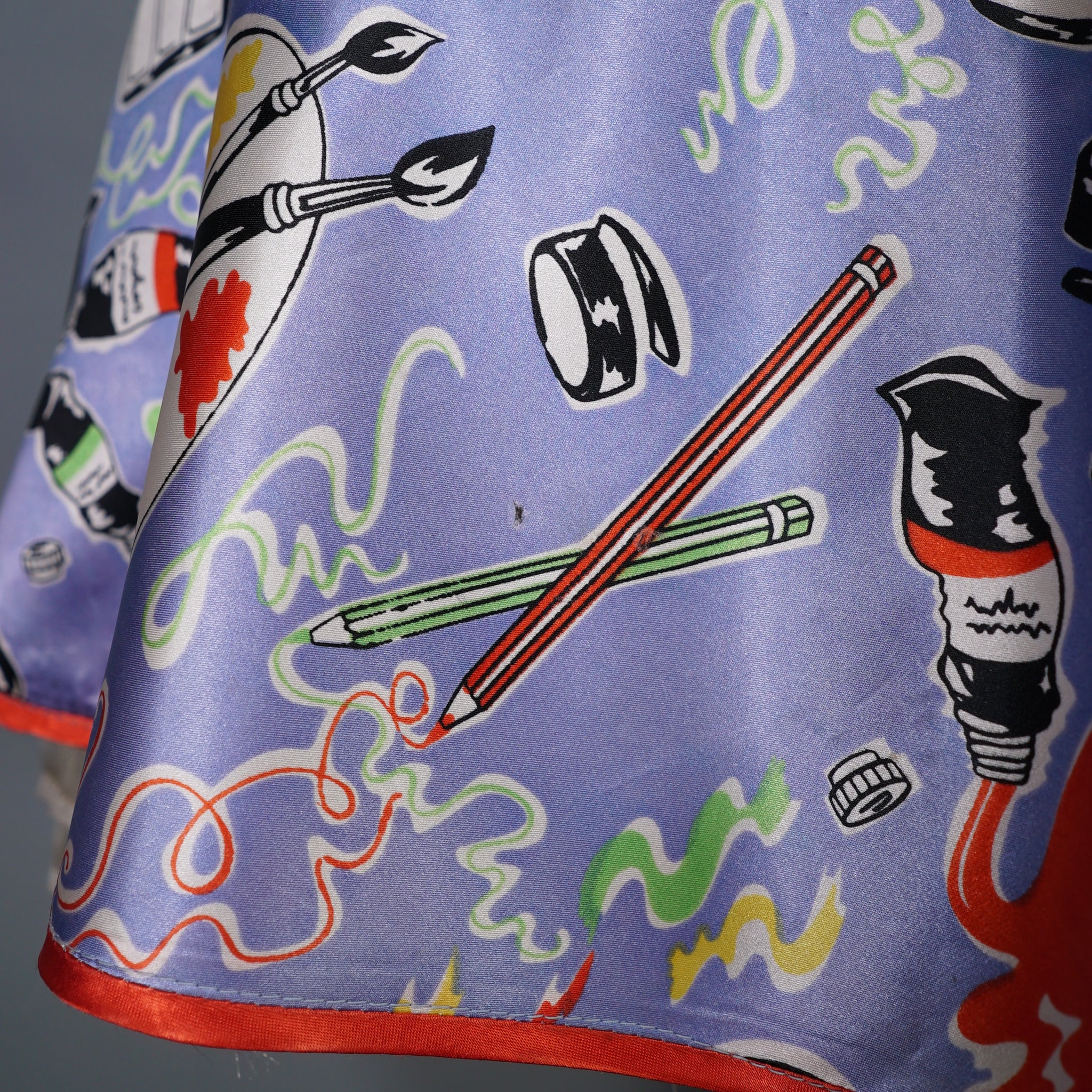 Very rare "Miss Mouse" iconic 70s novelty dress in a 50s diner style with the most amazing painter's print of paint tubes, pencils and palettes. Soft light blue shade with colourful pritn and bright red trims to the neck and turn up cuffs. Bodice is fitted and has a v-neck and three small slightly slanted buttons to fasten the front. Fitted waistband with belt loops but no belt. Full flippy skirt with red trimmed hem, not quite full circle, but close. Back metal zip to fasten. Fabric is a synthetic satin, crisp and glossy.