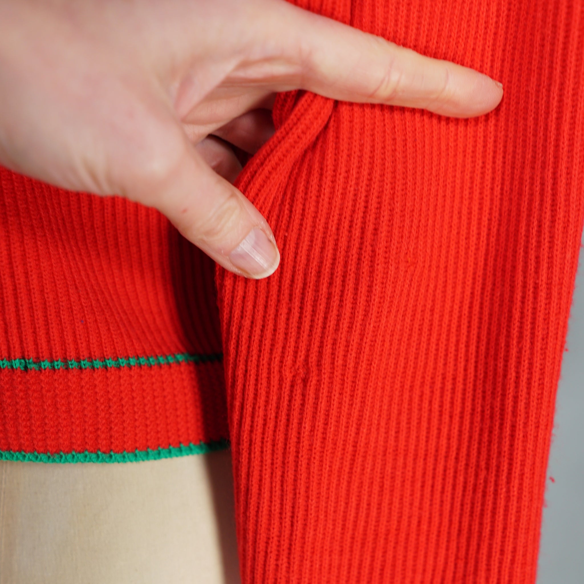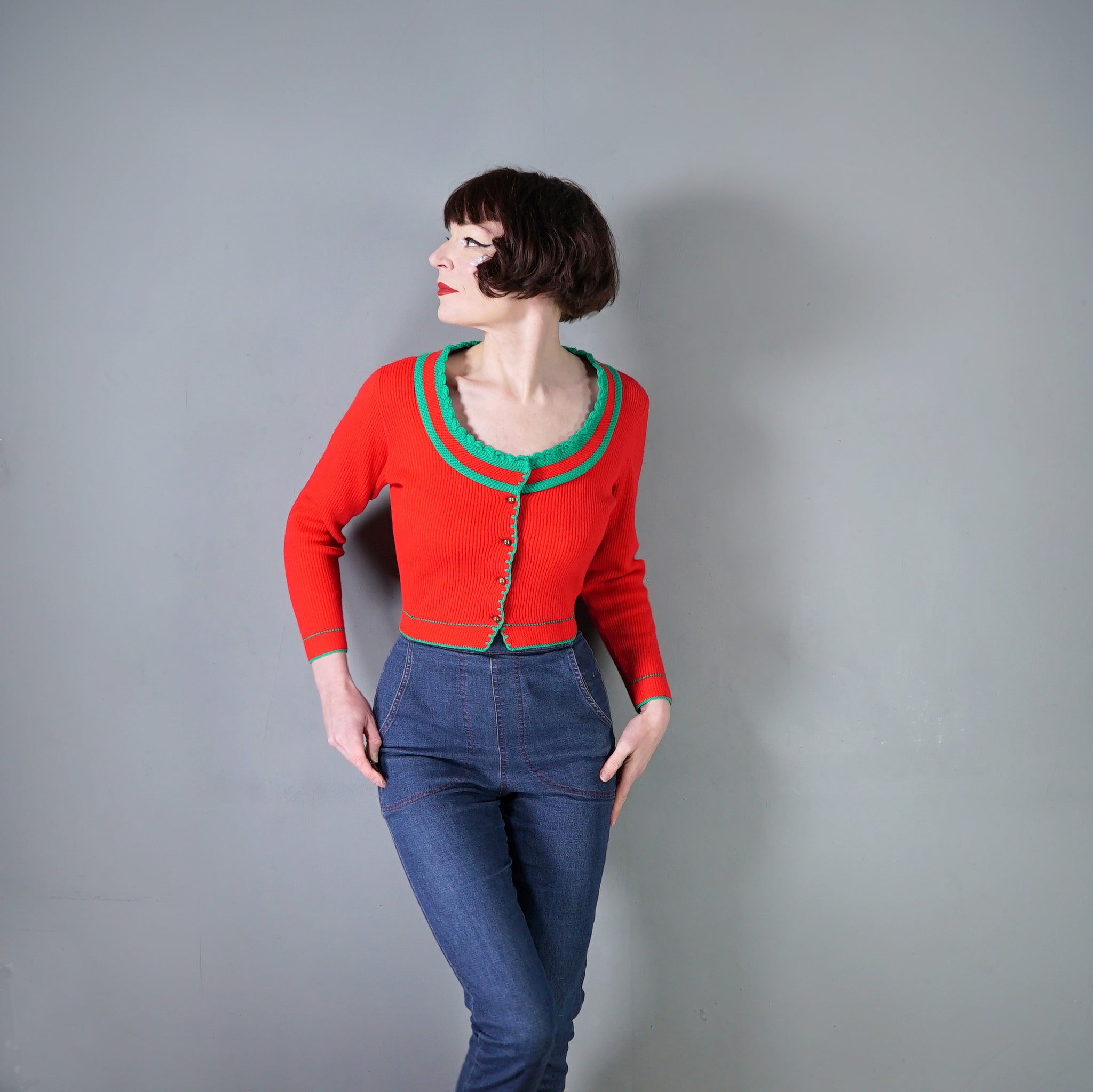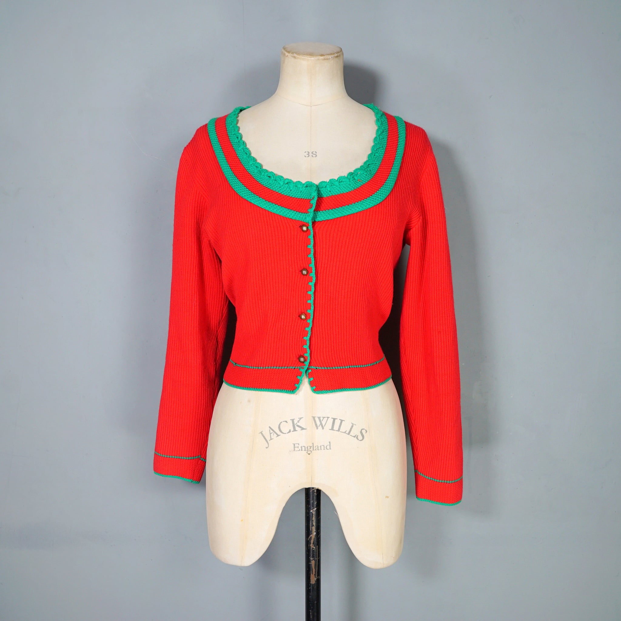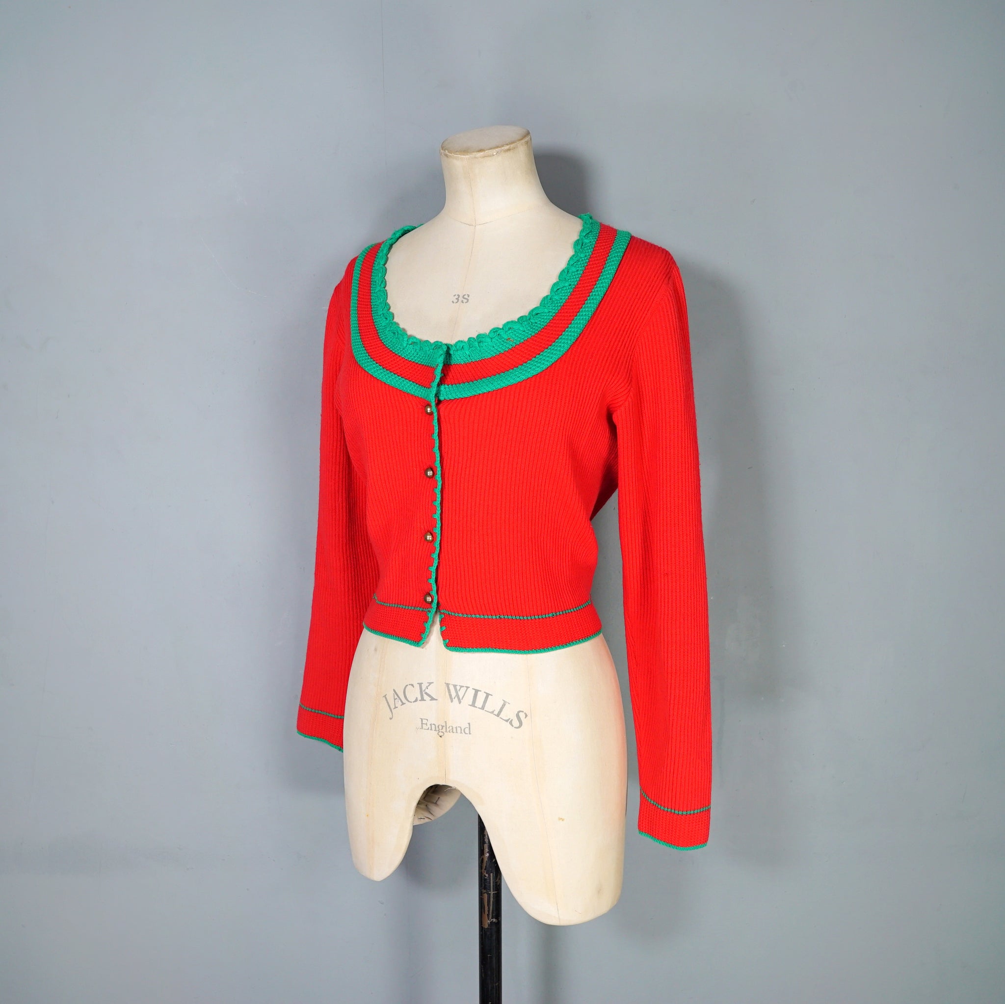 Sweet Austrian / Tyrolean knit in bold red and green colourblock striping in a soft ribbed dacron acrylic. Stretch rib knit with cropped waist length and front fastened with small bronze shank buttons. Deep rounded neck with small scalloped looped trim. Long sleeve. Very soft.