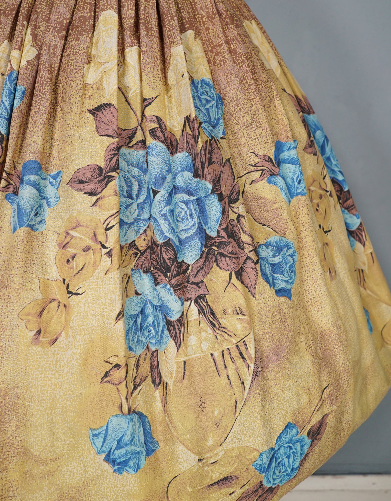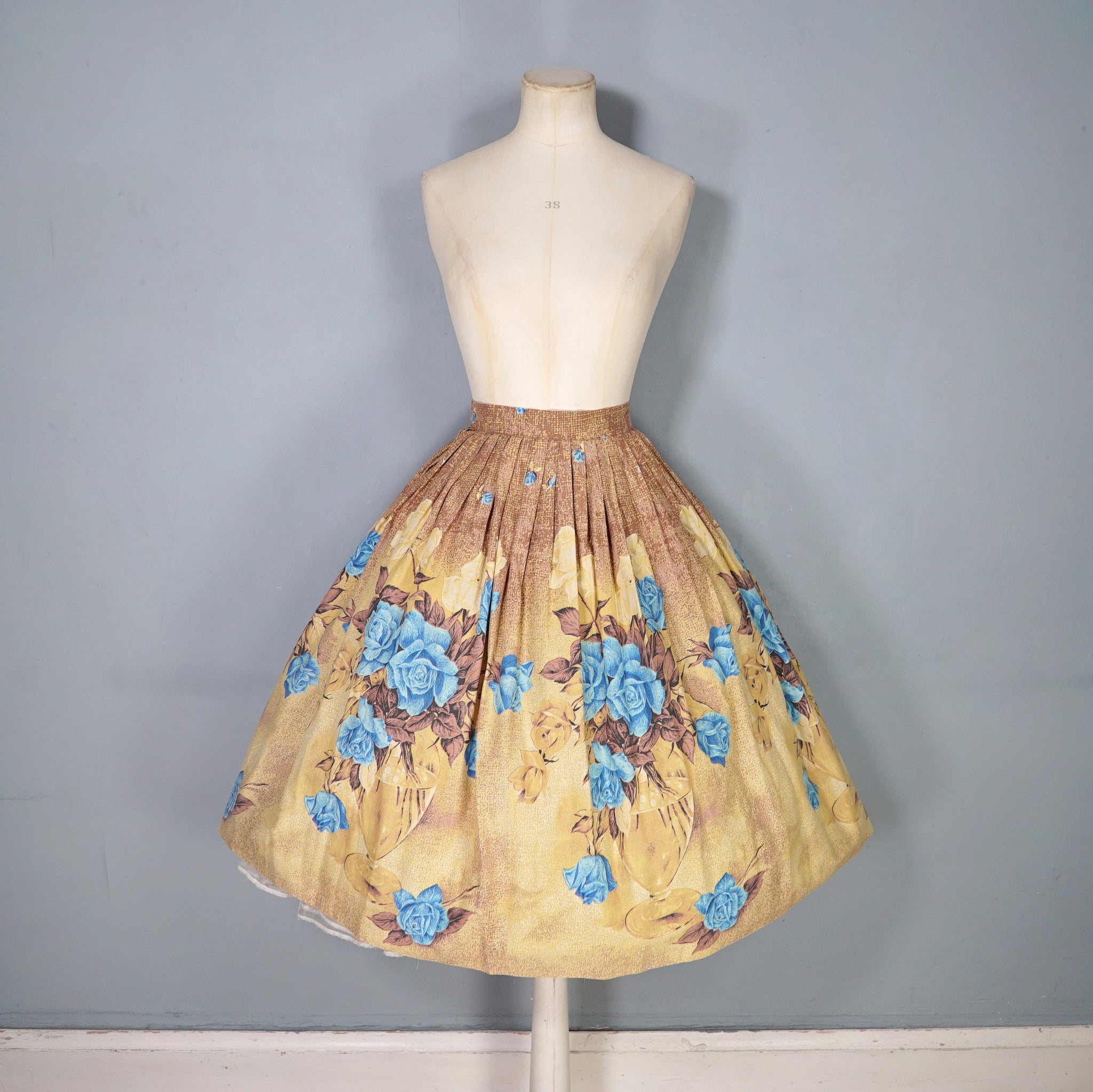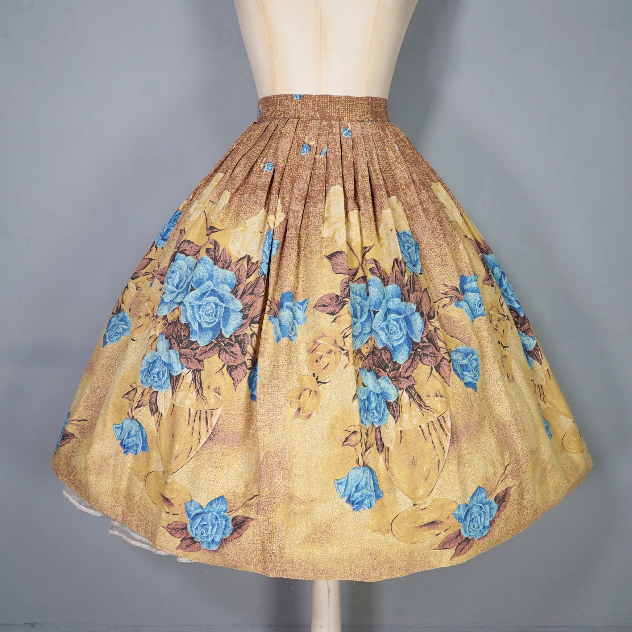 Such a fun border floral with a twist. 50s cotton full skirt in a warm earthy yellow and brown with a large glass vase and blue rose border print. No makers labels but the selvage on the hem has the name printed - La vie en rose by Millworth. Fitted waistband with two small buttons and a full fit sewn in very neat pleat. Small open seam to by the buttoning, which closes with tiny poppers. This is just stunning.
