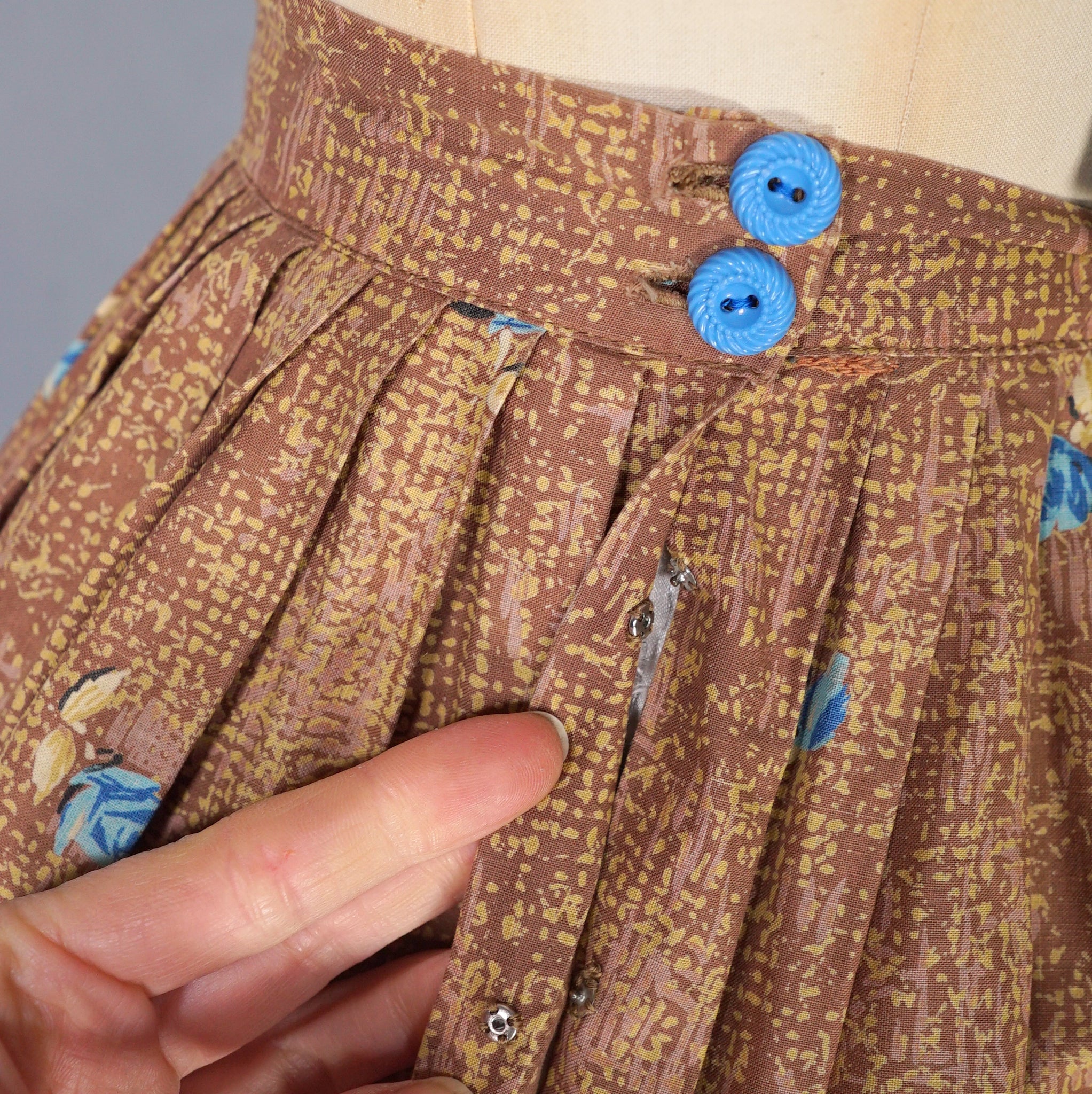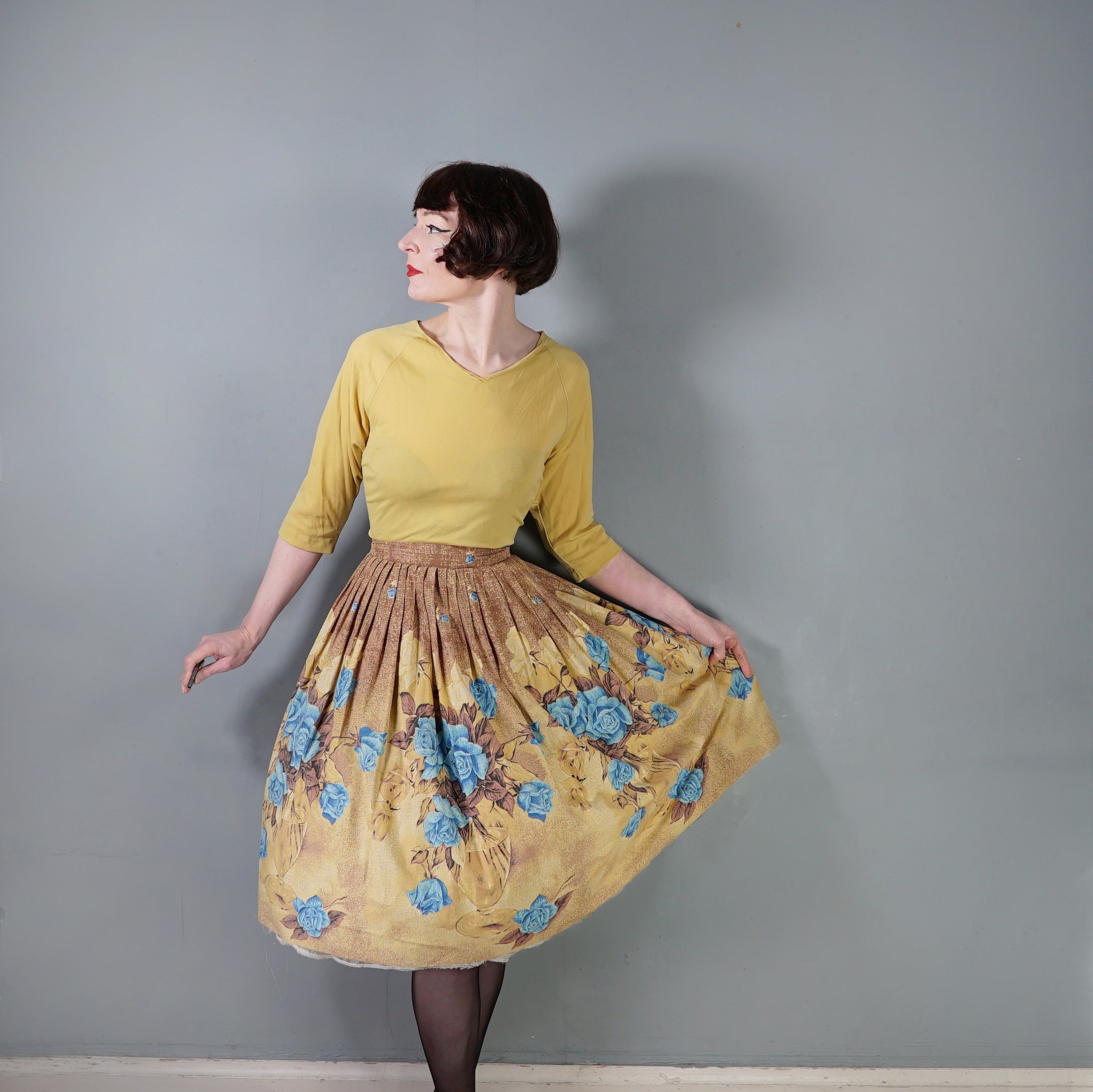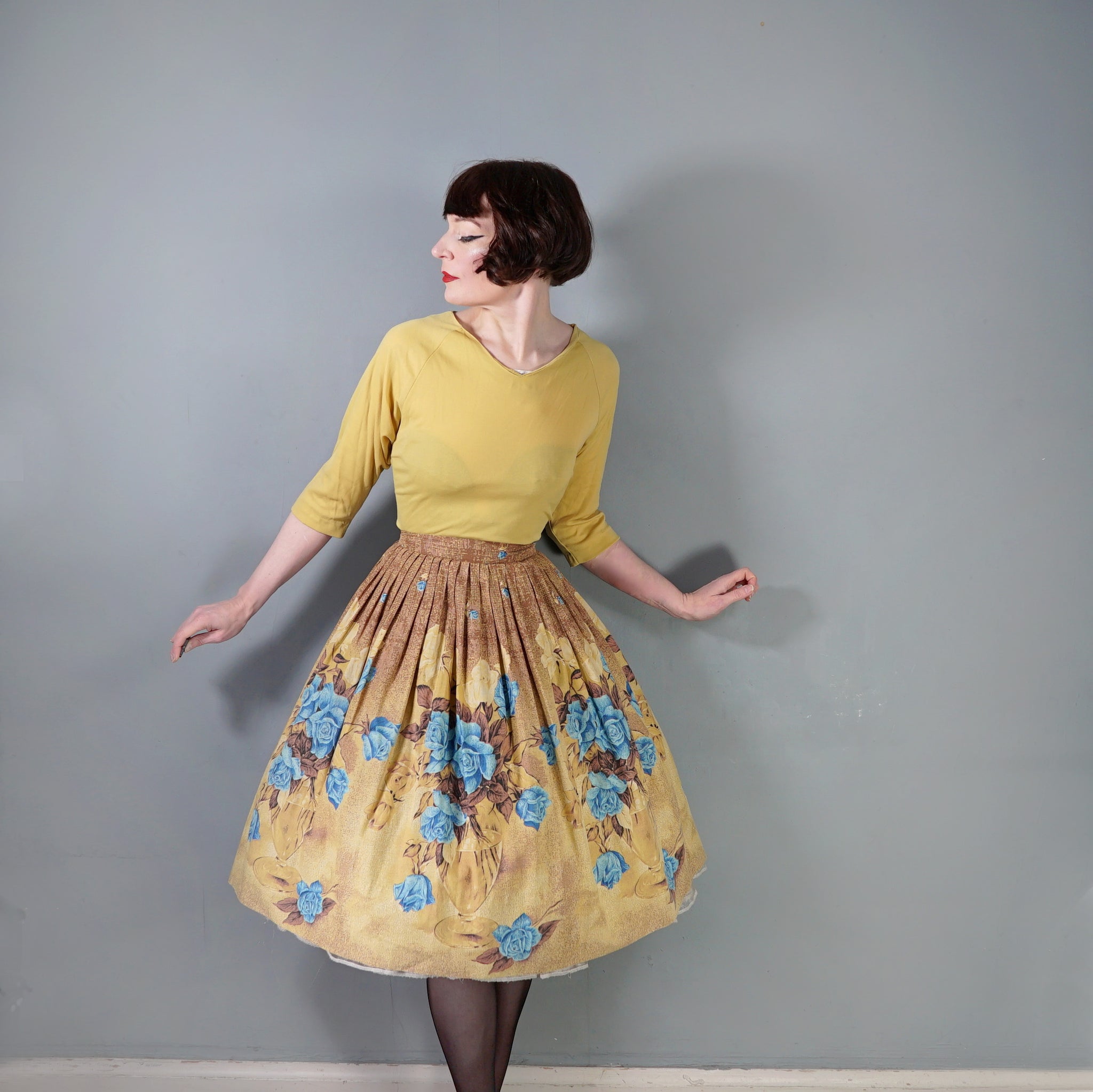 Such a fun border floral with a twist. 50s cotton full skirt in a warm earthy yellow and brown with a large glass vase and blue rose border print. No makers labels but the selvage on the hem has the name printed - La vie en rose by Millworth. Fitted waistband with two small buttons and a full fit sewn in very neat pleat. Small open seam to by the buttoning, which closes with tiny poppers. This is just stunning.