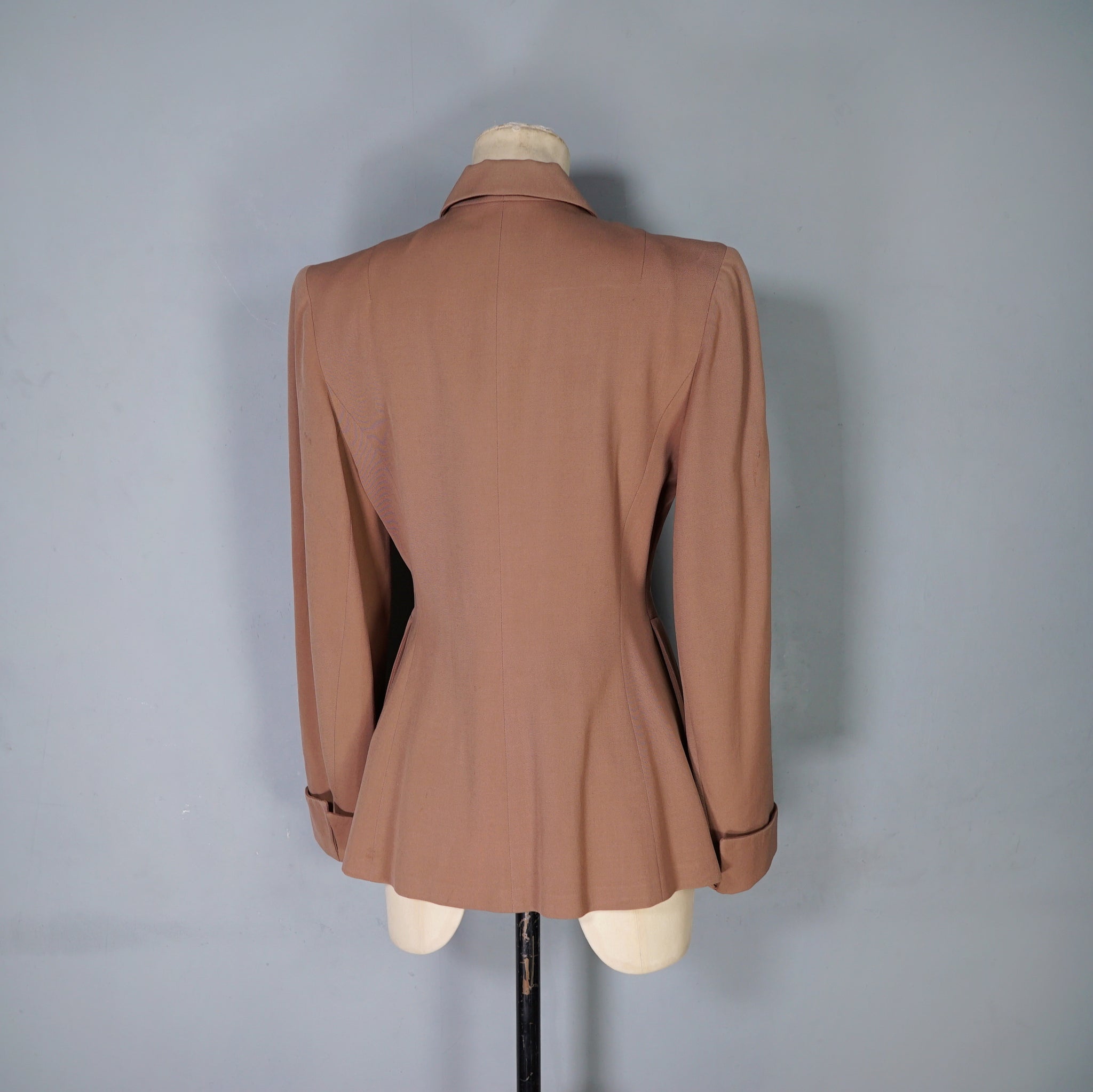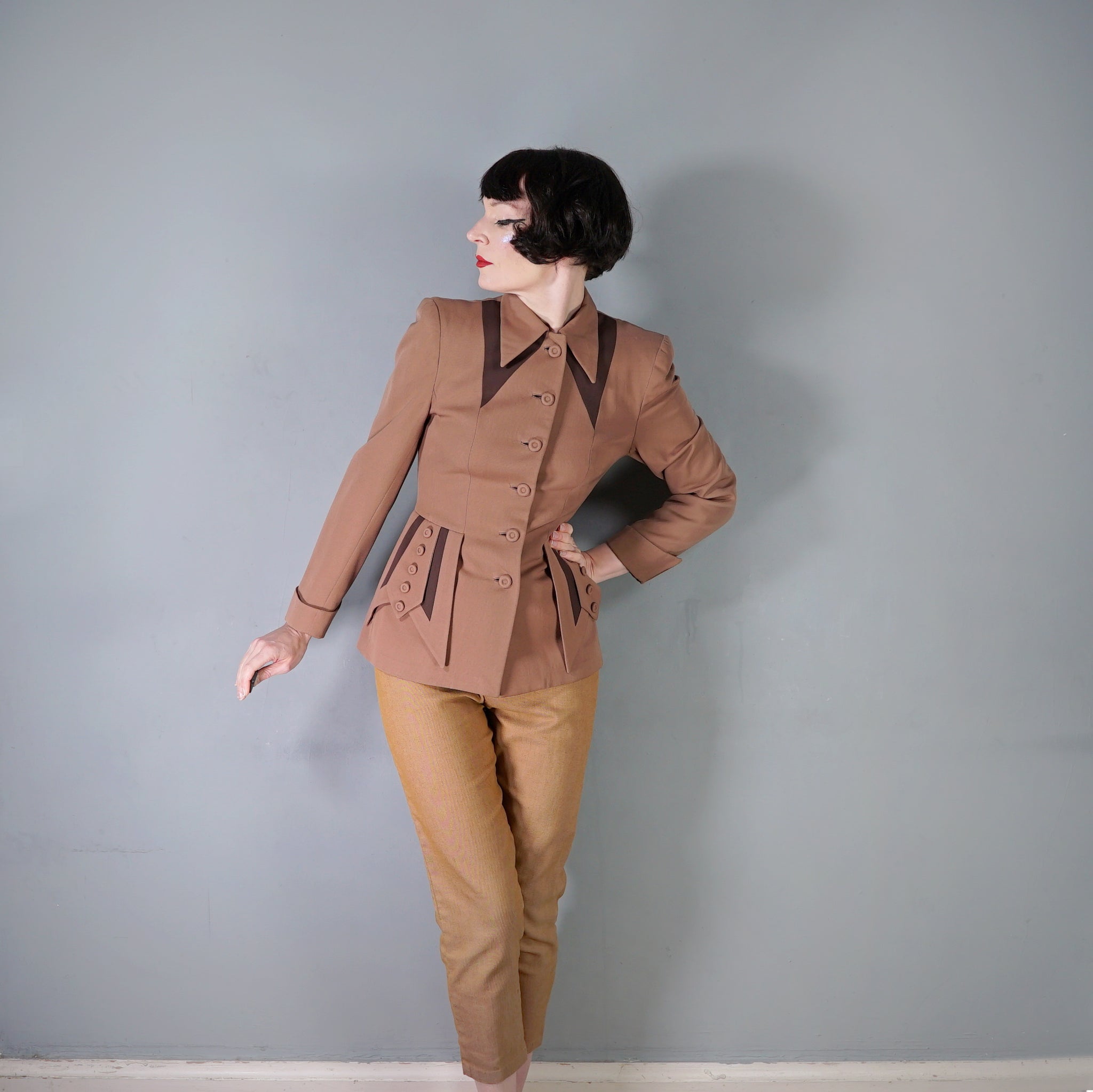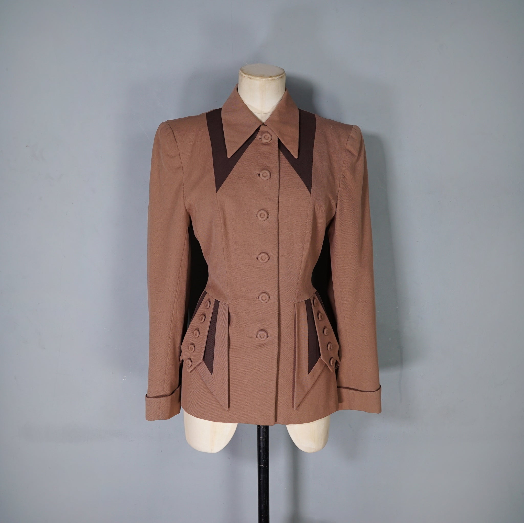 Such an iconic 40s design. Sharp angular features and a great brown twotone colourblock design. Label is Elite, hand tailored garments. Beautifully fitted silhoutte in soft wool gab with strong padded shoulders, fitted waist and a big pointed dagger collar. Long sleeve with turn up cuffs. Very elegant covered buttons to the chest in a single breasted fashion. Very Art Deco pocket flaps (decorative not functional) with pointed tips in two layers and five smaller decorative matching buttons on each. Fully lined in russet brown rayon.