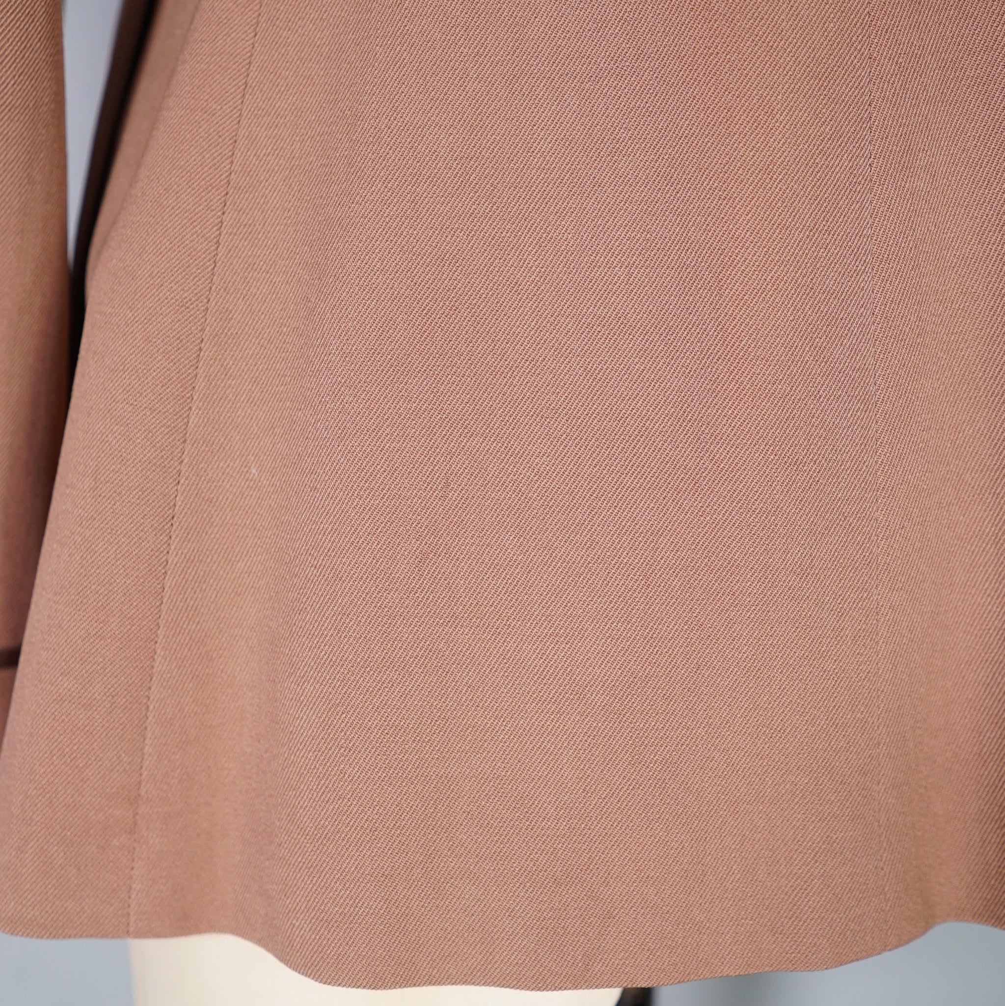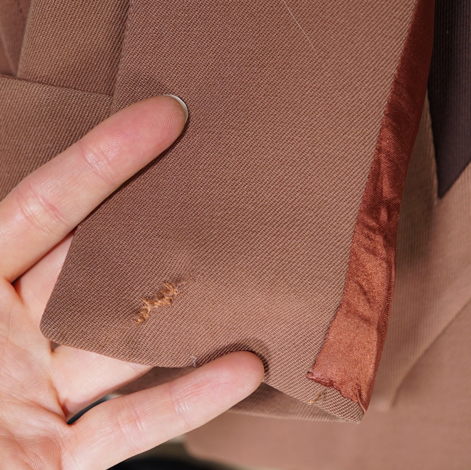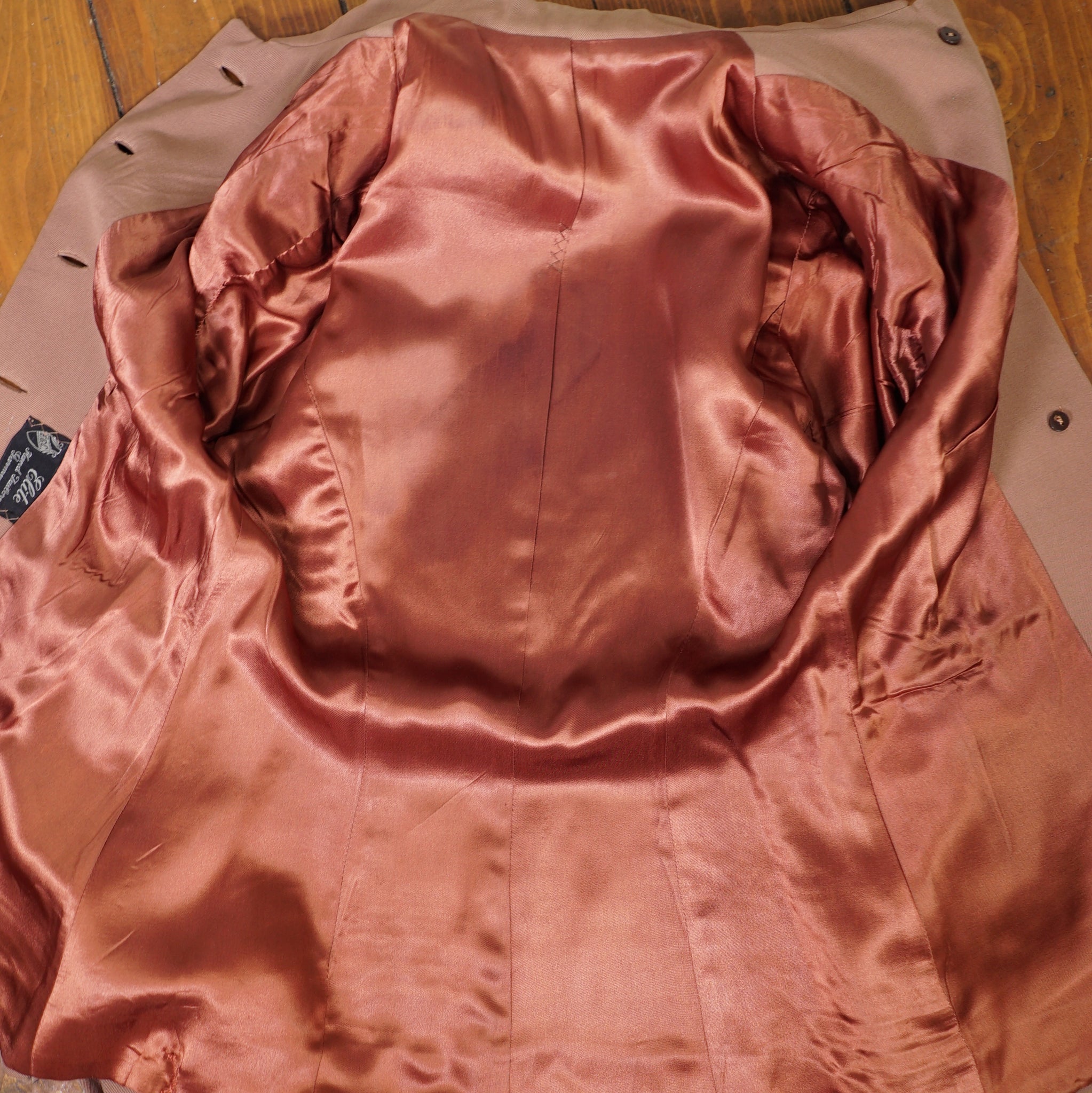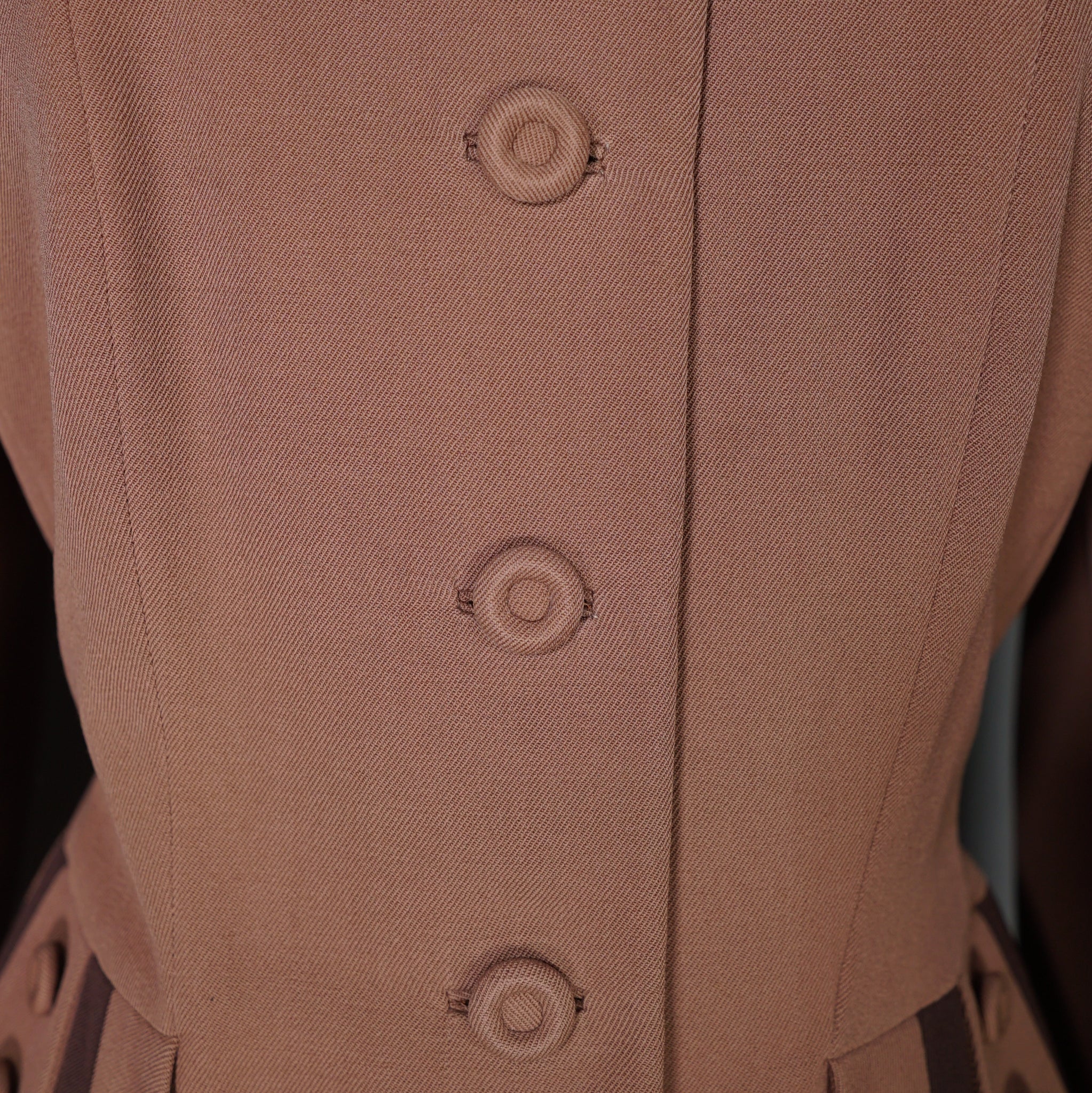 Such an iconic 40s design. Sharp angular features and a great brown twotone colourblock design. Label is Elite, hand tailored garments. Beautifully fitted silhoutte in soft wool gab with strong padded shoulders, fitted waist and a big pointed dagger collar. Long sleeve with turn up cuffs. Very elegant covered buttons to the chest in a single breasted fashion. Very Art Deco pocket flaps (decorative not functional) with pointed tips in two layers and five smaller decorative matching buttons on each. Fully lined in russet brown rayon.