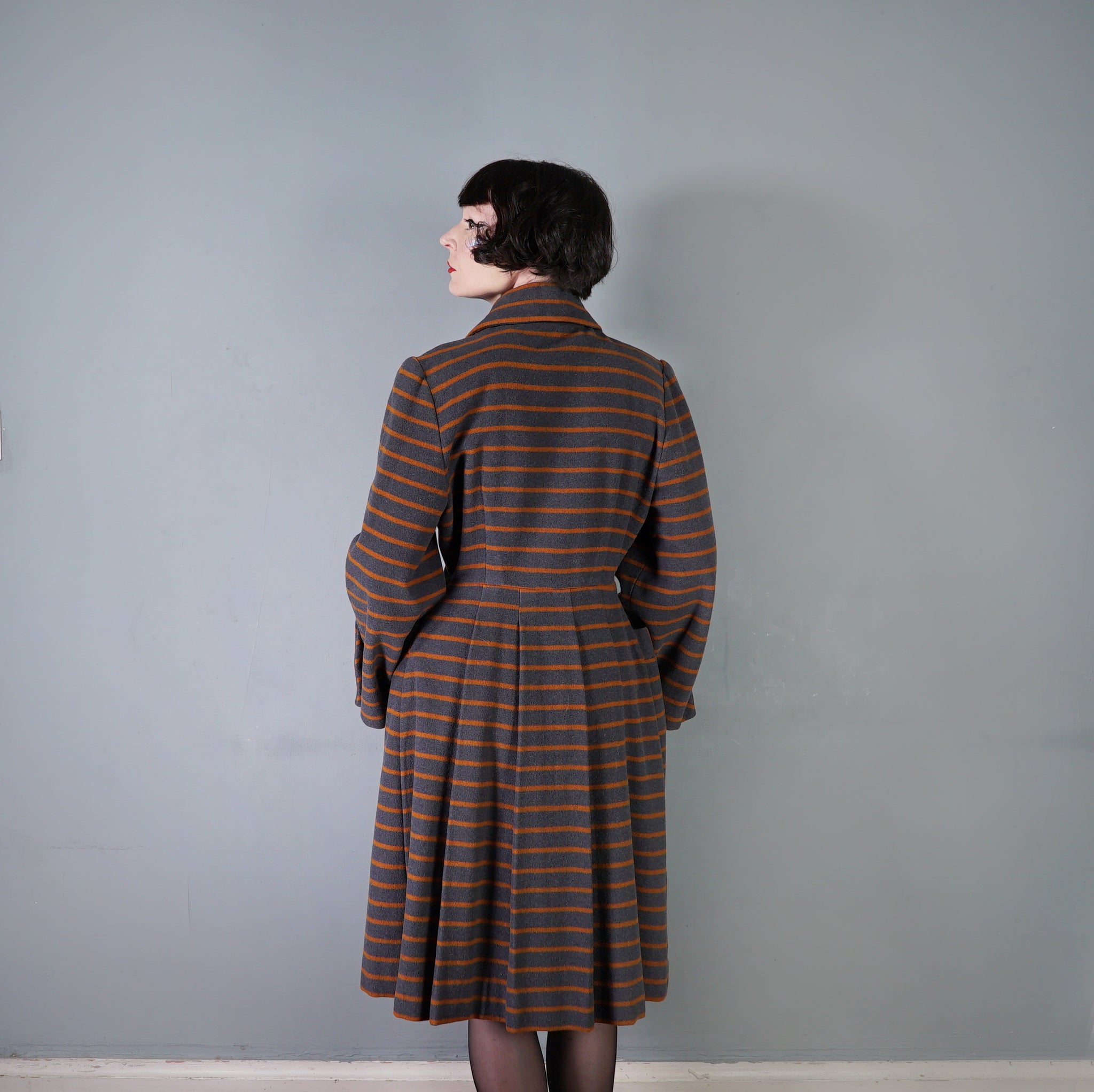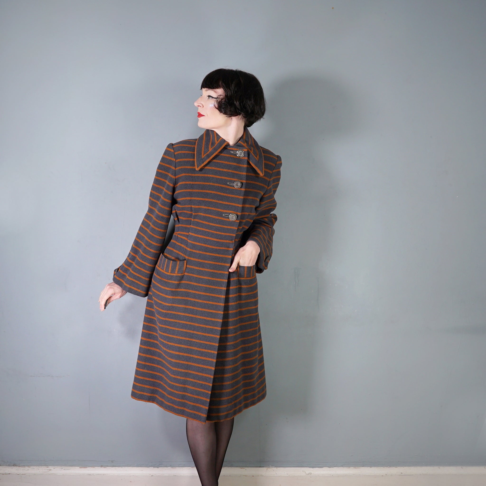 Absolutely showstopping late 40s coat by Trewarne. This is spectacular, beautiful grey and orange striped wool, such a great Art Deco design. Single breasted cut with slightly off centred buttons, three chunky grey shank buttons. Huge pointed collar with the stripe pattern perfectly matched up - I love this attention to detail, it's so neat! Loose fitted sleeve with wide cuff featuring a angular fold over with a button. Fitted waist, probably originally came with a belt, but this is missing, but I definitely think this would be best worn with a belt as the waist is unbuttoned. Small darts opening under the bust to give silhouette fullness. Softly a-lining skirt with big slot pockets on the hip. Back of skirt is pleated for a lovely fuller style. Lined in brown rayon.