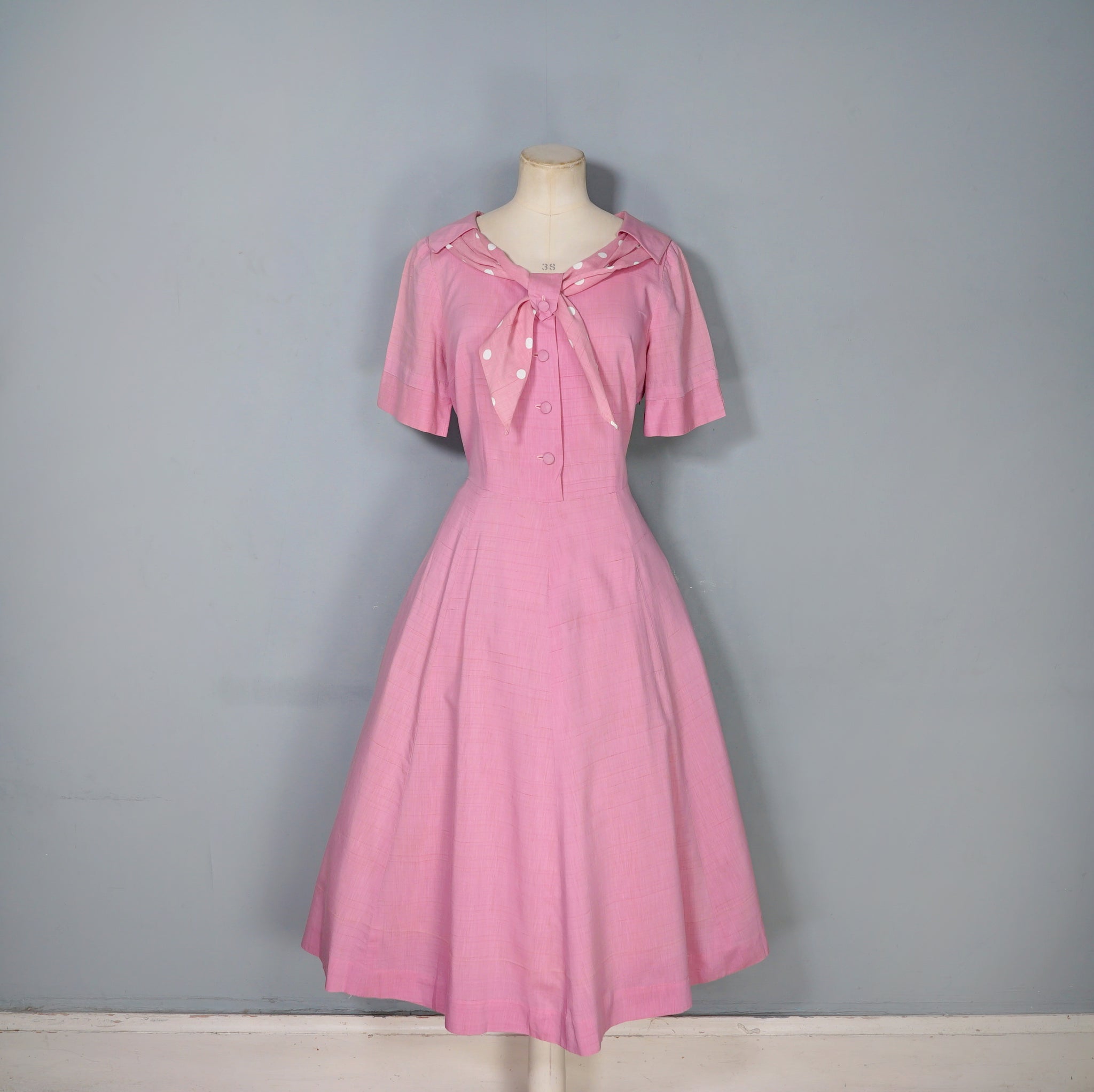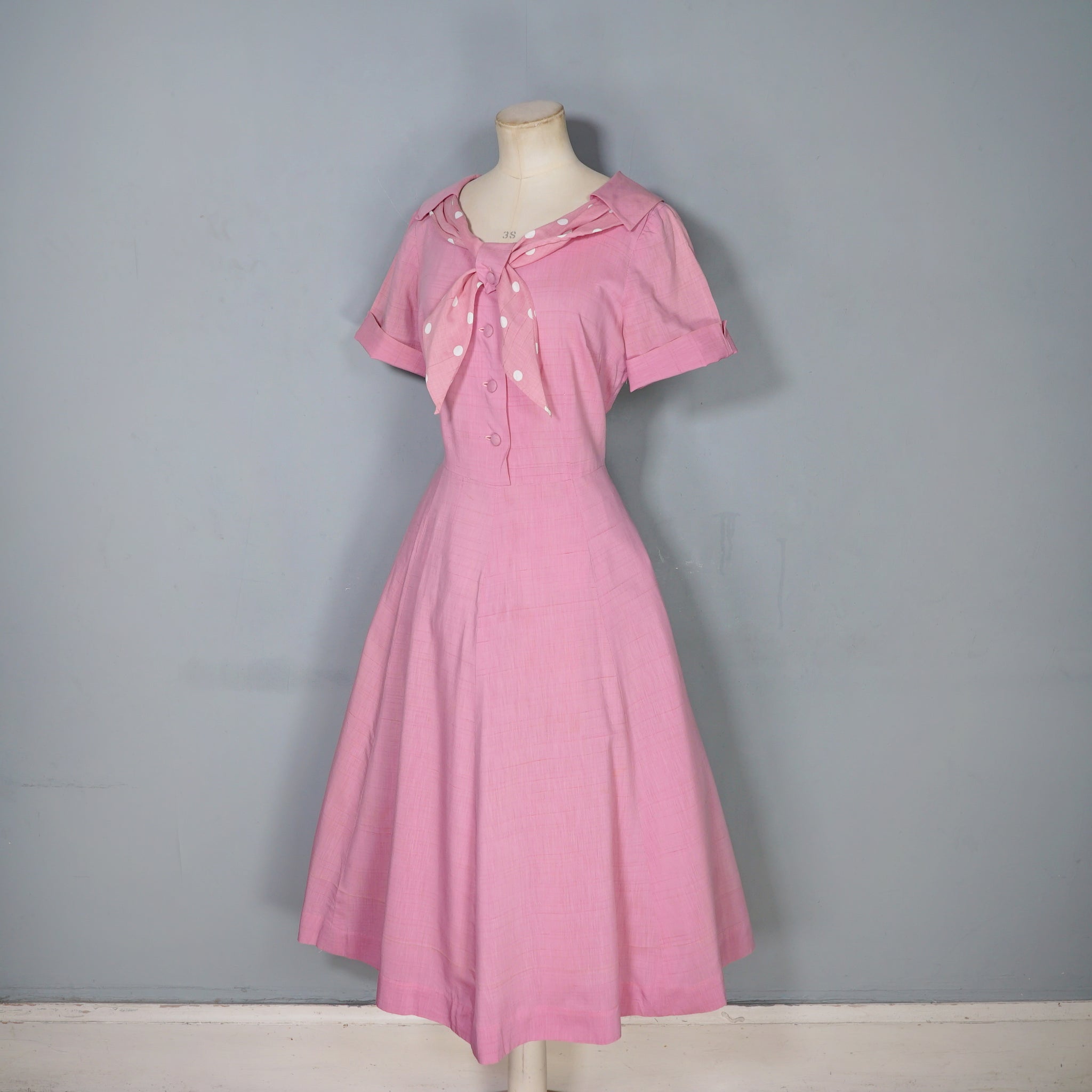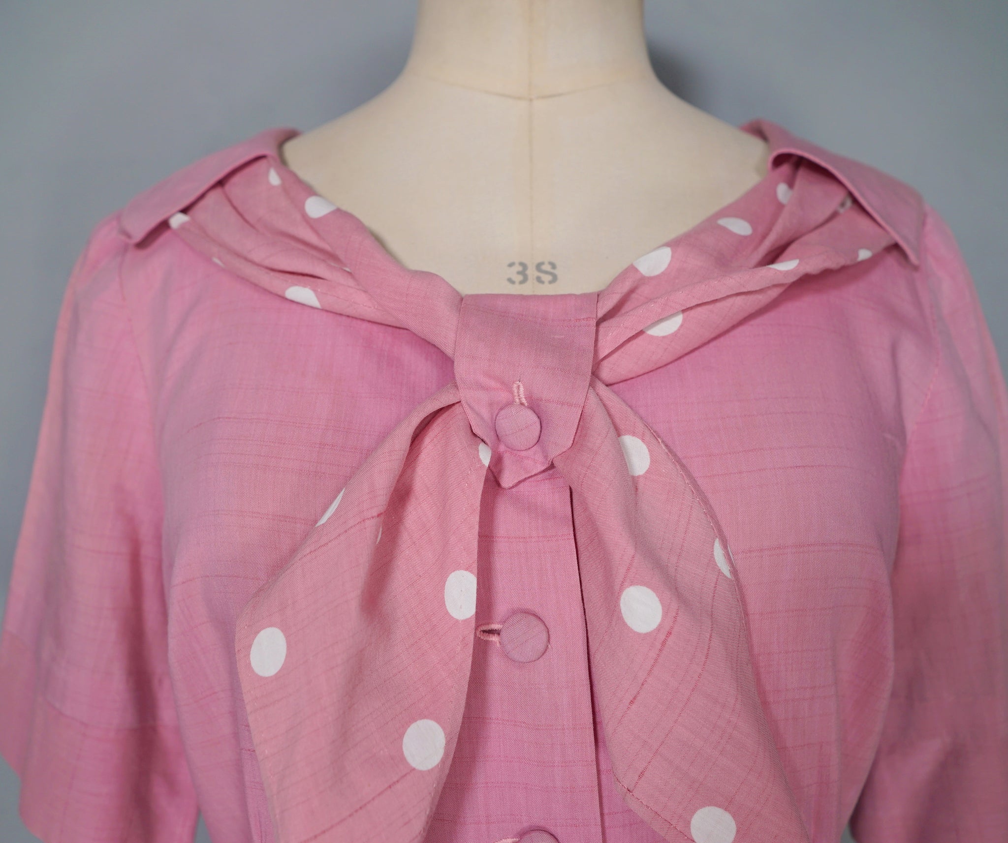 Sweet pink 40s tea dress with a sweet polka dot shawl neckline with a strap and button to hold it in place. Short sleeve with turn up cuffs. Bodice is fastened with four covered shank buttons. Fitted waistband with side metal zipper. Generous gored a-line skirt. No labels. Feels like a soft rayon, similar in weight and texture to dress-weight cotton.