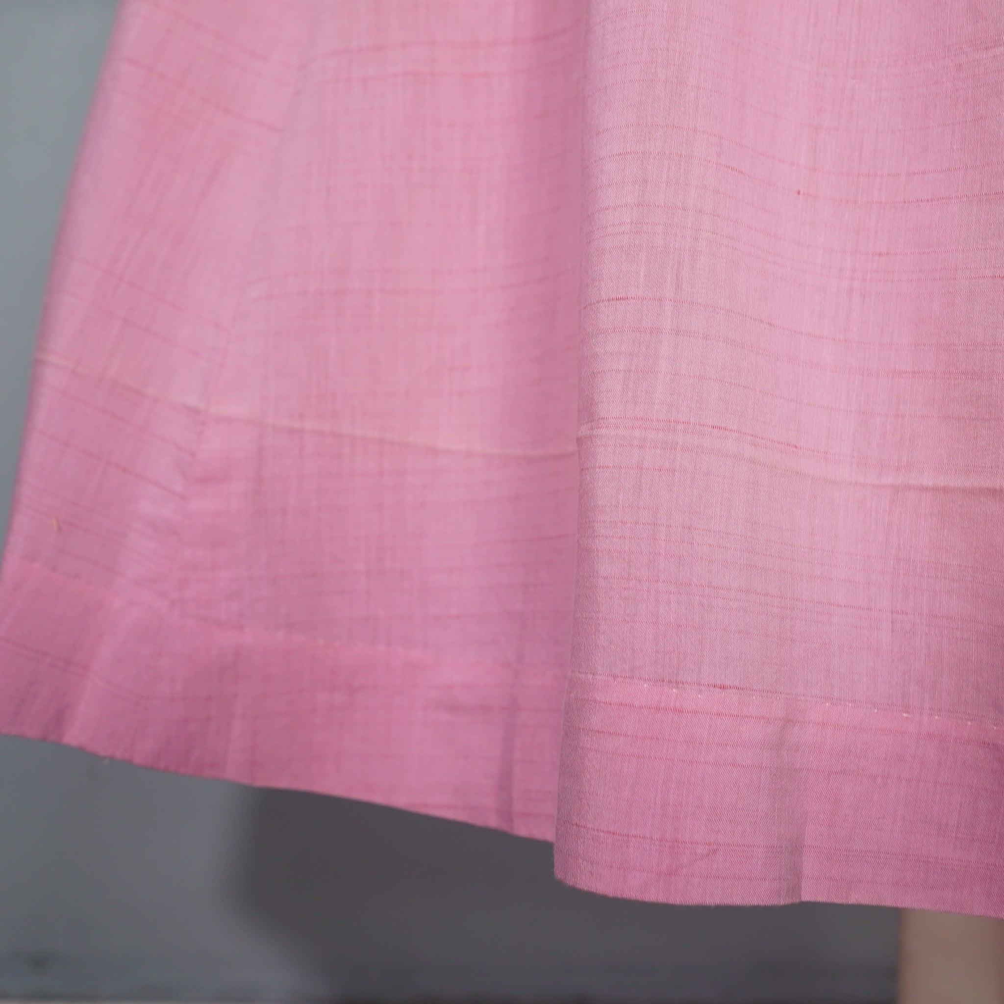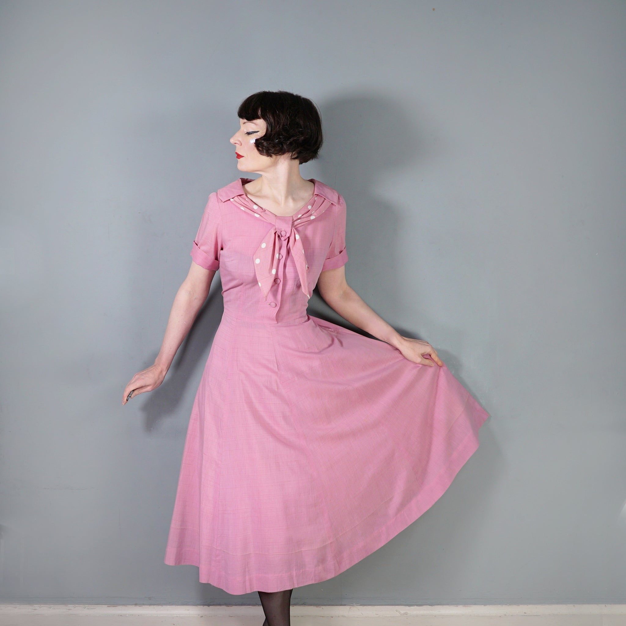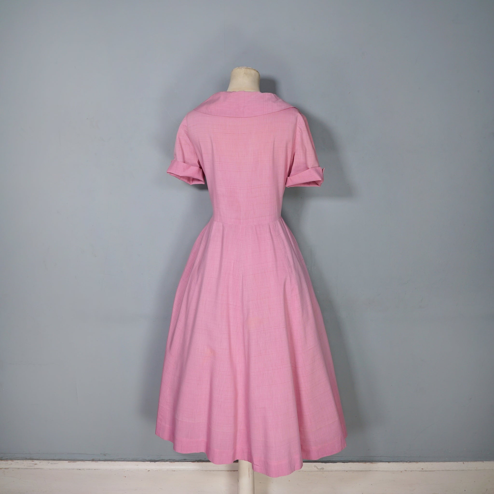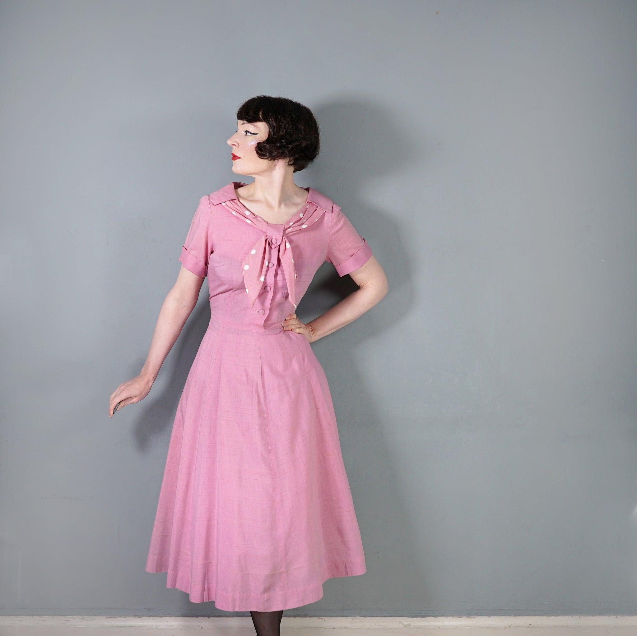 Sweet pink 40s tea dress with a sweet polka dot shawl neckline with a strap and button to hold it in place. Short sleeve with turn up cuffs. Bodice is fastened with four covered shank buttons. Fitted waistband with side metal zipper. Generous gored a-line skirt. No labels. Feels like a soft rayon, similar in weight and texture to dress-weight cotton.