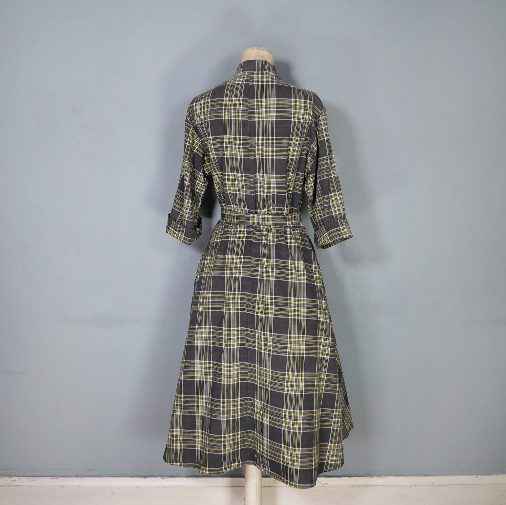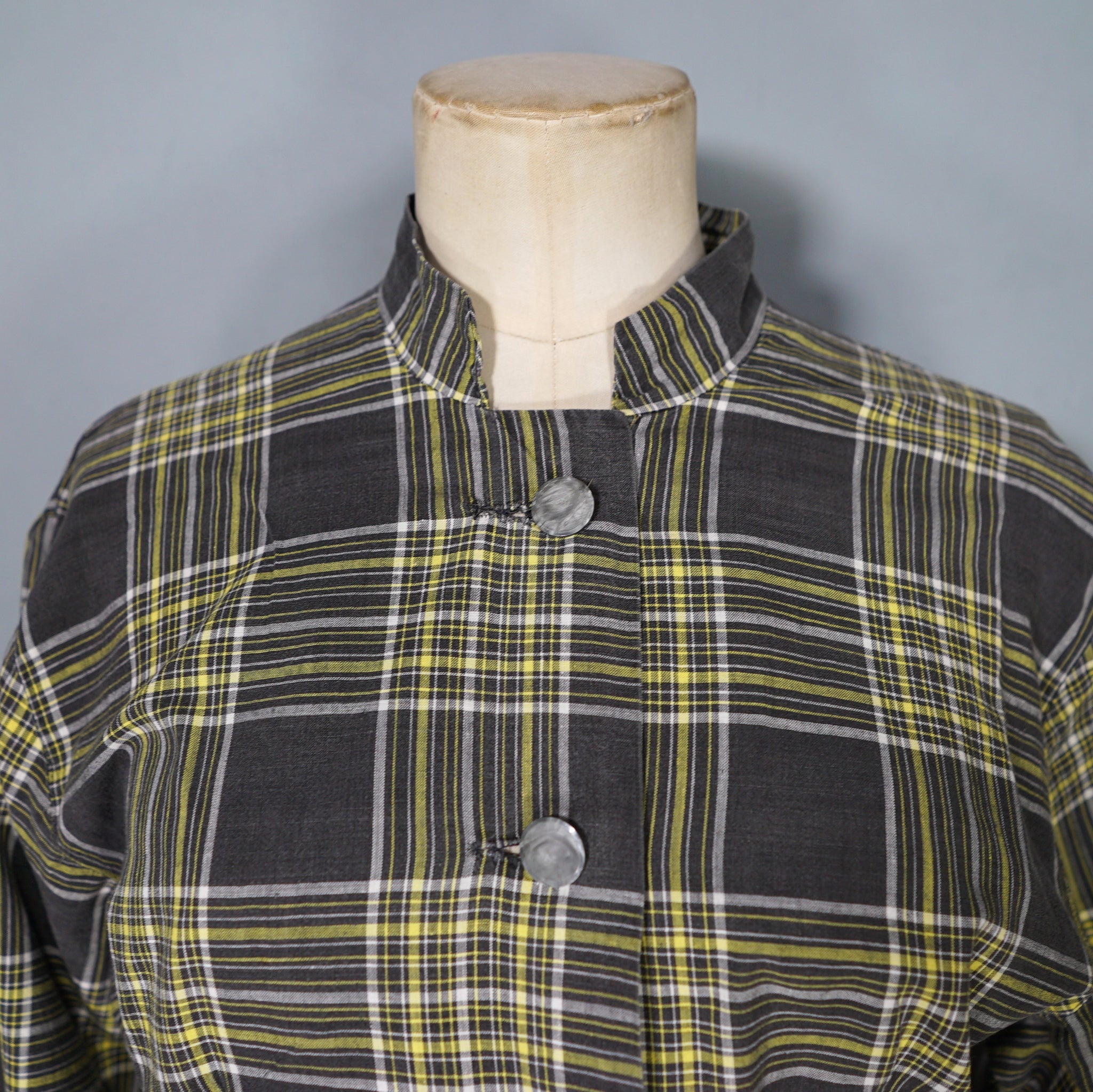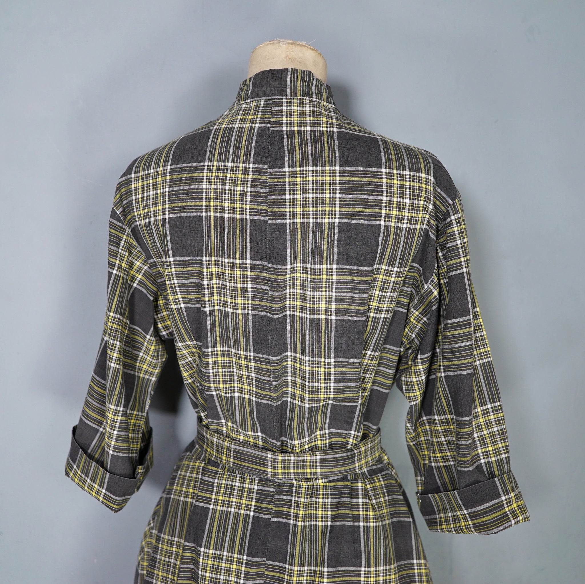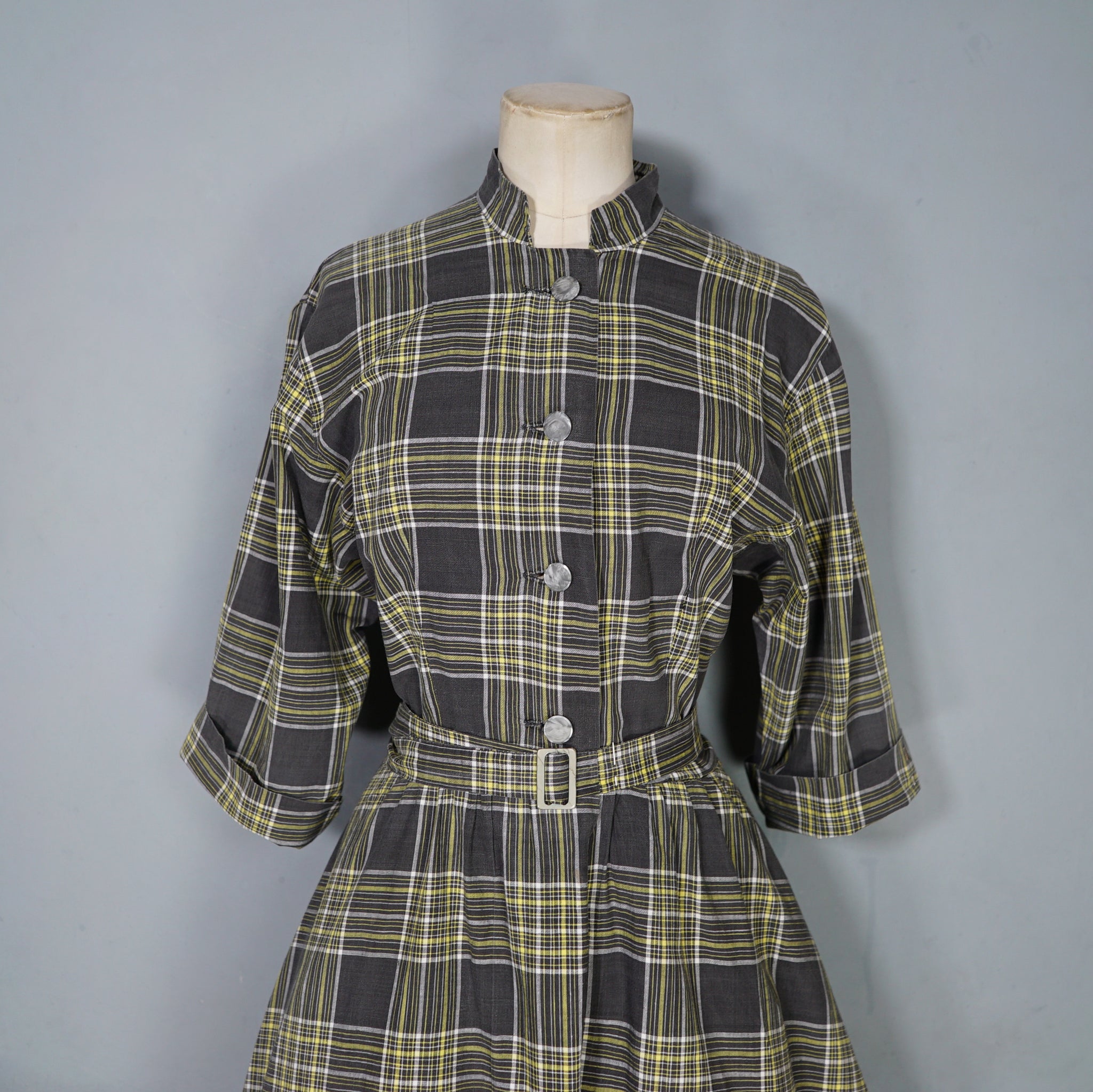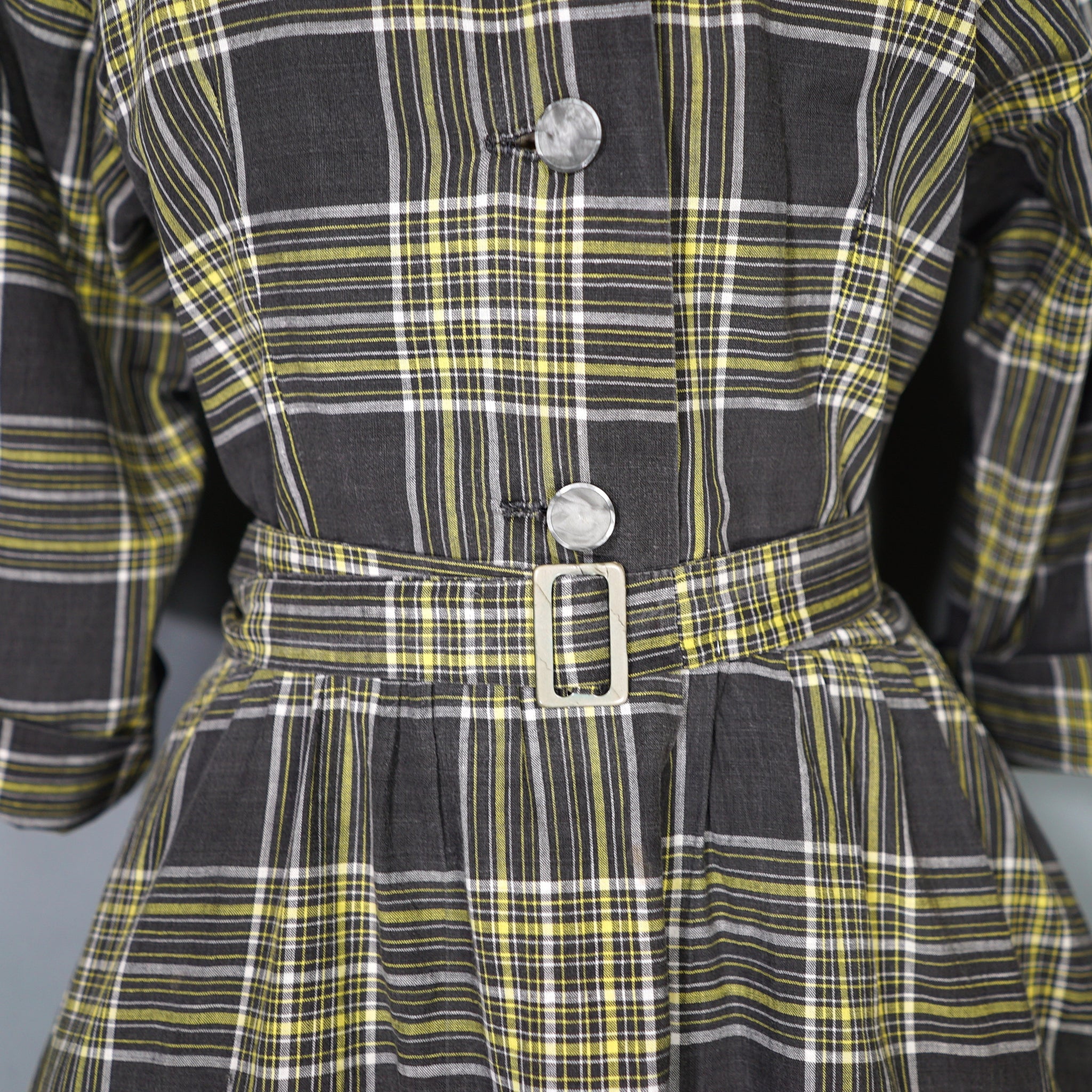 Handmade grey, yellow and white plaid cotton dress with a shirt style bodice with high standing necklien and loose fitting 3/4 sleeve. Small grey shank buttons to fasten the front. Fitted waist with a matching buckled belt. Gently flared a-line skirt with generous midi length. Perfect day wear dress for autumn. No labels, handmade. I think this is 40s era, bit may also be slightly later and made in a 40s style, always hard to say exactly with a handmade piece, specially when vintage materials have been used.