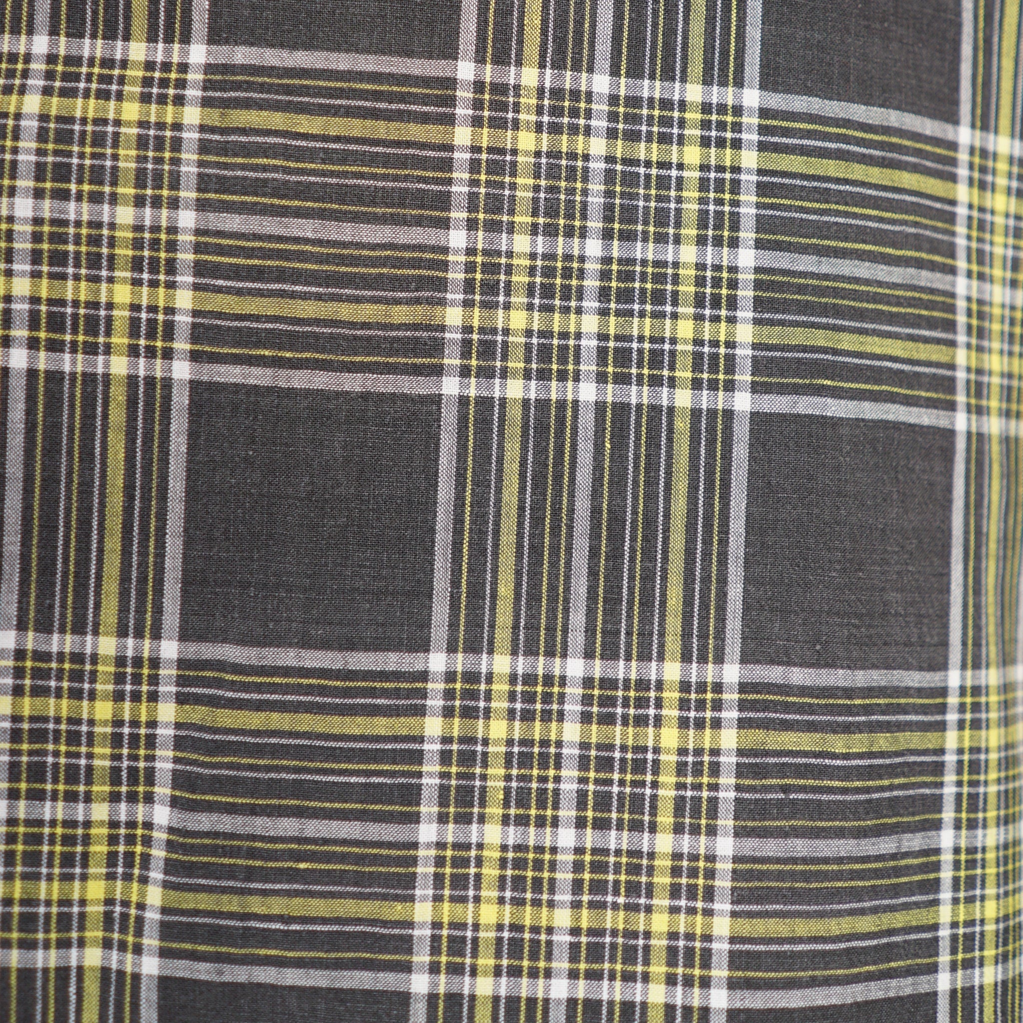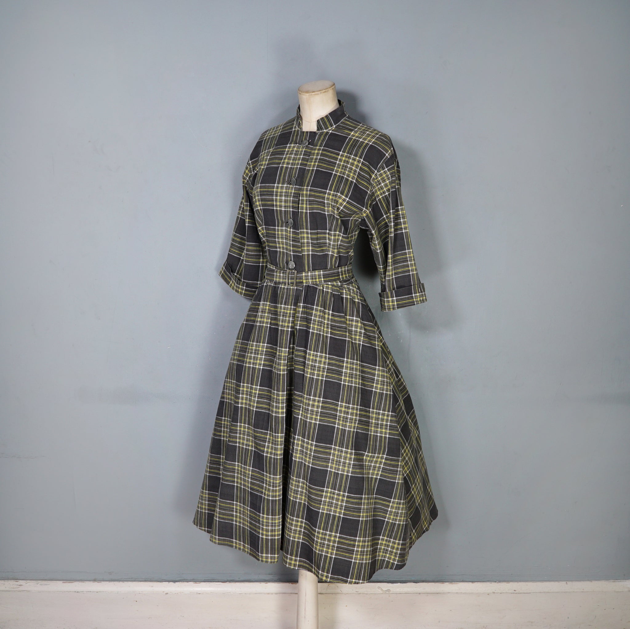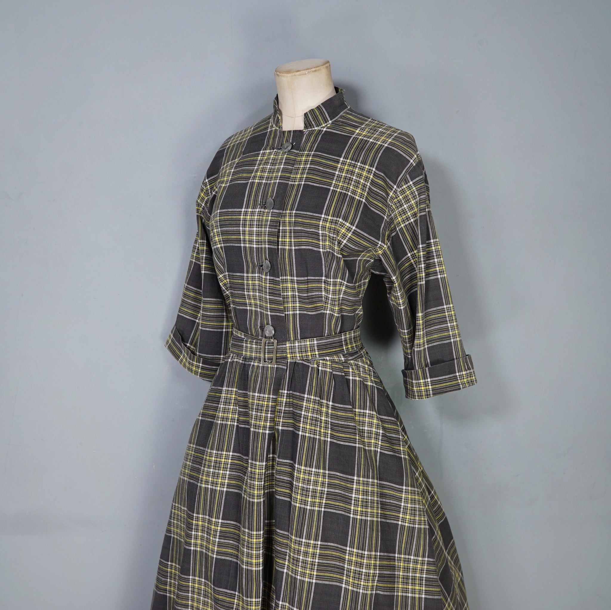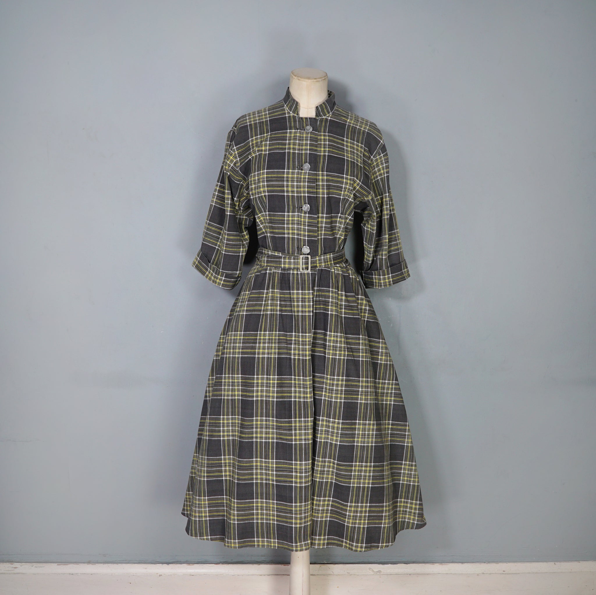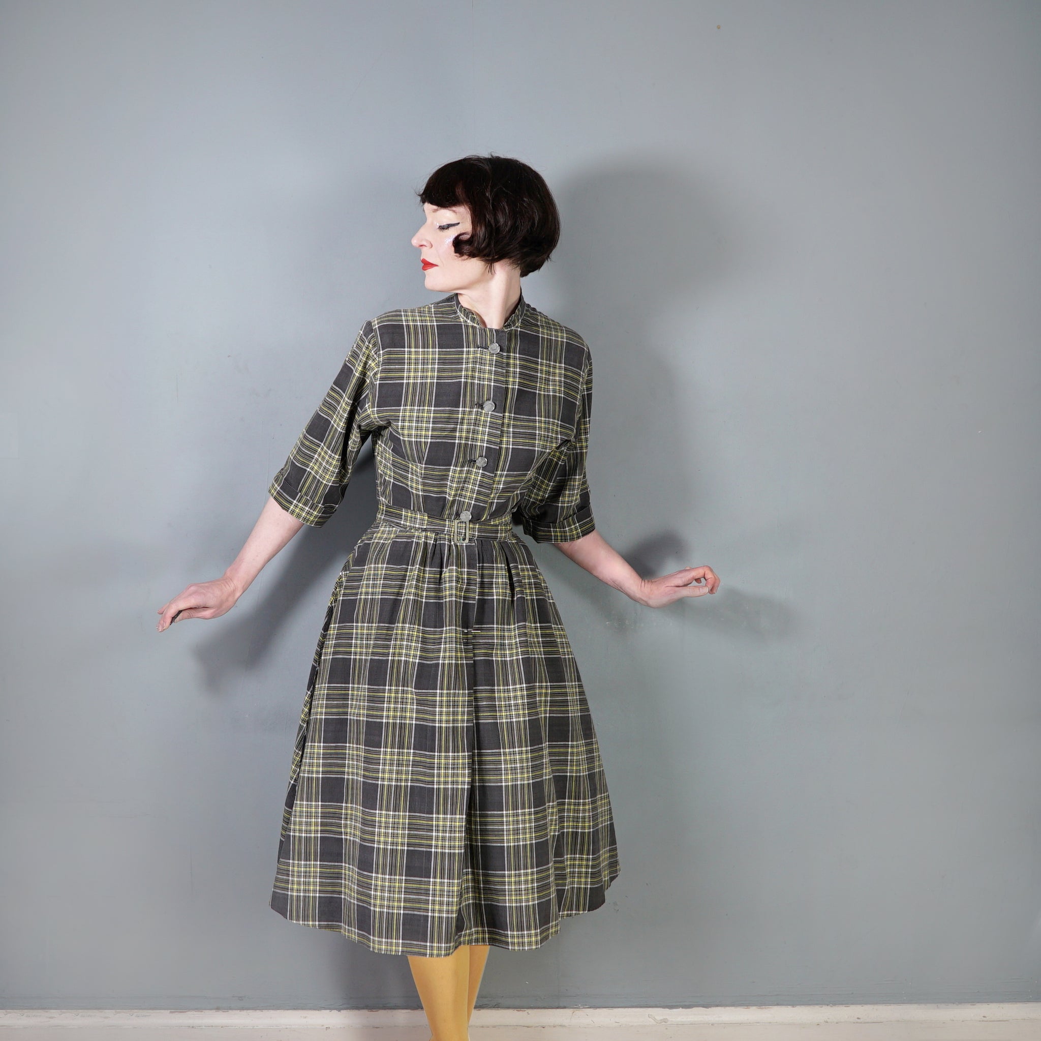 Handmade grey, yellow and white plaid cotton dress with a shirt style bodice with high standing necklien and loose fitting 3/4 sleeve. Small grey shank buttons to fasten the front. Fitted waist with a matching buckled belt. Gently flared a-line skirt with generous midi length. Perfect day wear dress for autumn. No labels, handmade. I think this is 40s era, bit may also be slightly later and made in a 40s style, always hard to say exactly with a handmade piece, specially when vintage materials have been used.