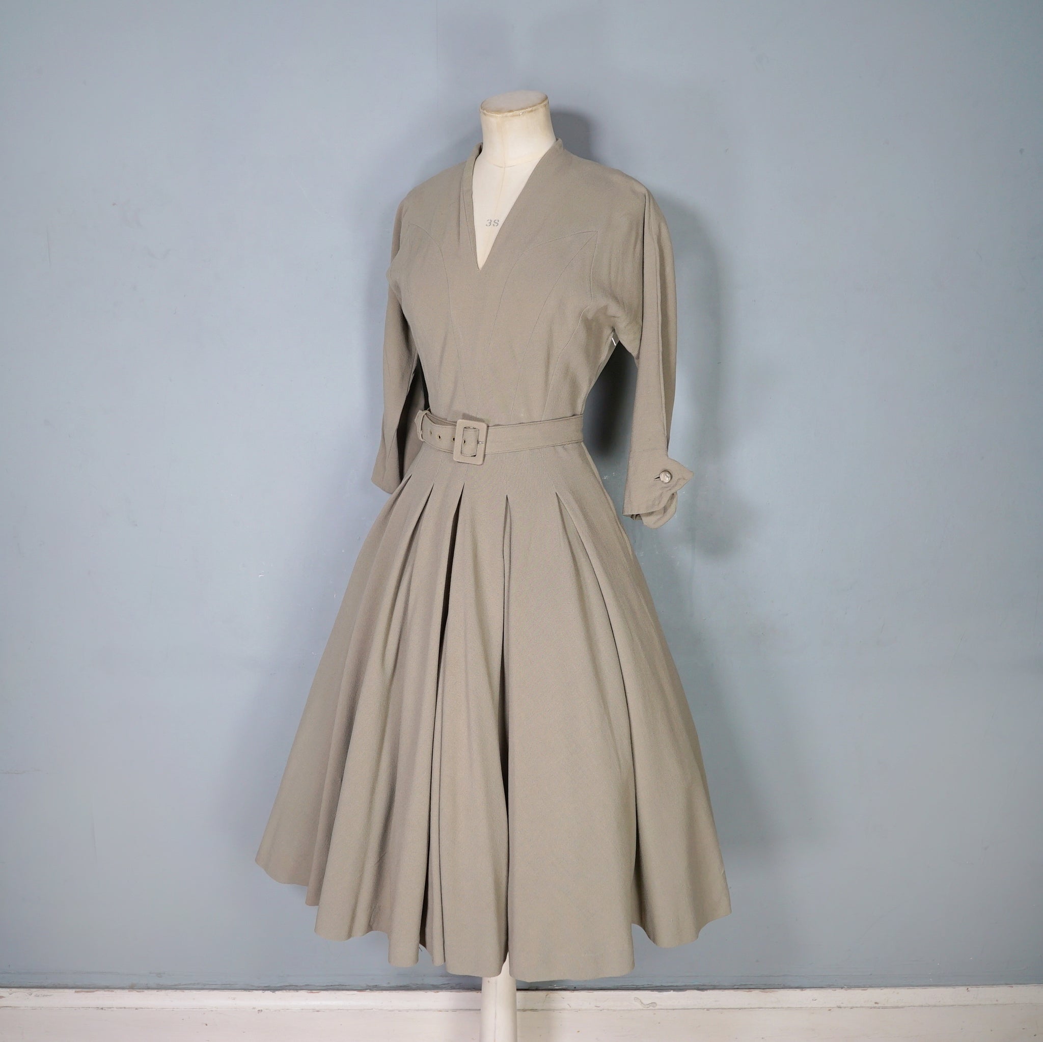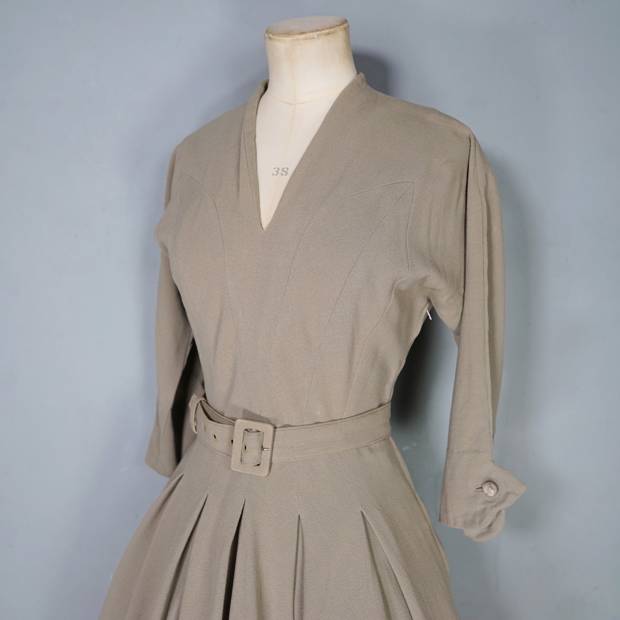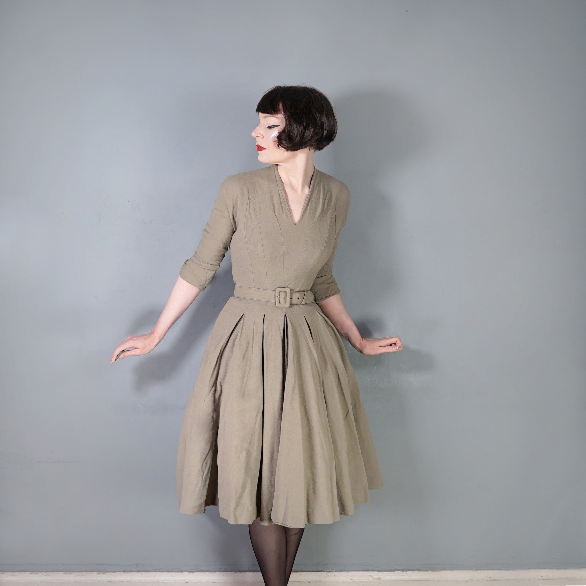 Beautifully weight wool crepe late 40s dress in a olive / greeny-grey shade. Simple and versatile, but really elegantly made with elaborate detailing - the pointed bust seams and waist darts are such a nice unusual pattern design. Collarless v-neck. Long dolman sleeve with button detail on the cuff. Fitted waist with matching cinch belt with covered buckle. Full skirt with sewn down box pleats to the upper hip, which open up into a swishy fullness. Side metal zipper to fasten. No labels but I think this was commercially made.