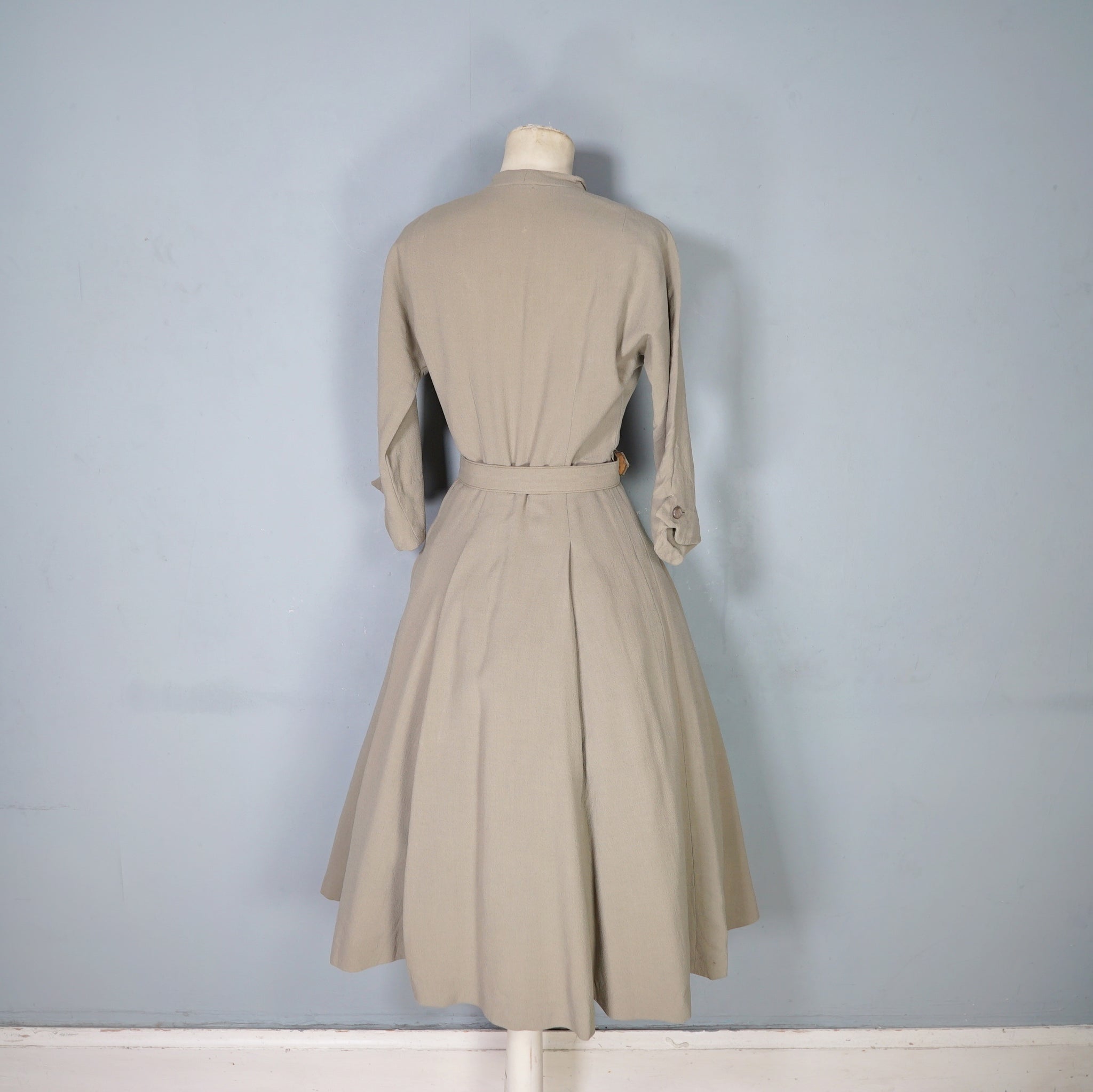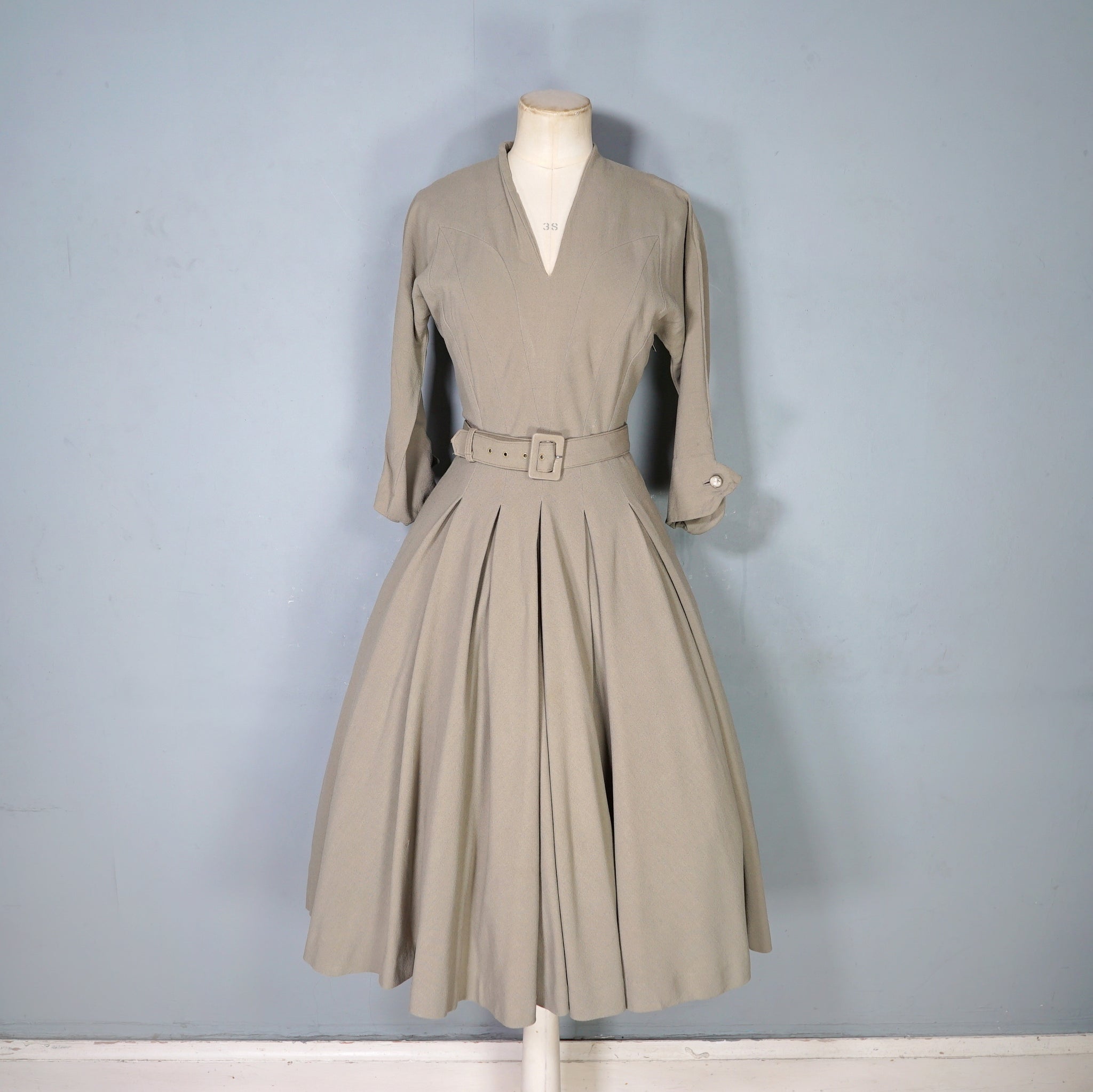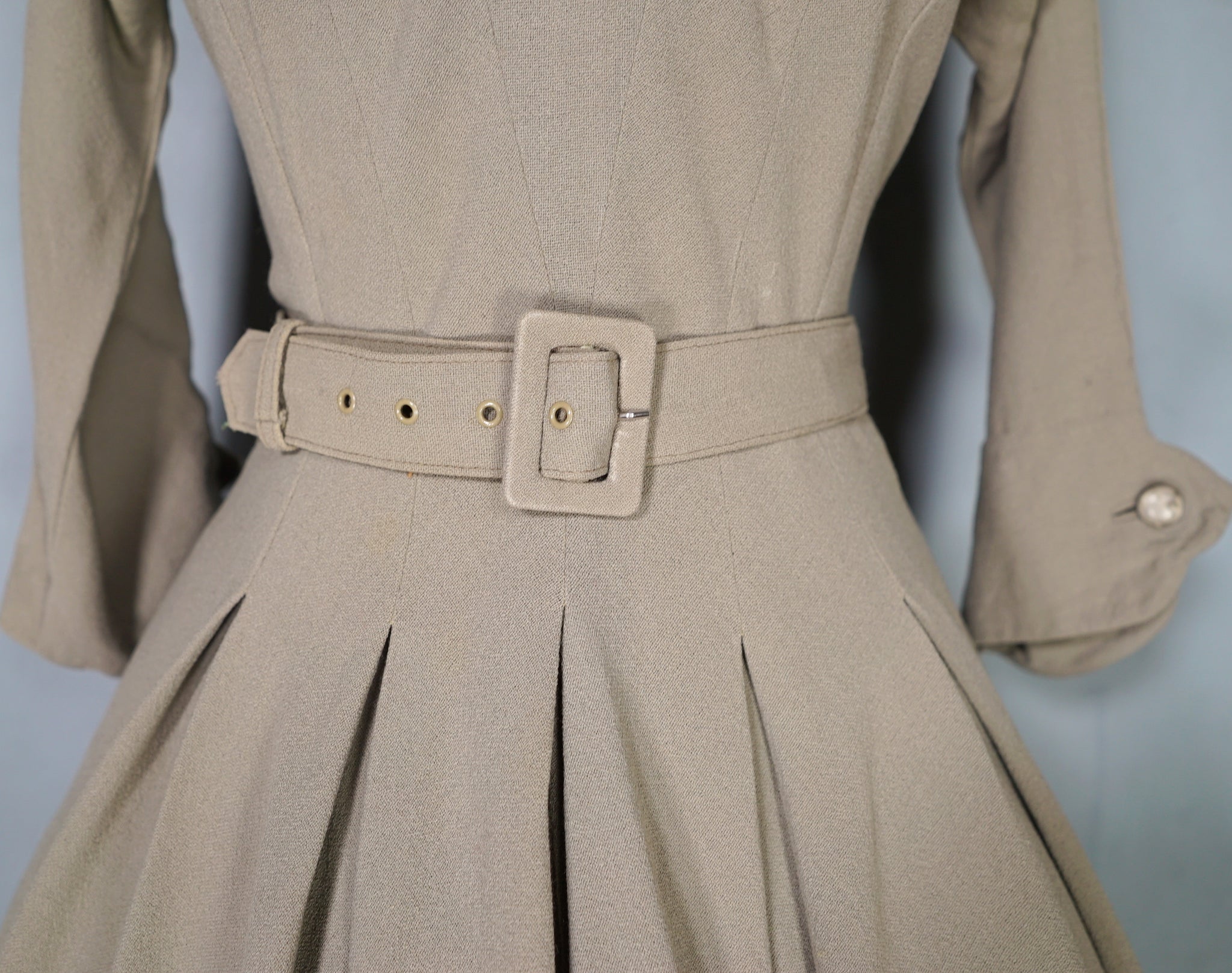 Beautifully weight wool crepe late 40s dress in a olive / greeny-grey shade. Simple and versatile, but really elegantly made with elaborate detailing - the pointed bust seams and waist darts are such a nice unusual pattern design. Collarless v-neck. Long dolman sleeve with button detail on the cuff. Fitted waist with matching cinch belt with covered buckle. Full skirt with sewn down box pleats to the upper hip, which open up into a swishy fullness. Side metal zipper to fasten. No labels but I think this was commercially made.