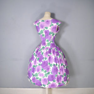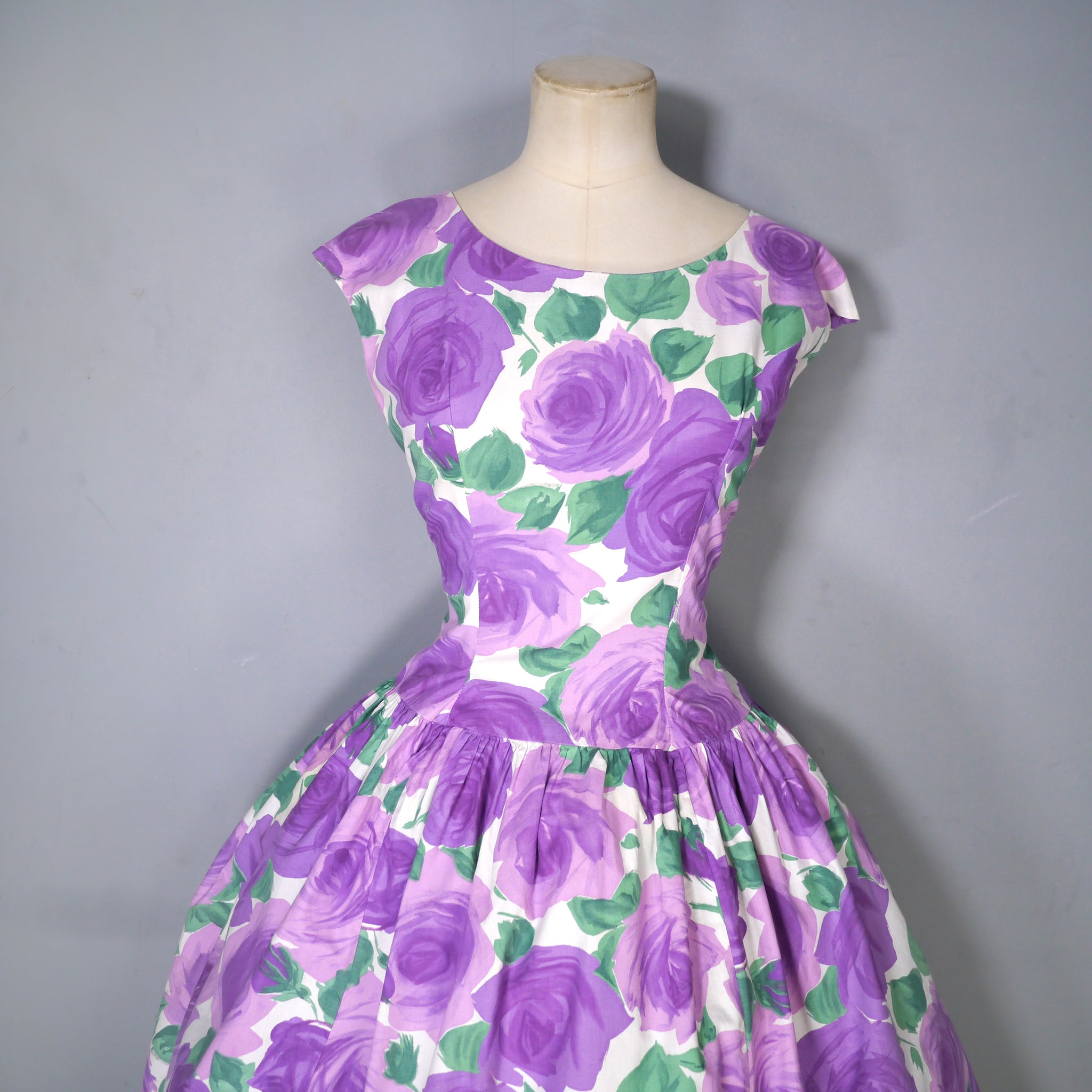 Romantic floral cotton dress by Renval. White cotton with big big purple roses and green leaves. Elegant silhouette with a fit and flare bodice with sleeveless cut and high rounded neck. Shoulder has a very slight cap sleeve effect to it, extending slightly out over the arm. Dropped waistband with a full skirt sewn in narrow pleats for fullness. Original back nylon zip to fasten. Approx early 60s era, but still retains both the print style and silhouette of the 50s.