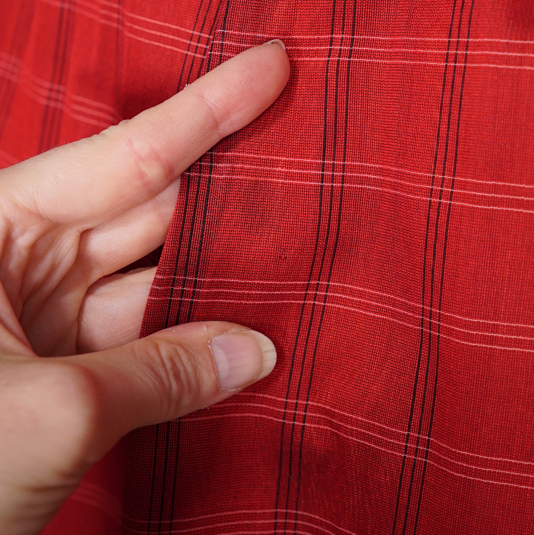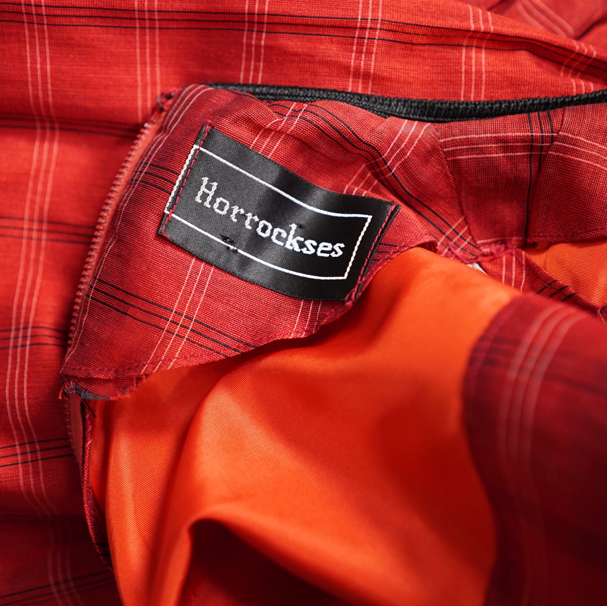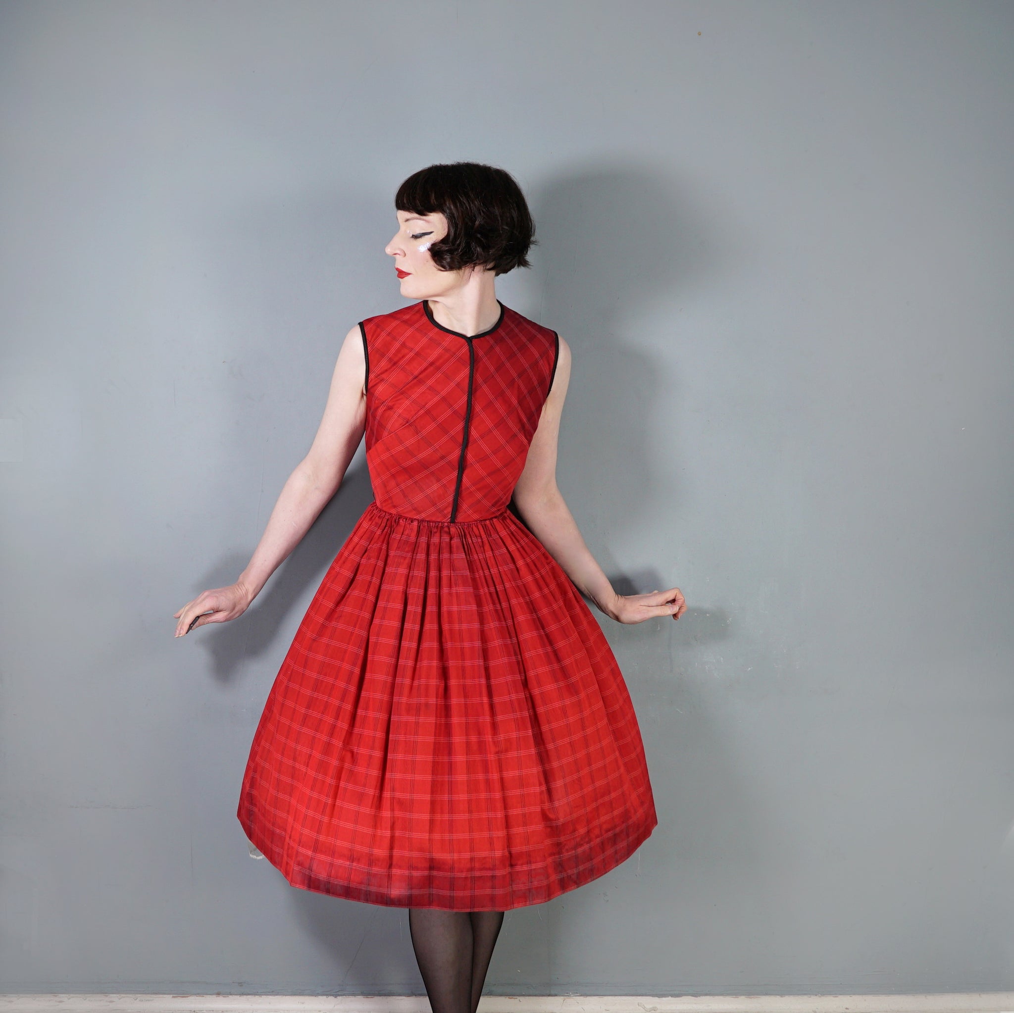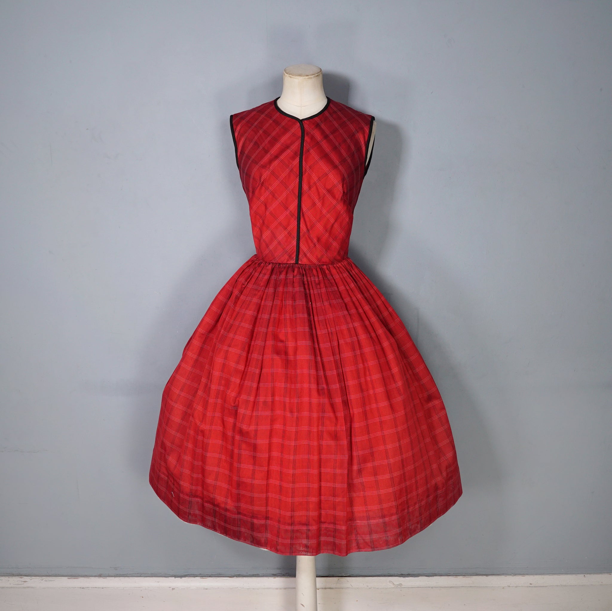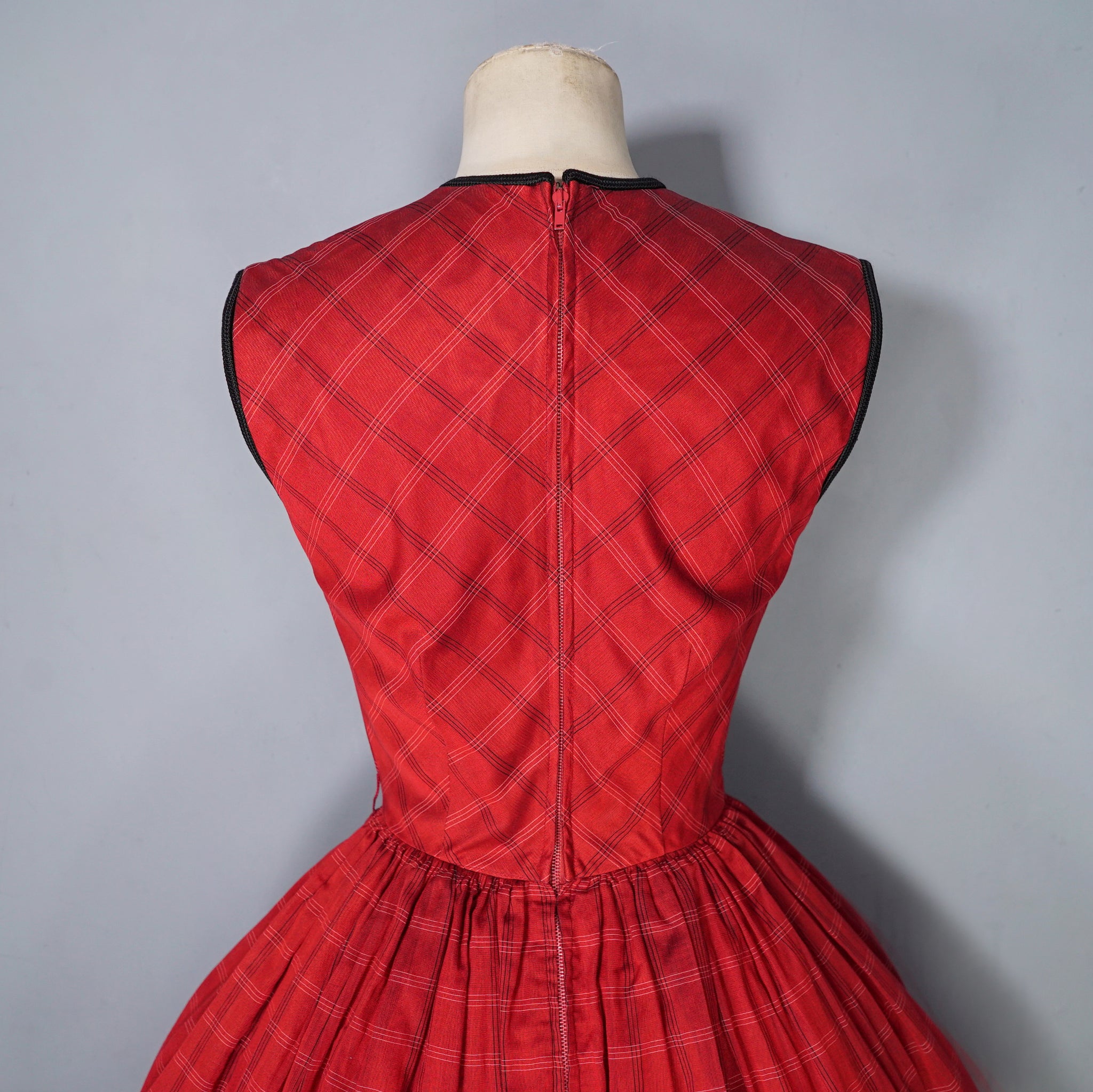 Beautiful dark red, black and white fine check patterned 50s Horrockses dress. Fitted bodice cut on the bias with a high rounded neck and sleeveless arms. Neck, arm holes and front seam is finished with a black piping. Fitted waistband with a full skirt sean in narrow gathers and layered with a red synthtic lining and meshy net petticoat. Back metal zipper to fasten. The outer fabric is a semi sheer woven material, feels like a cotton-synthetic blend, slightly shiney and non-crease texture. This gives the dress a slightly more formal feel, part governess, part winter festiveness.