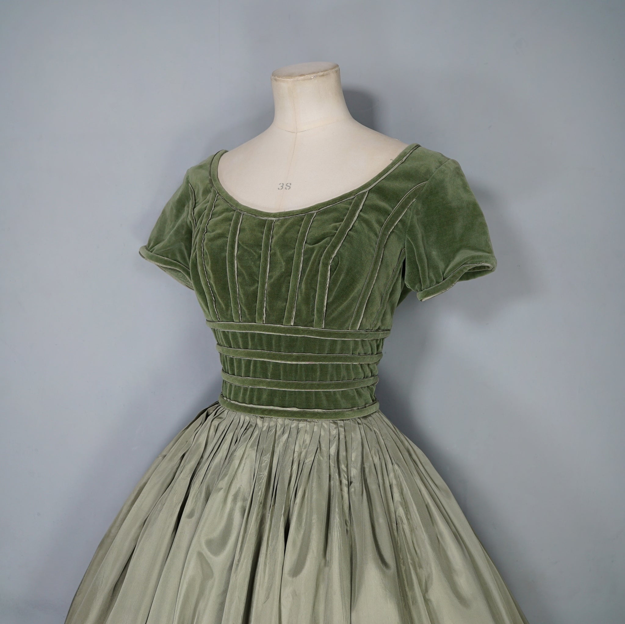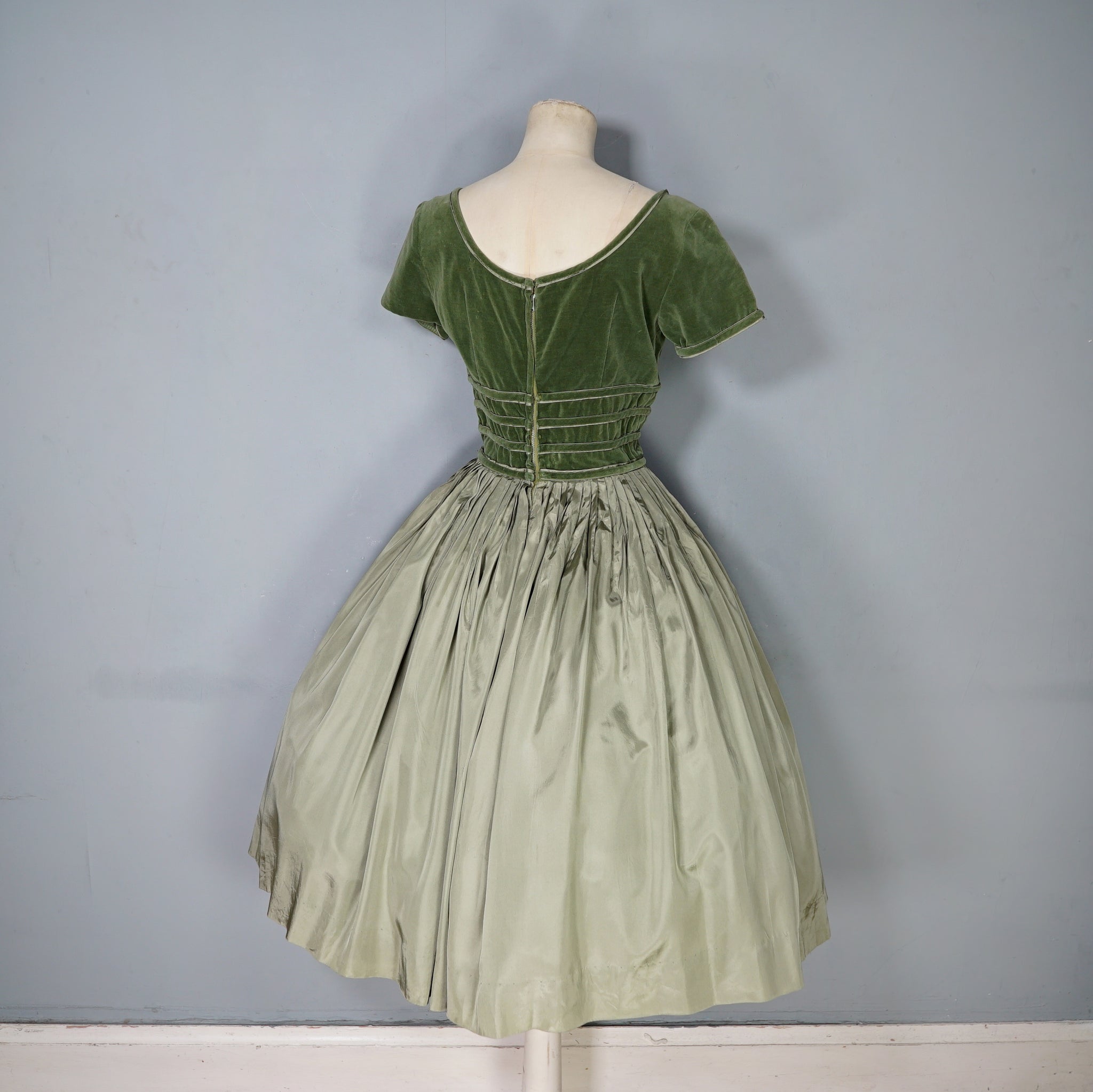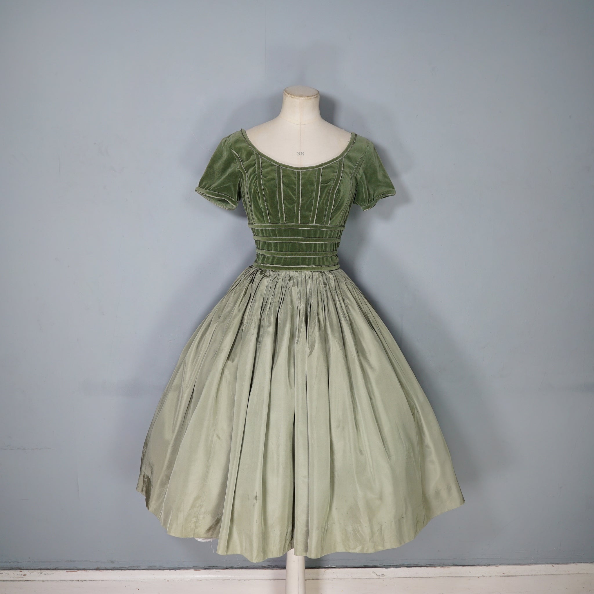 Utterly exquisite beautifully made 50s party dress in a light olive green with a velvet bodice and swishy sheen light taffeta type skirt. The bodice is sewn in Medieval inspired panels with top sewn bands vertically to the bust and horizontally across the waist. These even have a small piping of the skirt fabric sewn into each band - I love this attention to detail. Deep scooped U-neck to front and back and short sleeves. Fitted empire underbust and wide cinching waistband. Skirt is sewn very neatly in tiny pleats to the waistband with a big swooshy fullness. It's unlined, and would wear really well over a petticoat. Back metal zipper to fasten. Label is Tailored Junior, but the fit is a standard woman's length, not petite. It's gorgeous and so beautifully made. Wears well as evening/cocktail wear, but I could totally see this worn casually too.
