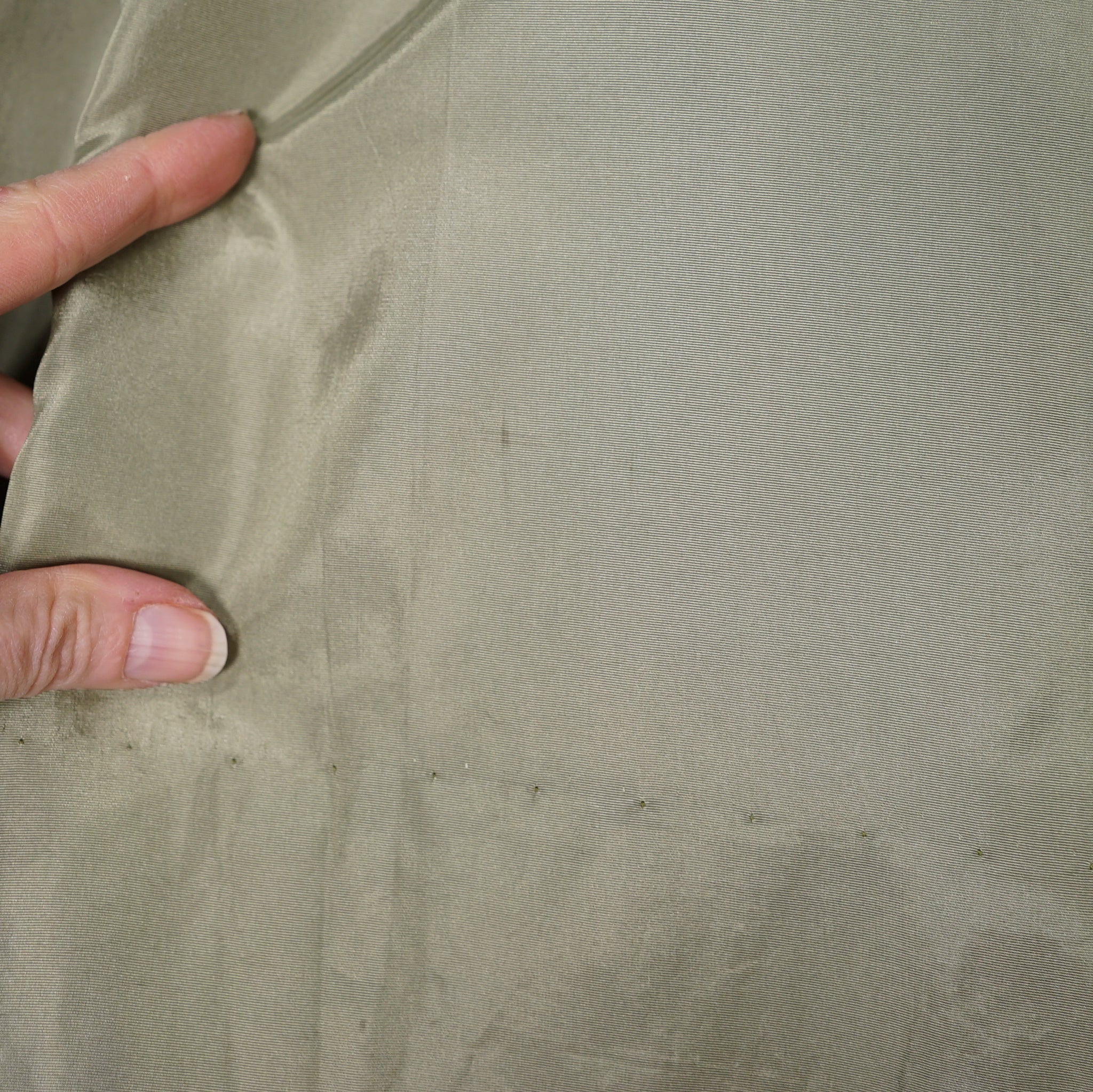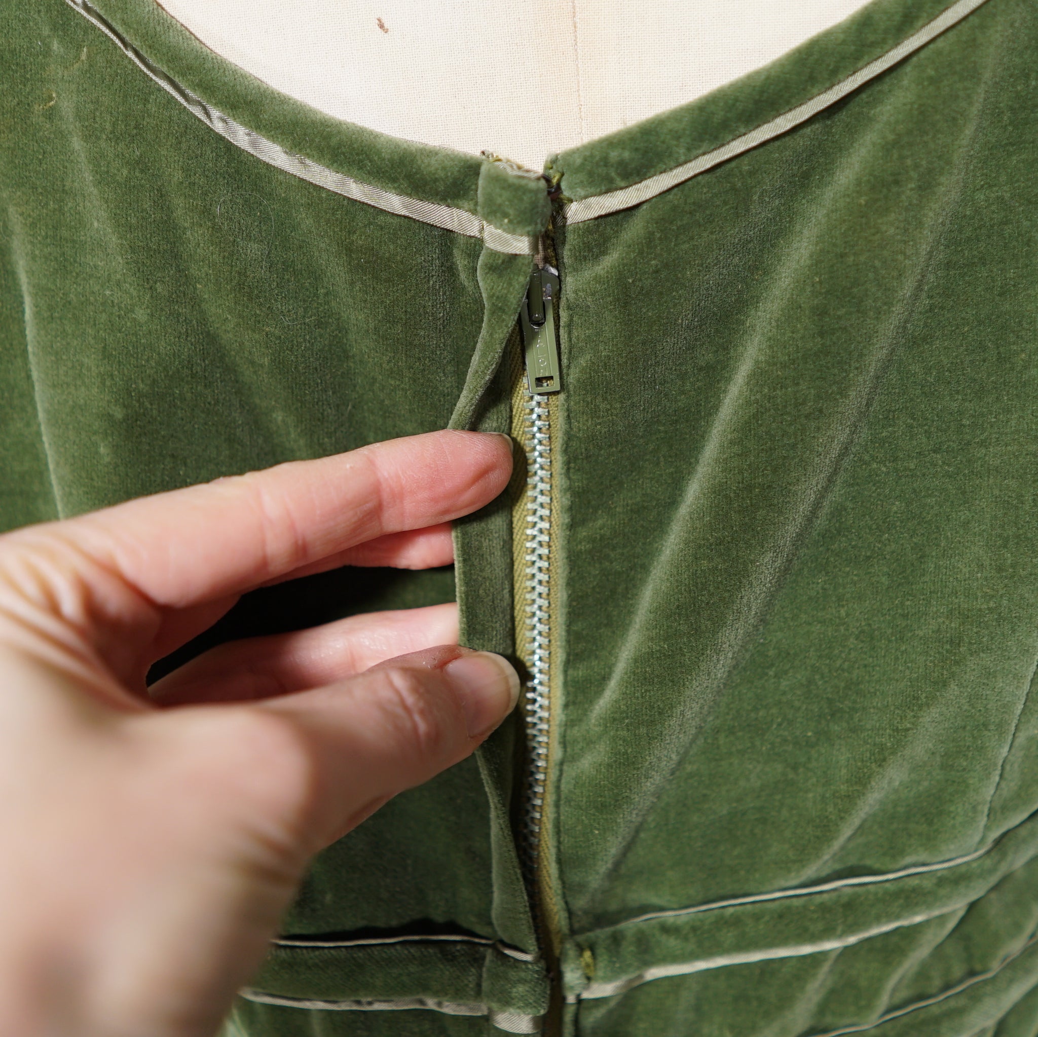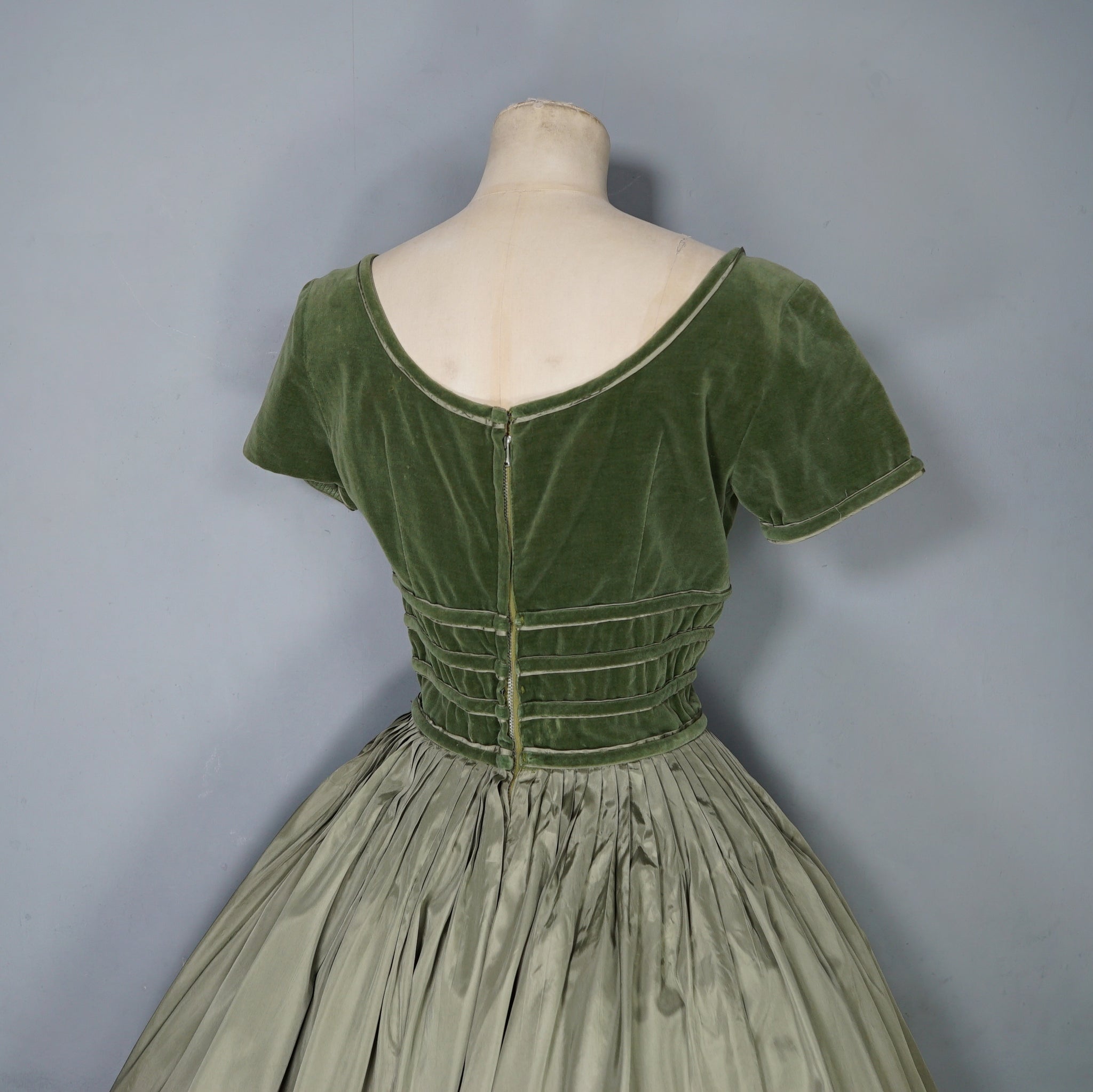 Utterly exquisite beautifully made 50s party dress in a light olive green with a velvet bodice and swishy sheen light taffeta type skirt. The bodice is sewn in Medieval inspired panels with top sewn bands vertically to the bust and horizontally across the waist. These even have a small piping of the skirt fabric sewn into each band - I love this attention to detail. Deep scooped U-neck to front and back and short sleeves. Fitted empire underbust and wide cinching waistband. Skirt is sewn very neatly in tiny pleats to the waistband with a big swooshy fullness. It's unlined, and would wear really well over a petticoat. Back metal zipper to fasten. Label is Tailored Junior, but the fit is a standard woman's length, not petite. It's gorgeous and so beautifully made. Wears well as evening/cocktail wear, but I could totally see this worn casually too.