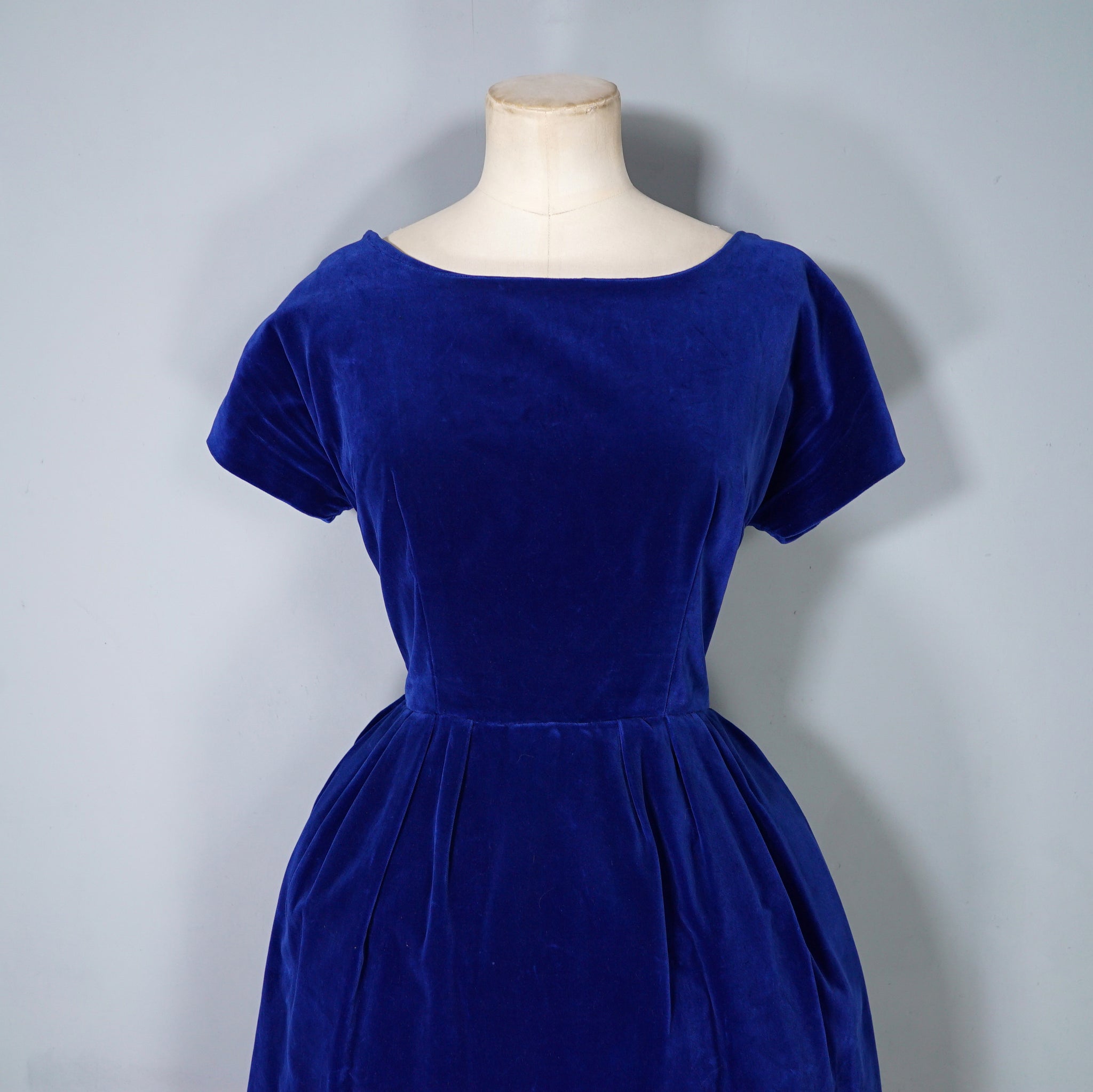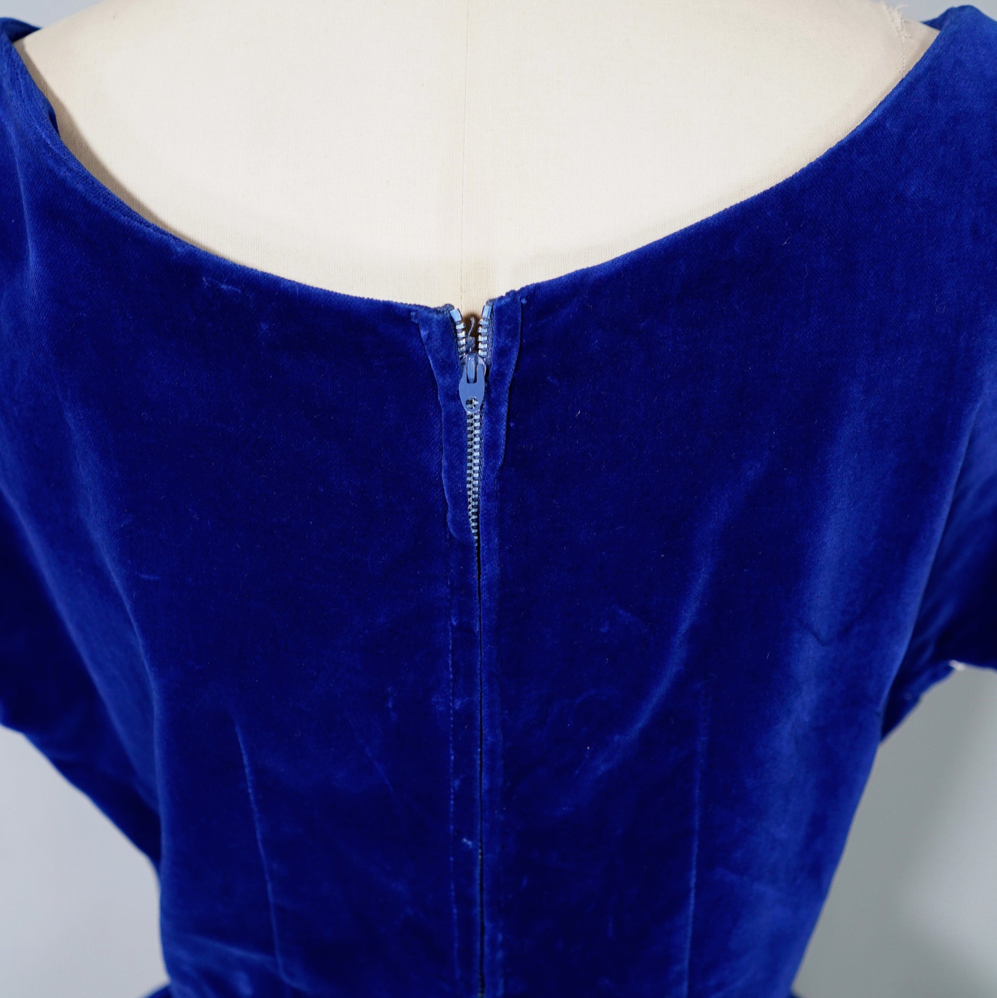 Handmade 60s blue velvet cocktail dress. Lovely royal blue shade in a lustrous cotton velvet. Fitted bodice with short dolman sleeve and wide rounded neck with slightly lower cut back. Fitted waistband, snugly cinching the silhoutte in. Skirt has soft hip pleating and a papery stiffening petticoat with lace trim underneath, giving it a firm fullness, that holds the shape really beautifully. Back metal zipper to fasten. No labels, handmade.