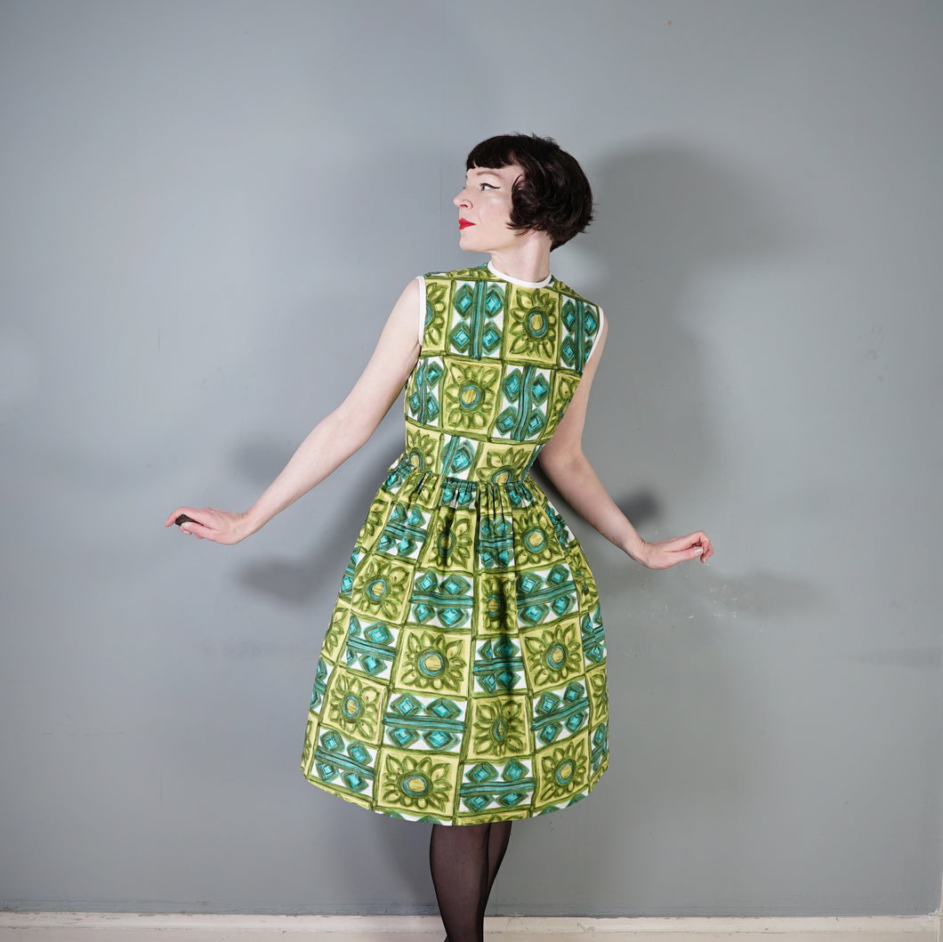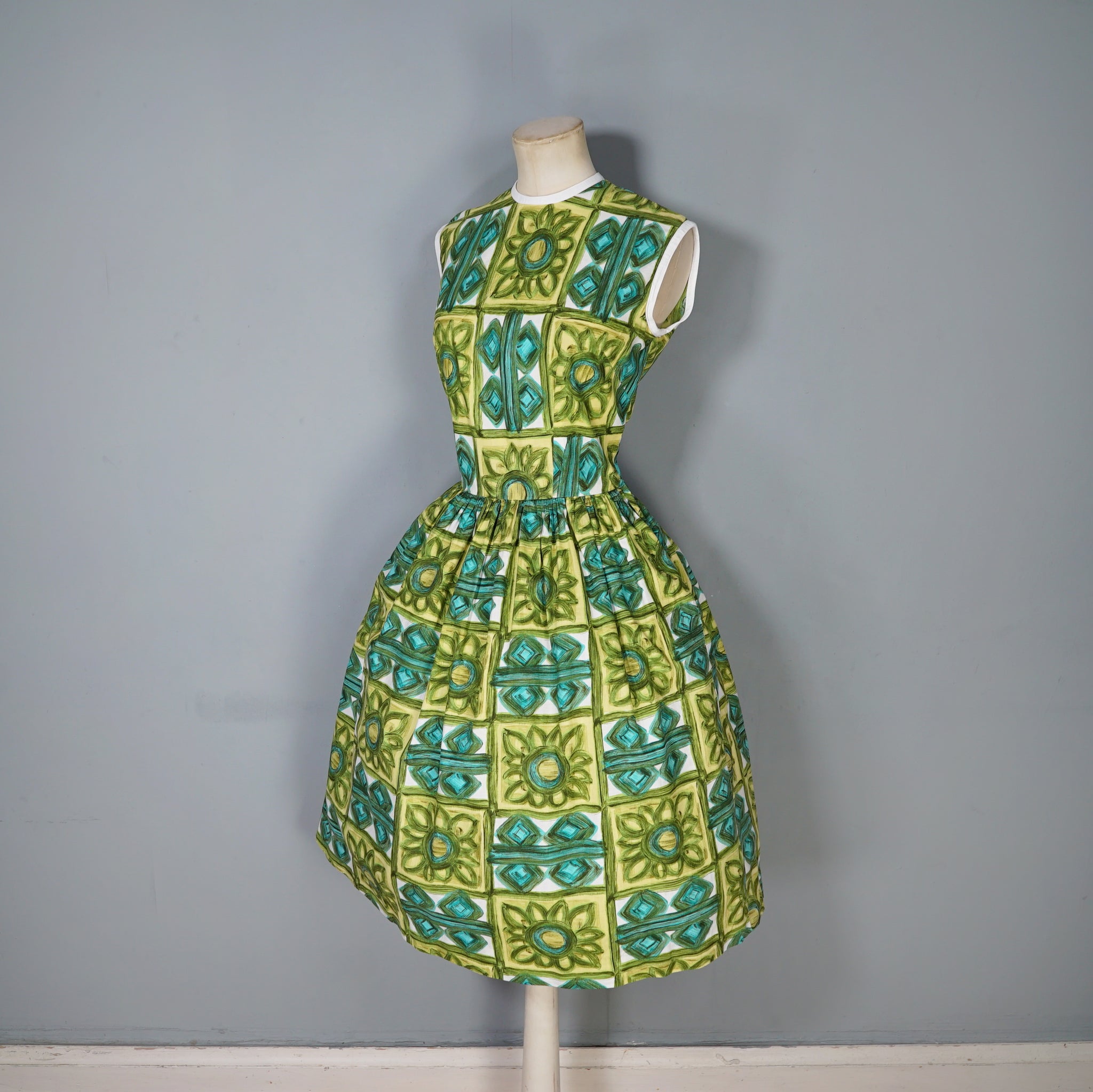 Sweet 60s cotton day dress in a painterly and abstract floral print in shade of green, turquoise and yellow. Fitted bodice with a high rounded neck, trimmed in white and matching trim to the sleeveless arm cuffs. Fitted waistband and cute full skirt sewn in gathers. Back metal zipper to fasten. Label is vintage Dorothy Perkins.