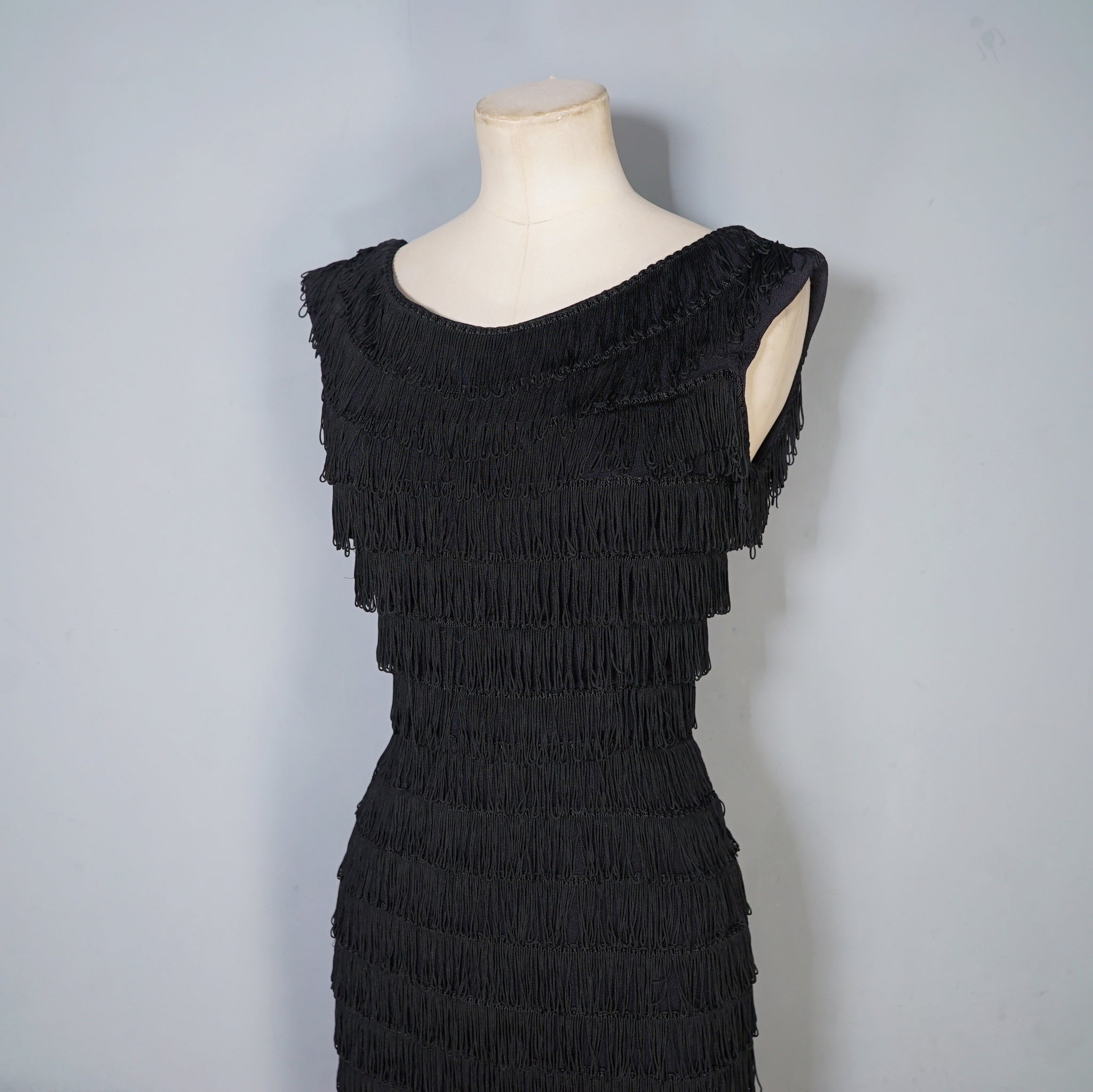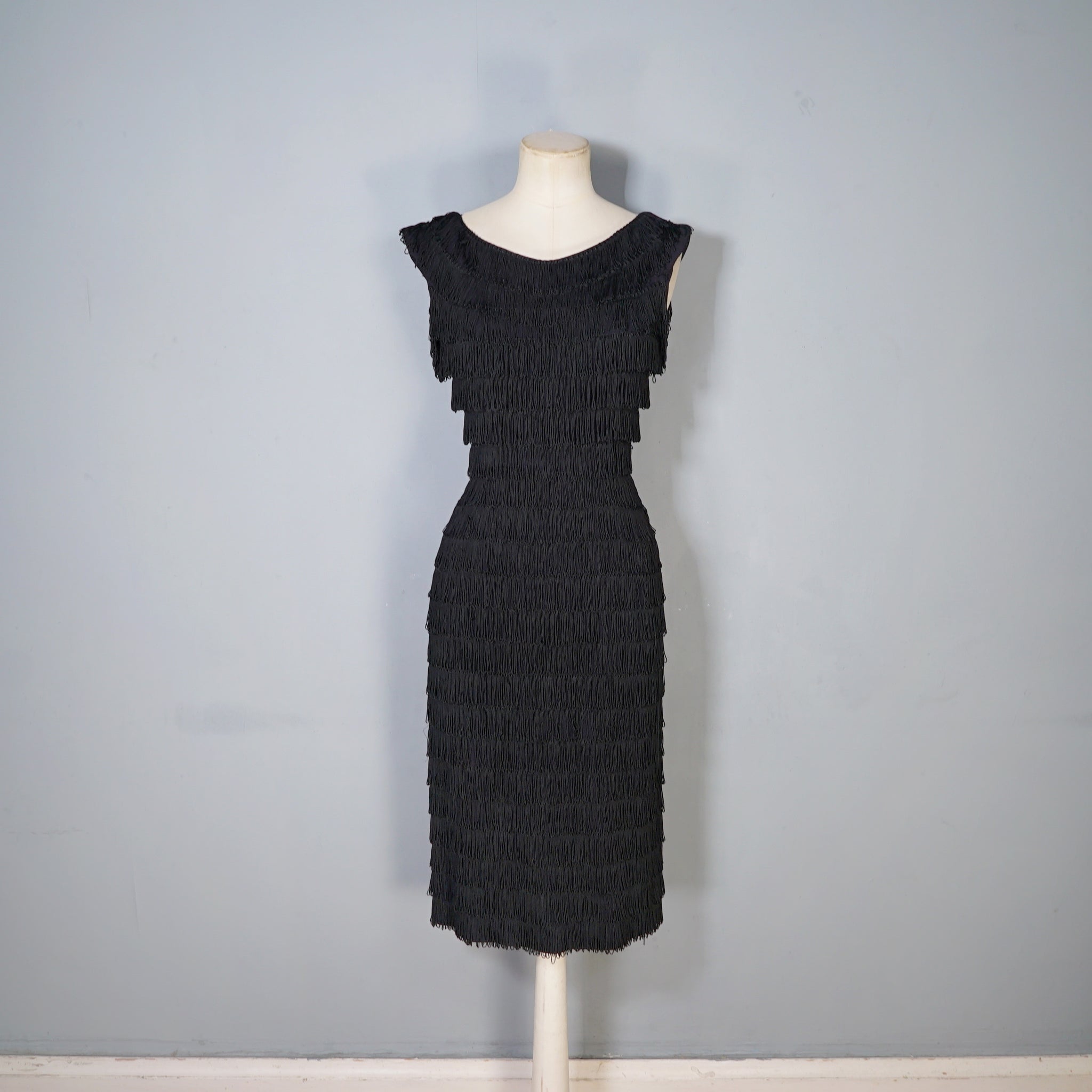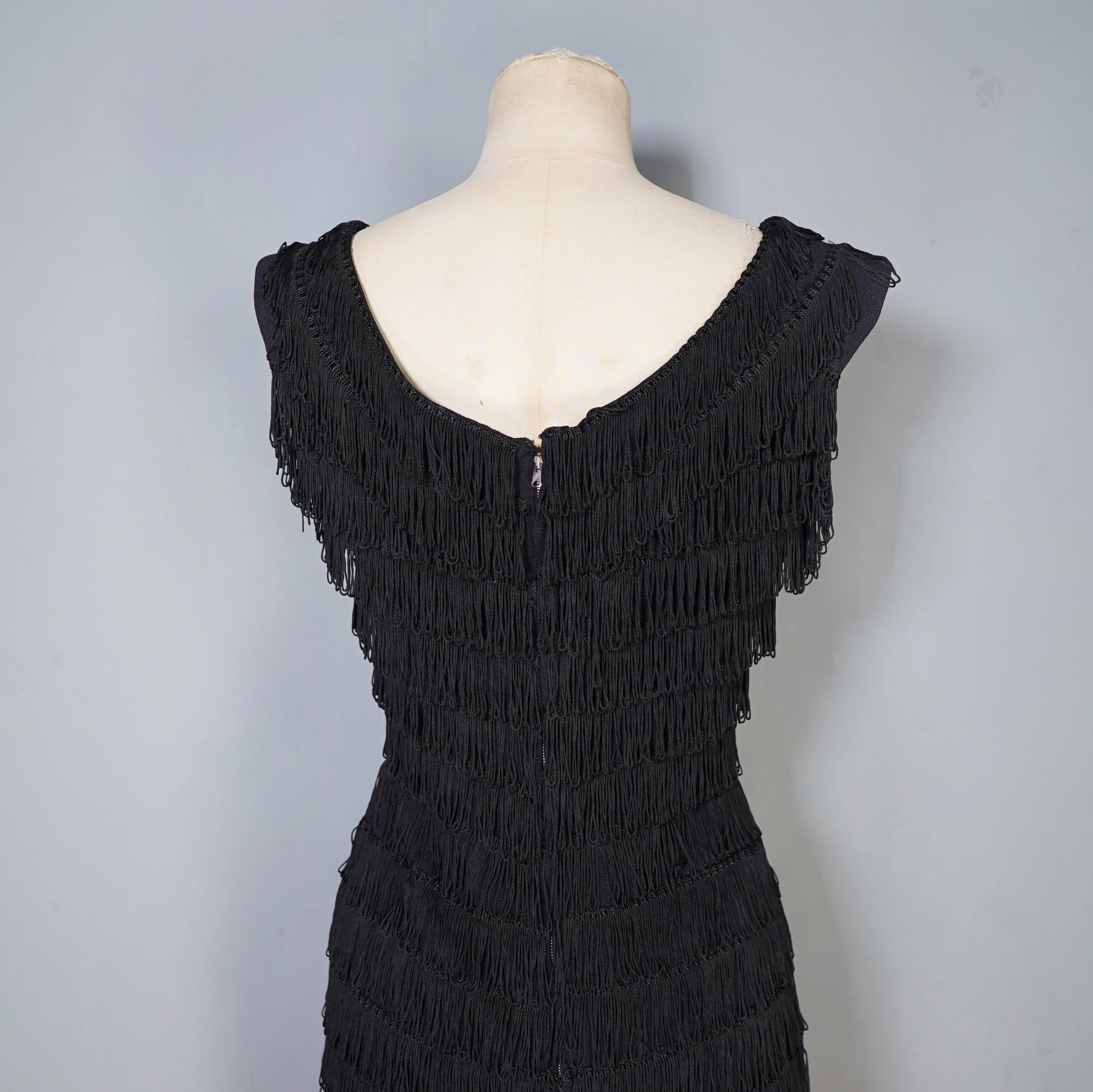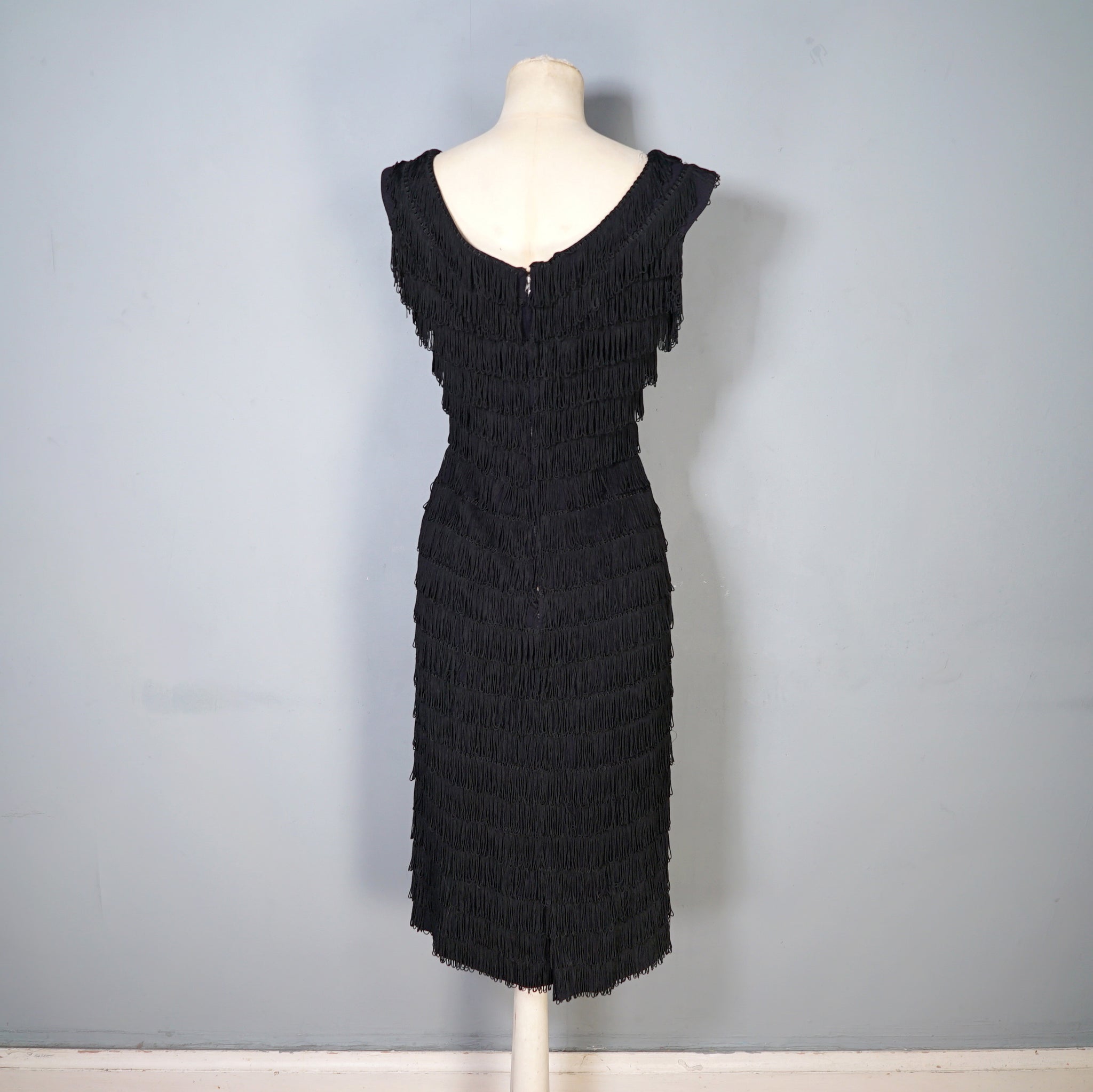 Absolutely the chicest and most fun cocktail piece - the classic fringed lbd. This one by Russell Stuart, London. Beautifully fitted with a high rounded neck and sleeveless fit with slight cap effect to the shoulder. Elegant nipped in waist and and pencil skirt with small pleat to the back. Back metal zipper to fasten. Fabric is a fairly weighty synthetic crepe with heavy looped fringing.