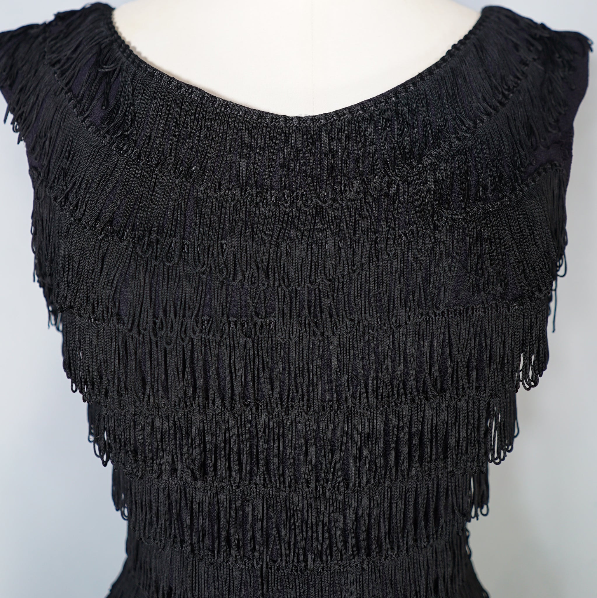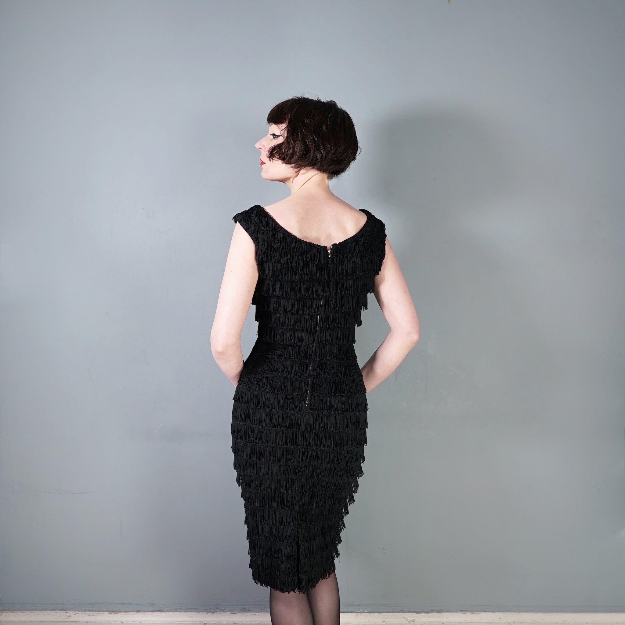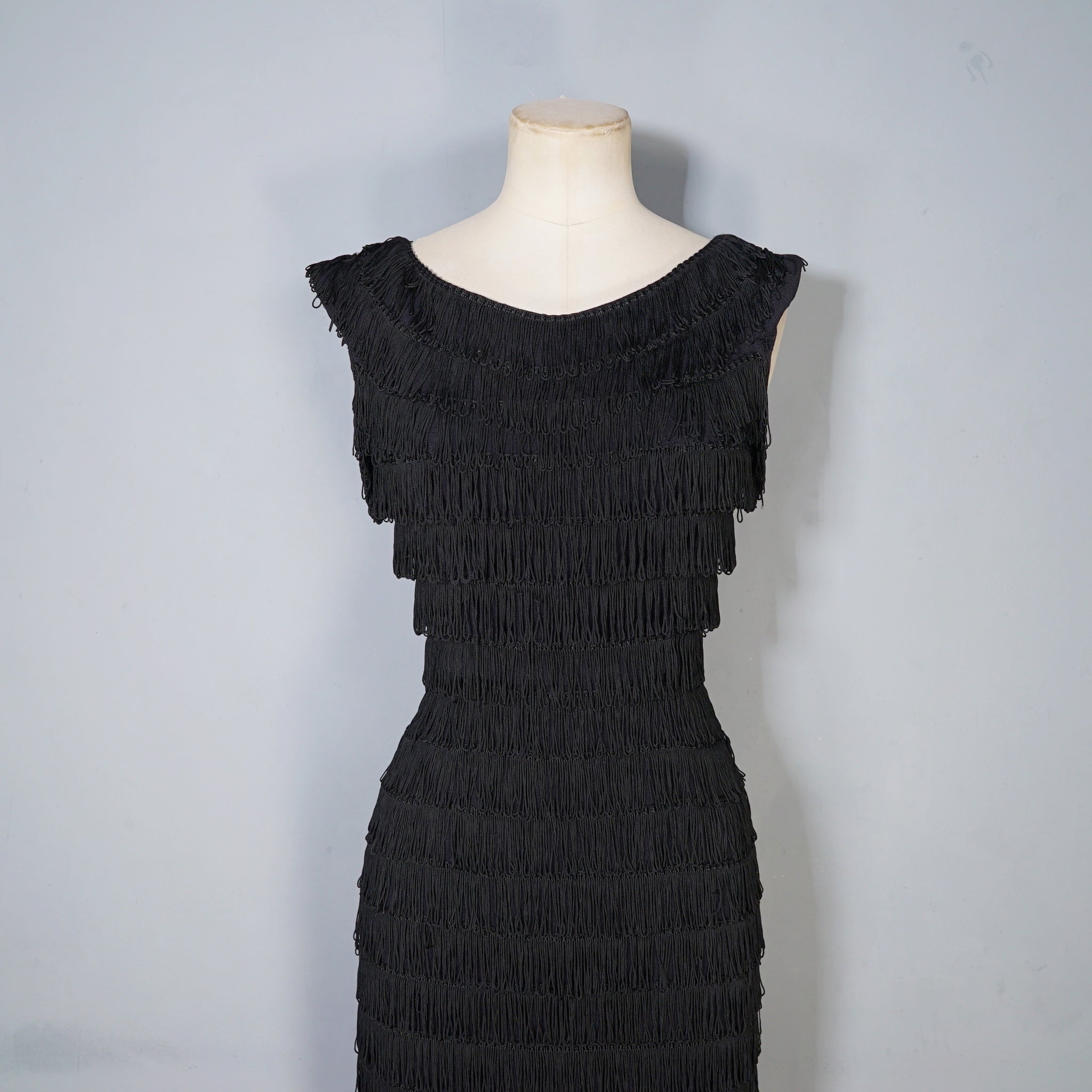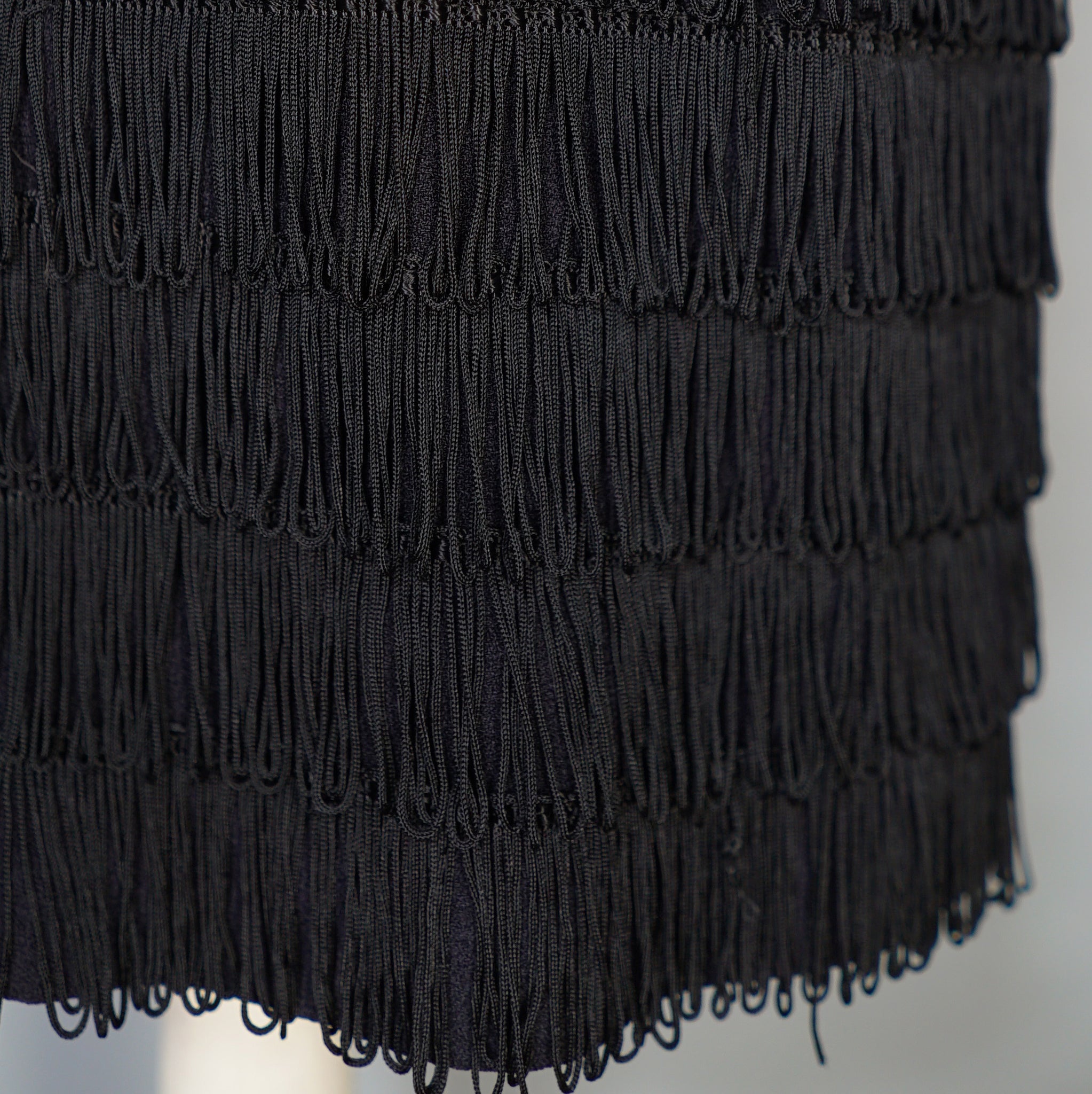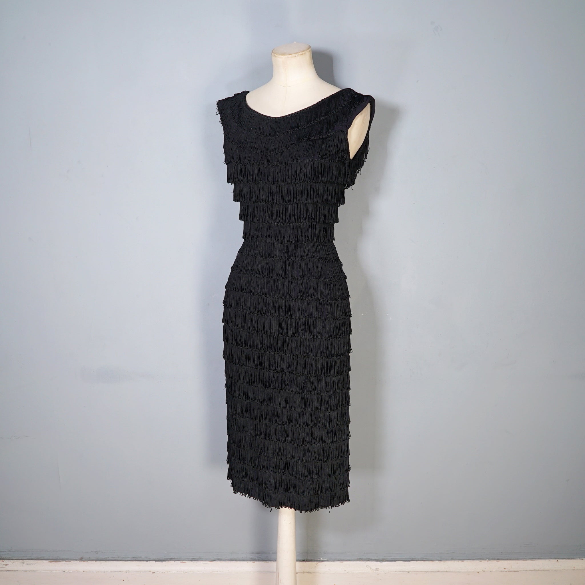 Absolutely the chicest and most fun cocktail piece - the classic fringed lbd. This one by Russell Stuart, London. Beautifully fitted with a high rounded neck and sleeveless fit with slight cap effect to the shoulder. Elegant nipped in waist and and pencil skirt with small pleat to the back. Back metal zipper to fasten. Fabric is a fairly weighty synthetic crepe with heavy looped fringing.
