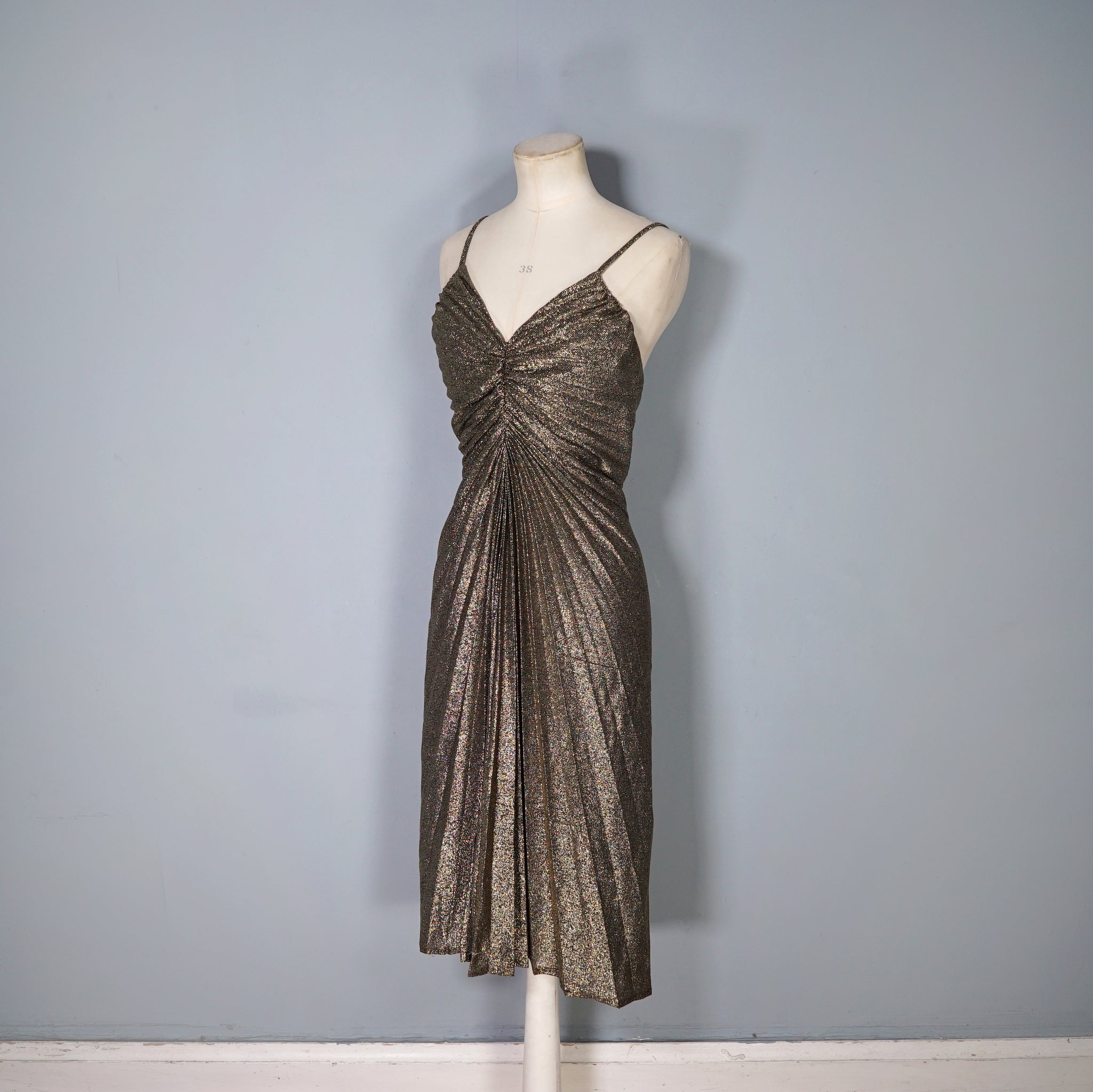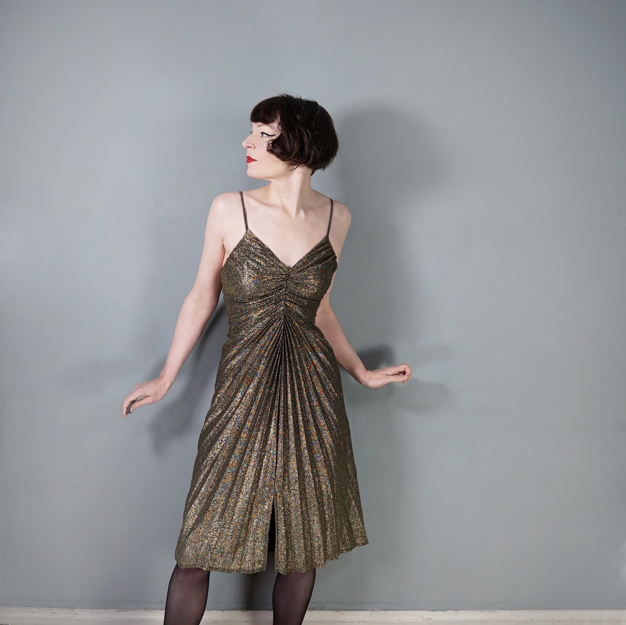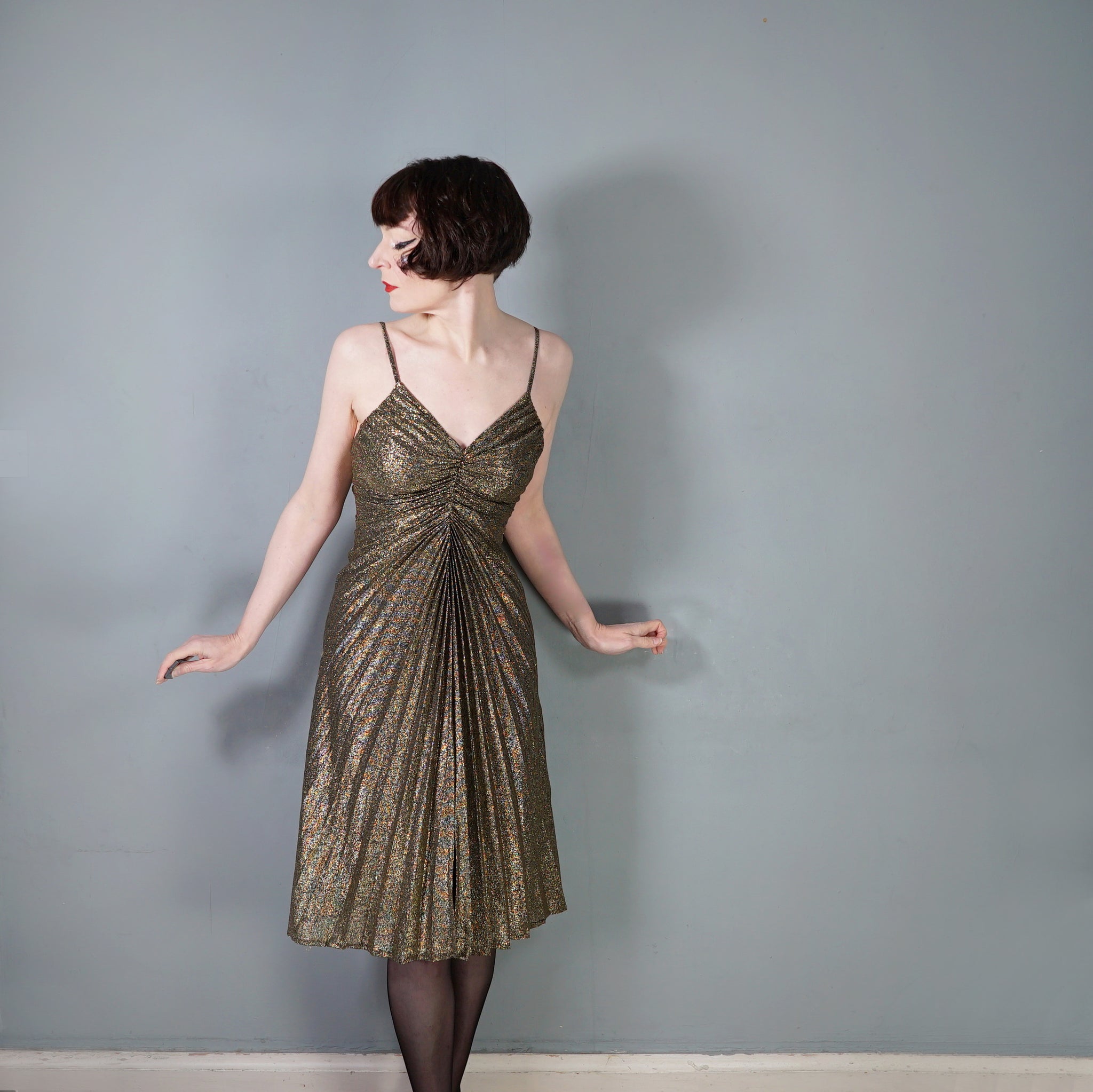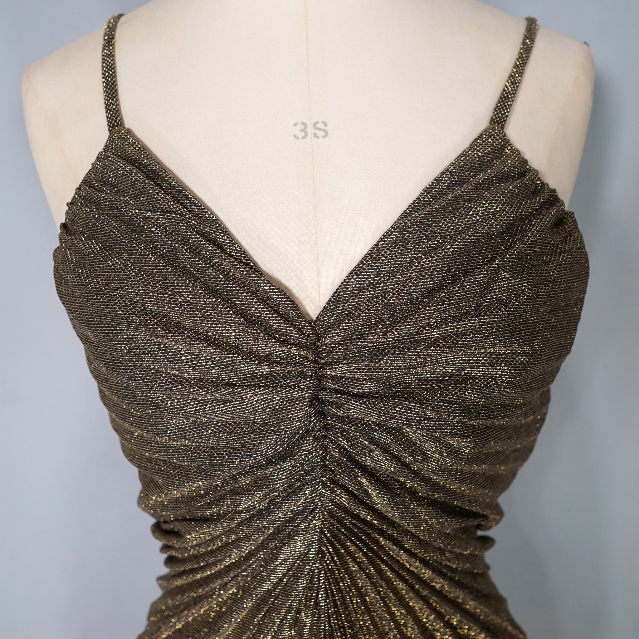 Classic late 70s / early 80s disco piece by Kadix, sparkly lurex gold metallic with pleated skirt and gathered bust, heavily inspired by Marilyn Monroe’s gold pleated William Travilla dress, but updated for a punkier disco style. Thin shoulder straps and a built in bust panel with underbust elastic for support. Back zip to fasten. Slit in the front.
