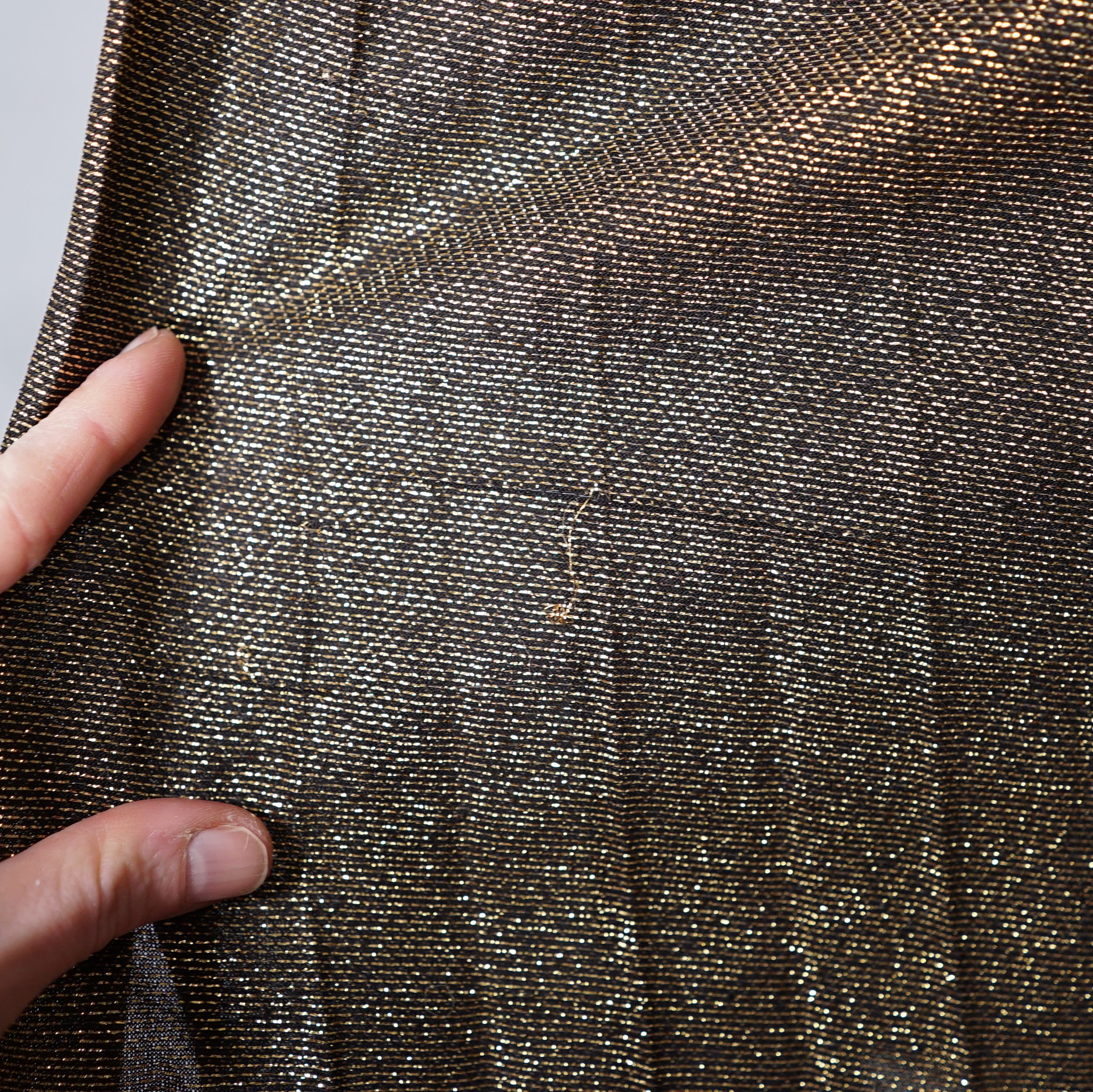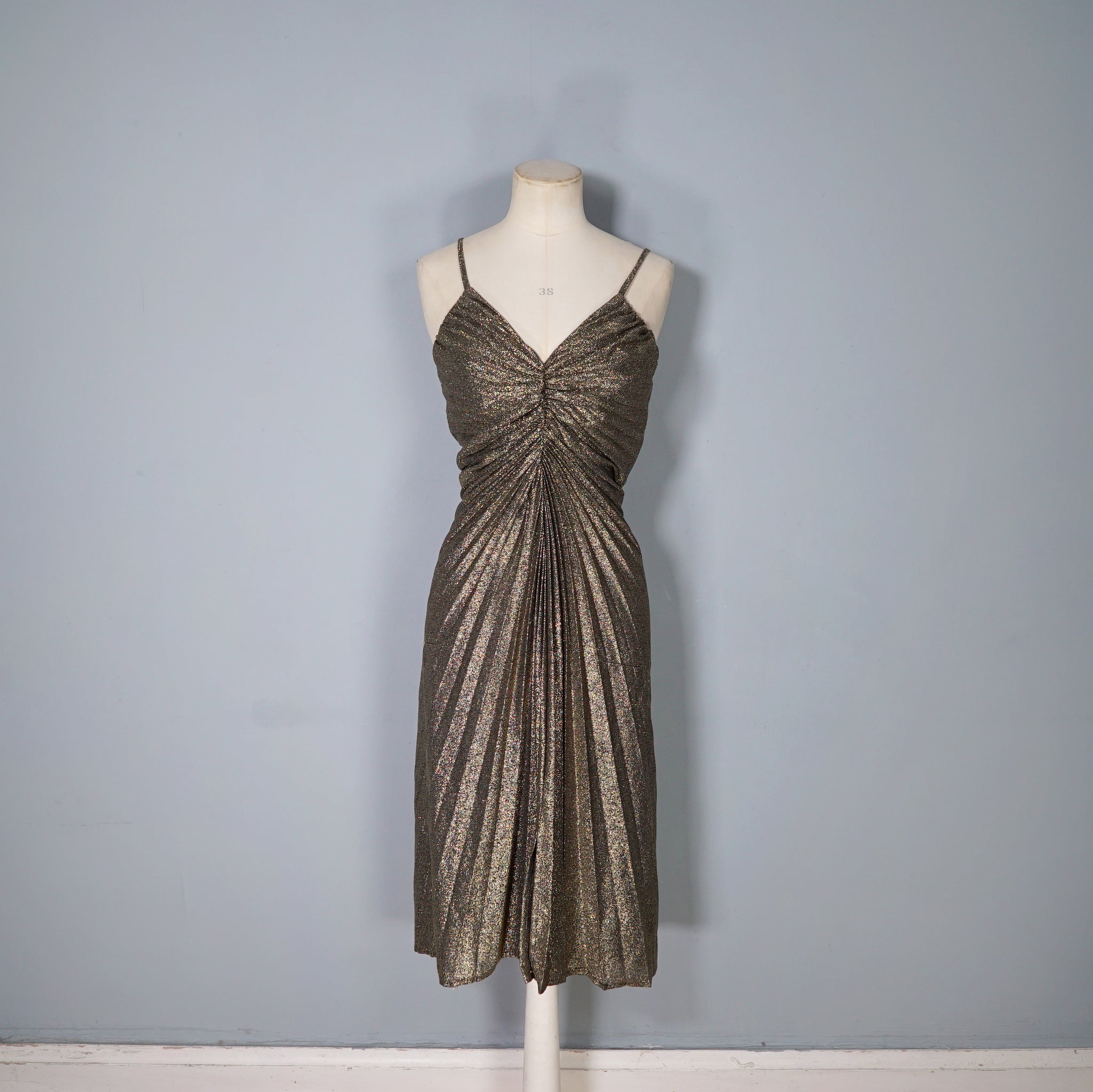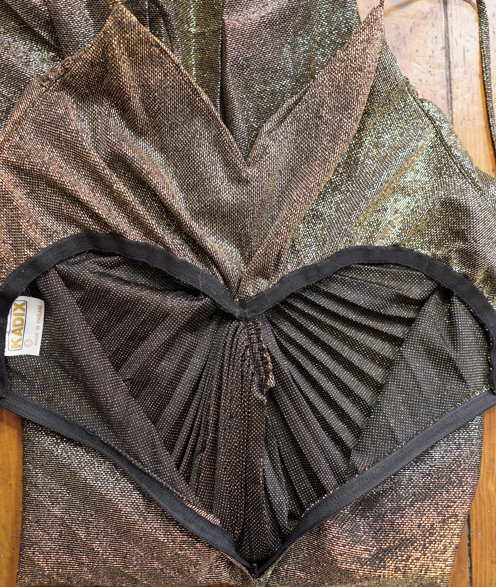 Classic late 70s / early 80s disco piece by Kadix, sparkly lurex gold metallic with pleated skirt and gathered bust, heavily inspired by Marilyn Monroe’s gold pleated William Travilla dress, but updated for a punkier disco style. Thin shoulder straps and a built in bust panel with underbust elastic for support. Back zip to fasten. Slit in the front.