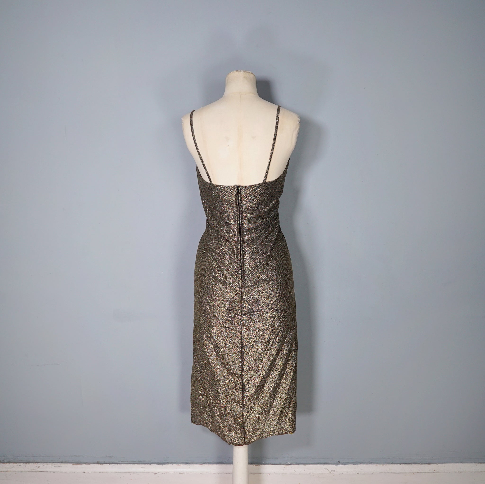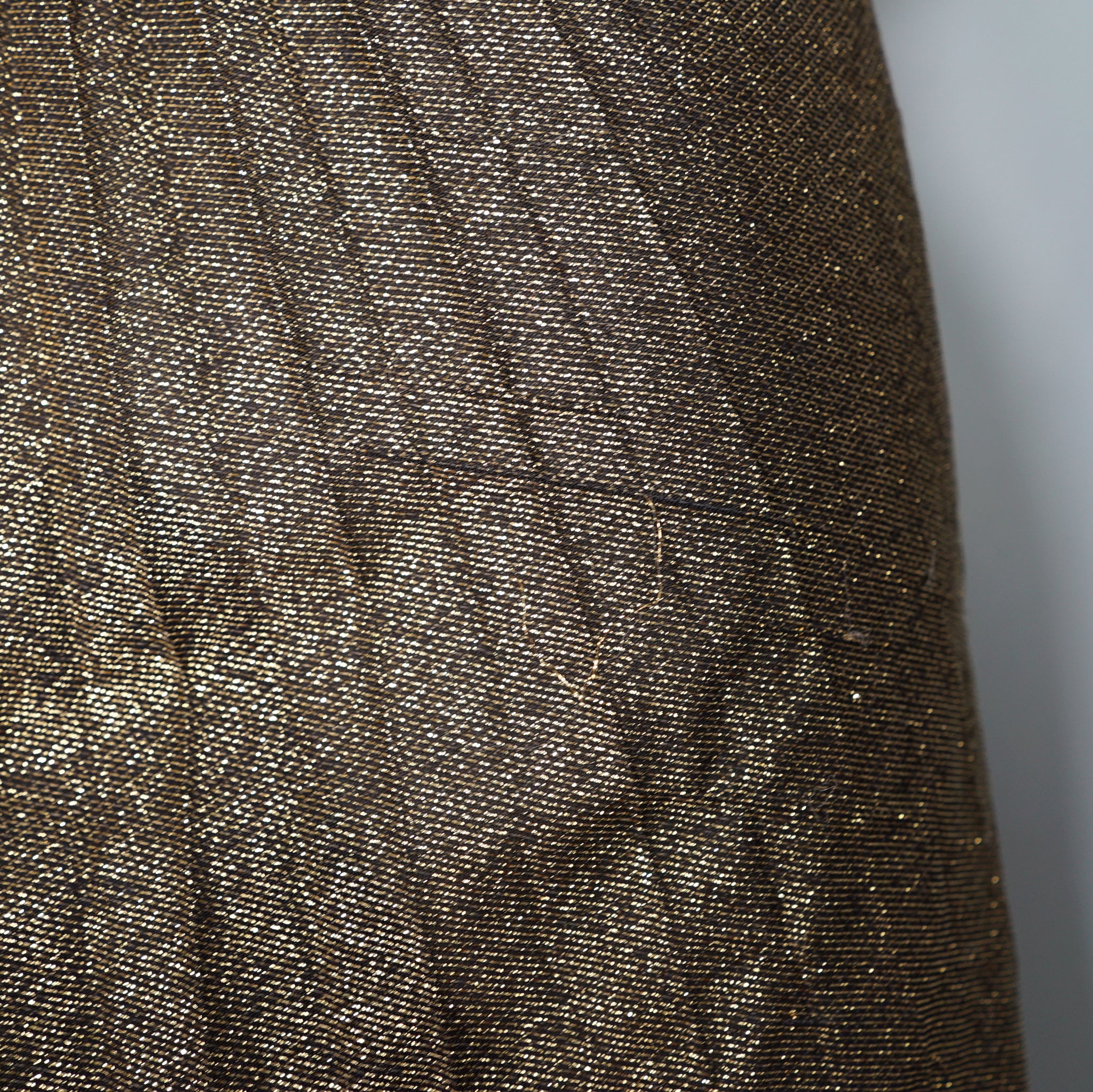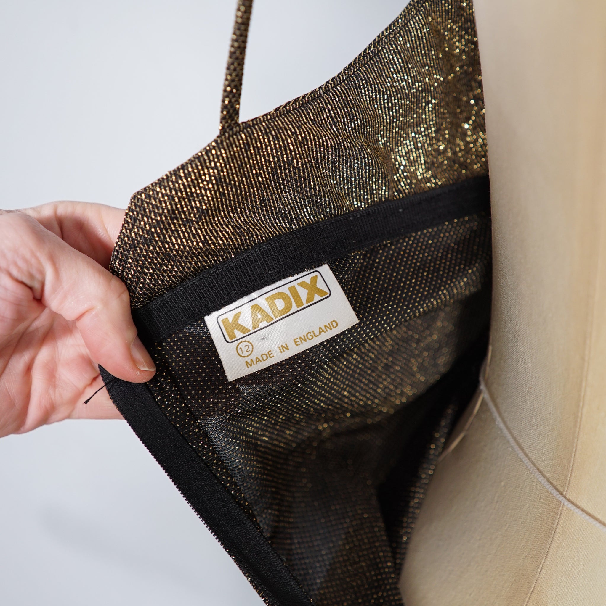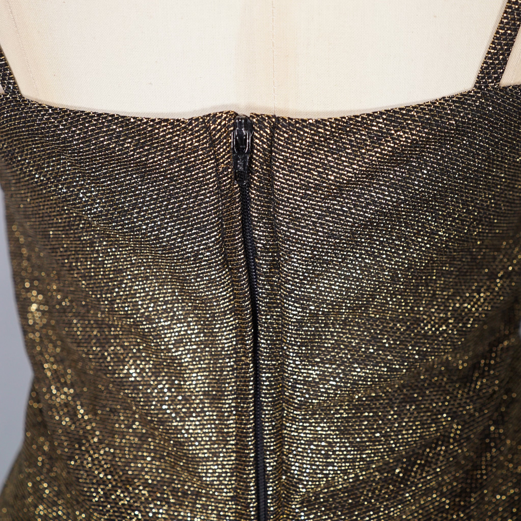 Classic late 70s / early 80s disco piece by Kadix, sparkly lurex gold metallic with pleated skirt and gathered bust, heavily inspired by Marilyn Monroe’s gold pleated William Travilla dress, but updated for a punkier disco style. Thin shoulder straps and a built in bust panel with underbust elastic for support. Back zip to fasten. Slit in the front.