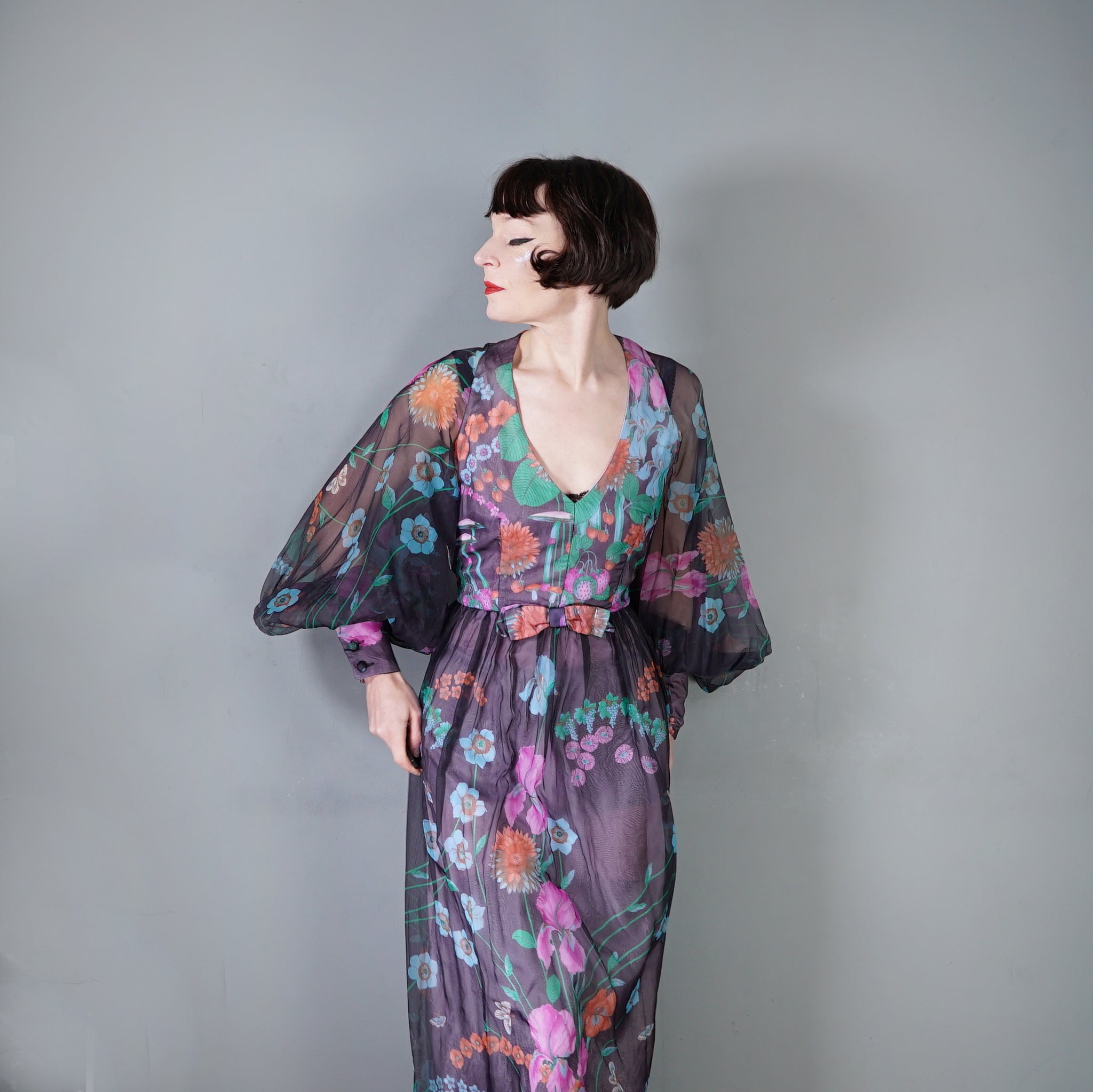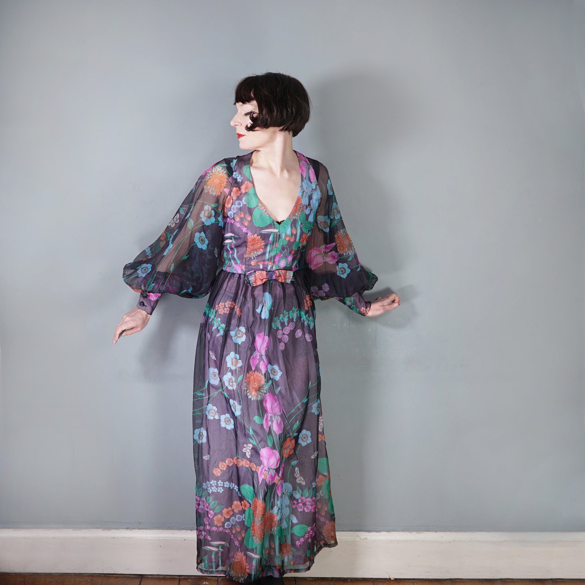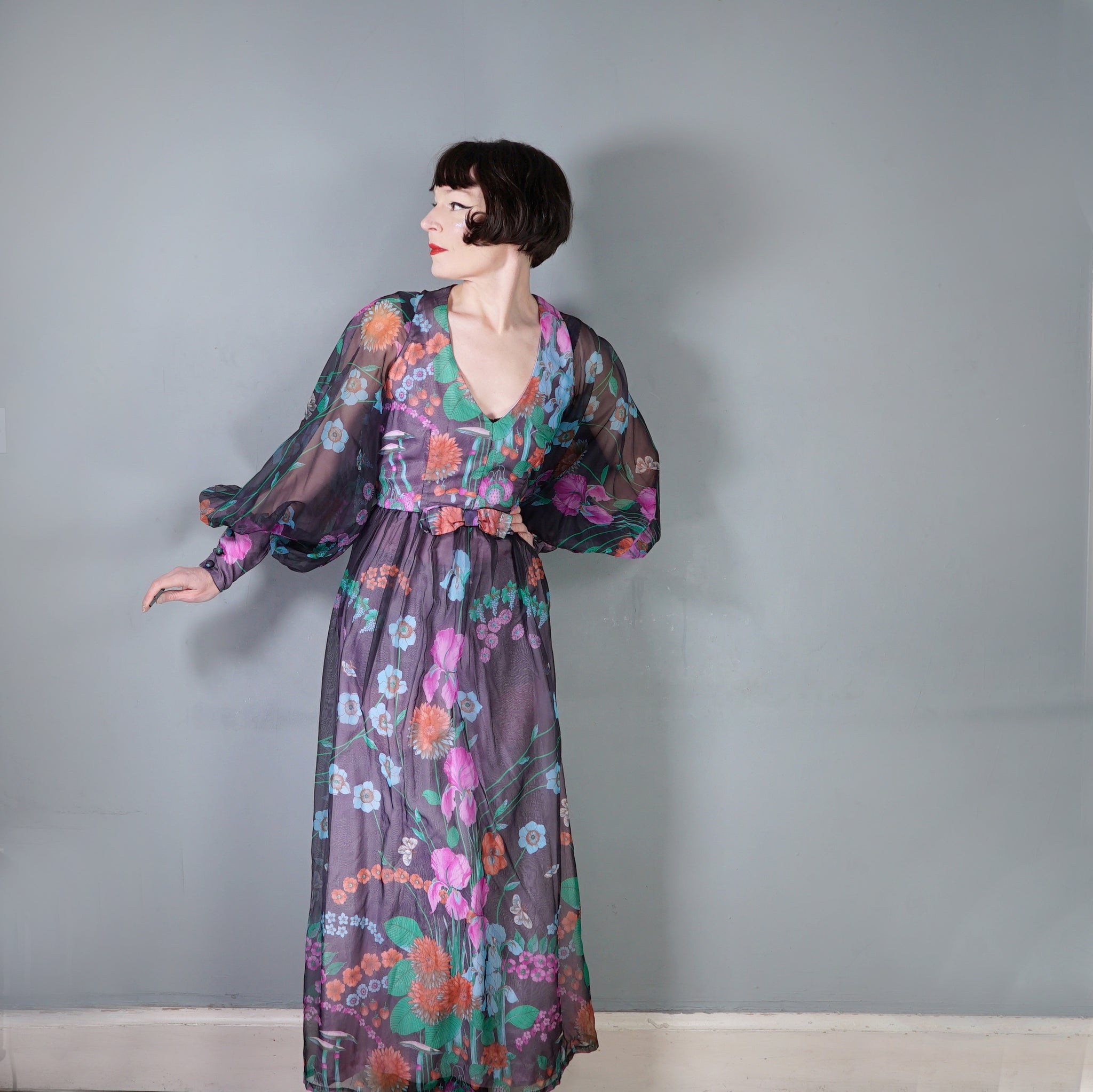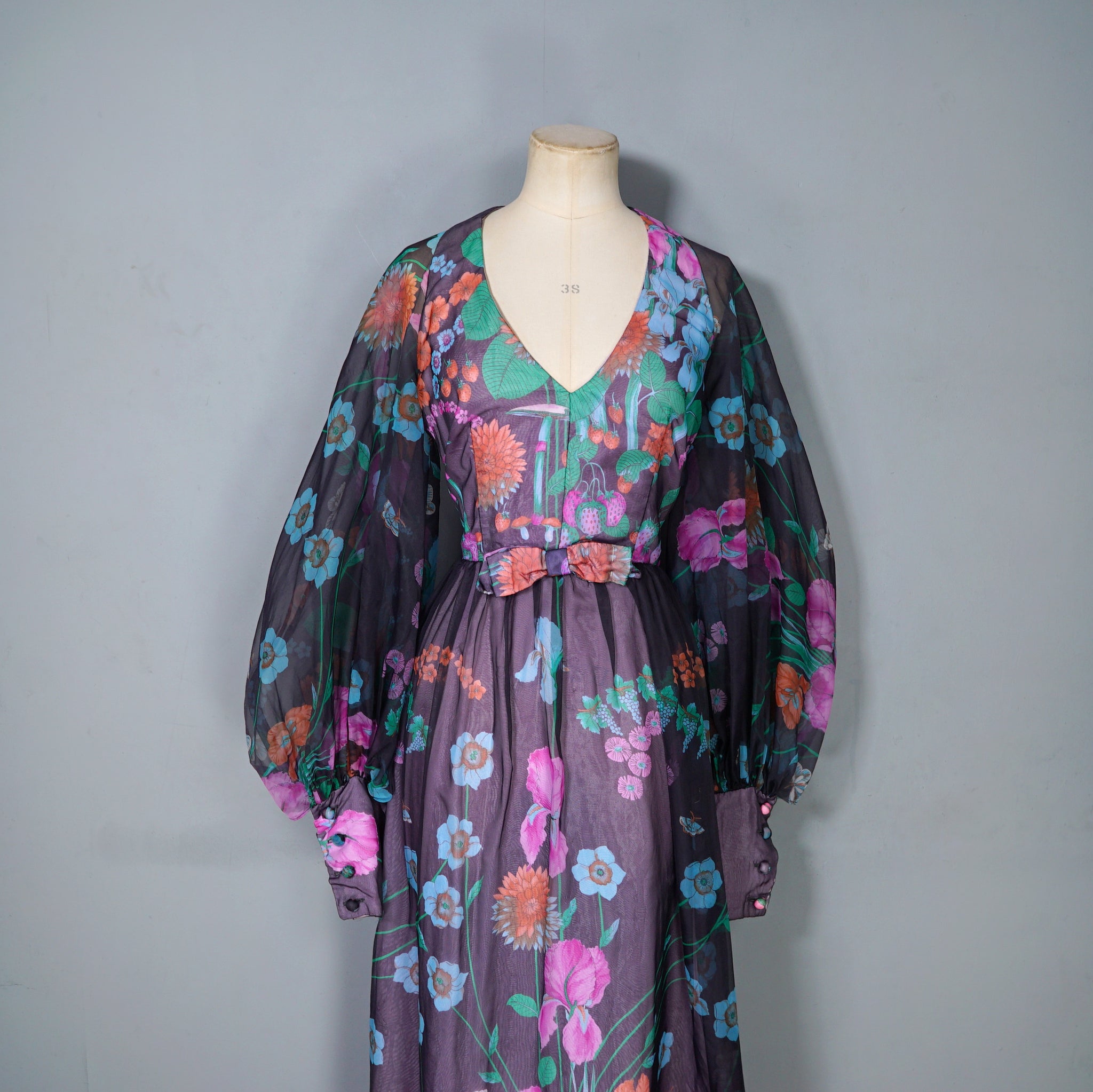 Spectacular 70s maxi dress in a dusky sheer aubergine/near black chiffon with a psychedelic print of flowers, berries and mushrooms. And as if that wasn't amazing enough this also sports the most dramatic HUGE sheer balloon sleeves with tightly cinched cuffs with four covered ball buttons. Fitted waist with bow in front. Raglan style shoulder and deep v-neck. Back has an open key hole slit with neck fastened with two small hooks. Full length skirt, softly flared. The outer fabric is the lightest sheerest synthetic chiffon, and this is lined with a pastel lilac acetate which gives it a soft purple-y hue. Back nylom zip to fasten. Label is John Charles.