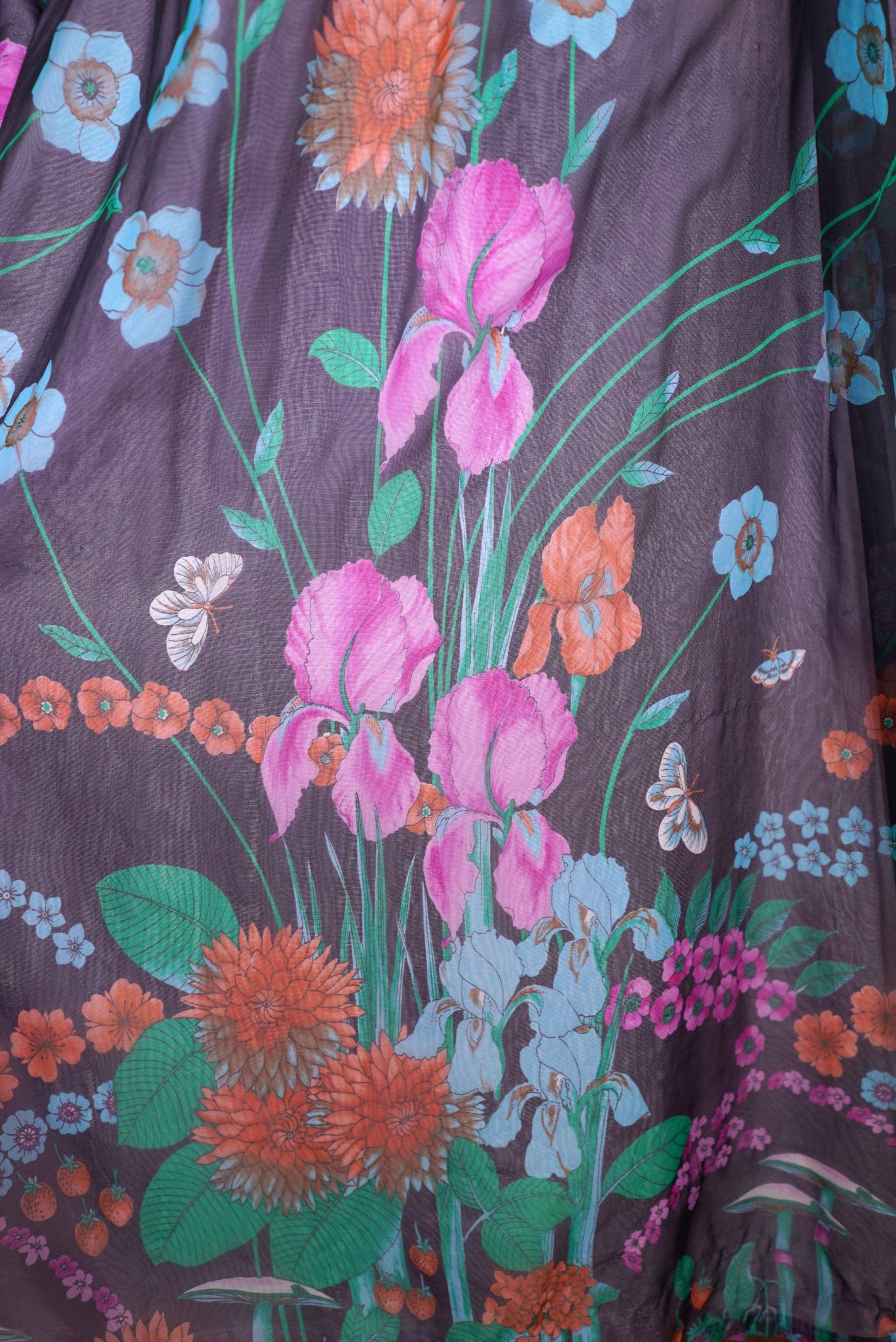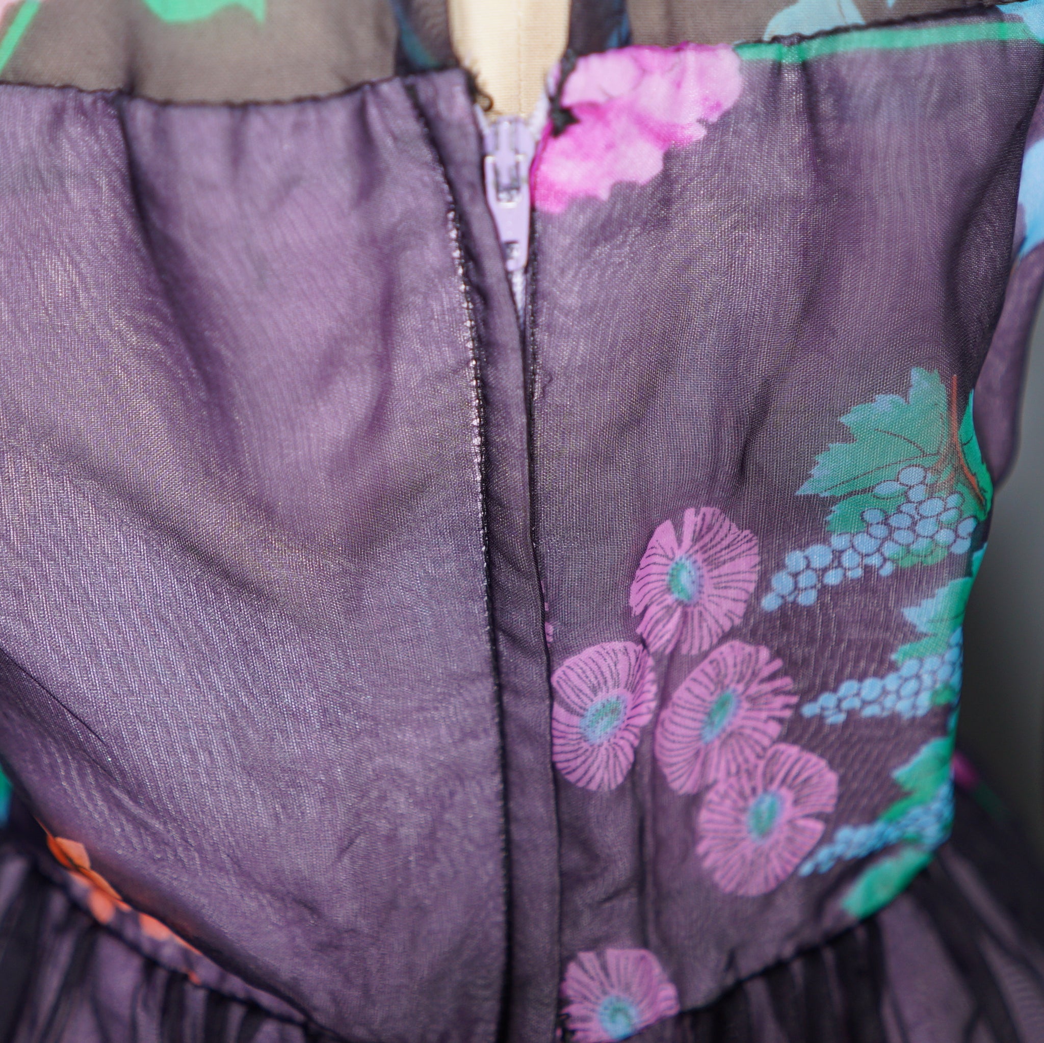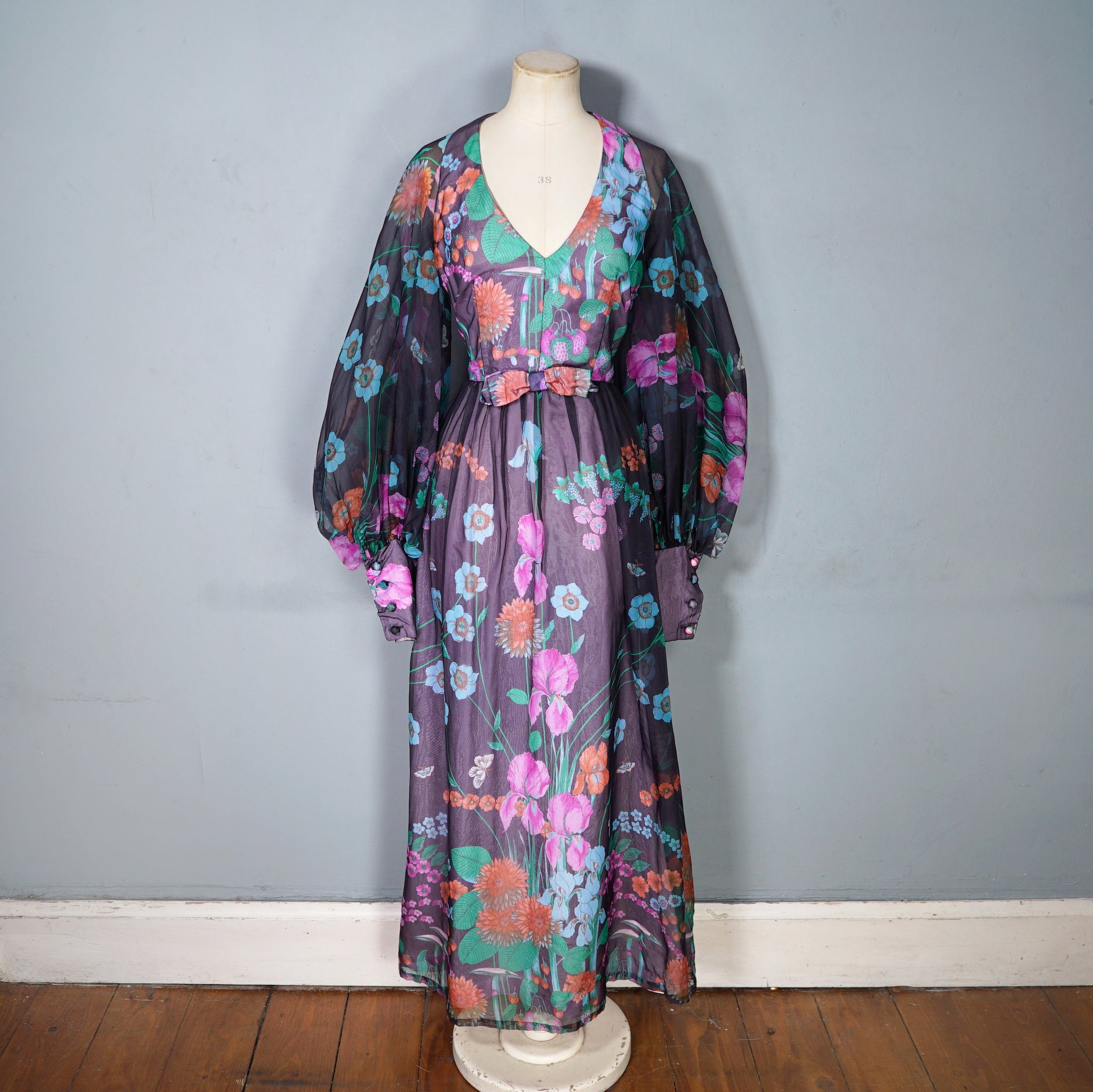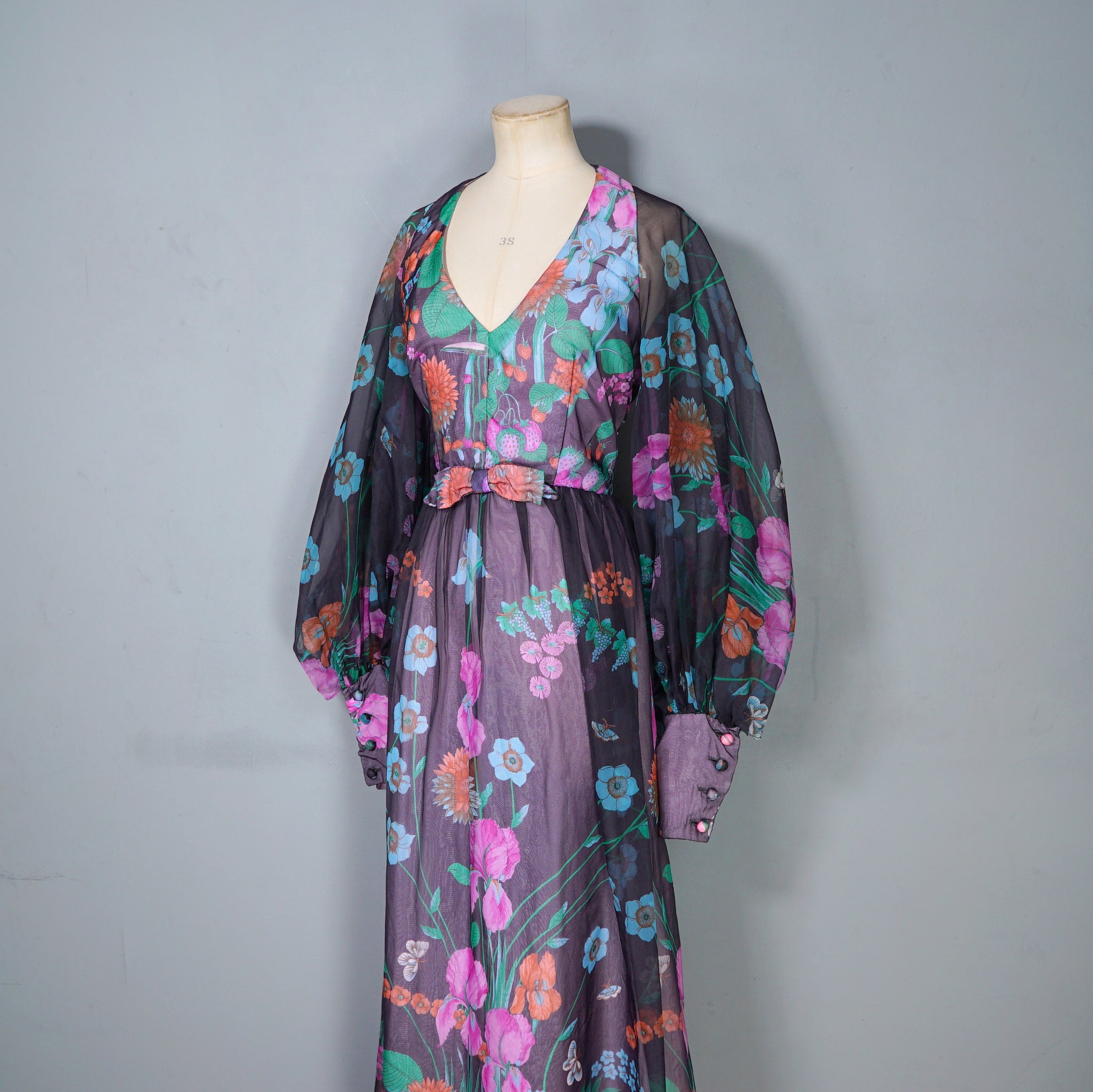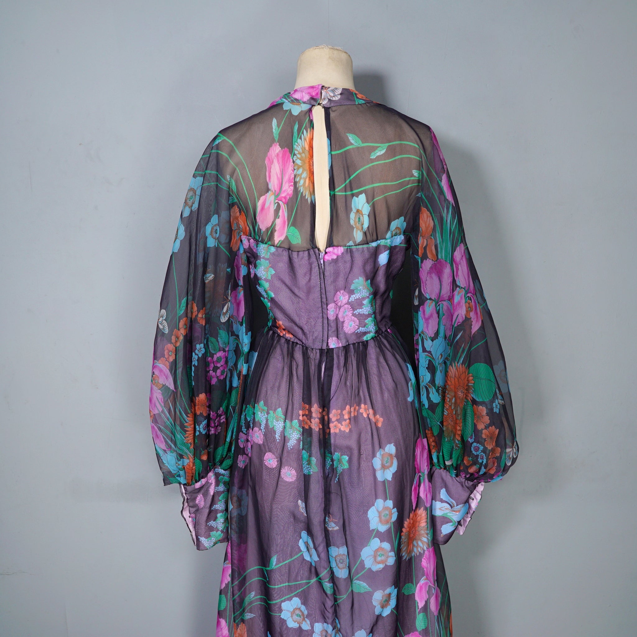 Spectacular 70s maxi dress in a dusky sheer aubergine/near black chiffon with a psychedelic print of flowers, berries and mushrooms. And as if that wasn't amazing enough this also sports the most dramatic HUGE sheer balloon sleeves with tightly cinched cuffs with four covered ball buttons. Fitted waist with bow in front. Raglan style shoulder and deep v-neck. Back has an open key hole slit with neck fastened with two small hooks. Full length skirt, softly flared. The outer fabric is the lightest sheerest synthetic chiffon, and this is lined with a pastel lilac acetate which gives it a soft purple-y hue. Back nylom zip to fasten. Label is John Charles.