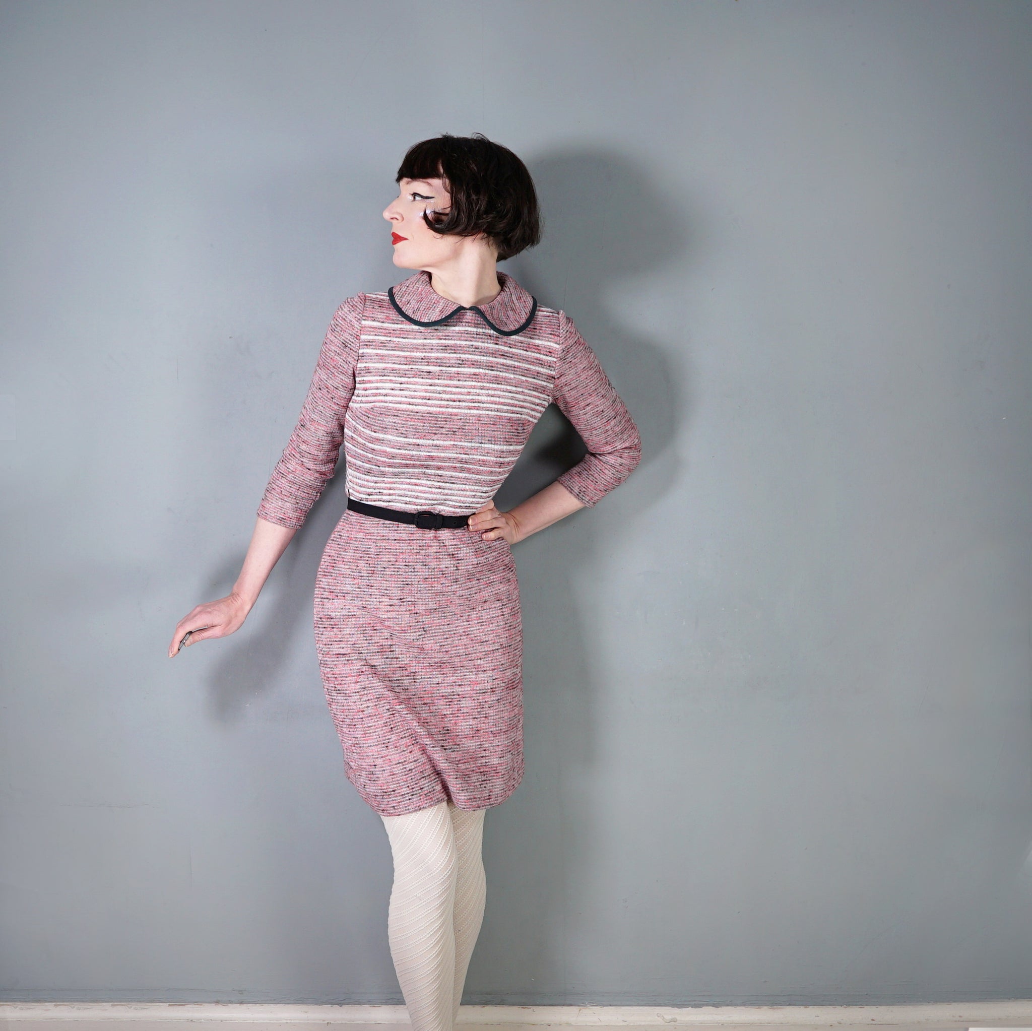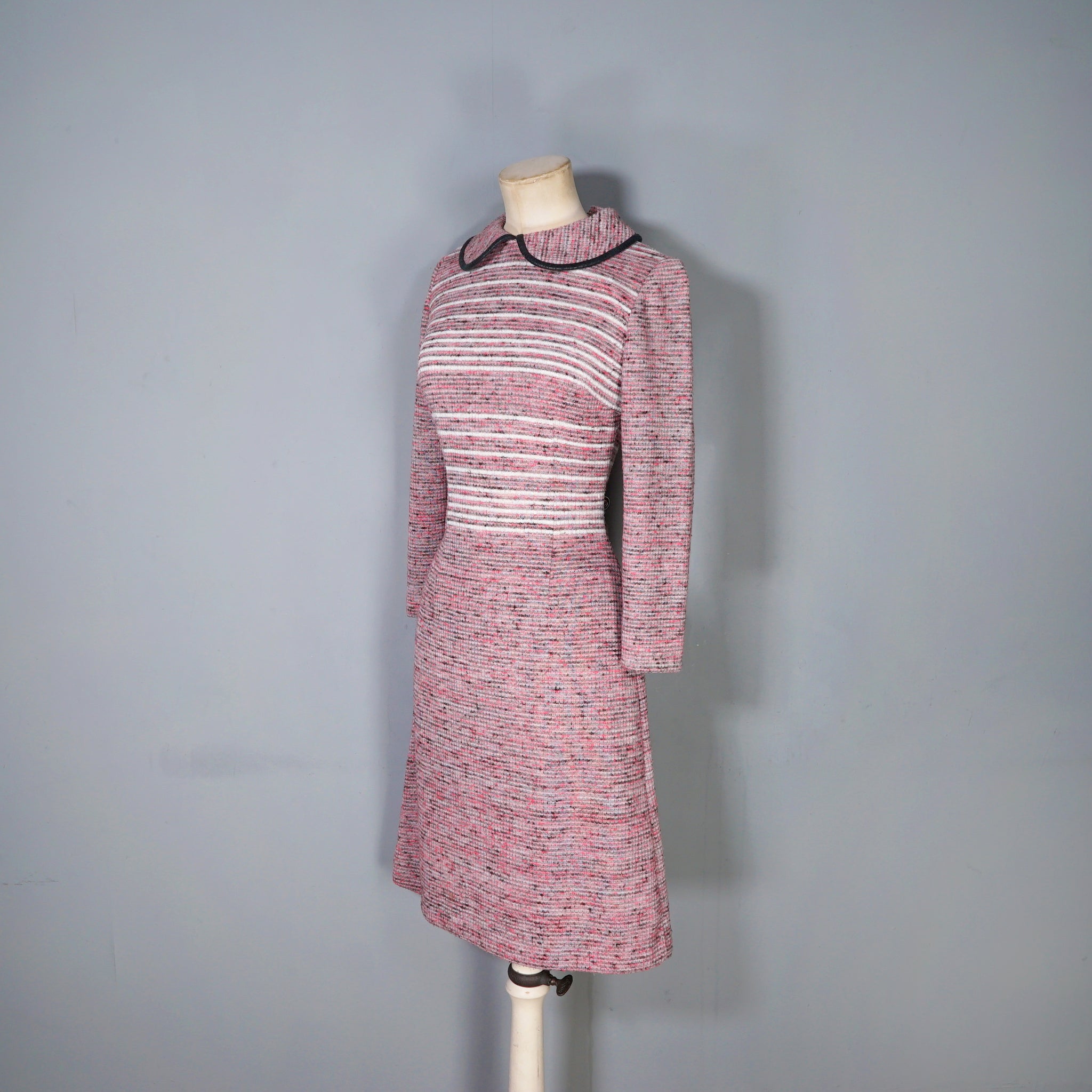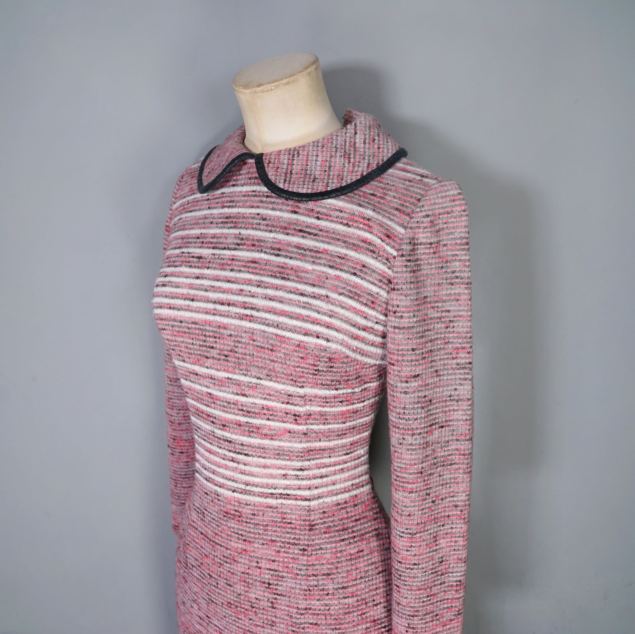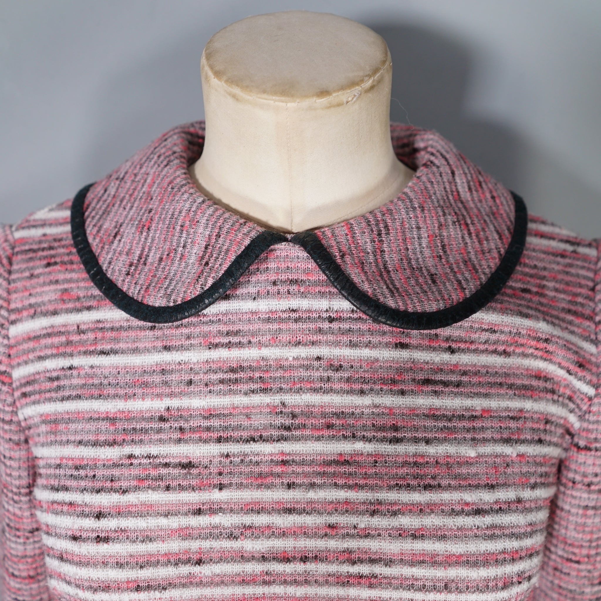 70s Northern Irish made knitted fitted dress by Streilitz. Soft rib knit in a terylene and viscose blend yarn with a slightly slubby texture and soft marled colour of pinks and browns and white stripes. Long slim fitting sleeves. High neck with peter pan collar. Darted silhouette for a fitted design. Unlined. Dress has belt loops but nobelt. Back nylon zip to fasten.
