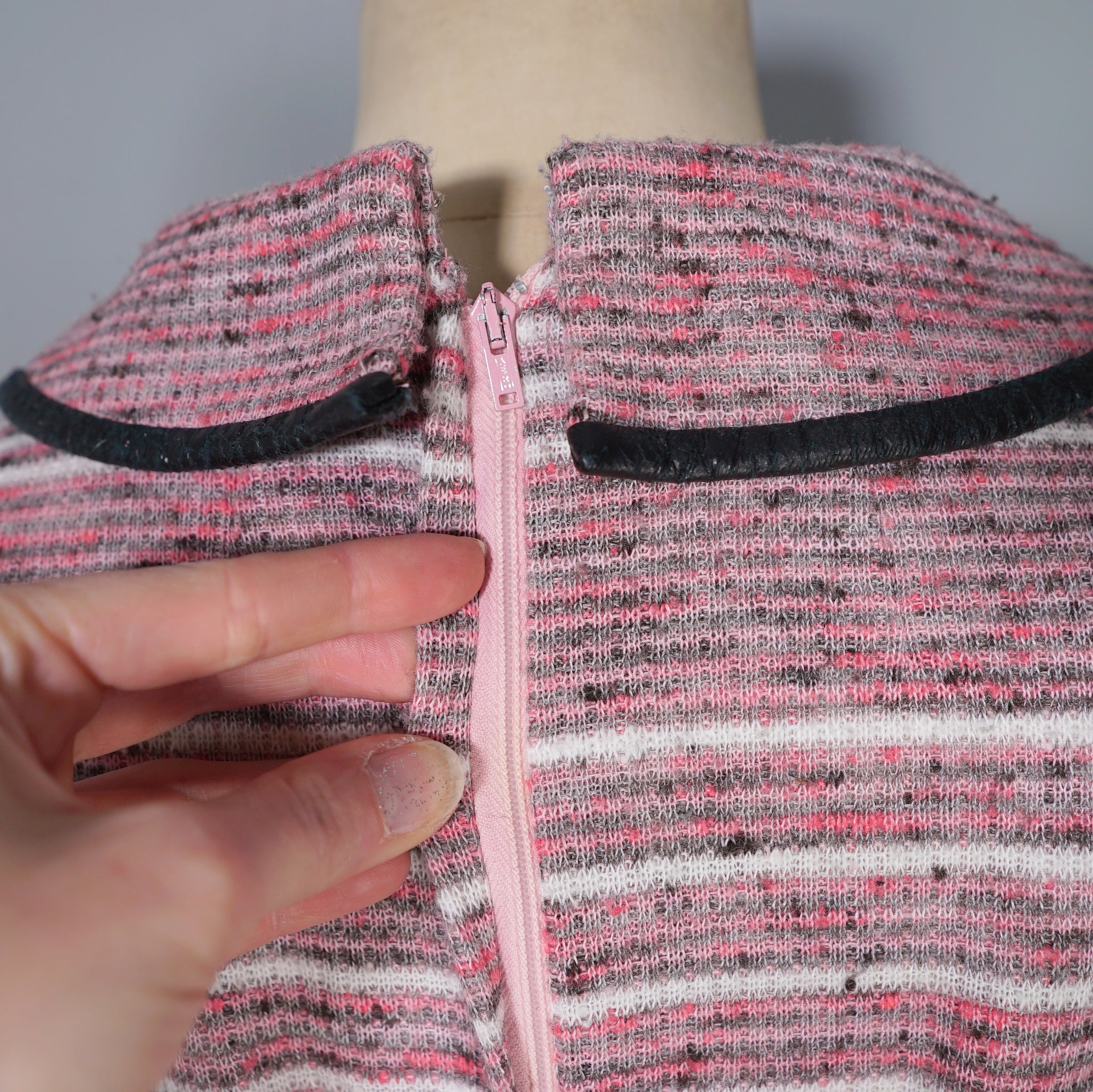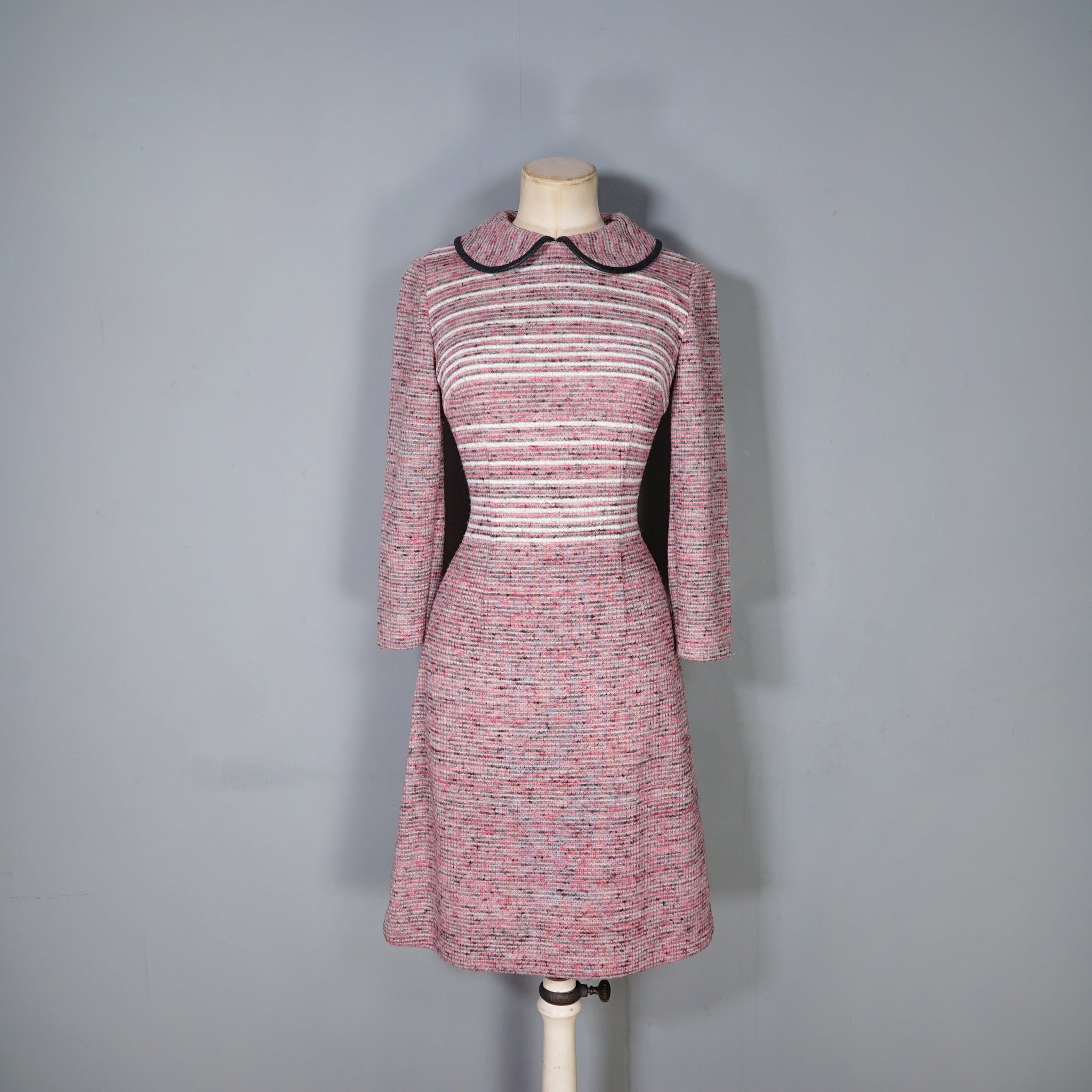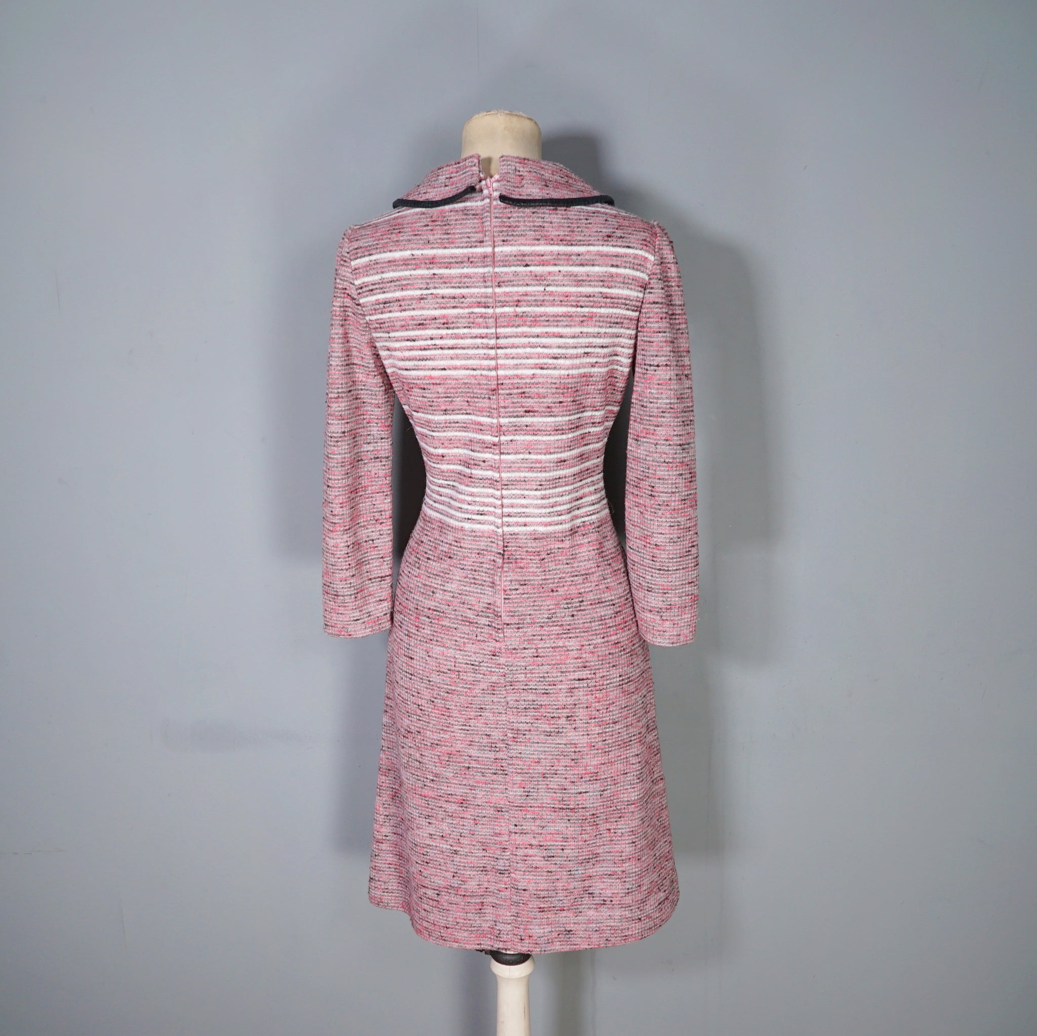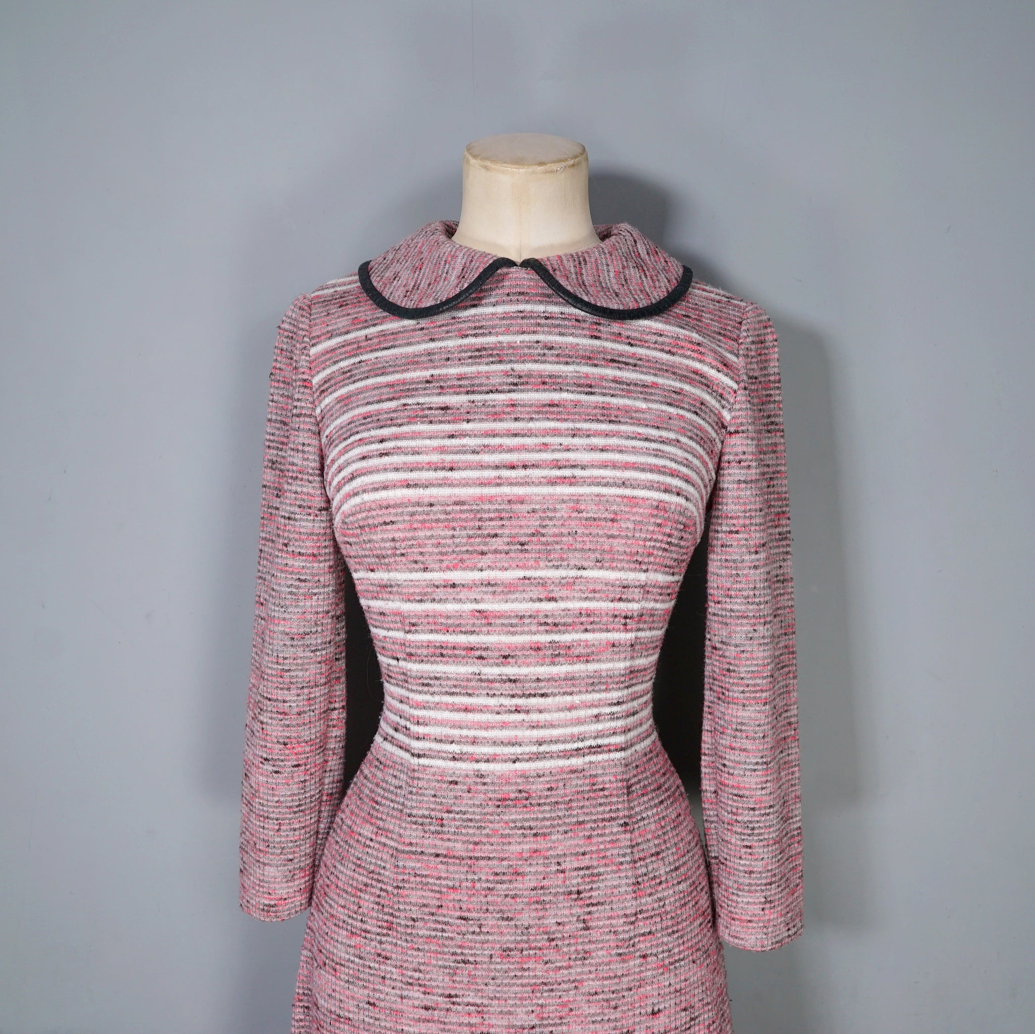 70s Northern Irish made knitted fitted dress by Streilitz. Soft rib knit in a terylene and viscose blend yarn with a slightly slubby texture and soft marled colour of pinks and browns and white stripes. Long slim fitting sleeves. High neck with peter pan collar. Darted silhouette for a fitted design. Unlined. Dress has belt loops but nobelt. Back nylon zip to fasten.