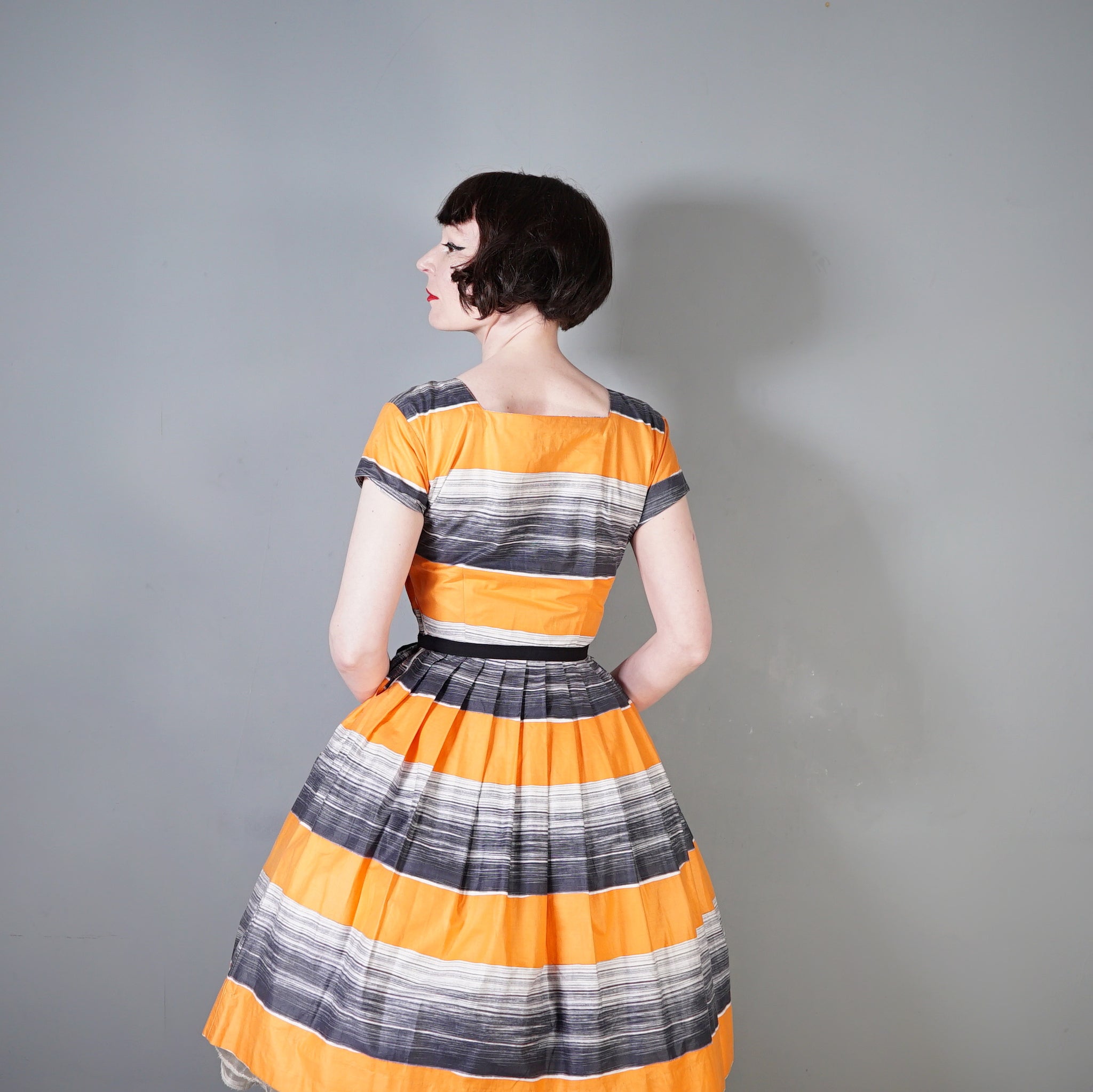 Fun little 50s cotton day dress in a lovely wide stripe design in crisp bright orange and painterly gradiated greys and whites. Fitted bodice with short sleeves and high square neck. Waistline nips in and skirt is sweet and full, sewn in inchwide pleats. Side metal zipper to fasten. No labels, but I think commercially made (with some alterations by previous owner. Really lovely all year round day dress, great colours!