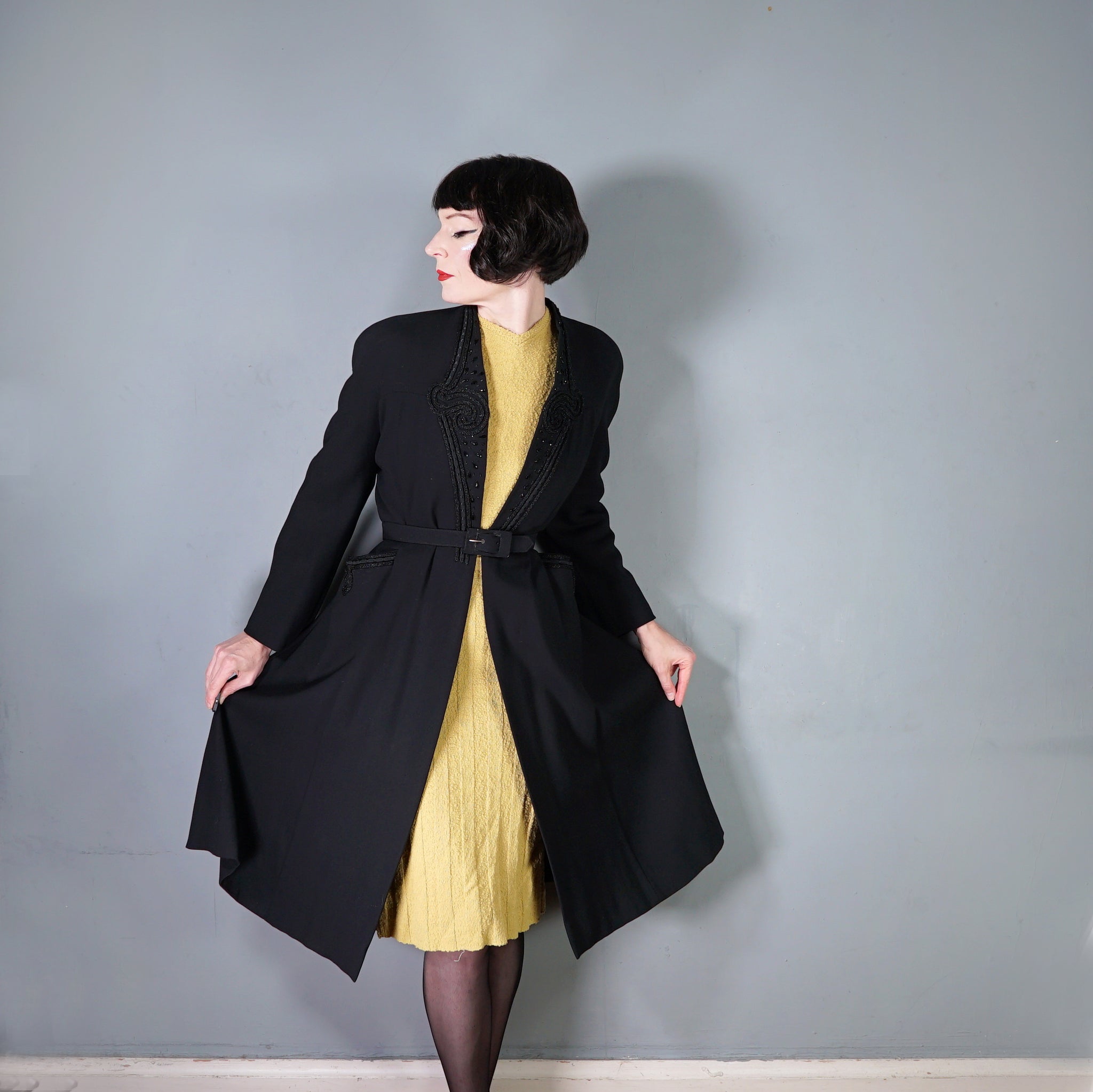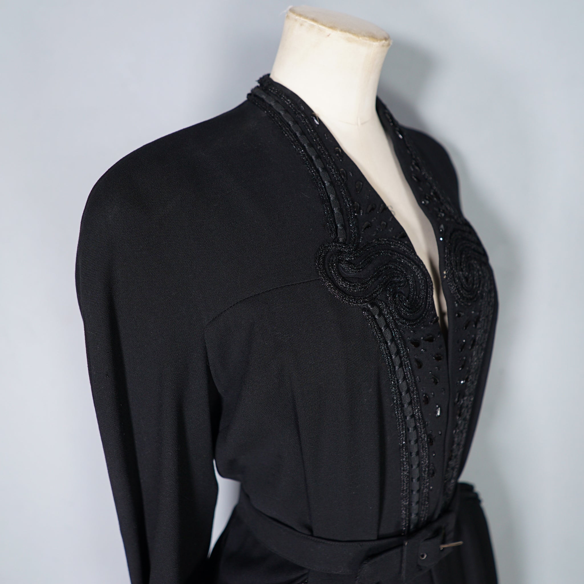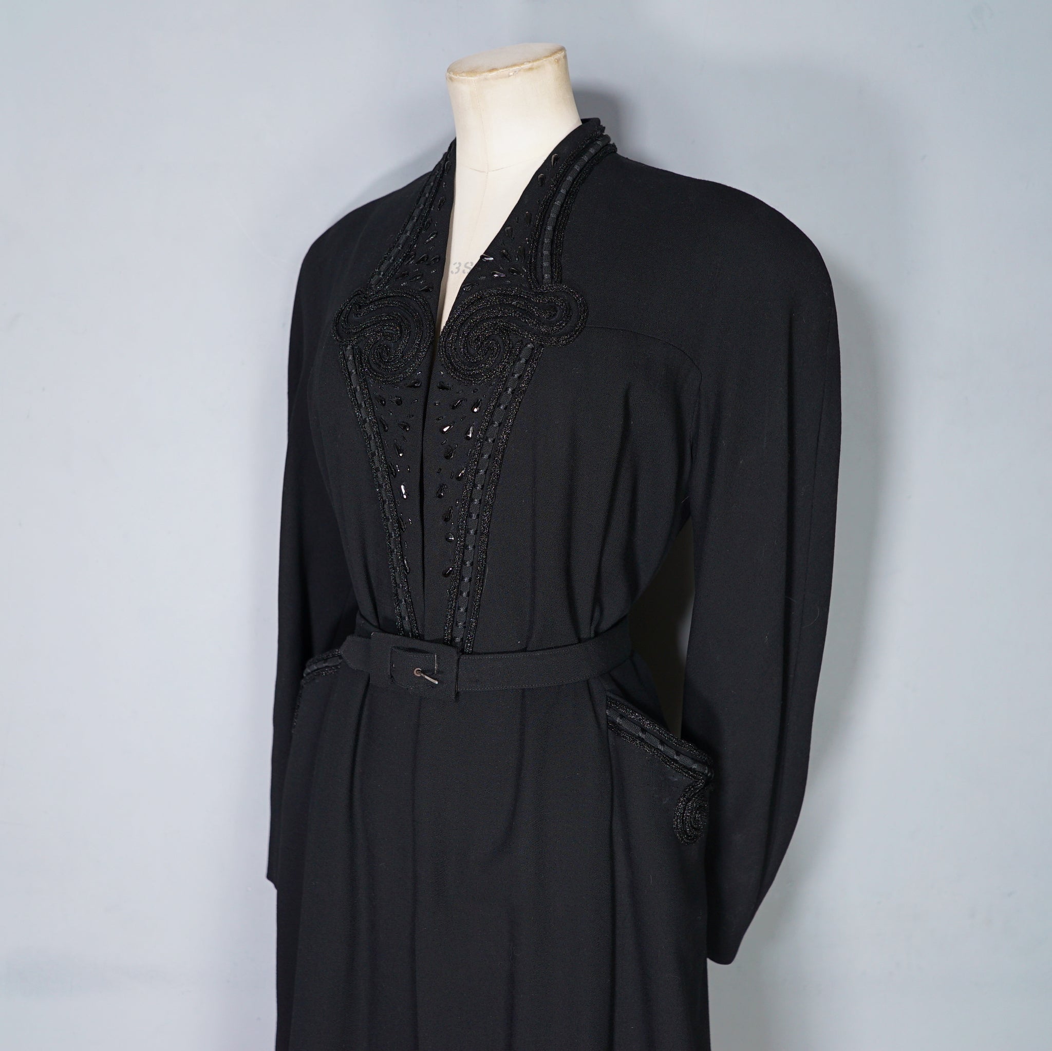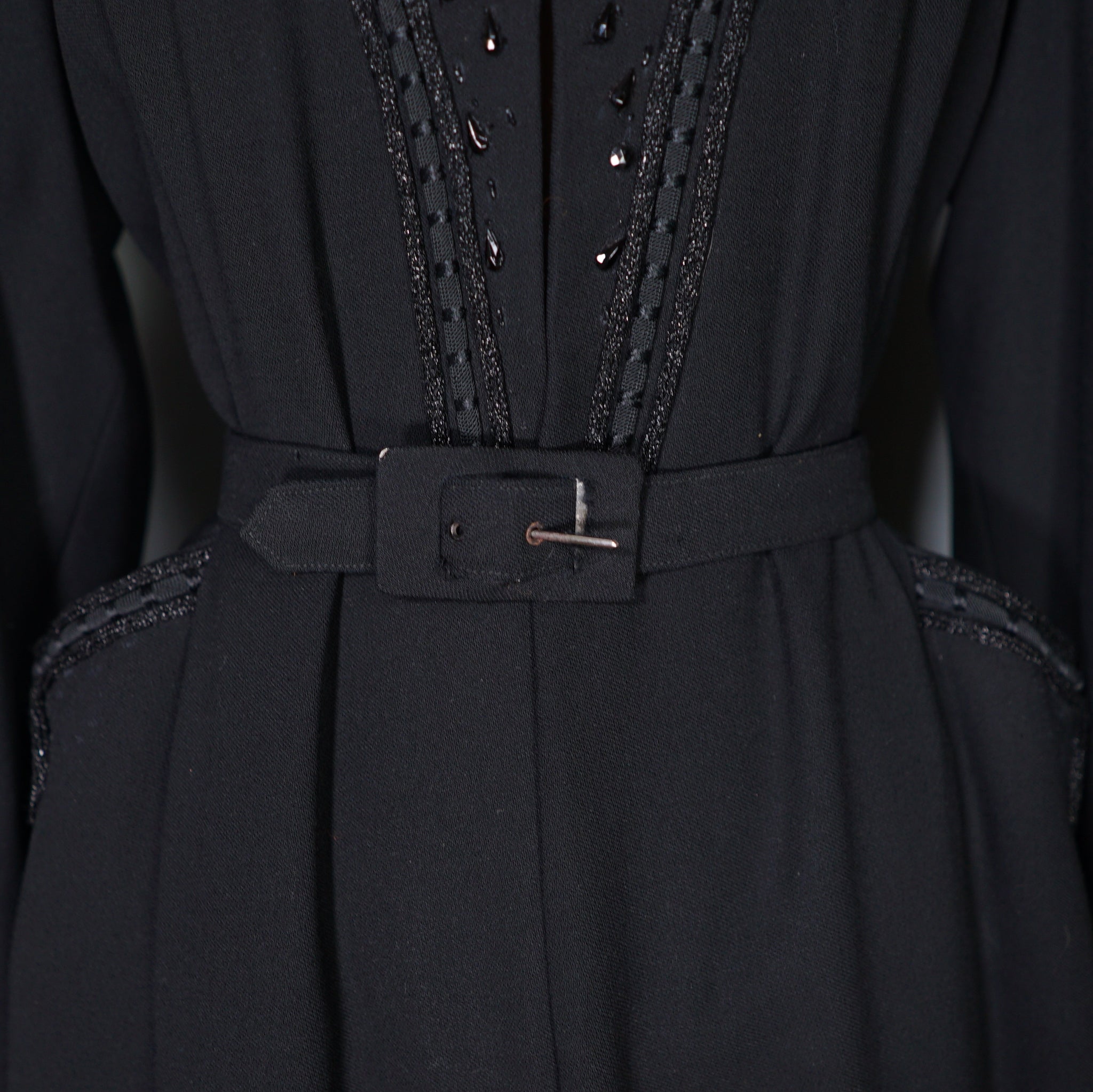 40s Rue de la Paix in fine black wool with lavish embellishments with black glass beads and droplet shaped faceted glass gems as well as swirling shimmering metallic soutach and grosgrain ribbons. Open cut silhoutte with a matching belt to cinch the silhouette in. Long sleeve with padded shoulder. Elegant collarless v-neck with embellished placket and matching design on the hip pockets. Softly flared midi skirt. Fully lined in high quality black satin, hand finished. Makers name is not present, but Rue de Paix was a famous fashion street with a Haute Couture in the early 1900s, the location for House of Worth at no 7 and Jeanne Paquin at no 3, so most likely a high end tailored garment, it's beautifully made.