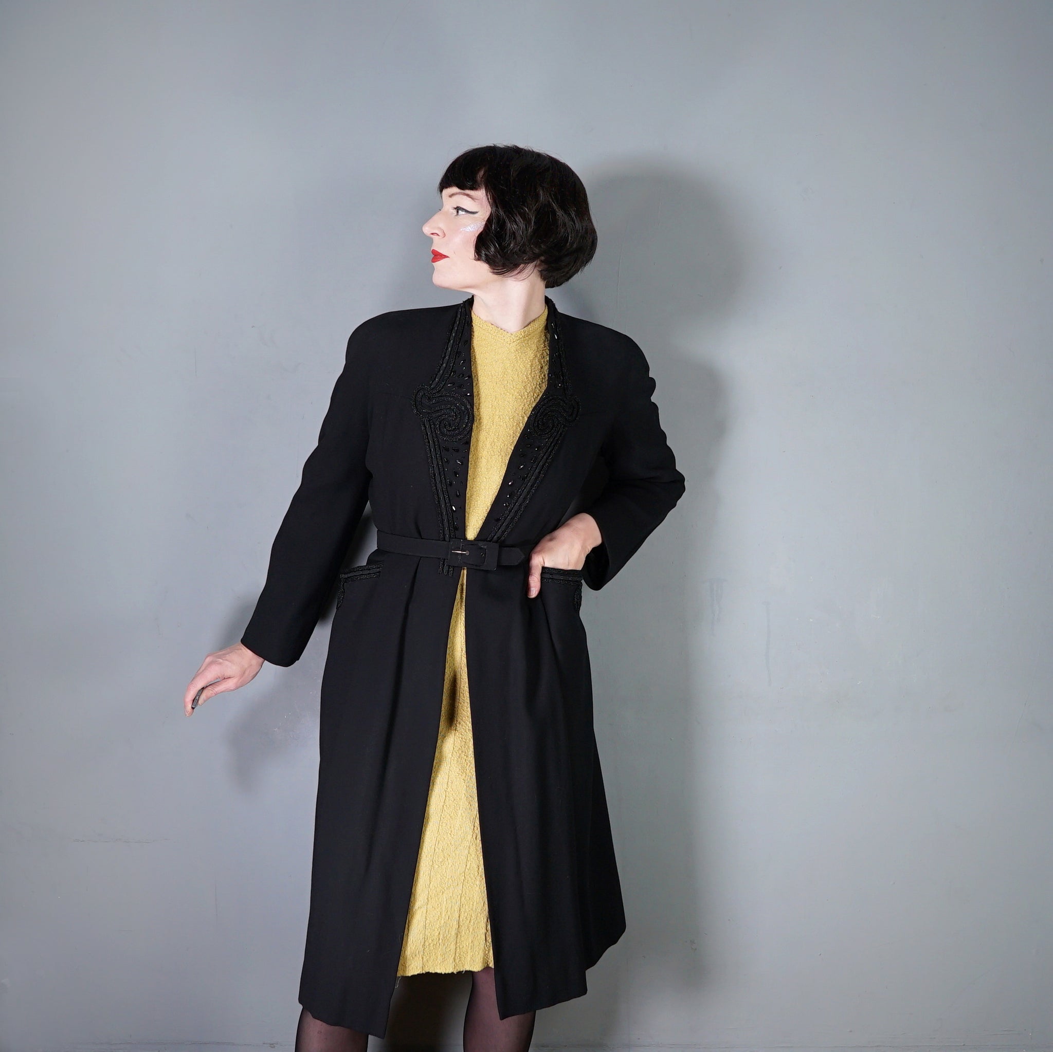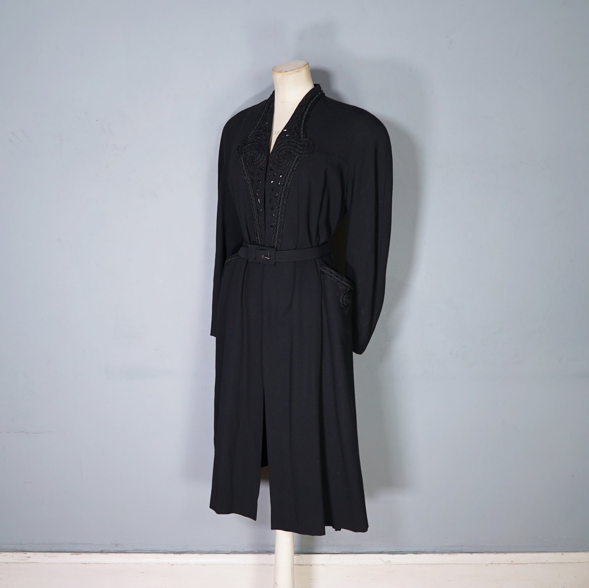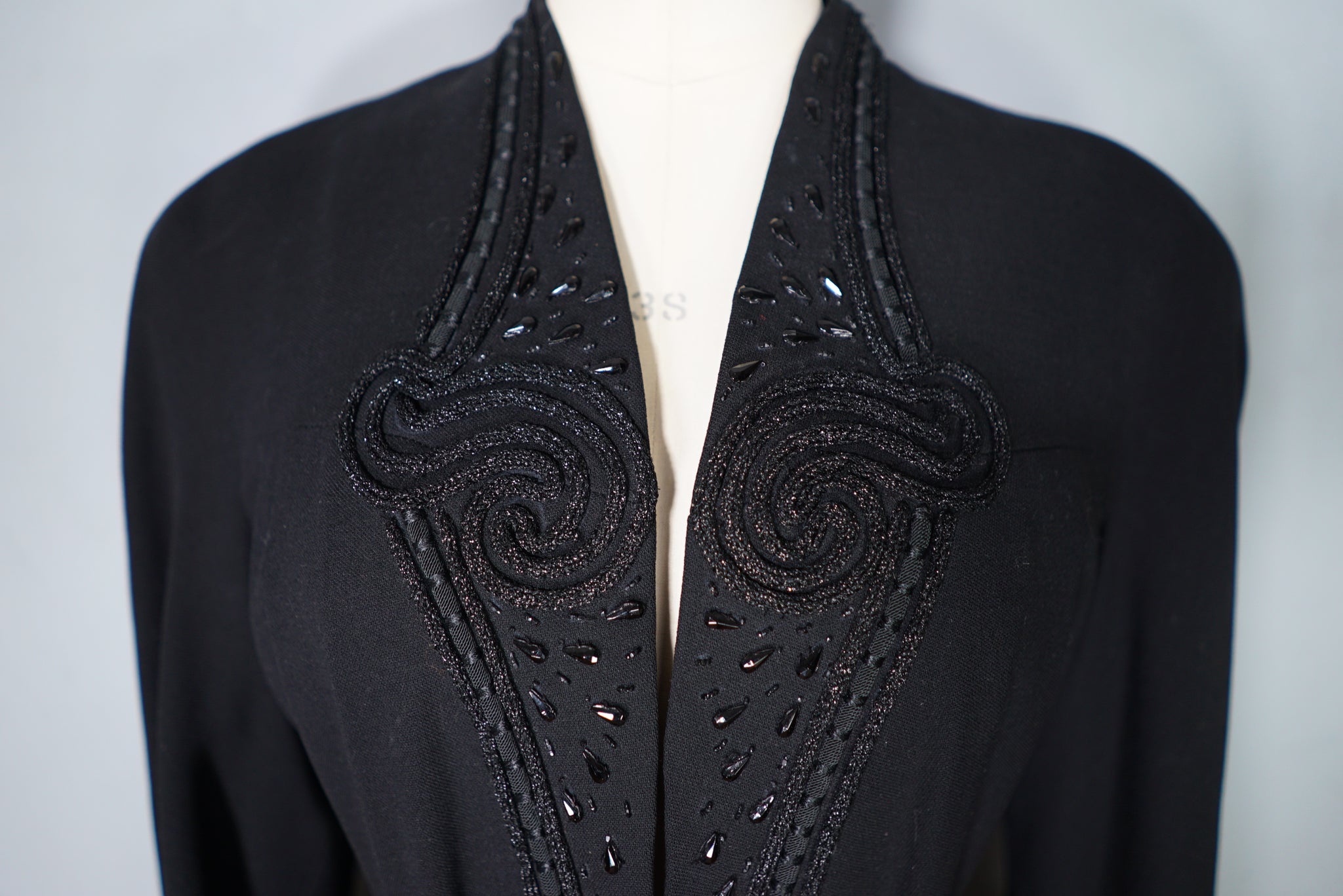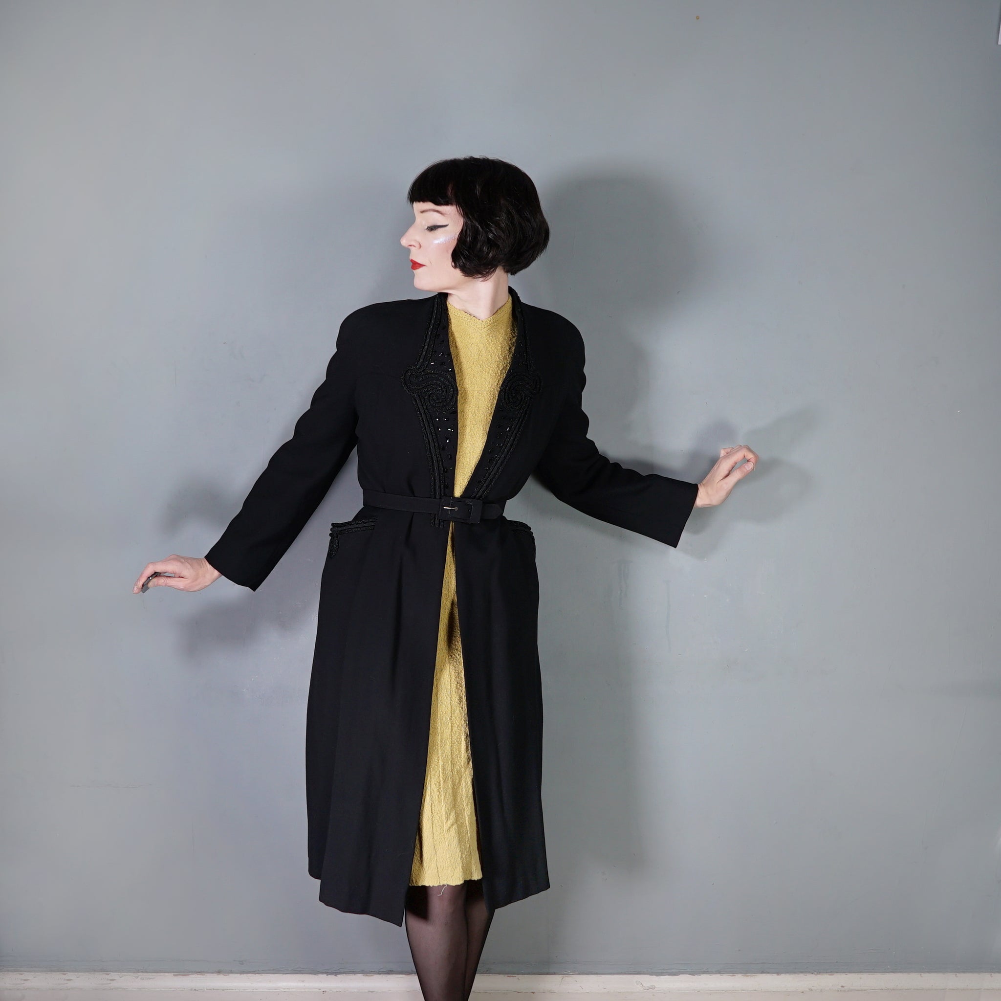 40s Rue de la Paix in fine black wool with lavish embellishments with black glass beads and droplet shaped faceted glass gems as well as swirling shimmering metallic soutach and grosgrain ribbons. Open cut silhoutte with a matching belt to cinch the silhouette in. Long sleeve with padded shoulder. Elegant collarless v-neck with embellished placket and matching design on the hip pockets. Softly flared midi skirt. Fully lined in high quality black satin, hand finished. Makers name is not present, but Rue de Paix was a famous fashion street with a Haute Couture in the early 1900s, the location for House of Worth at no 7 and Jeanne Paquin at no 3, so most likely a high end tailored garment, it's beautifully made.
