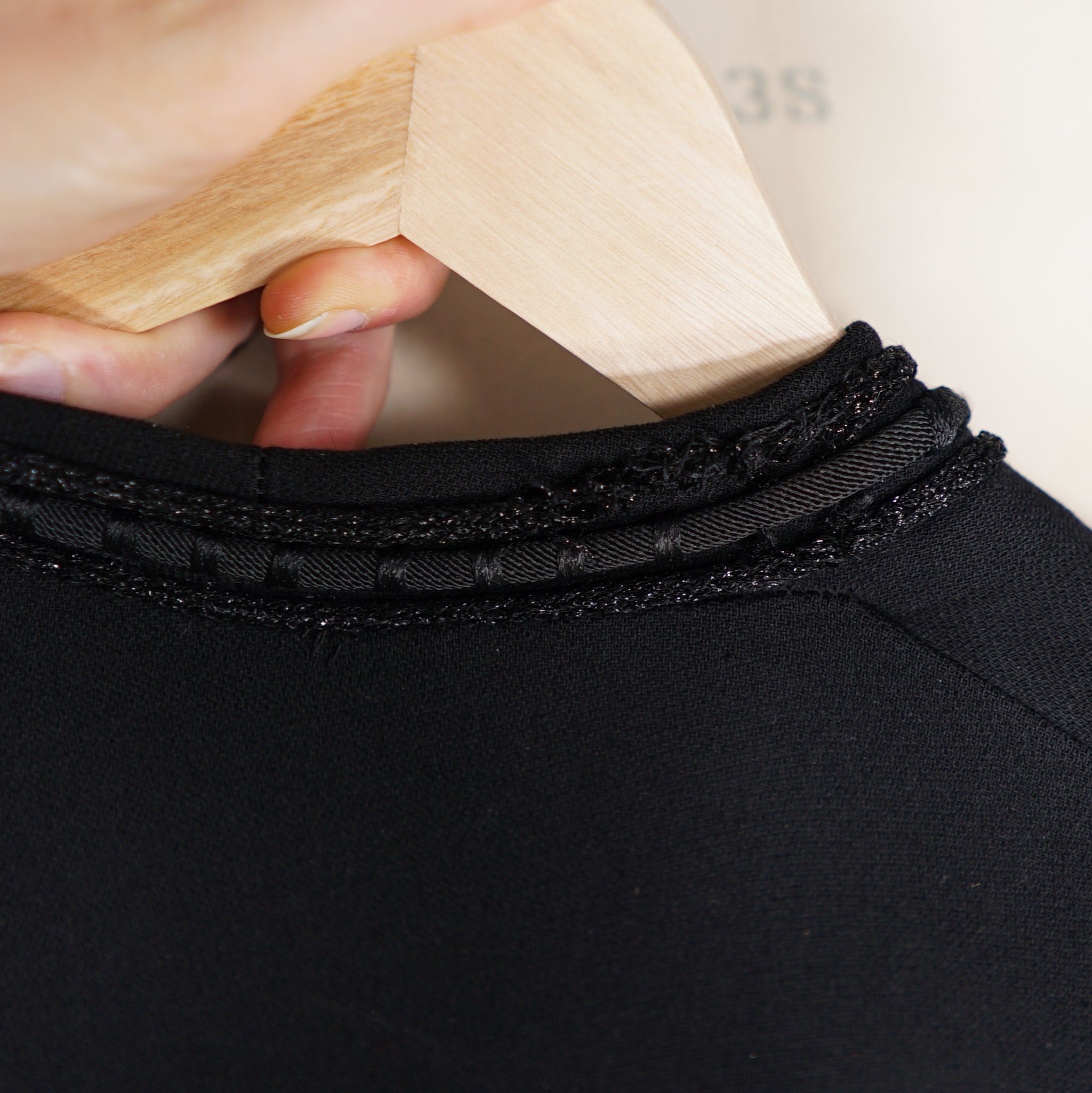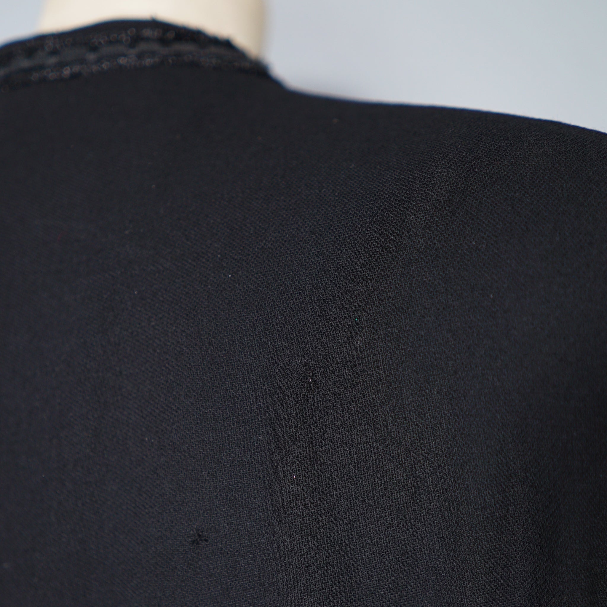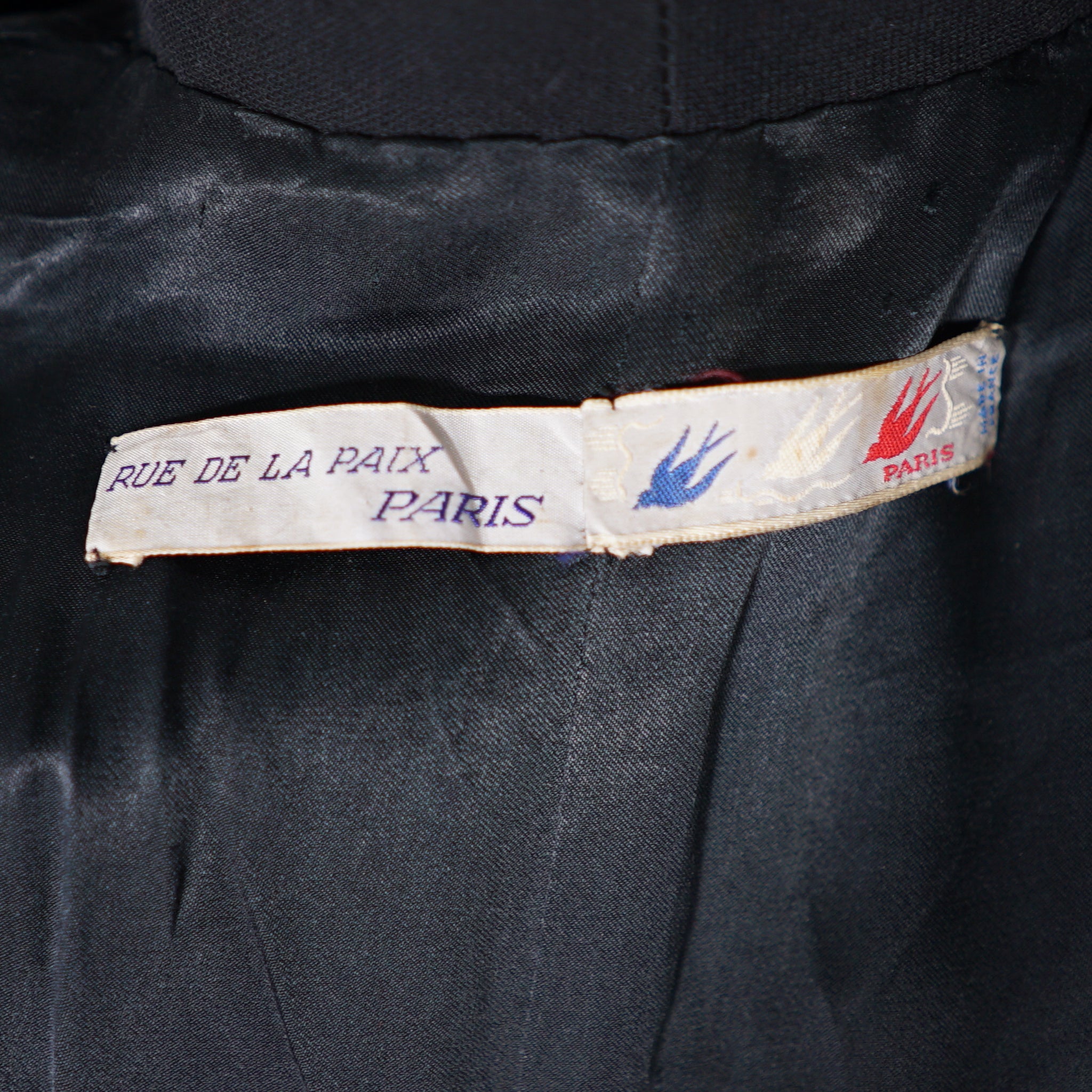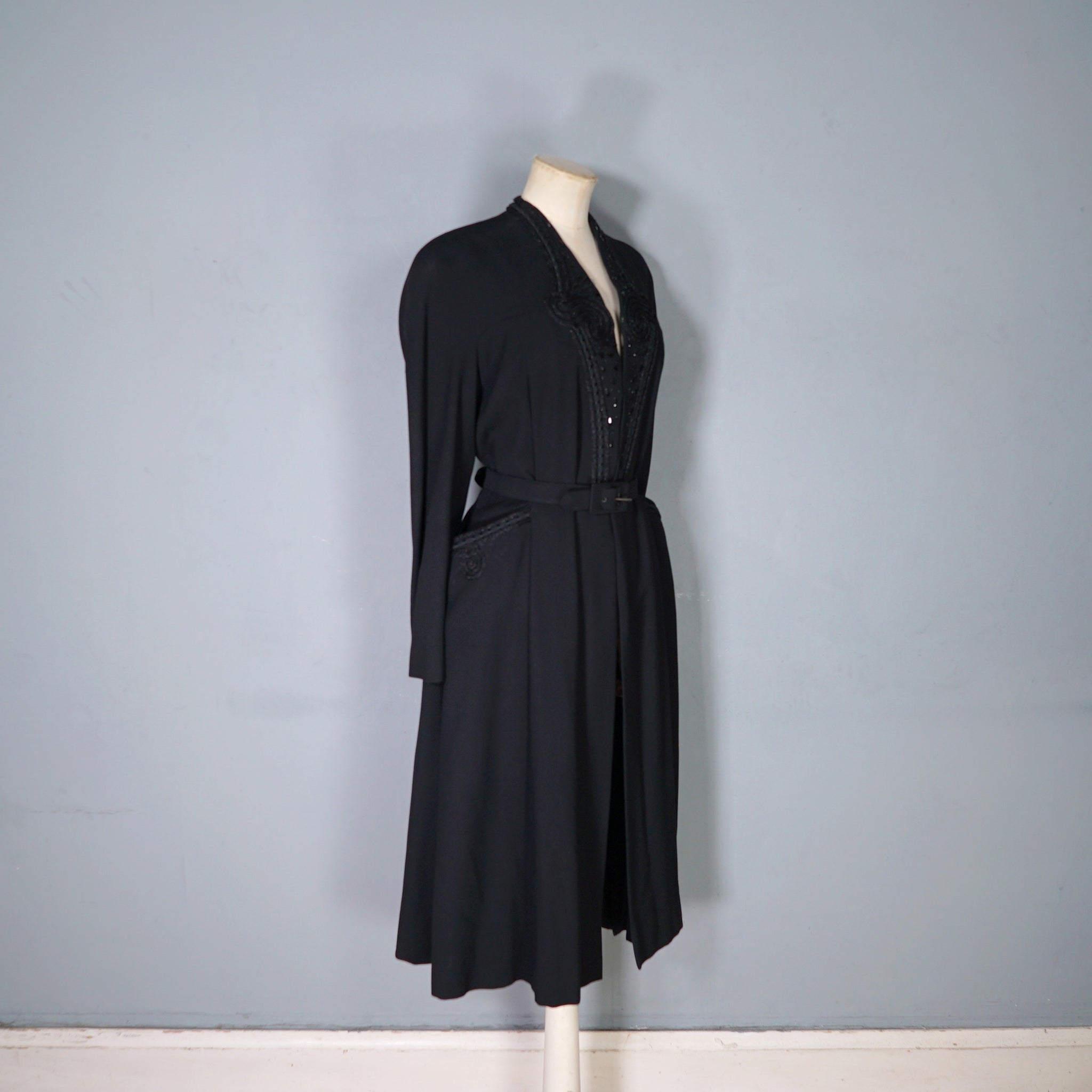 40s Rue de la Paix in fine black wool with lavish embellishments with black glass beads and droplet shaped faceted glass gems as well as swirling shimmering metallic soutach and grosgrain ribbons. Open cut silhoutte with a matching belt to cinch the silhouette in. Long sleeve with padded shoulder. Elegant collarless v-neck with embellished placket and matching design on the hip pockets. Softly flared midi skirt. Fully lined in high quality black satin, hand finished. Makers name is not present, but Rue de Paix was a famous fashion street with a Haute Couture in the early 1900s, the location for House of Worth at no 7 and Jeanne Paquin at no 3, so most likely a high end tailored garment, it's beautifully made.