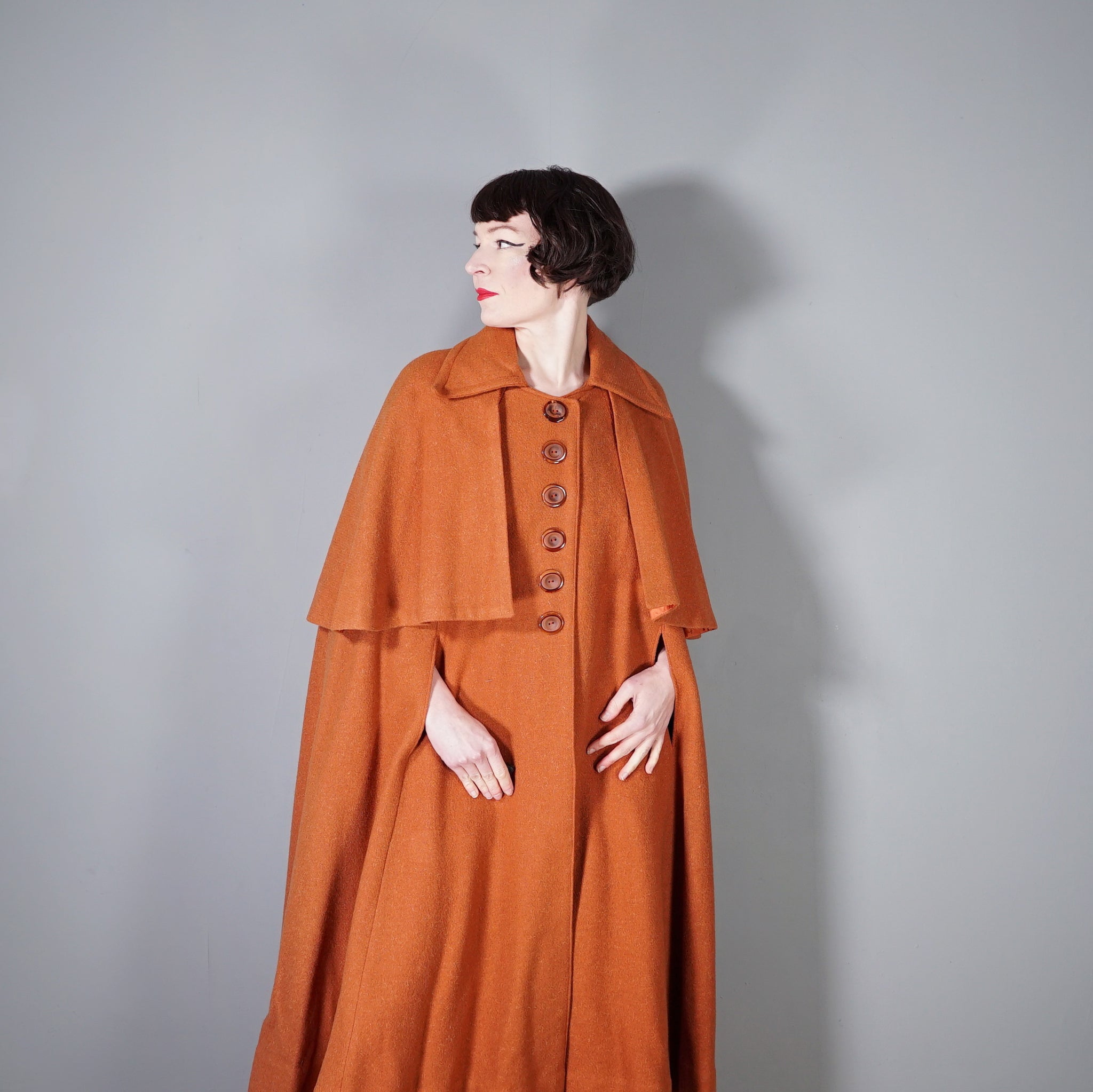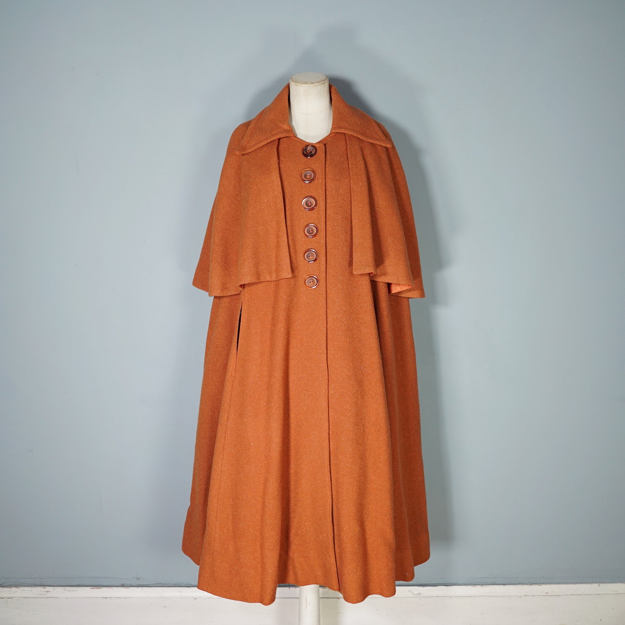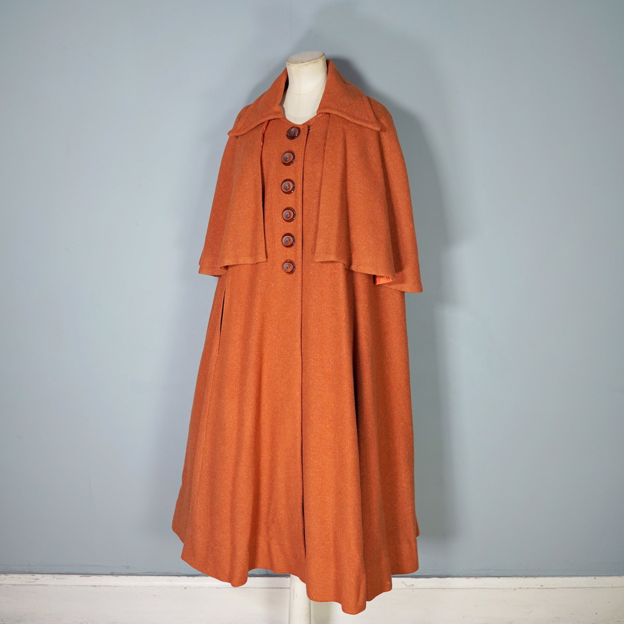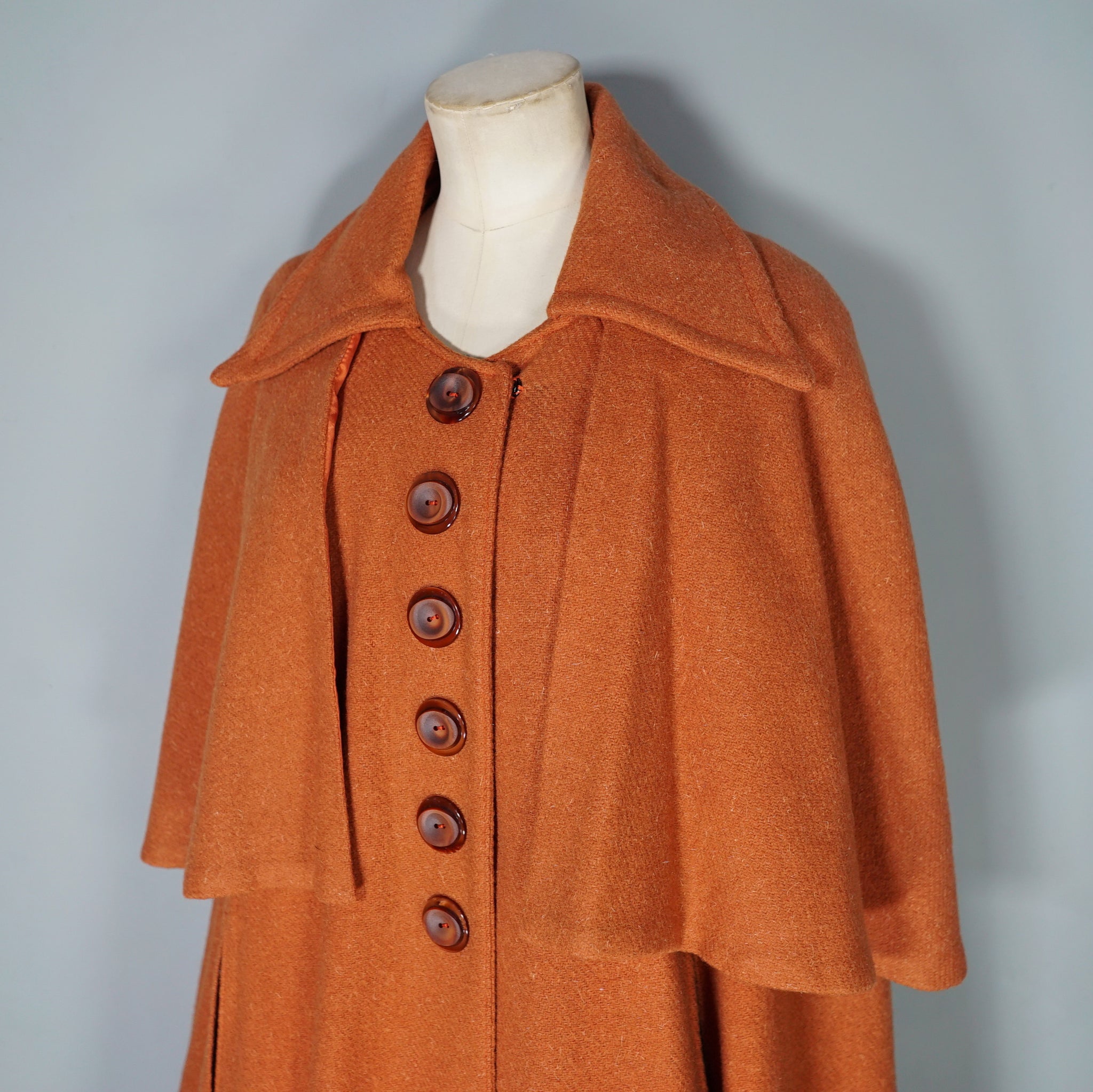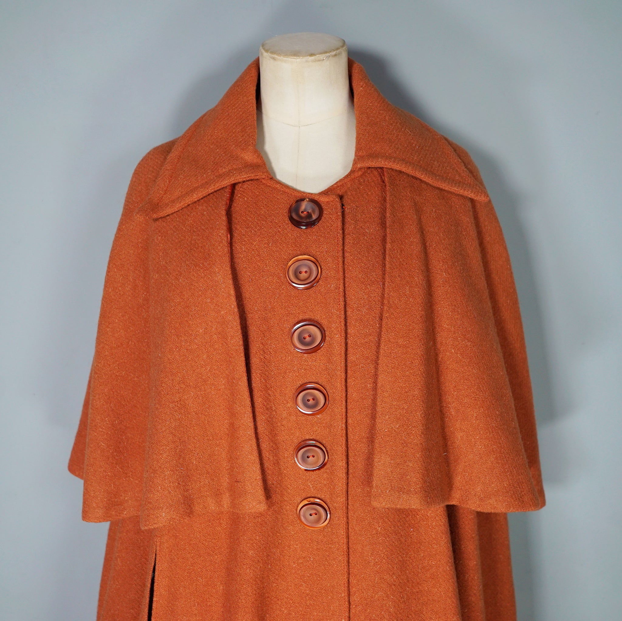 Beautiful handmade 40s / 70s style cape coat in a really goregeous rich rust colour wool tweed. Midi length with a great full sweep and slot holes for the arms to go through. Decorative chunky buttons to the chest with hidden popper fasteners underneath. Rounded neck with big pointed collar. Additional tiered cape design to the shoulders which attaches with popper, so could be removed if desired. Lined in a silky matching colour acetate. Great design, and so well made, lining is neatly handsewn in. No labels.