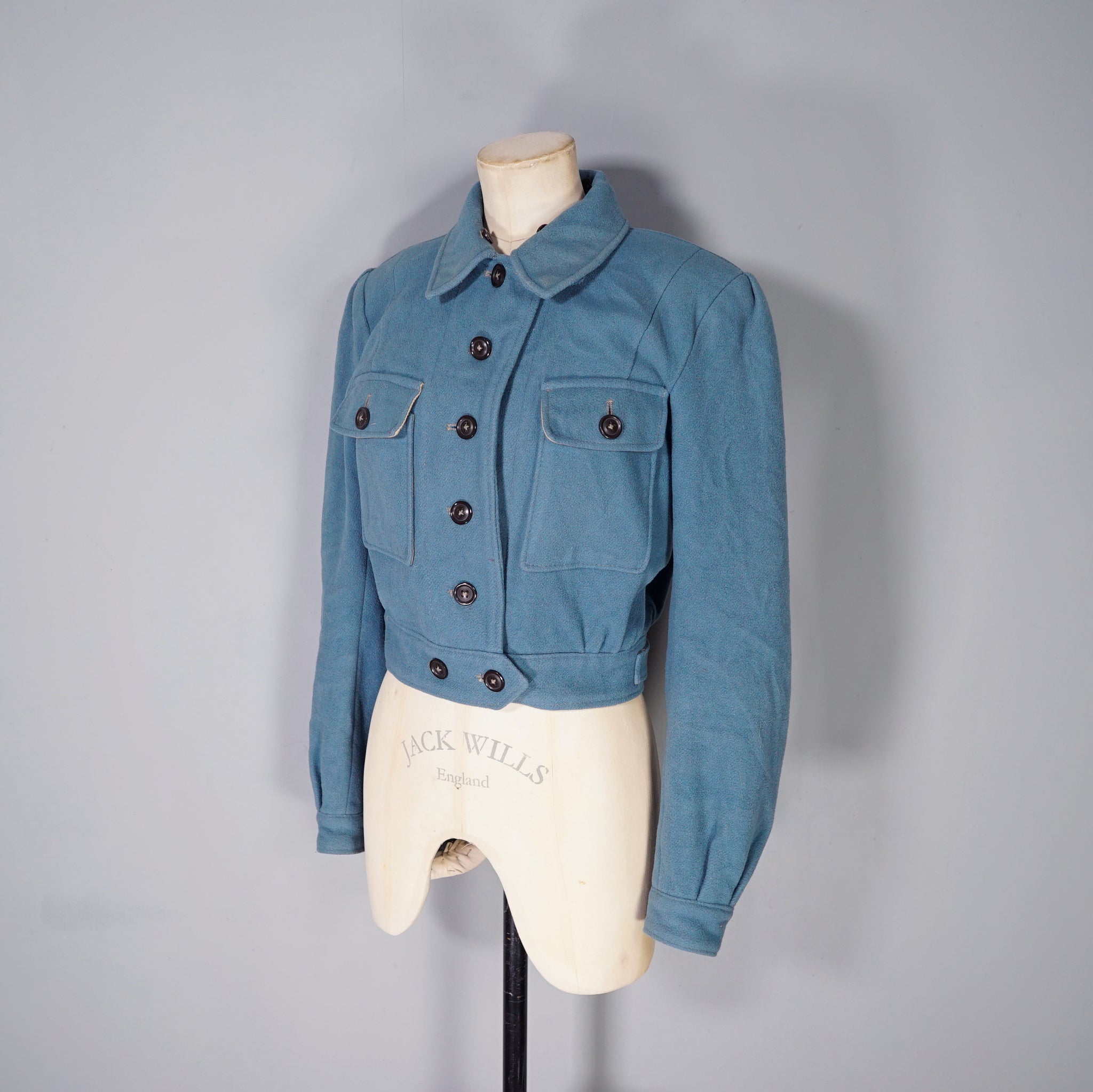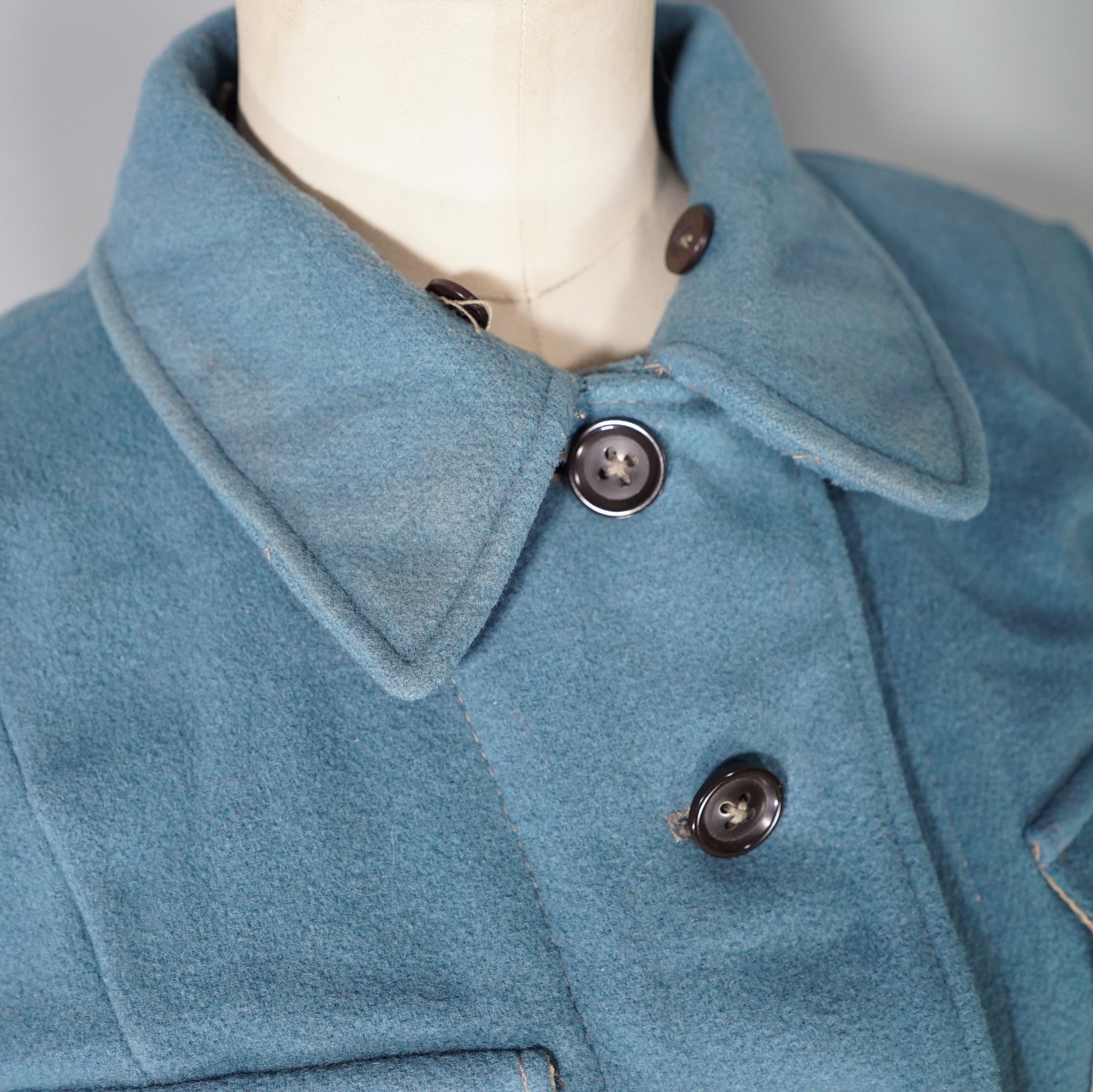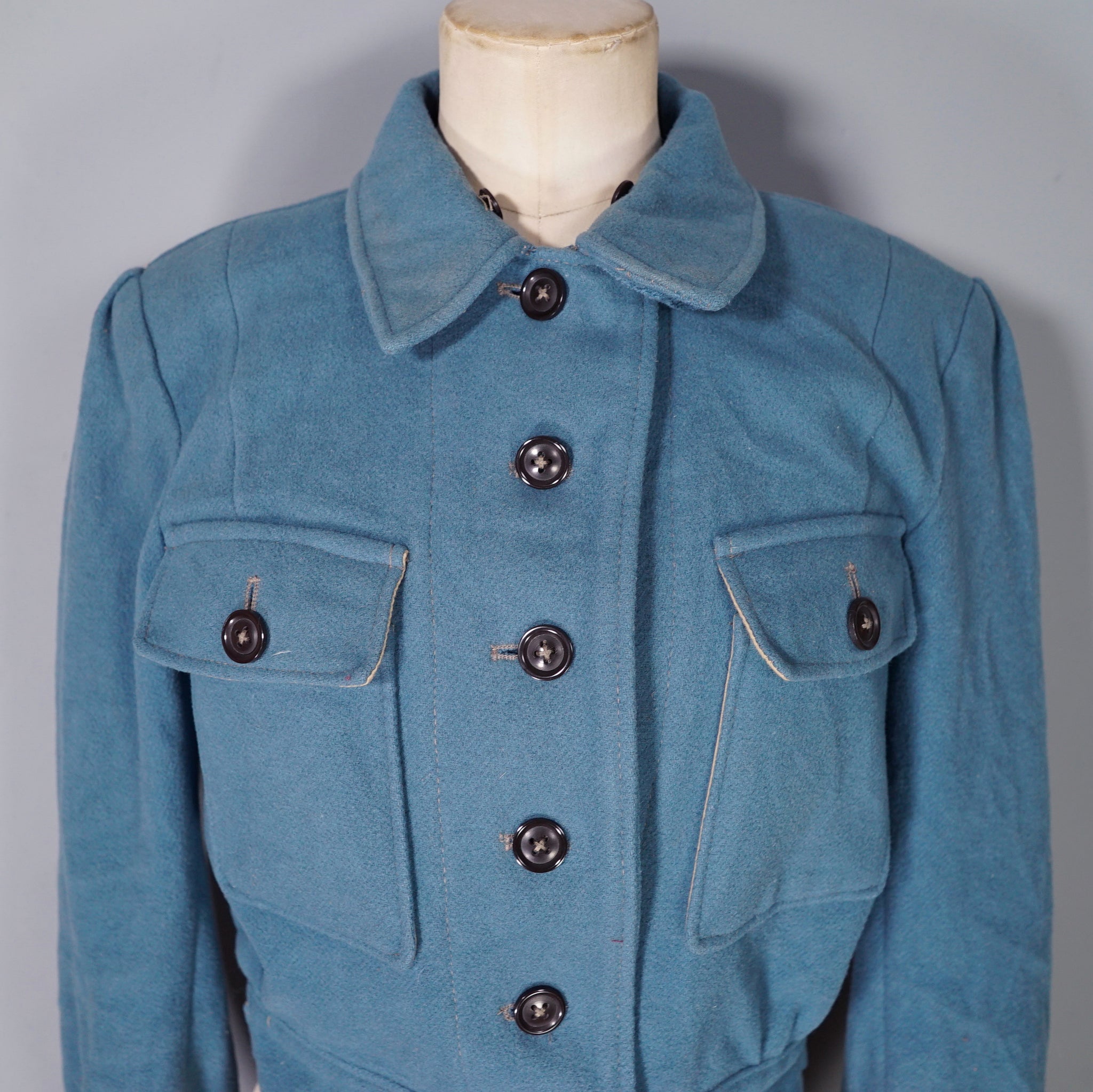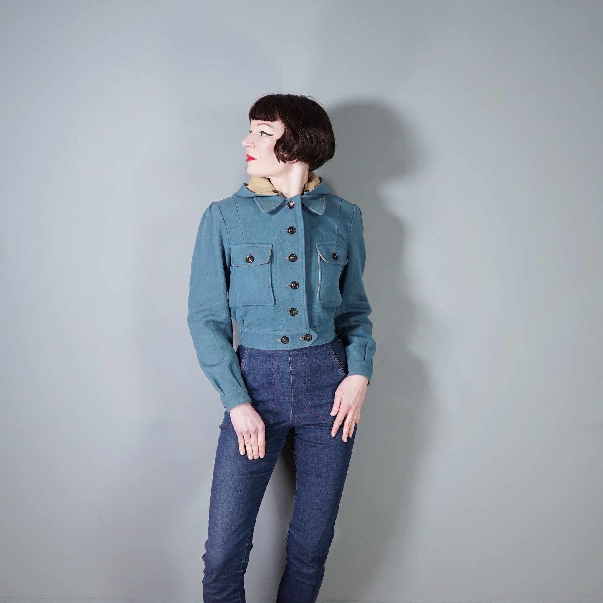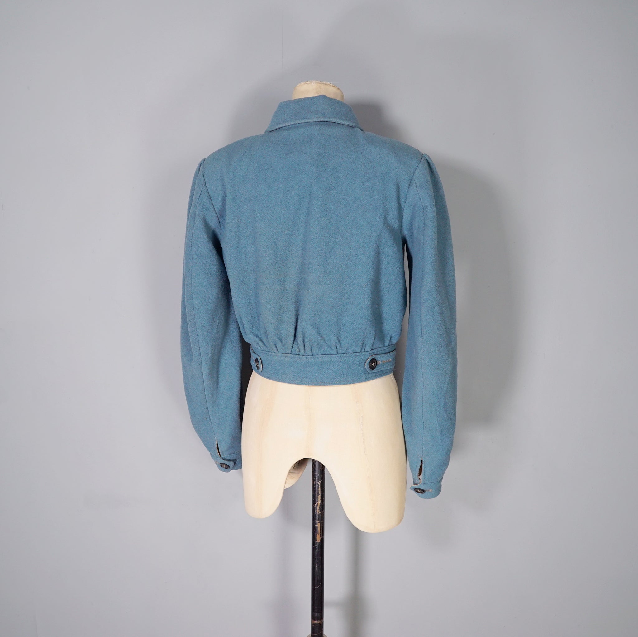 Beautiful tailored cropped ski jacket, no label but looks like this has been expertly made to a vintage pattern, vintage reproduction tailoring at the best, the choice of fabric and features are almost indistinguishable from the real thing. Cropped waistlength with buttoned straps to the side seams of the waist. Boxy fit with small waist gathers to the waistband. Big buttoned patch pockets on the chest. Single breasted fit with six buttons to the chest. Long slightly loose fitting sleeve with lightly padded shoulder and tight buttoned cuffs. Shoulder has a slightly puffed pleat to the top and a nice strong silhouette. Collared neck with the option to wear with the matching pointed hood which can be buttoned on inside the collar. Lined in a rustic brown khaki light soft cotton. This is absolutely beautiful and such a wonderful warera shade of dusky blue.