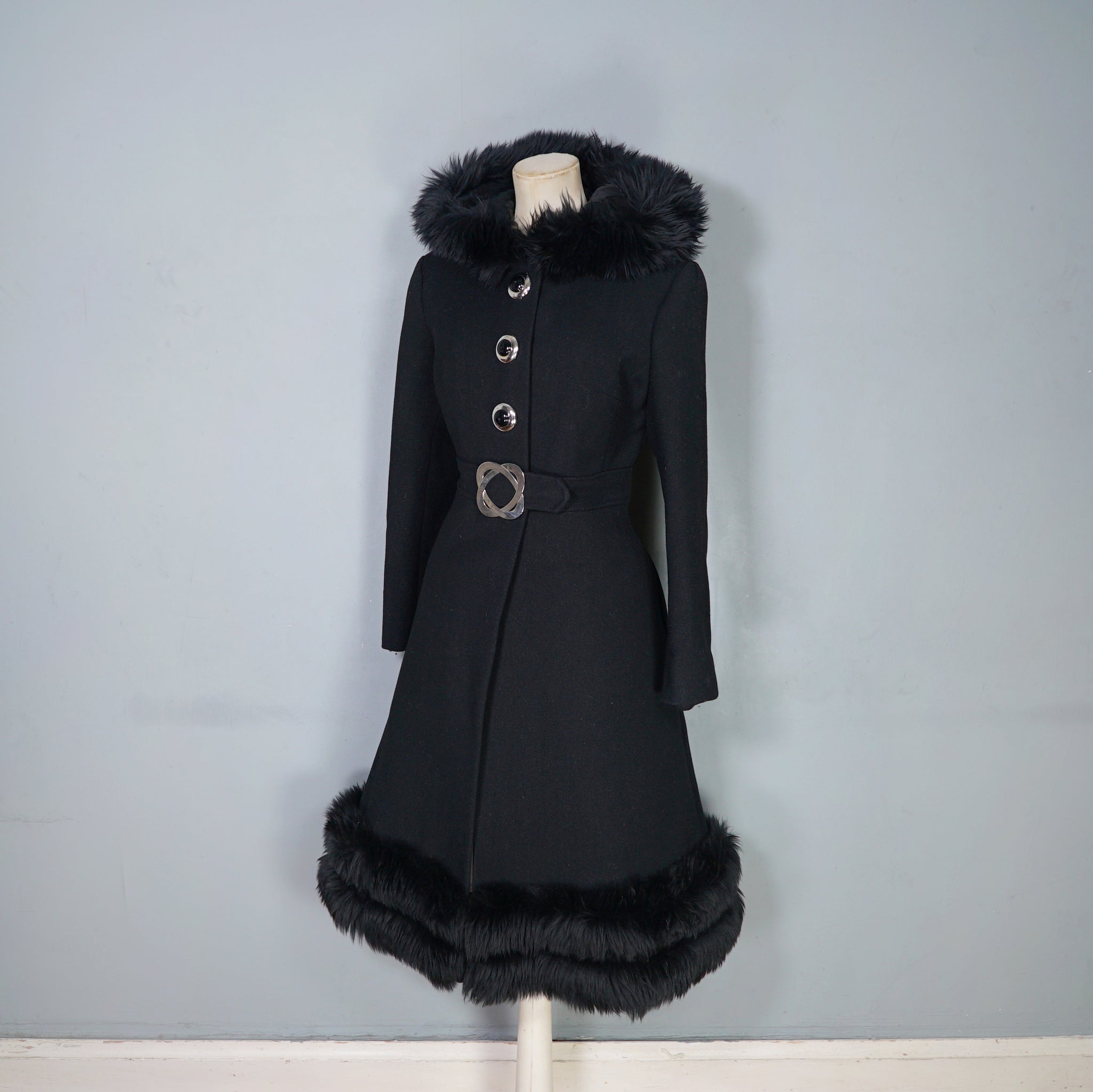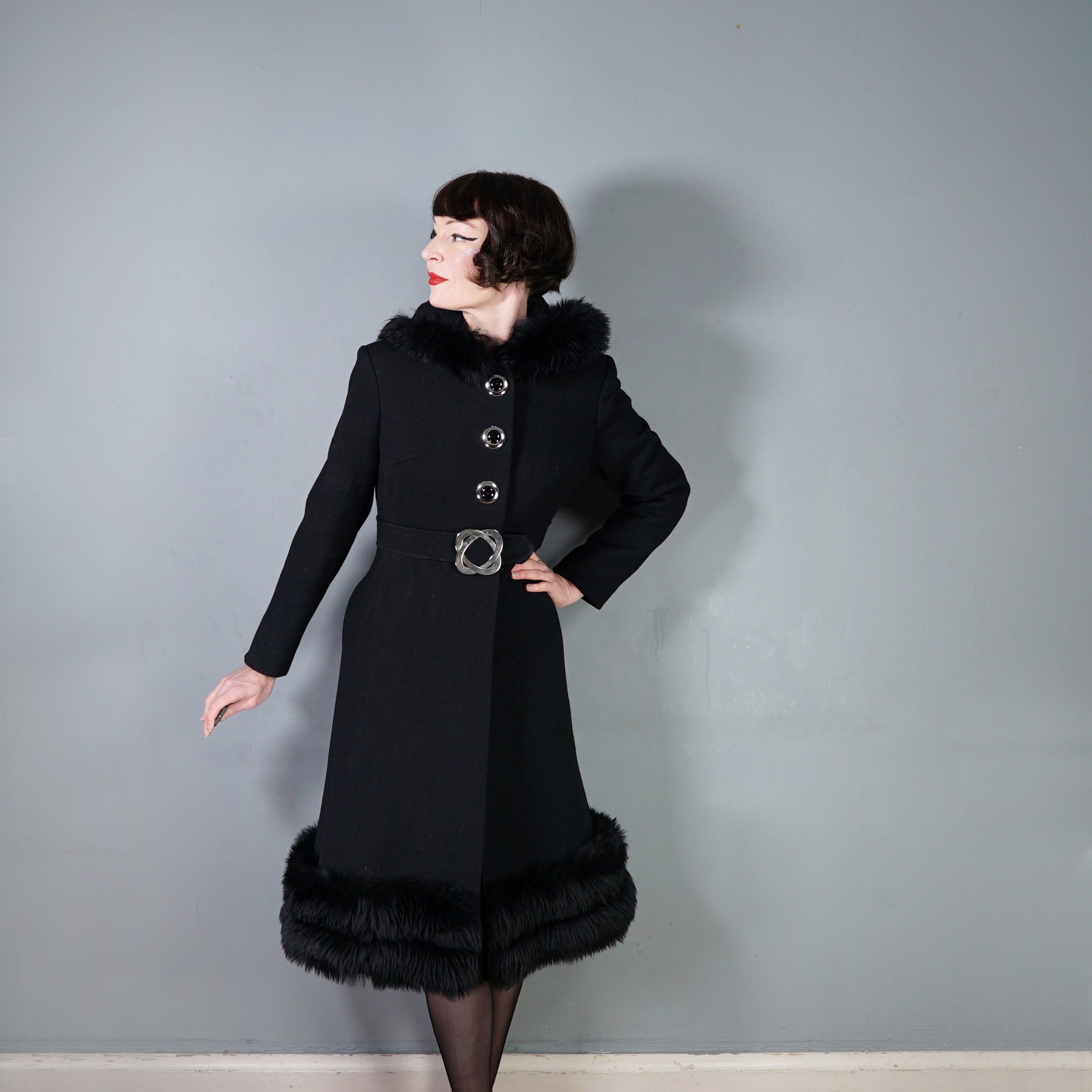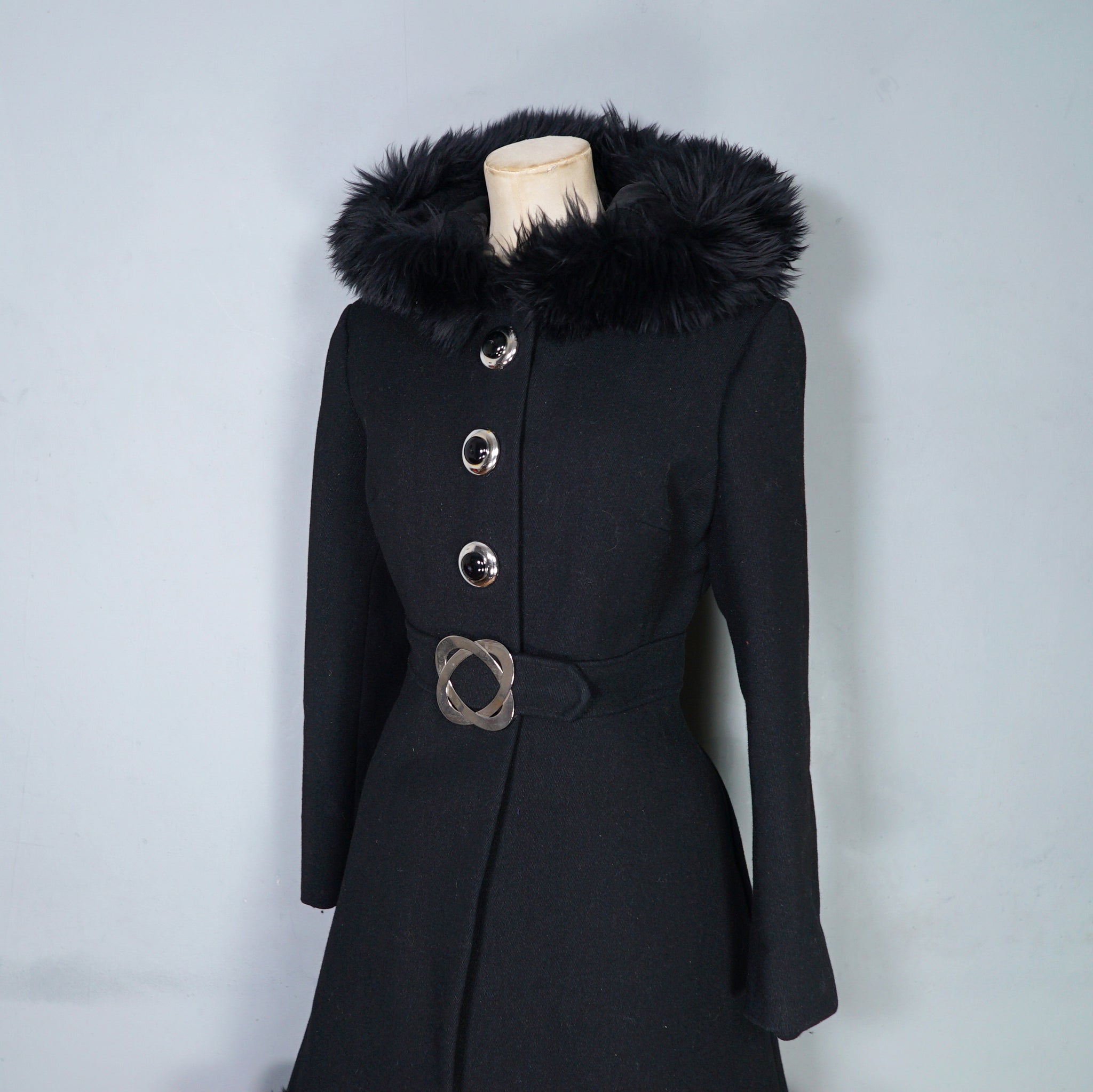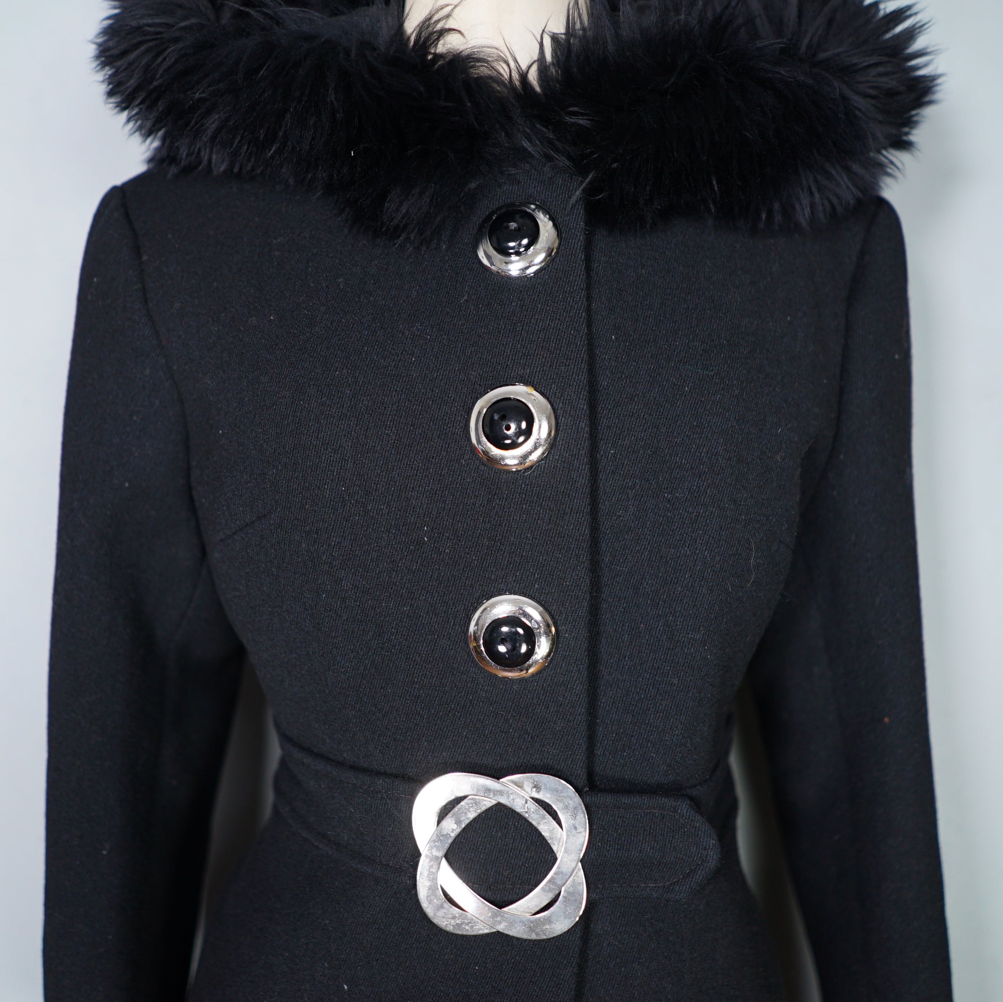 Lovely 60s showstopper coat by Sidwall. Made in London. Black, fairly thick, wool with a tiered sheepskin trim to the hem and matching trim to the hooded neck. Elegant silhoutte with a softly a-lined skirt and fitted long sleeves and bodice with a wide waistband with a snap buttoned strap and a big decorative celtic buckle. Front fasten with three conceled chunky popper buttons and have three large black and silver huge statement buttons on the top of the front. Hooded neck. Slot pockets on the hip. Fully lined in black synthetic.