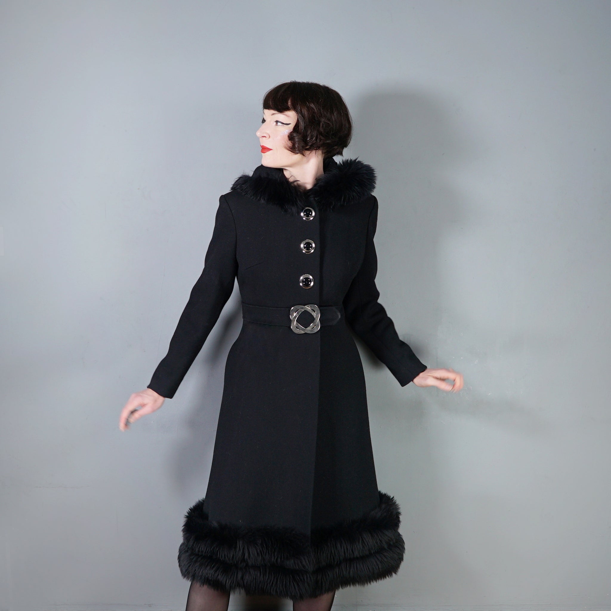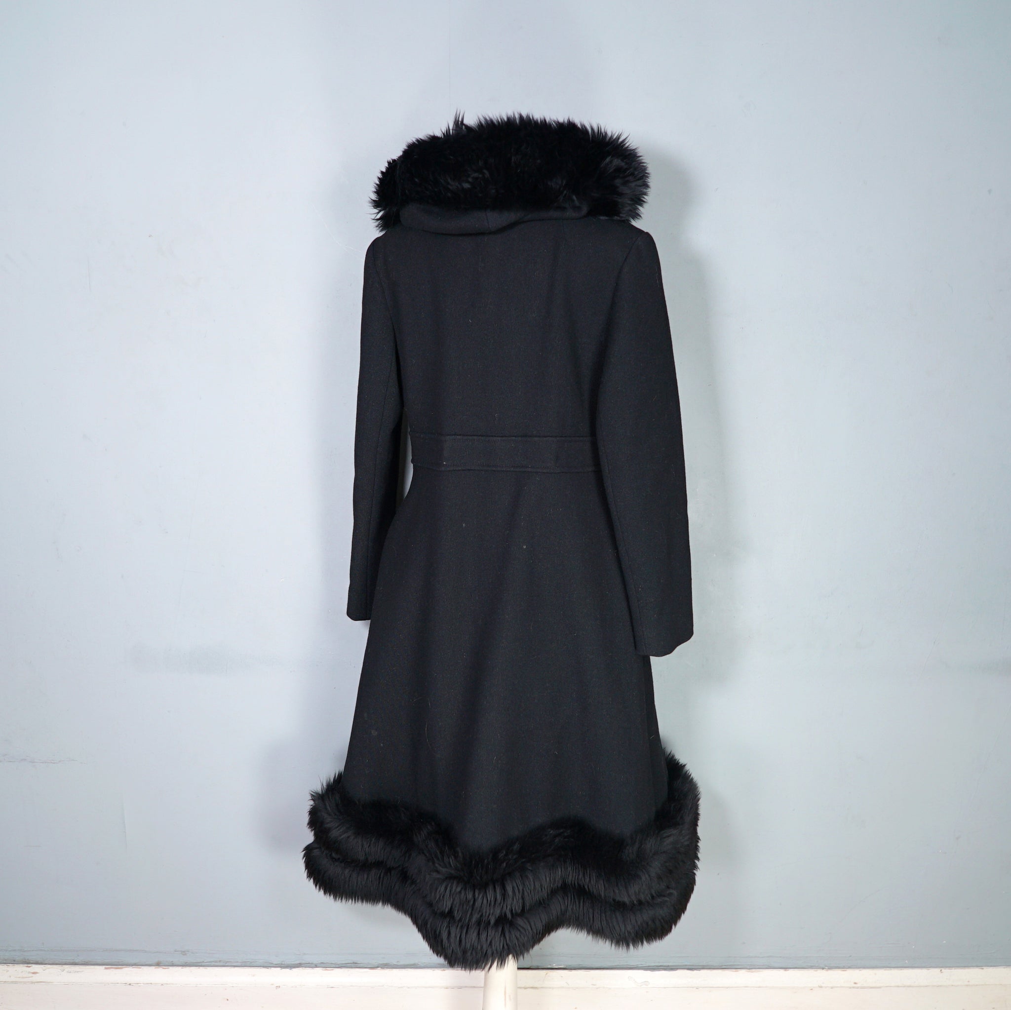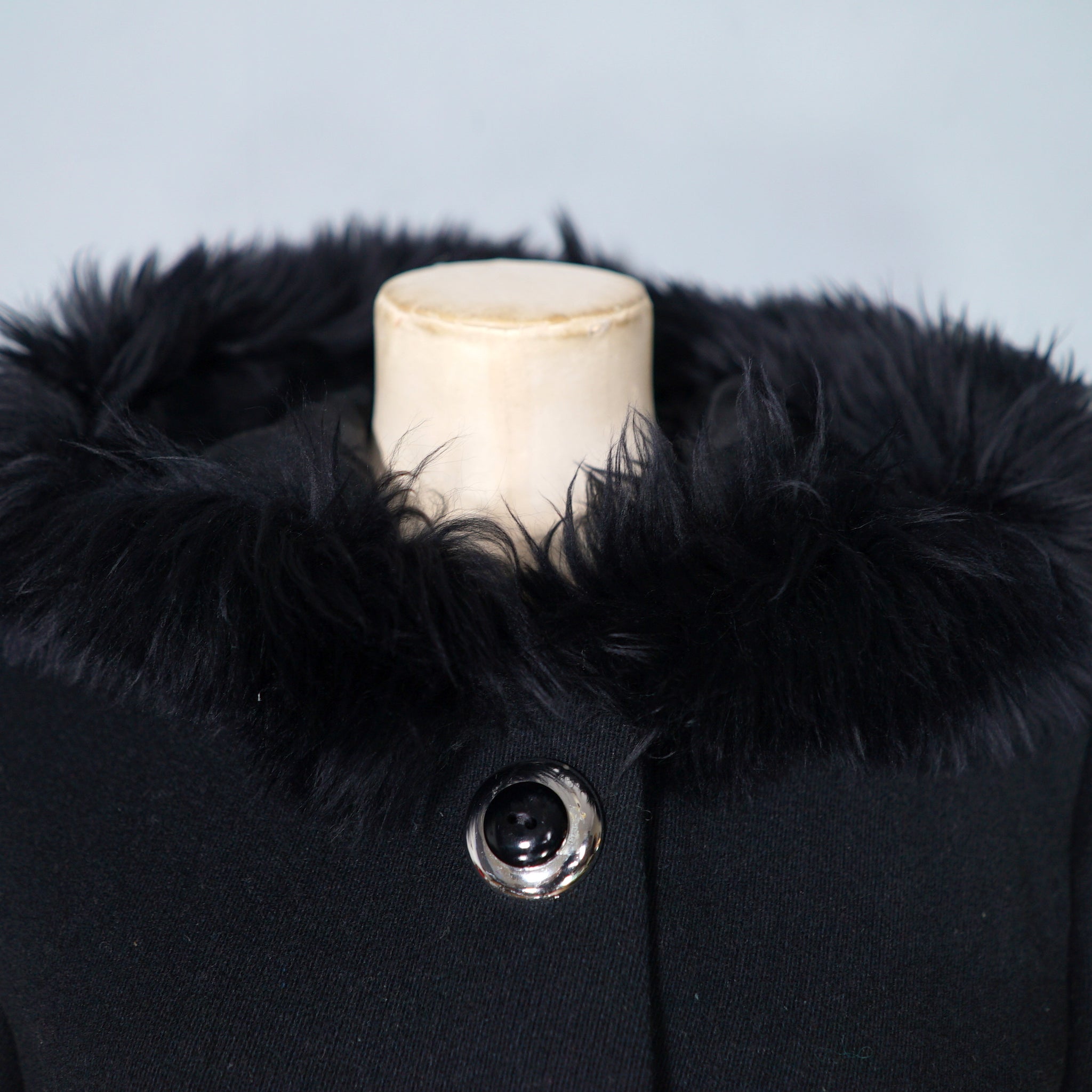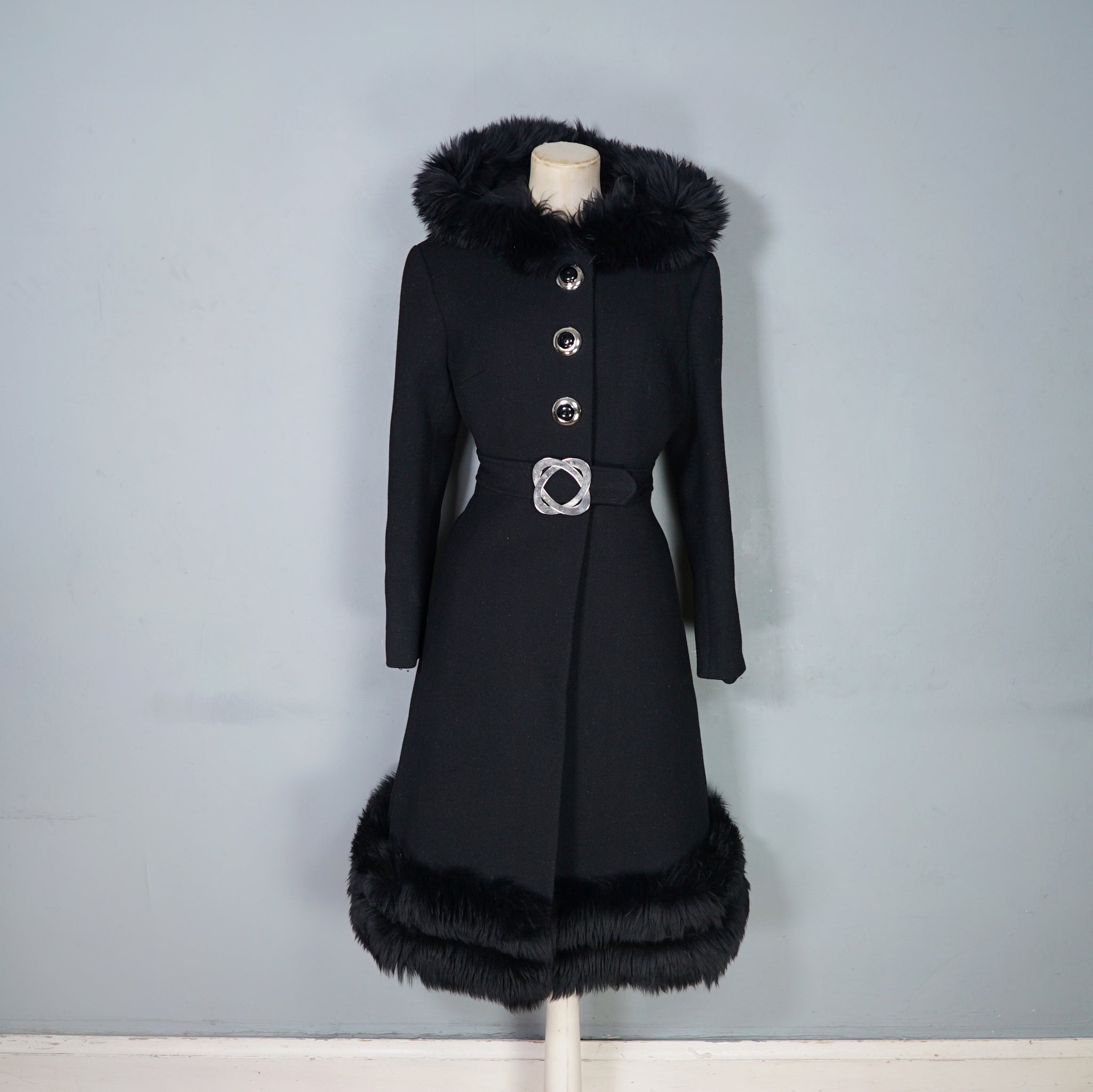 Lovely 60s showstopper coat by Sidwall. Made in London. Black, fairly thick, wool with a tiered sheepskin trim to the hem and matching trim to the hooded neck. Elegant silhoutte with a softly a-lined skirt and fitted long sleeves and bodice with a wide waistband with a snap buttoned strap and a big decorative celtic buckle. Front fasten with three conceled chunky popper buttons and have three large black and silver huge statement buttons on the top of the front. Hooded neck. Slot pockets on the hip. Fully lined in black synthetic.